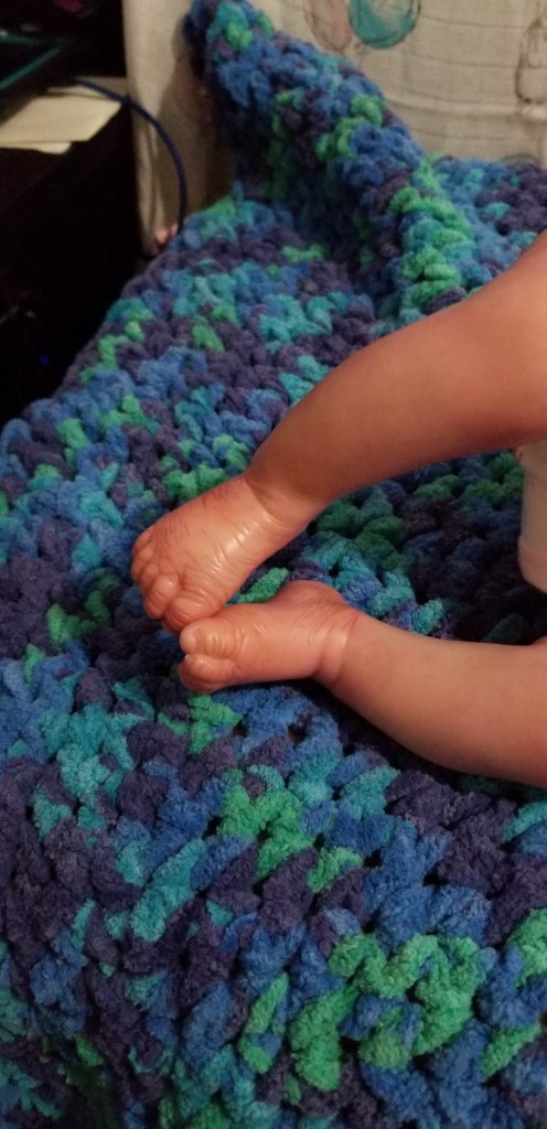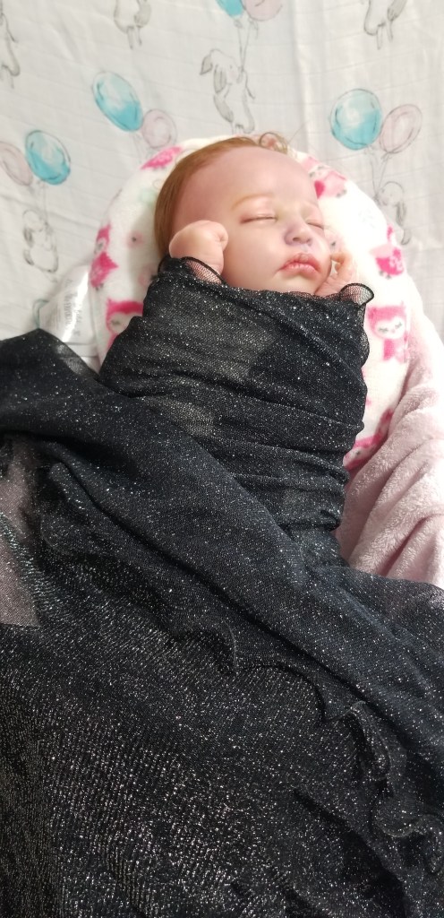 WELCOME TO THE WORLD!!! Ladies and Gents, I’m thrilled to introduce Wolfsong Nursery’s latest creation CLAUDIA. Created on the BB Realborn Claudia! She was born this Summer Solstice day weighing June 21, 2022 @ 3:30 pm and weighs 5lbs 4oz and is about 18 inches long. She has handrooted Alpaca Mohair and eyelashes, Prisma pencil brows and has been carefully painted in super transparent layers (over 50 of them) of Genesis Heat Set Paint and sealed with varnish. She has beautiful, soft hair that might still be a litte long, but I’m not worried, better too long than too short. Claudia is weighted with #3 .75-1″ Glass Beads contained in microfiber bags (body and head) to prevent any spillage. She has a magnet behind her lips (for a Magnetic Pacifier) and on the top of her head (for a magnetic Hair Accessory/Bow), AND, she has the most AMAZING Silicone tummy and Bottom! Her bottom is actually a little “bubble butt”, it’s adorable!