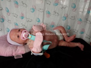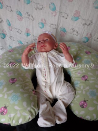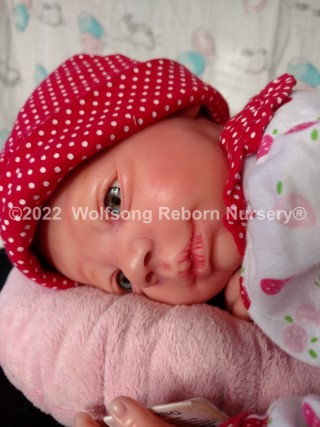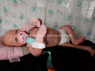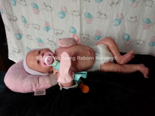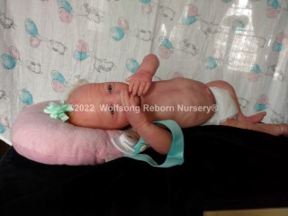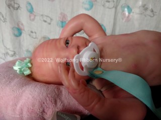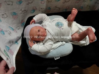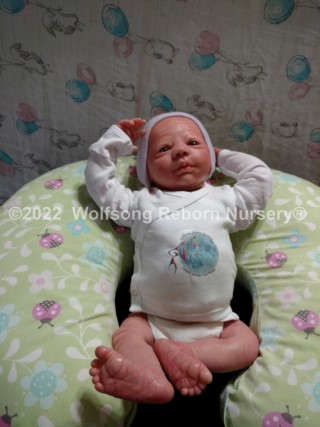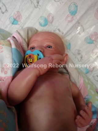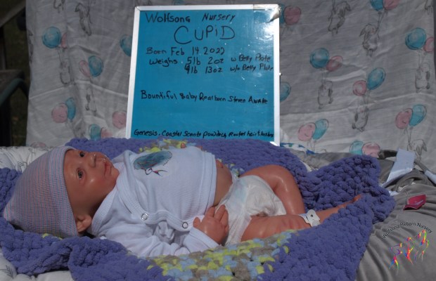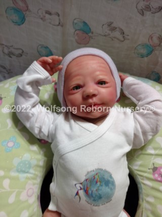 This is Cupid, (s)he was born on Feb 14, 2022 VALENTINES DAY at 5:22p.m. His/Her ginger hair is rooted as are teh very sparse ginger eyelashes, and (s)he’s painted with Genesis Heat Set Paints and Pan Pastel Powders, his prisma pencil eyebrows give the depth to his perfect little face. This is the Bountiful Baby Steven Awake kit reborned by myself, Marta of Wolfsong Nursery. (S)He is just teeming with high end extras that make his little body feel SO realistic.