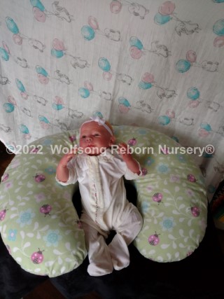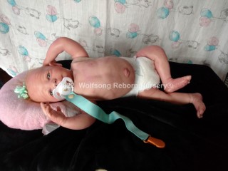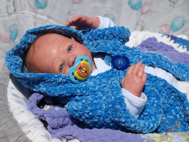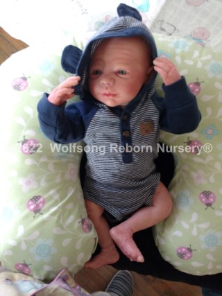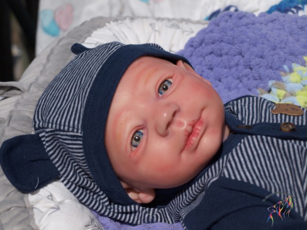 (S)He has a magnet behind his mouth and another inside the top of his head (for magnetic hari accessories) Each of his limbs and head as rings to aid in posing and he comes with a belly plate that give his precious little tummy the most adorable pudge. INside his clothe body is a silicone pad in his tummy, and one in each of his butt cheeks, these really make his bottom and tummy feel real….and around them, holding them in place and filling them out is super soft polyfill. He is weighted with high quality Glass beads encased in microfiber bags to prevent spillage (head and neck) and in the limbs packed in by polyfilly and sealed with a round felt pad. His beautiful eyes seem to see into your soul; he’s one of those “old souls’ that sometimes come as a baby and just seem to know how the world works.
