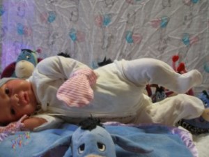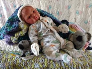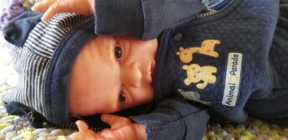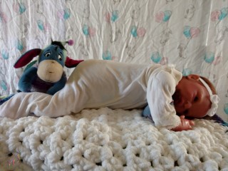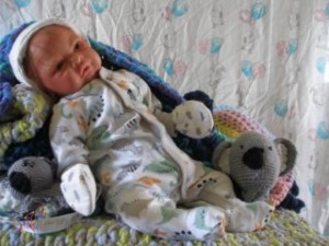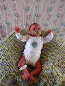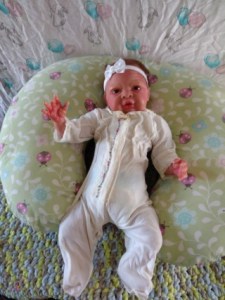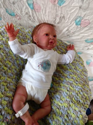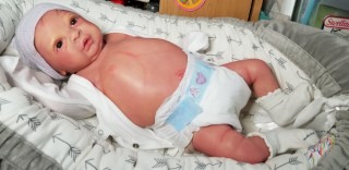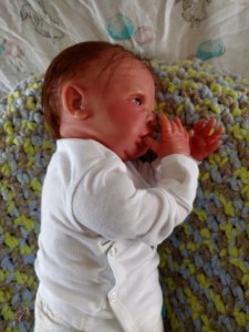 Easter Sunday is all about new beginnings. It’s not just about eggs and bunnies and flowers; it’s about birth, and RE-birth. Frankie was born Easter Sunday, April 17, 2022 @12:10pm weighing4lbs2.7oz. From his rooted reddish brown mohair to his tiny toes, Frankie has many high end additions that make him a steal at this price! He has gorgeous brown acrylic eyes, and is hand painted with many many layers of super transparent. There are layers of washes, texture and mottling that give his “skin” a depth like a rea baby. Don’t forget to support his little head! He has pads of silicone in his tummy and bottom to simulate the feel of a real baby’s fat, and I’ve used two types of polyfill, super soft and regular along with high quality #3 glass beads (no smaller than .75mm and no bigger than 1MM. Frankie just melts into your arms. Frankie does have a magnet behind his lips for a magnetic pacifier and on the top/side inside so if you want a girl Frankie, she can wear magnet hair accessories. If you don’t want magnets for whatever reason I will remove them prior to the baby going into her “travel bassinette (Priority Mail Box) to go home. I am still a beginning artists, so my dolls are not perfect. Because of that, I consider my babies to be Boo Boo Babies….. But while they may not be perfect, they going to be perfect for someone. NOTE: I painted a Chest/Belly plate wtih this doll. On the last varnish bake the inside of the plate cracked. While the painted side was mostly undamaged, the inside was badly cracked. I have used Vinyl Putty to fix the cracks. However, I can’t in good conscious sell the plate even repaired. However, if you purchase Frankie and want the belly plate I will include for no charge. Pictures of the belly/chest plate on Frankie are at the bottom of the gallery.