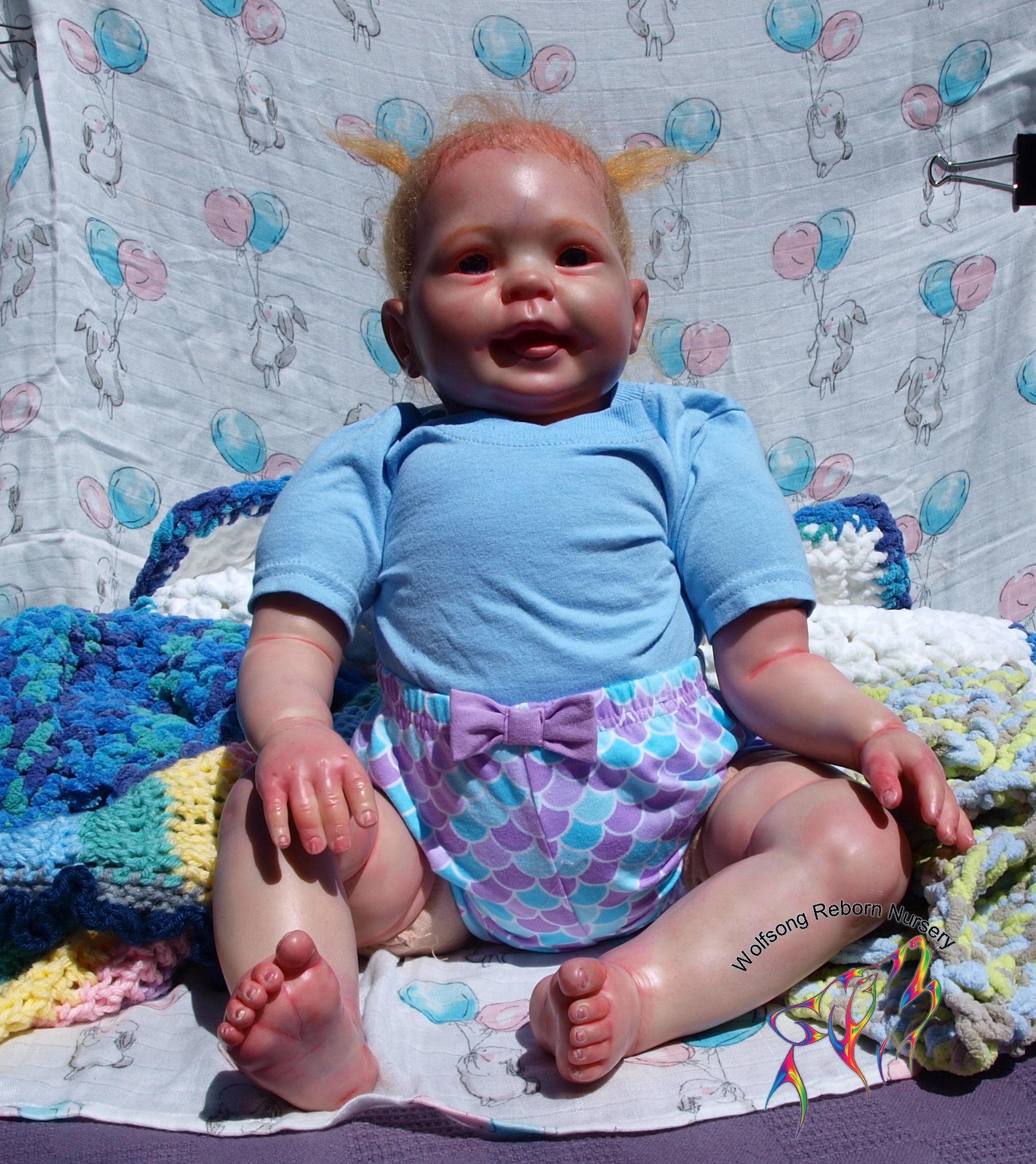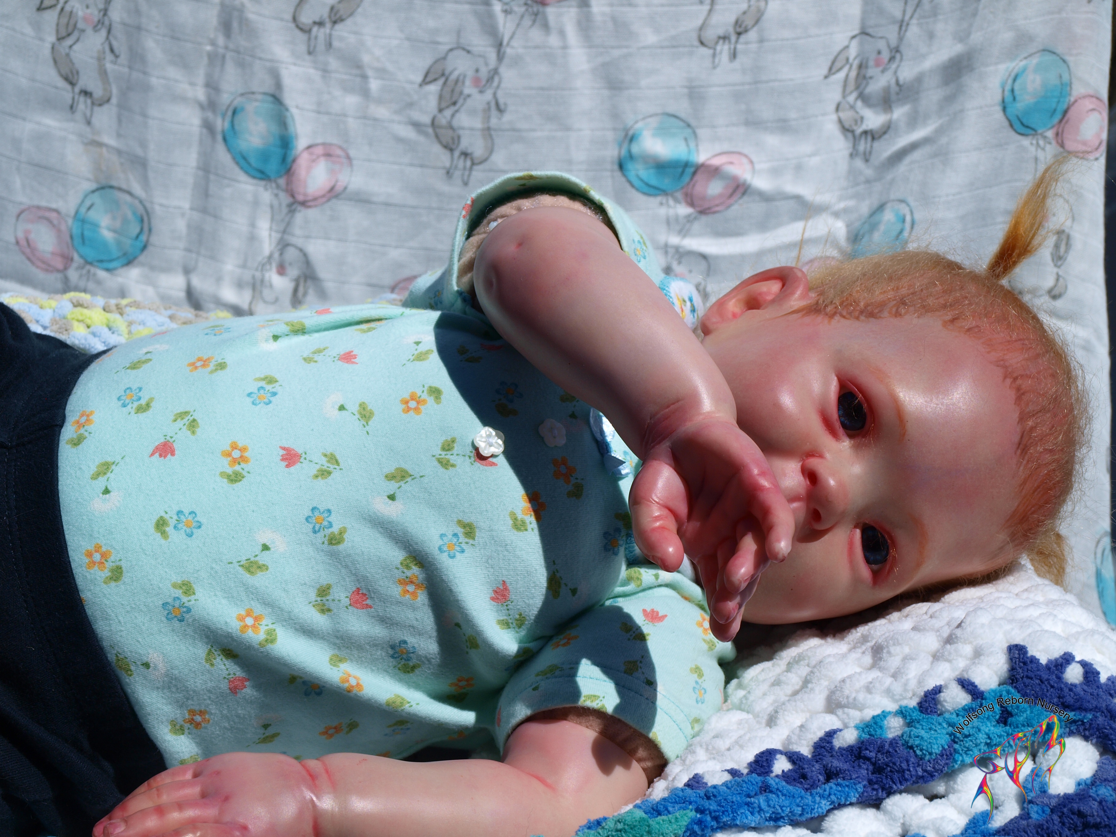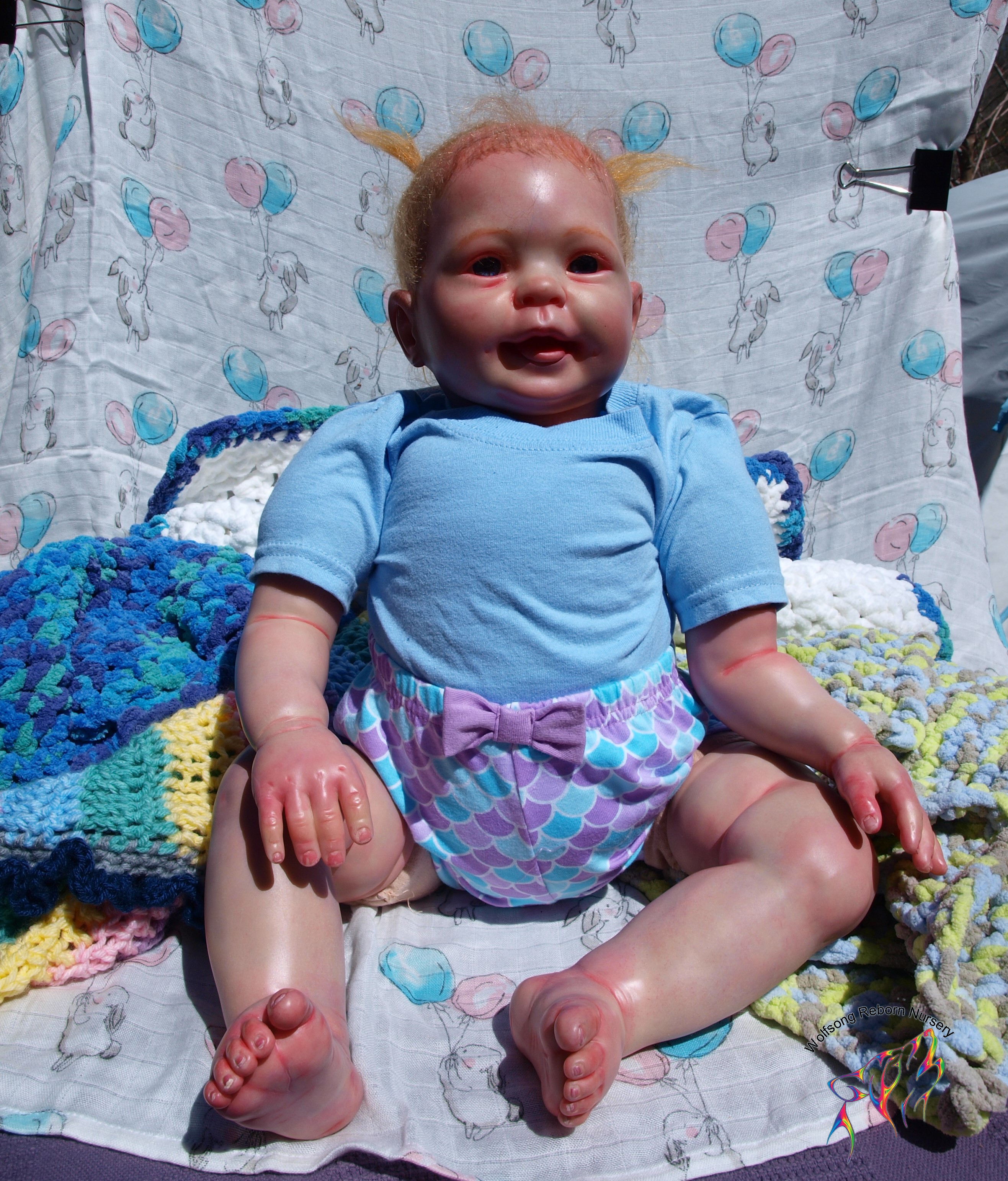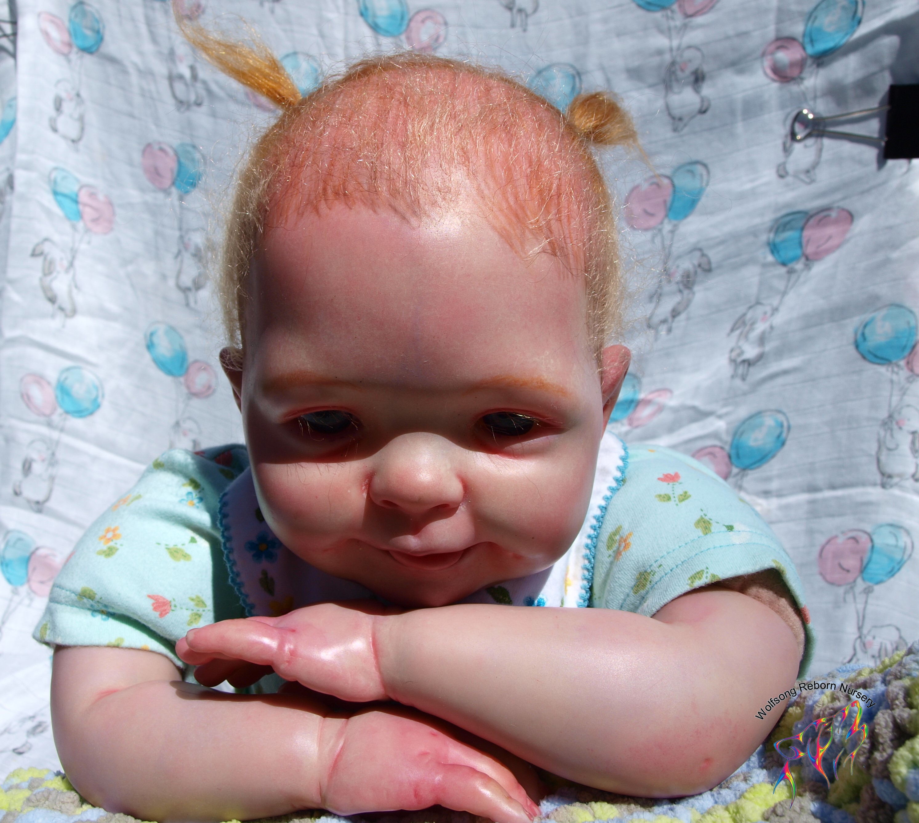 This is Bountiful Baby Cookie 9 Month painted in multiple translucent layers of Primary color (and one layer of Flesh to finish her off) using Miracle Blend Air Dry Paint and Pan Pastel powders. I made this baby for myself, but my dream kit has come available once more, so I’m offering her for sale. Because she is only my 5th baby I consider her a boo boo baby. She is hand rooted over prisma pencil hair in a beautiful shade of red, and she has gorgeous acrylic eyes. She just looks so happy! Lori Lee is a 3/4 limb on a soft clothe body. THIS BABY IS HEAVY! She weighs FOURTEEN (14) POUNDS!!!!! She will go home with several outfits, her lovey and binkie and a small box opening.