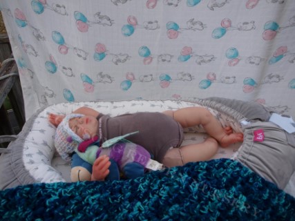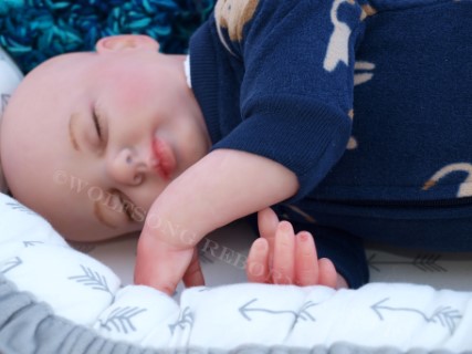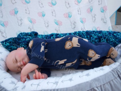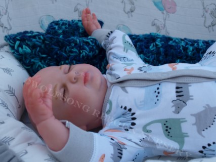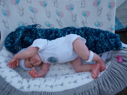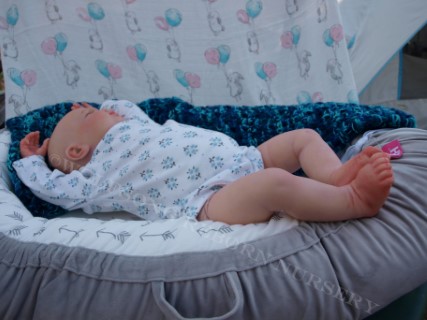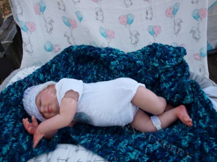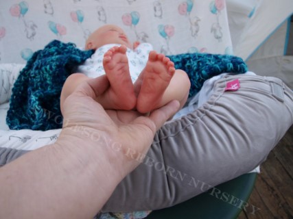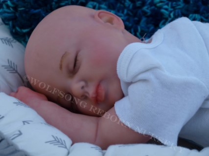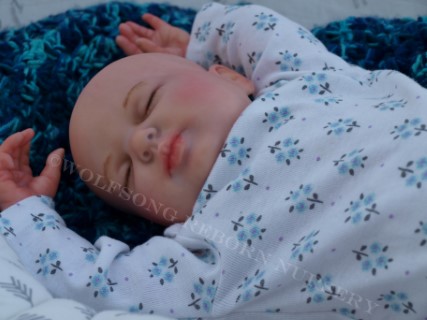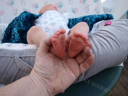 Ricki is a beautiful baby, born November 27, 2021 @ 7:26pm weighing 5lbs 12.3oz created with Genesis Heat Set Paint paint and Coastal Scents powders by Marta Towne of Wolfsong Reborn Nursery on the Bountiful Baby Rose kit. Ricki is a very special baby, with many upgrades! Squeeze the little booty and you’ll find a super soft silicone cheeks. Two seperate types of poly-fill, including a super soft tummy and high quality glass beads encased in microfiber bags in both head and body. She is a little baldy, but has long, rooted eyelashes. Ricki has 3/4 arms and legs and is a joy to photograph and pose as well as to hold. This baby FEELS very natural when you hold it, melting into your arms; supporting the head is essential. But when you cradle this little body in your arms, everything is worth it. Ricki LOOKS and FEELS like holding an infant…isn’t that what you want in a reborn?