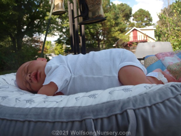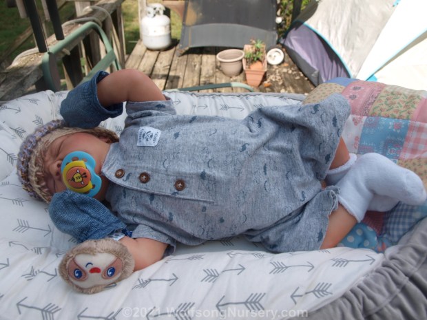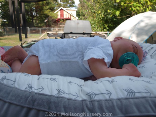 These photos were taken in daytime in natural light and have had no filters added. River will come with two outfits, a lovey, magnetic pacifier with pacifier strap, hospital bracelet, birth certificate, Care sheet and a small box opening.