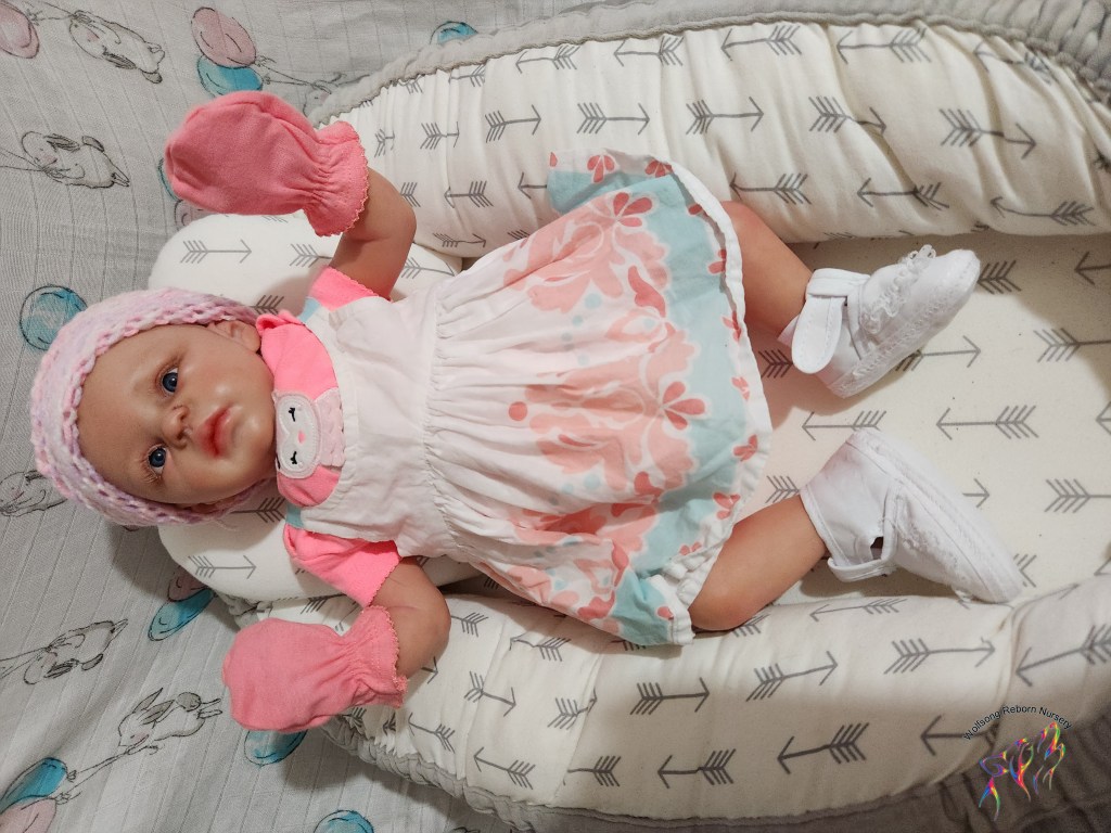 Wynter was lovingly painted with Genesis Heat Set Paints over a layer of Coastal Scents and Pan Pastel powders set with the first color wash. I used the primary method, building her skin tone carefully using only red, blue and yellow paint super thinned in layers so transparent that you see the wetness on the vinyl but not color. After about 12 rounds of primary washes (a round is three layers, one of each primary color; that’s a total of about 36 layers of color) it was time for the texture layers. The Washes give you the basic skin tone, then texture layers give you the depth. Texture layers are applied with a plucked sponge and a tad thicker paint (still transparent however) and in Wynter’s case she had about 15-20 layers before I was happy with her “skin”. Then came the mottling layers, the only place on my babies I use any color other than Primary colors. Magenta, Purple/Blue and sometimes green if the tone seems to need it. Then it was back to the powders to add blushing, reinforcing undertones, shadows, shading etc. All the things that give the baby depth and realism. I also worked on the lips and ears as well as the philtrum (that little dip between nose and lip) and lips. Then a coat of Heat set varnish, a recipe of several different heat set mediums designed to give the baby a realistic feel as well as look. This is the point where the baby bakes multiple times, cooling completely in between. I bake the babies after a few layers from the beginning washes, when it “feels” like the right time, but this final bake is broken up into three to four bakes to make sure everything is cured and set properly. At this point I added the eyes which really brings the baby to life.