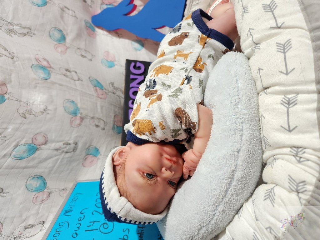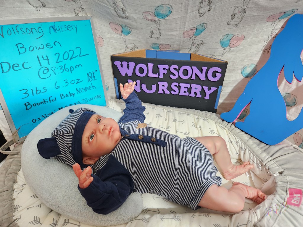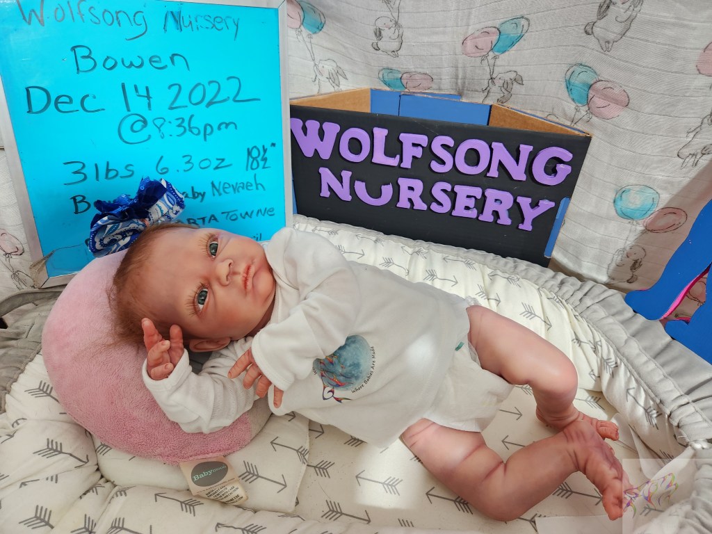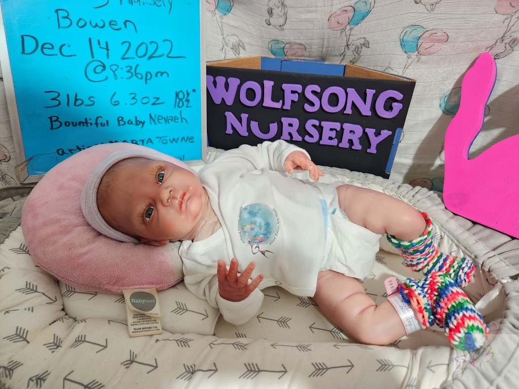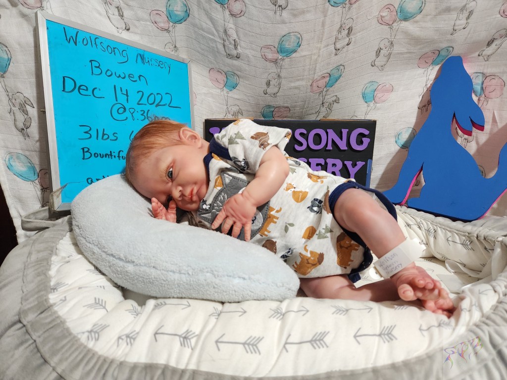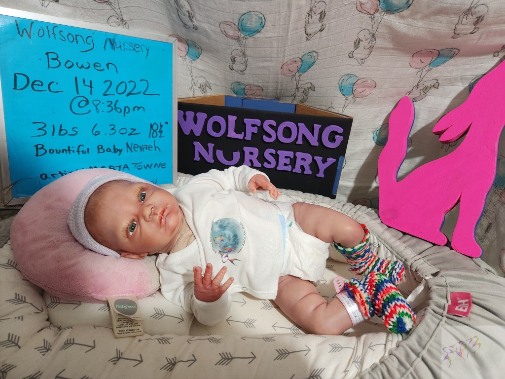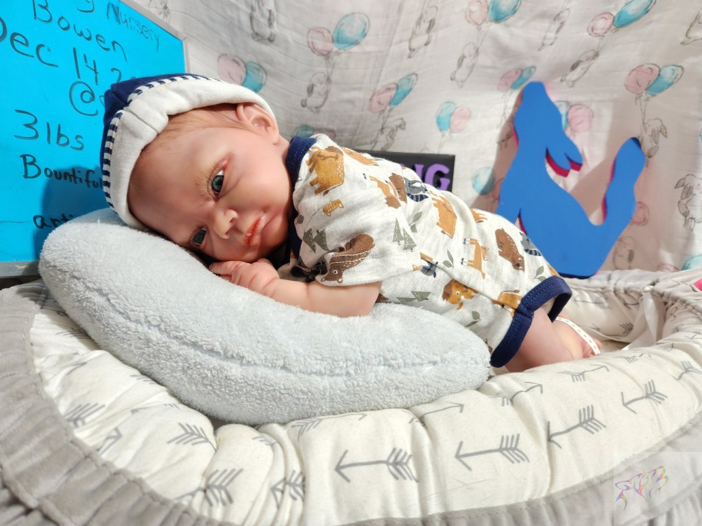 Weighted lightly (3lbs 6.3oz) with #3Glass Beads, and filled with polyfill to give the baby a wonderful, newborn “Floppy” feel, and a combi hair design (thanks to DEANNA BOWEN for her hair cutting ability), I honestly think Bowen is a great representation of Nancy’s Kids and Grandkids. Bowen is even going to his new mommy in the clothes and hat that APRIL JETT (Nancy’s granddaughter) was dressed in at her birth.