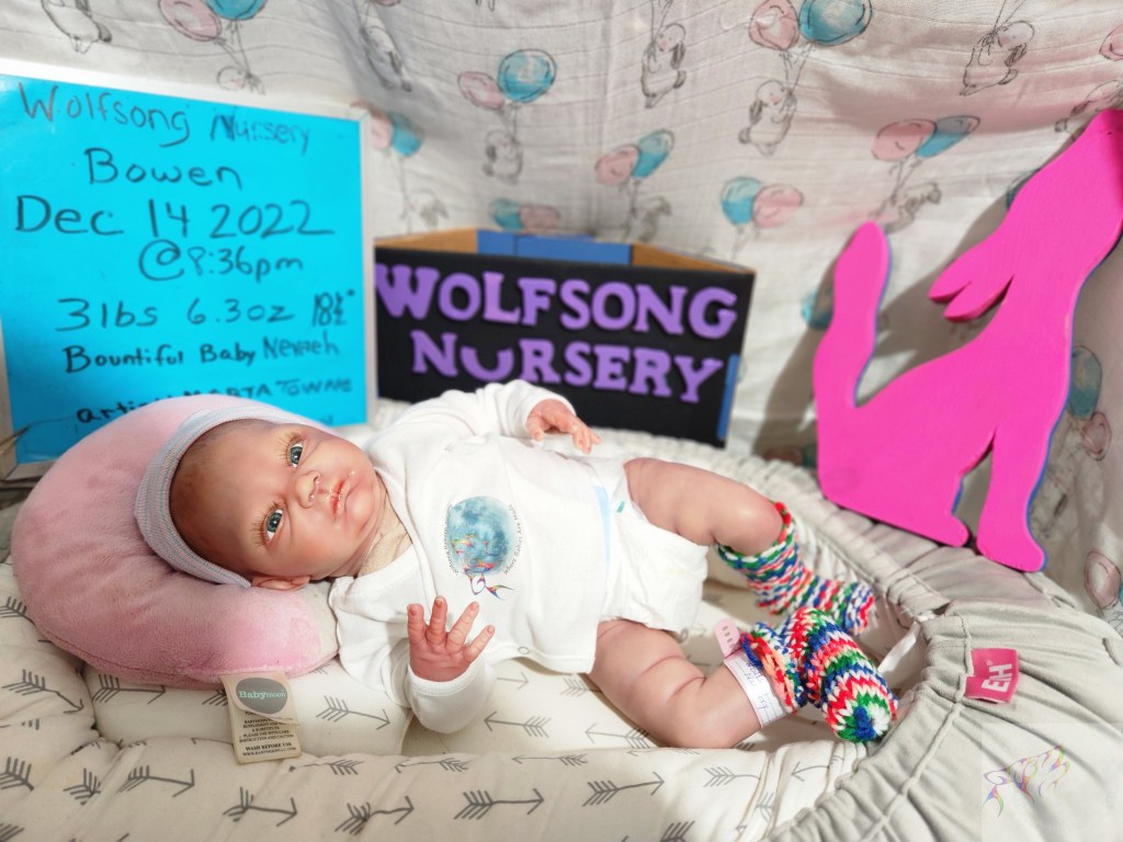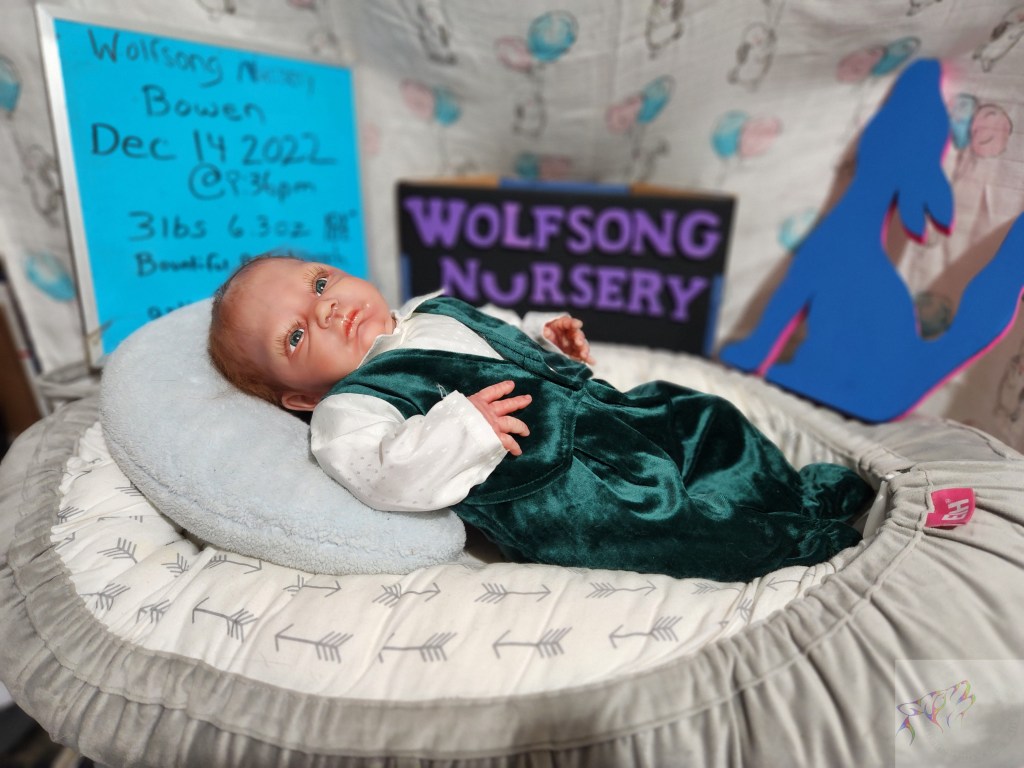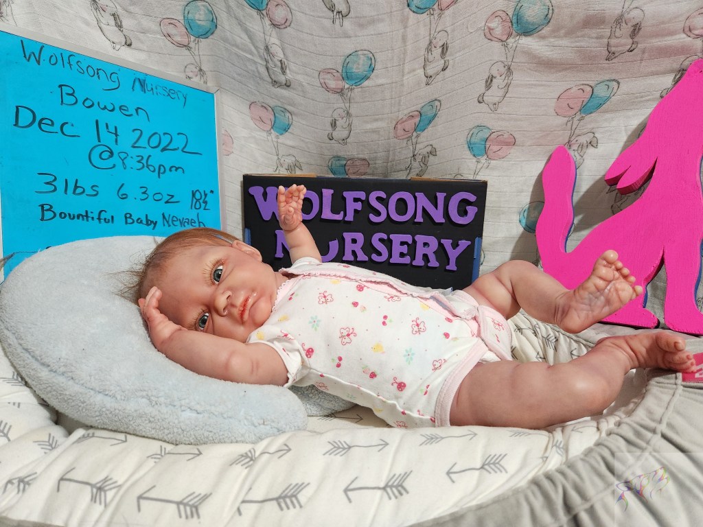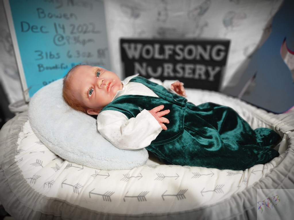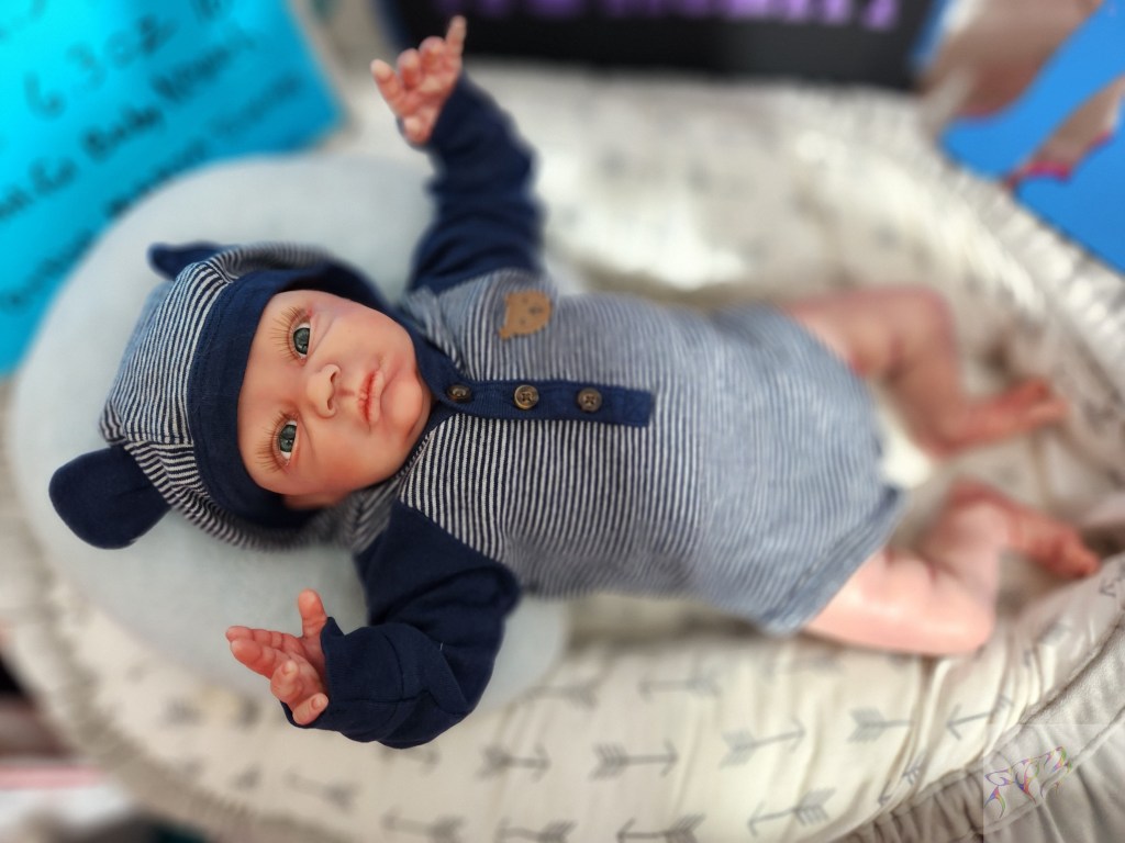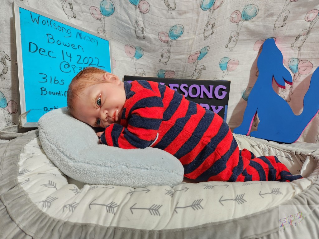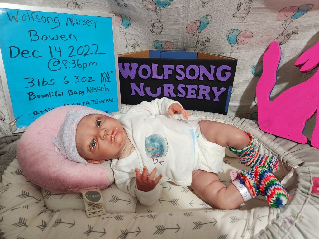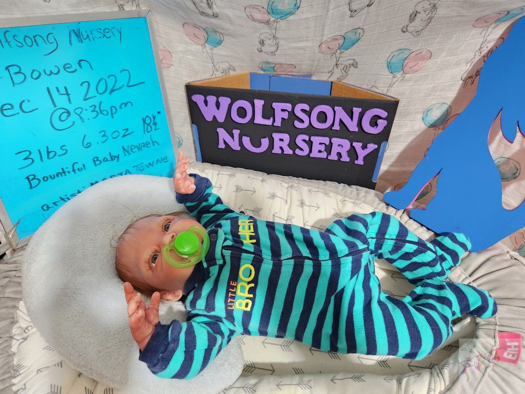 Weighted lightly (3lbs 6.3oz) with #3Glass Beads, and filled with polyfill to give the baby a wonderful, newborn “Floppy” feel, and a combi hair design (thanks to DEANNA BOWEN for her hair cutting ability), I honestly think Bowen is a great representation of Nancy’s Kids and Grandkids. Bowen is even going to his new mommy in the clothes and hat that APRIL JETT (Nancy’s granddaughter) was dressed in at her birth.