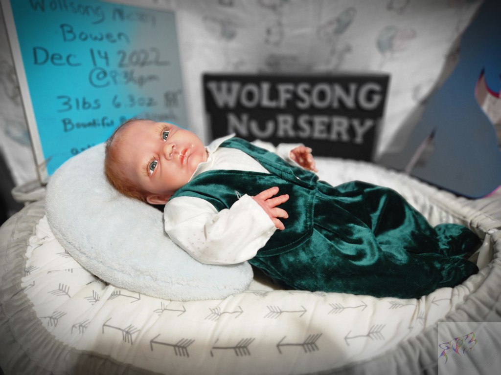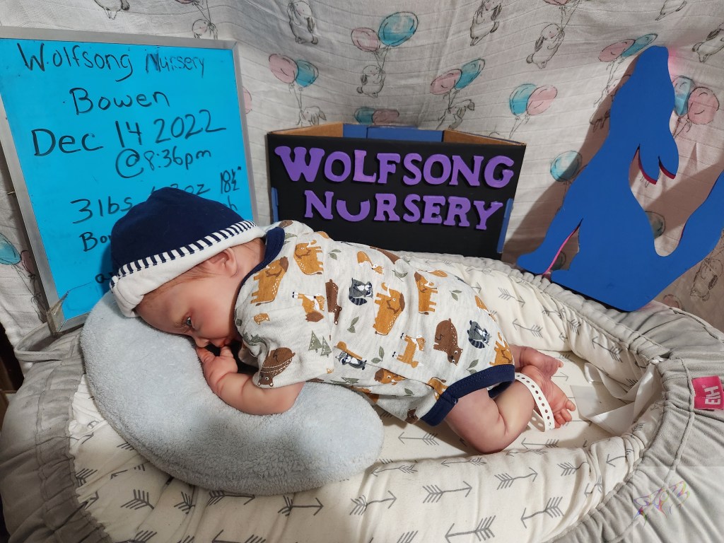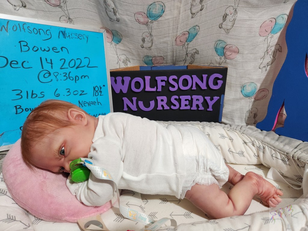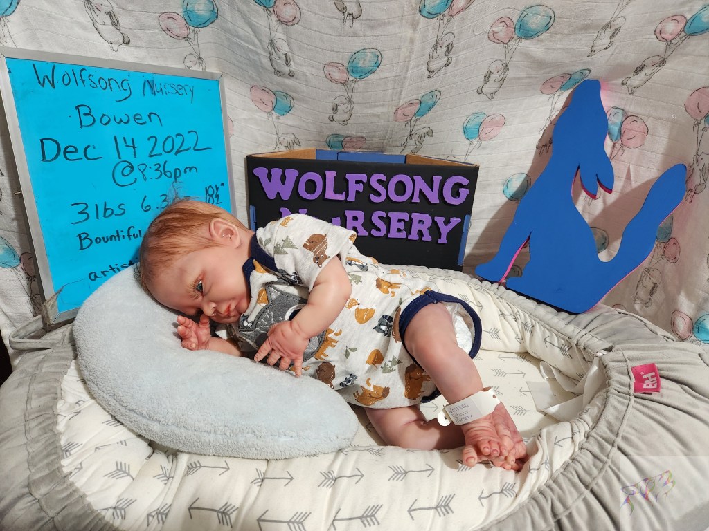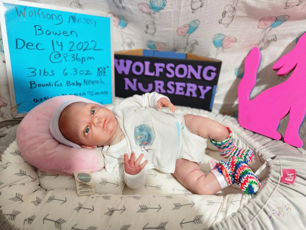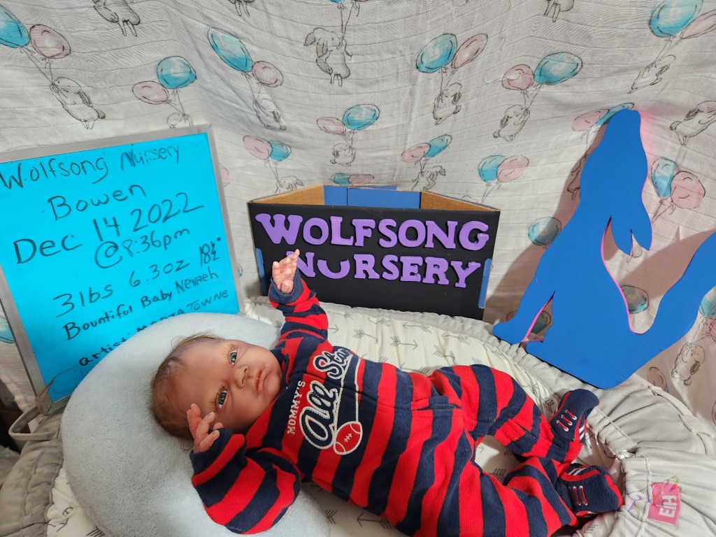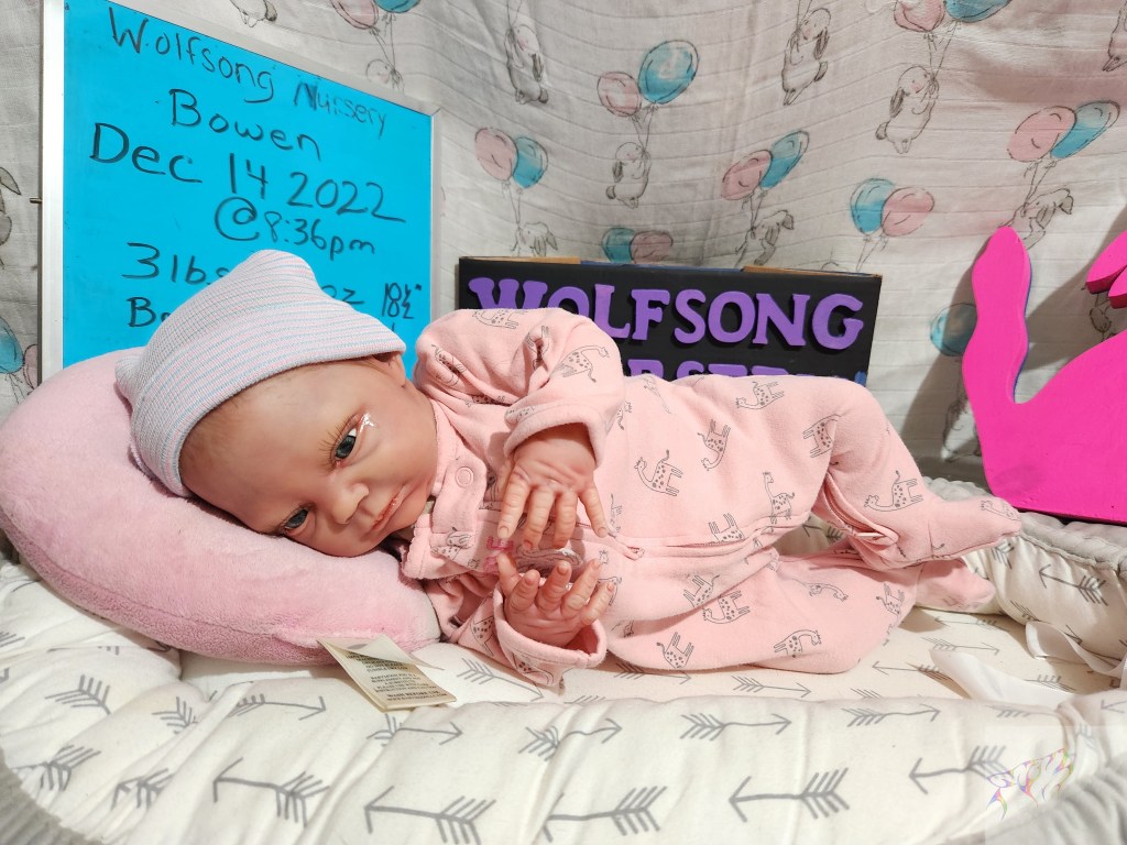 Weighted lightly (3lbs 6.3oz) with #3Glass Beads, and filled with polyfill to give the baby a wonderful, newborn “Floppy” feel, and a combi hair design (thanks to DEANNA BOWEN for her hair cutting ability), I honestly think Bowen is a great representation of Nancy’s Kids and Grandkids. Bowen is even going to his new mommy in the clothes and hat that APRIL JETT (Nancy’s granddaughter) was dressed in at her birth.