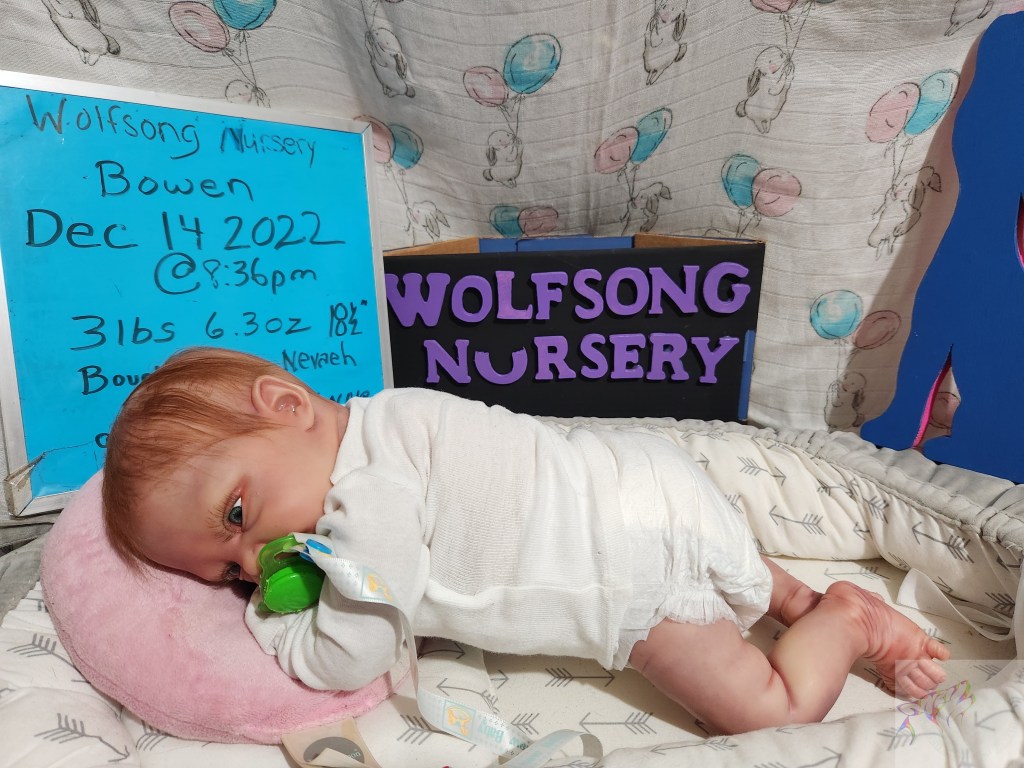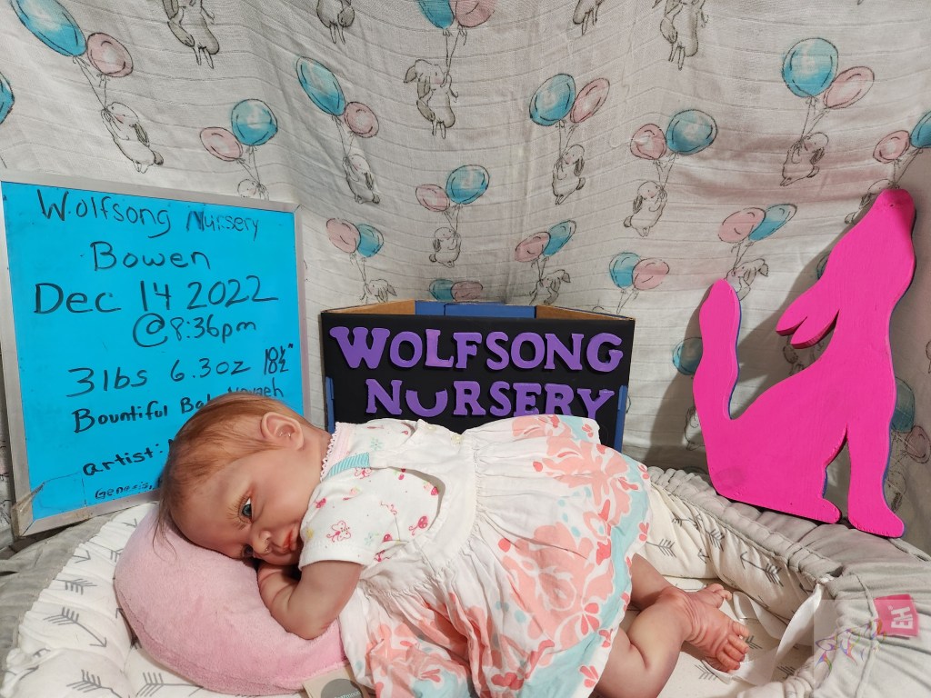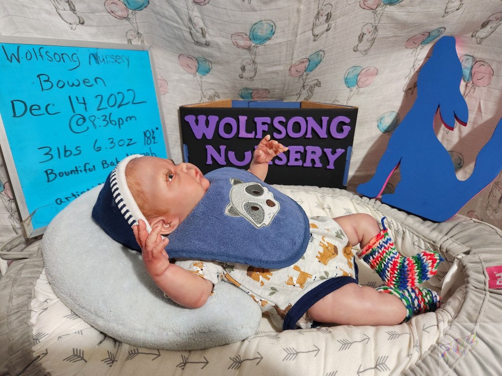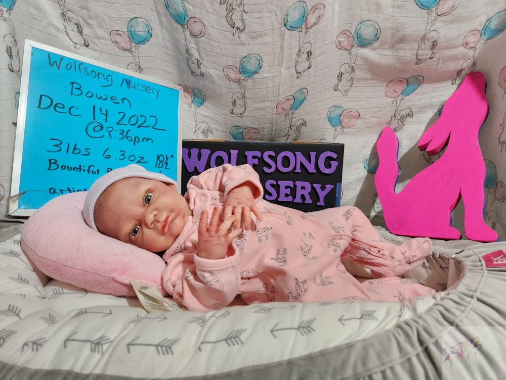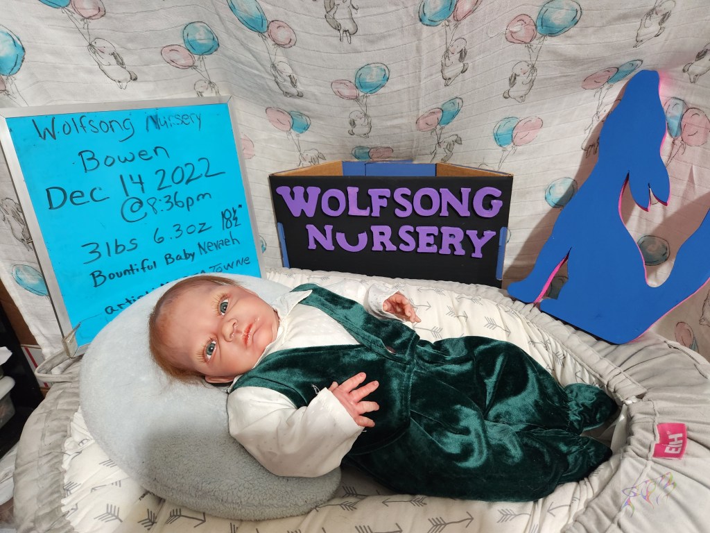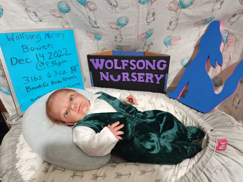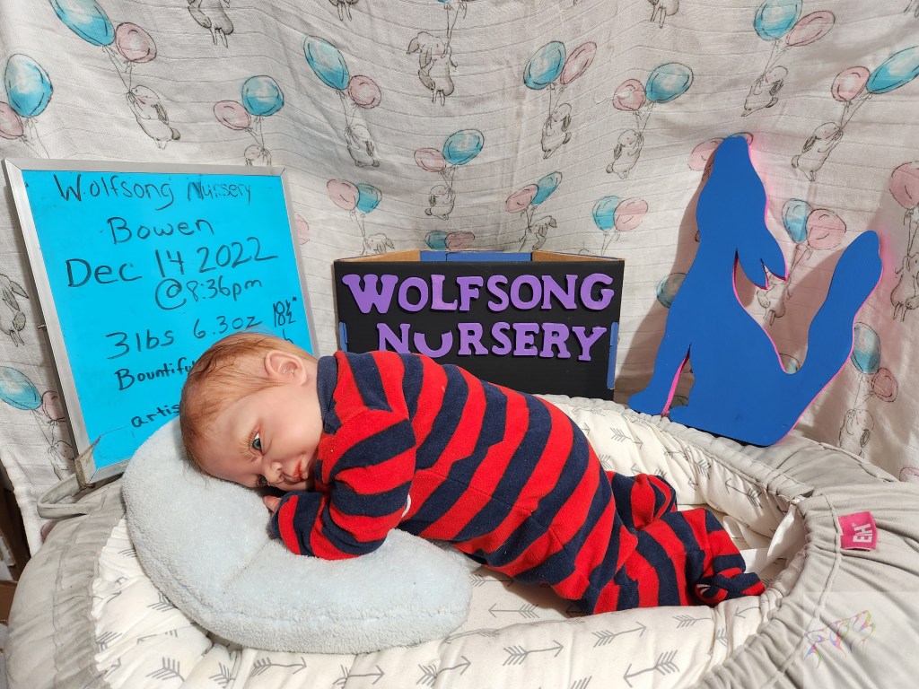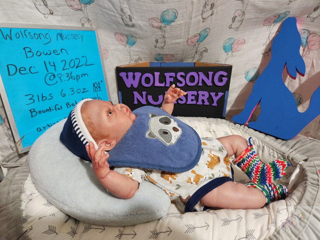 Weighted lightly (3lbs 6.3oz) with #3Glass Beads, and filled with polyfill to give the baby a wonderful, newborn “Floppy” feel, and a combi hair design (thanks to DEANNA BOWEN for her hair cutting ability), I honestly think Bowen is a great representation of Nancy’s Kids and Grandkids. Bowen is even going to his new mommy in the clothes and hat that APRIL JETT (Nancy’s granddaughter) was dressed in at her birth.