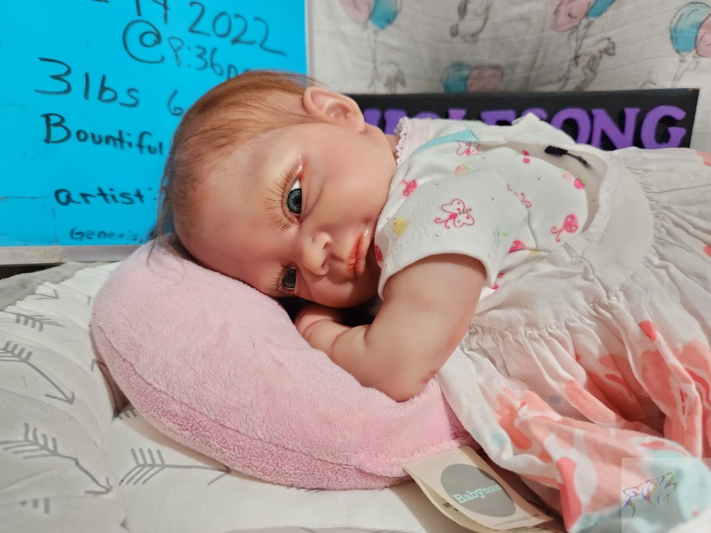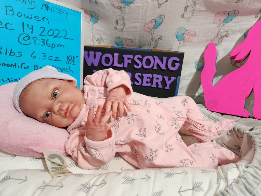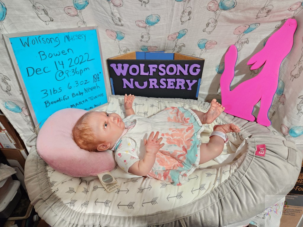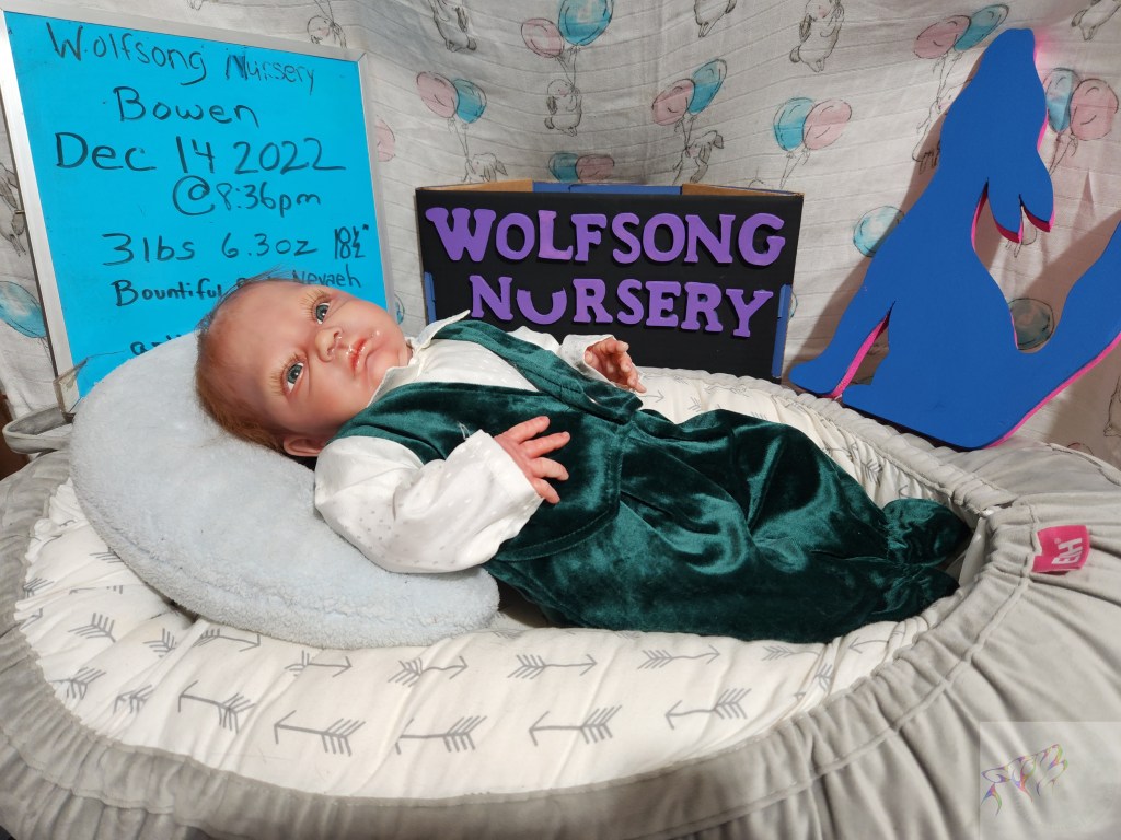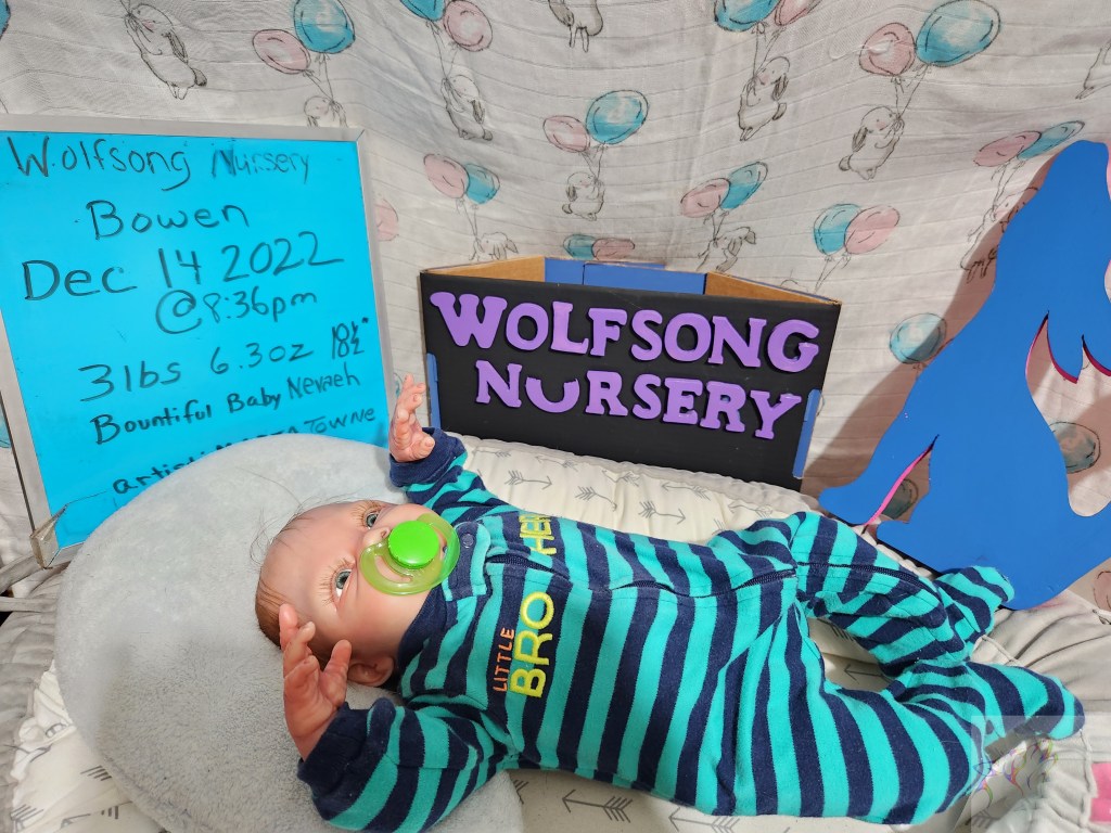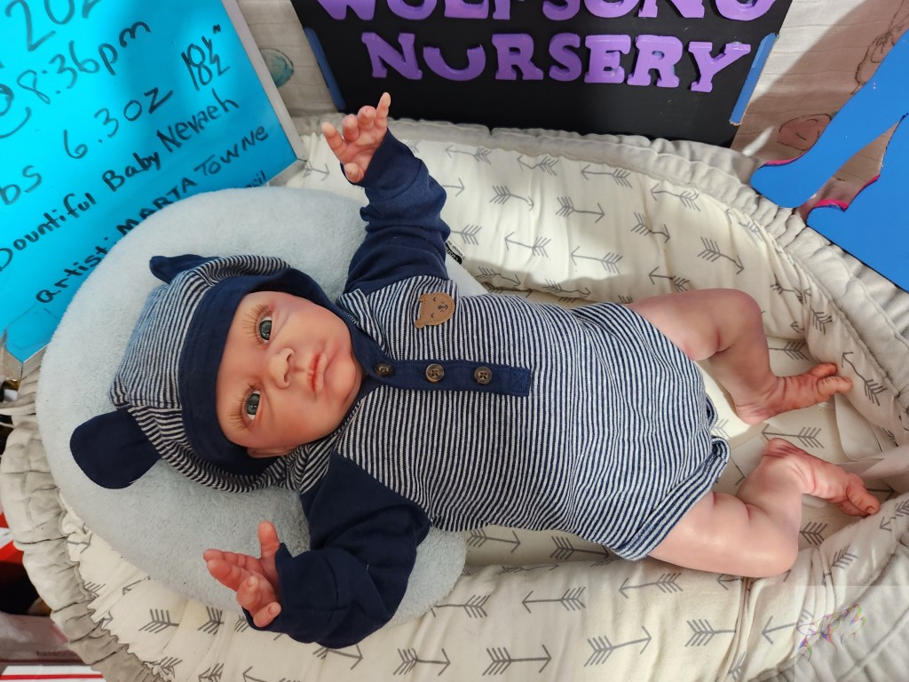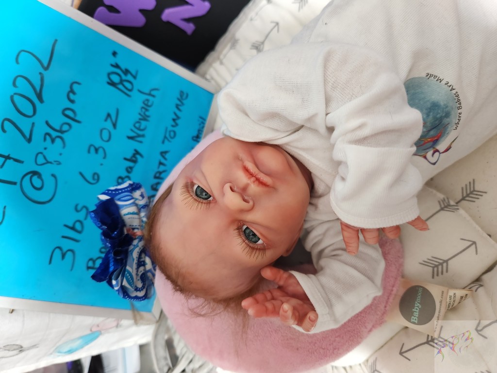 Weighted lightly (3lbs 6.3oz) with #3Glass Beads, and filled with polyfill to give the baby a wonderful, newborn “Floppy” feel, and a combi hair design (thanks to DEANNA BOWEN for her hair cutting ability), I honestly think Bowen is a great representation of Nancy’s Kids and Grandkids. Bowen is even going to his new mommy in the clothes and hat that APRIL JETT (Nancy’s granddaughter) was dressed in at her birth.