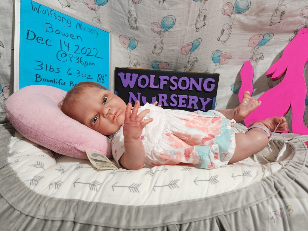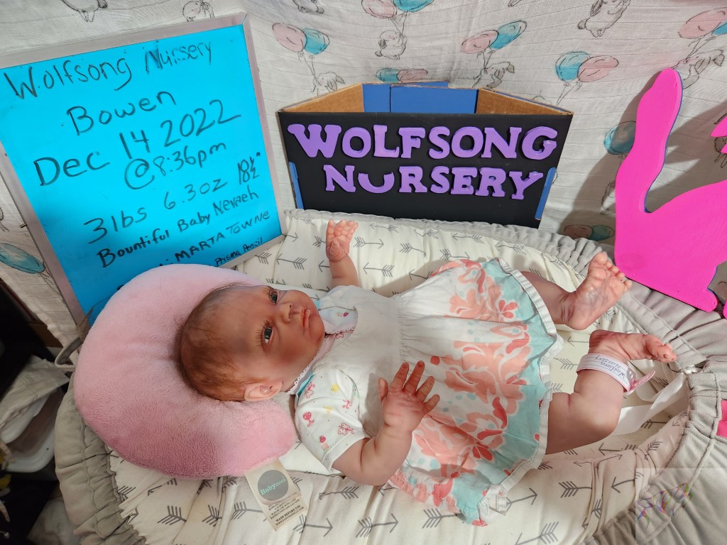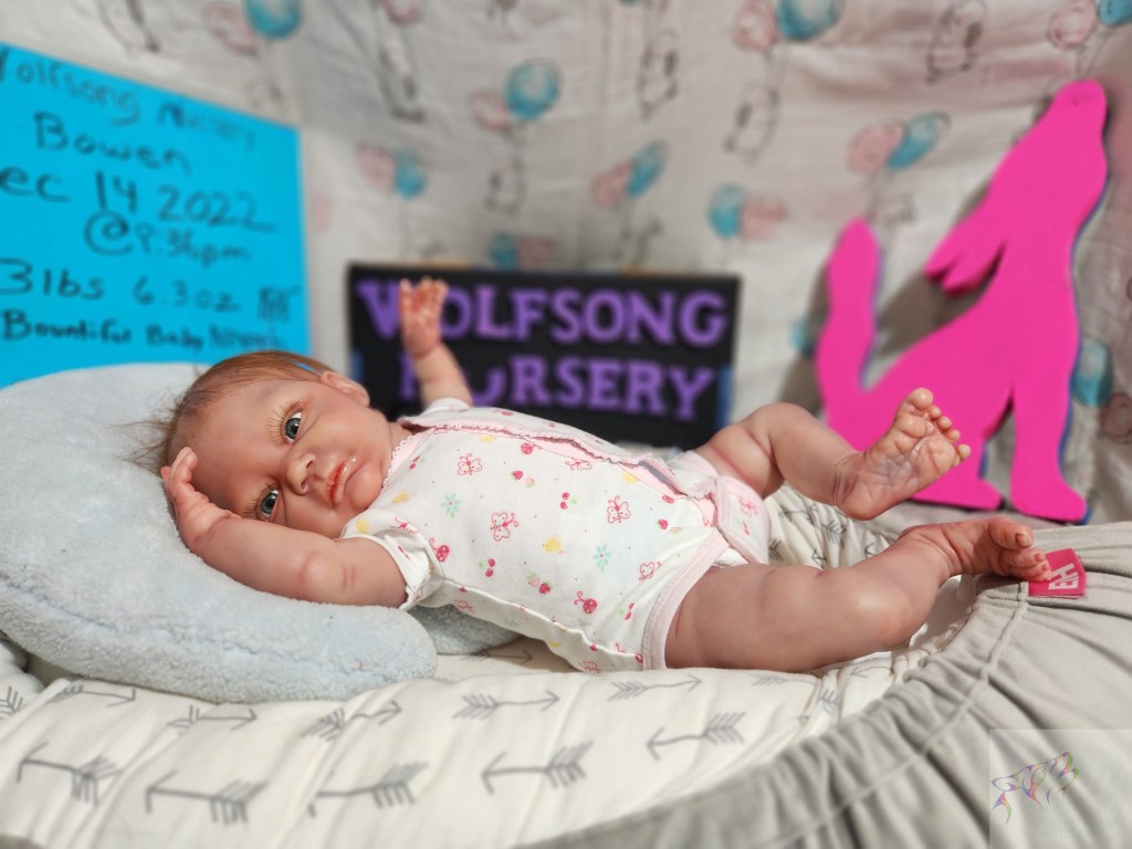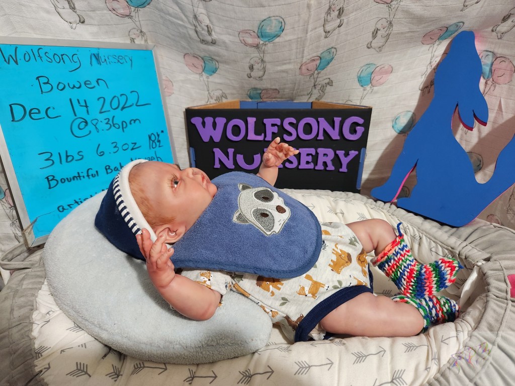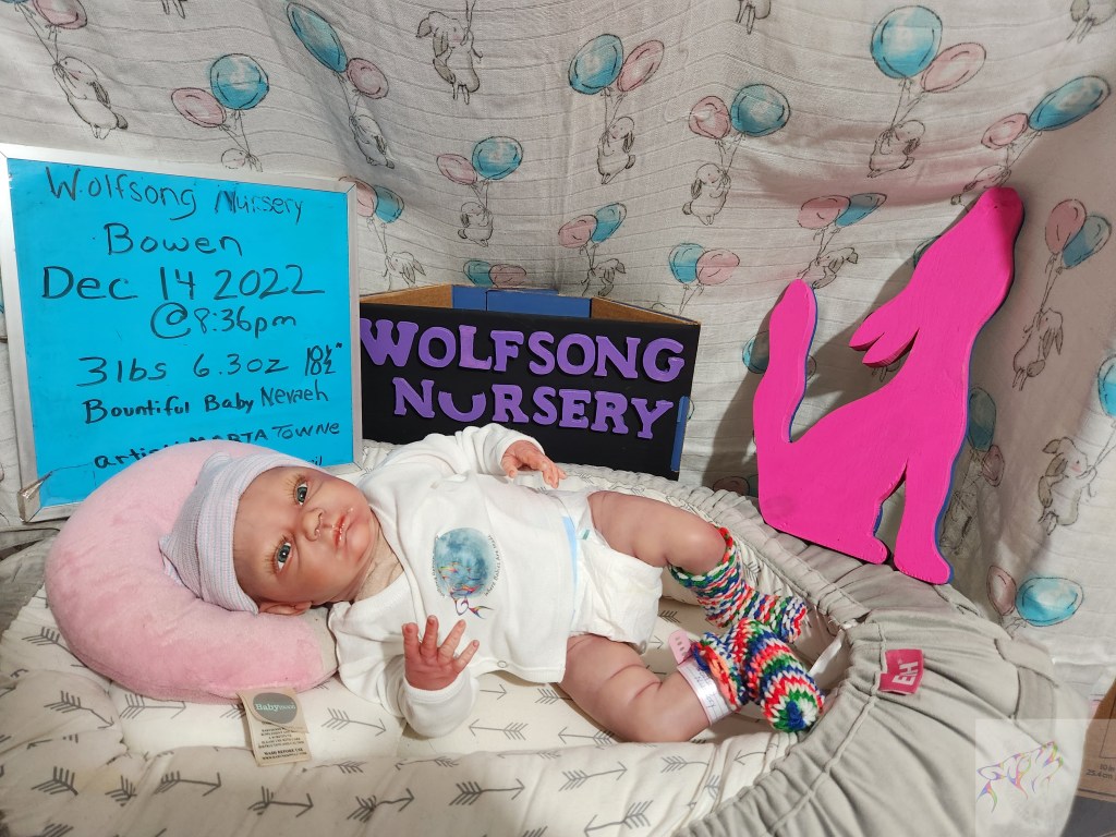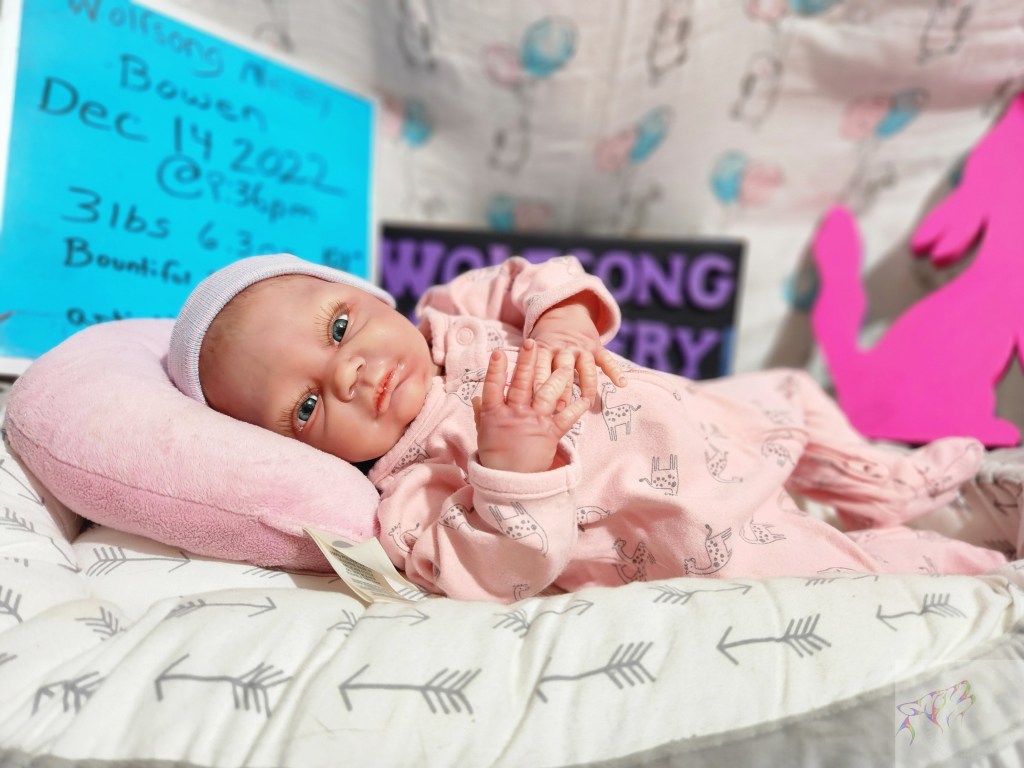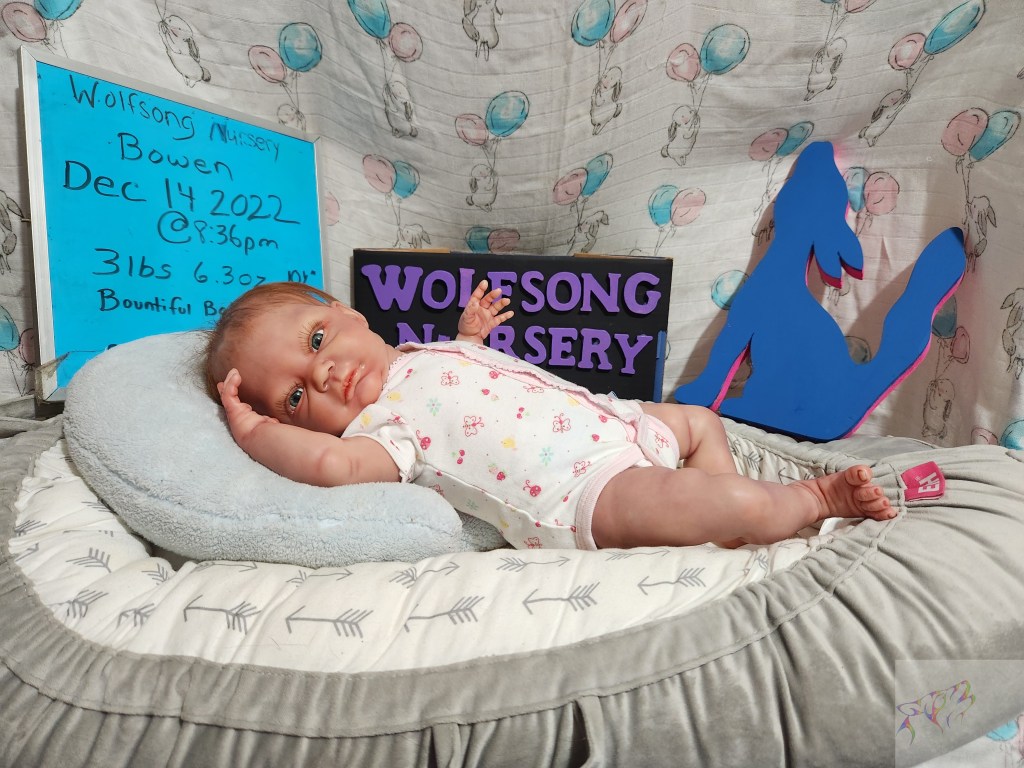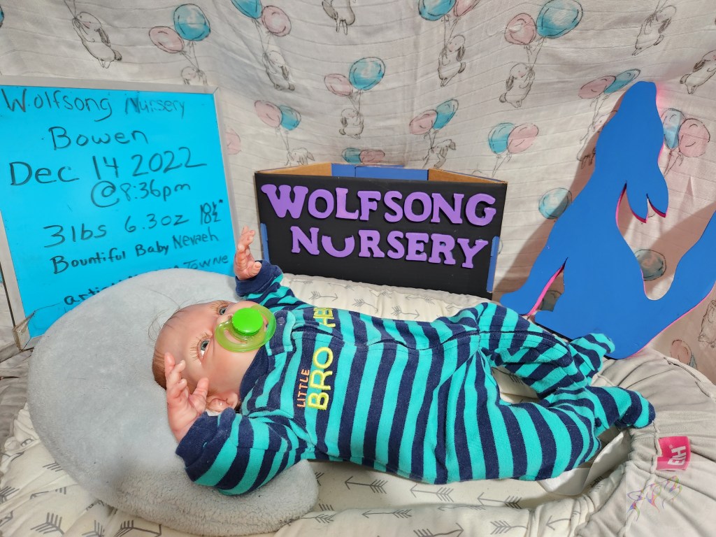 Weighted lightly (3lbs 6.3oz) with #3Glass Beads, and filled with polyfill to give the baby a wonderful, newborn “Floppy” feel, and a combi hair design (thanks to DEANNA BOWEN for her hair cutting ability), I honestly think Bowen is a great representation of Nancy’s Kids and Grandkids. Bowen is even going to his new mommy in the clothes and hat that APRIL JETT (Nancy’s granddaughter) was dressed in at her birth.
