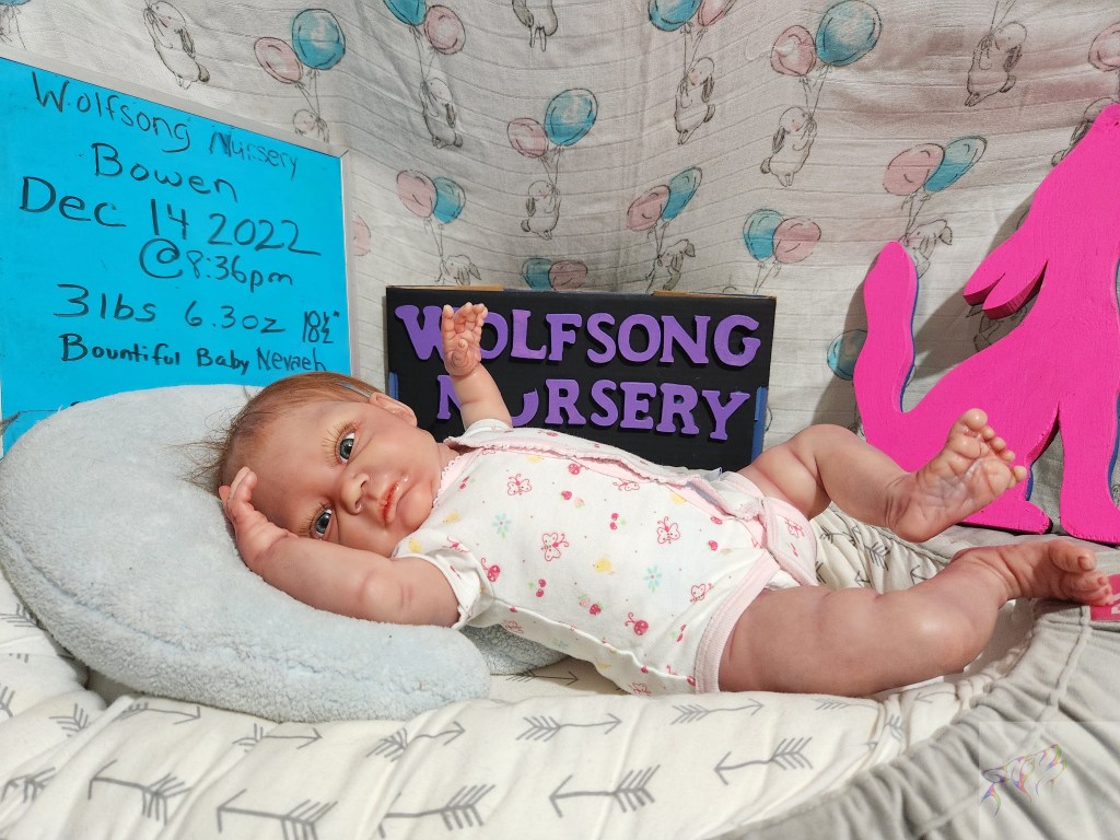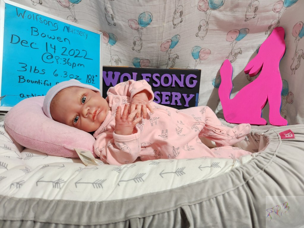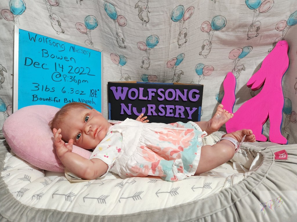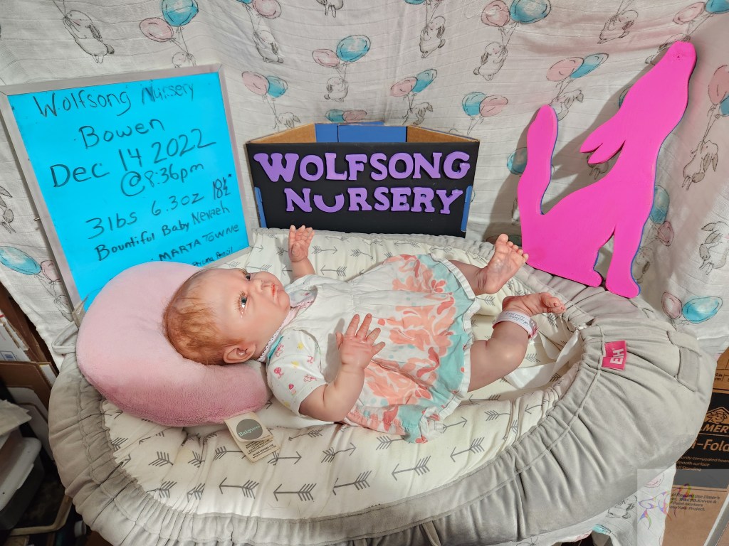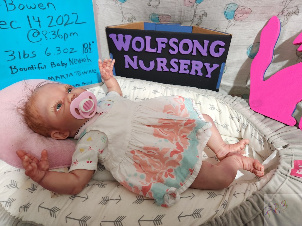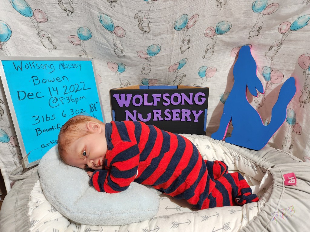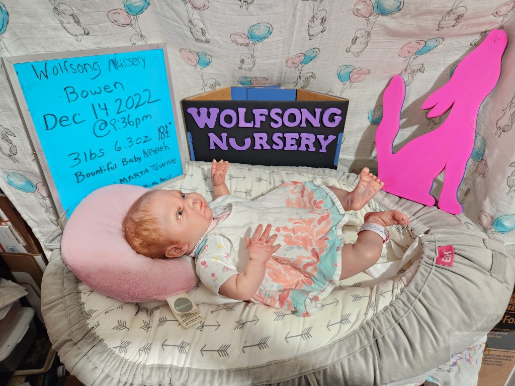 Weighted lightly (3lbs 6.3oz) with #3Glass Beads, and filled with polyfill to give the baby a wonderful, newborn “Floppy” feel, and a combi hair design (thanks to DEANNA BOWEN for her hair cutting ability), I honestly think Bowen is a great representation of Nancy’s Kids and Grandkids. Bowen is even going to his new mommy in the clothes and hat that APRIL JETT (Nancy’s granddaughter) was dressed in at her birth.
