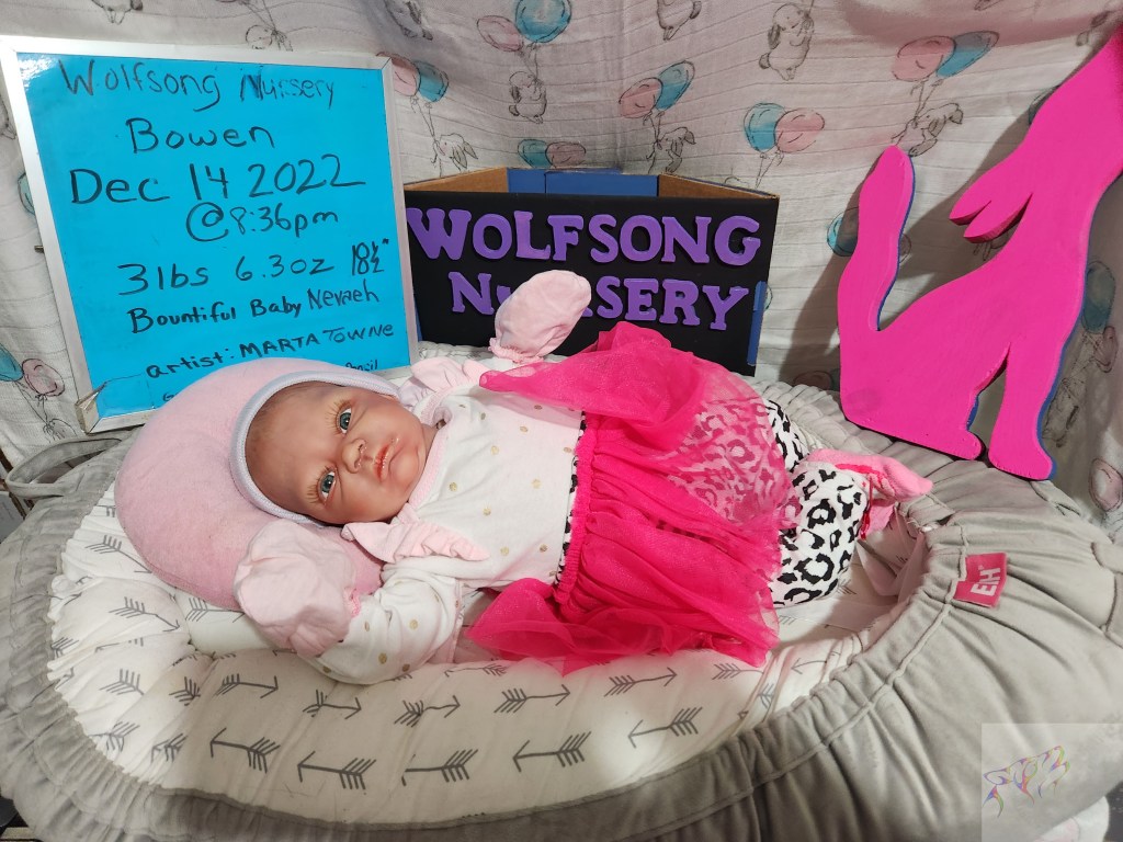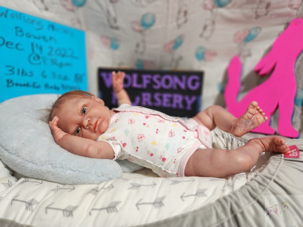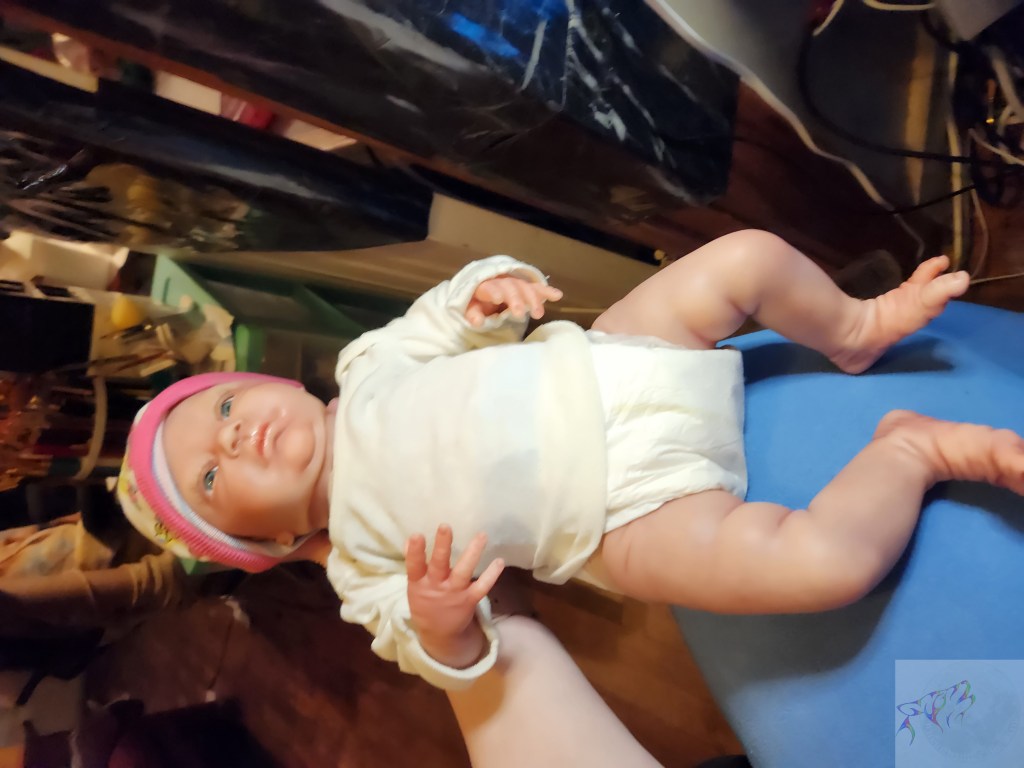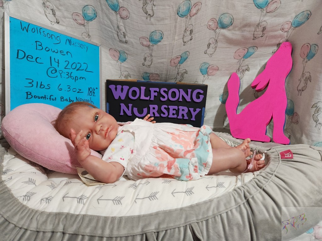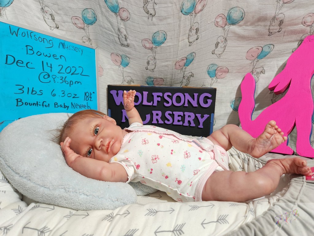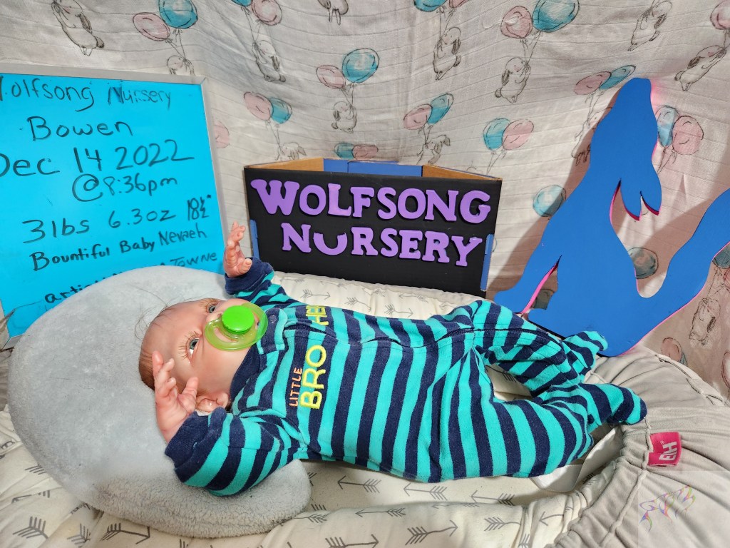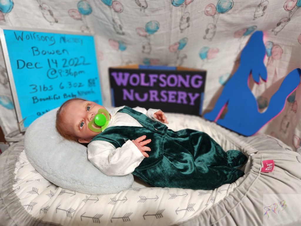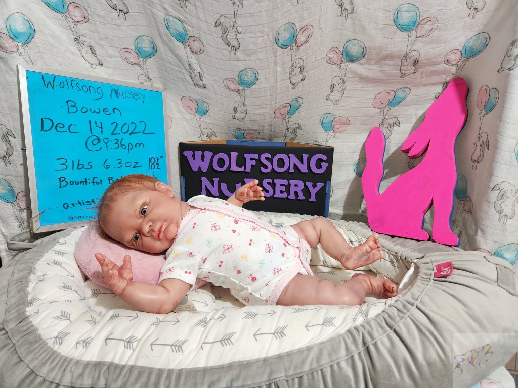 Weighted lightly (3lbs 6.3oz) with #3Glass Beads, and filled with polyfill to give the baby a wonderful, newborn “Floppy” feel, and a combi hair design (thanks to DEANNA BOWEN for her hair cutting ability), I honestly think Bowen is a great representation of Nancy’s Kids and Grandkids. Bowen is even going to his new mommy in the clothes and hat that APRIL JETT (Nancy’s granddaughter) was dressed in at her birth.