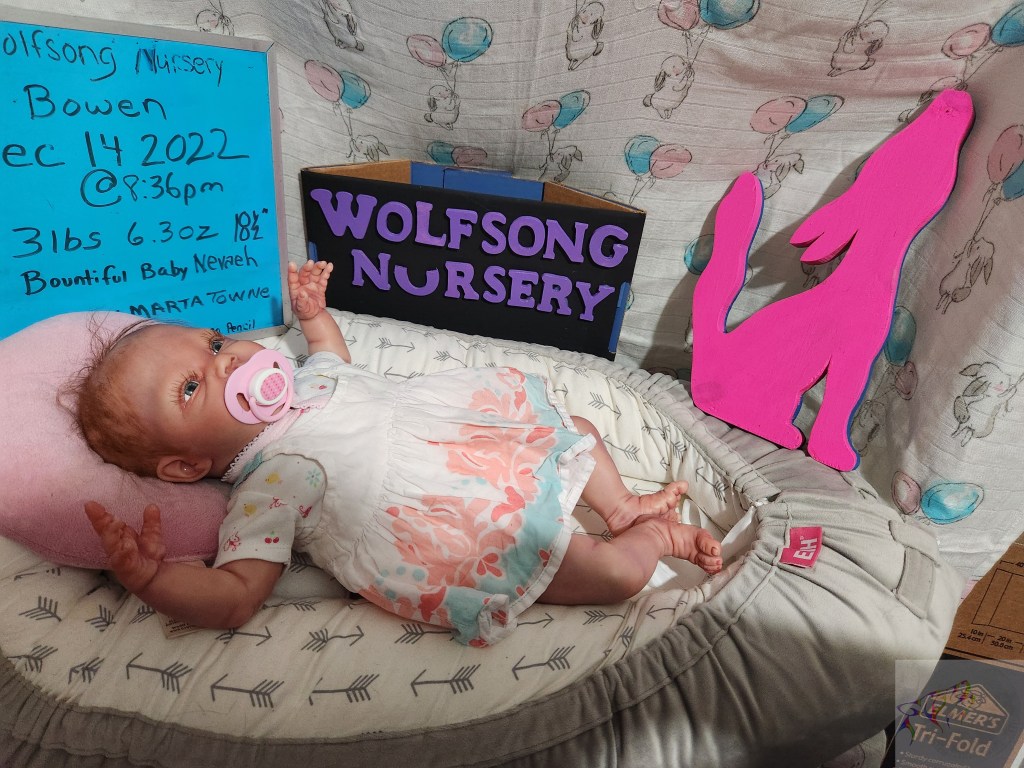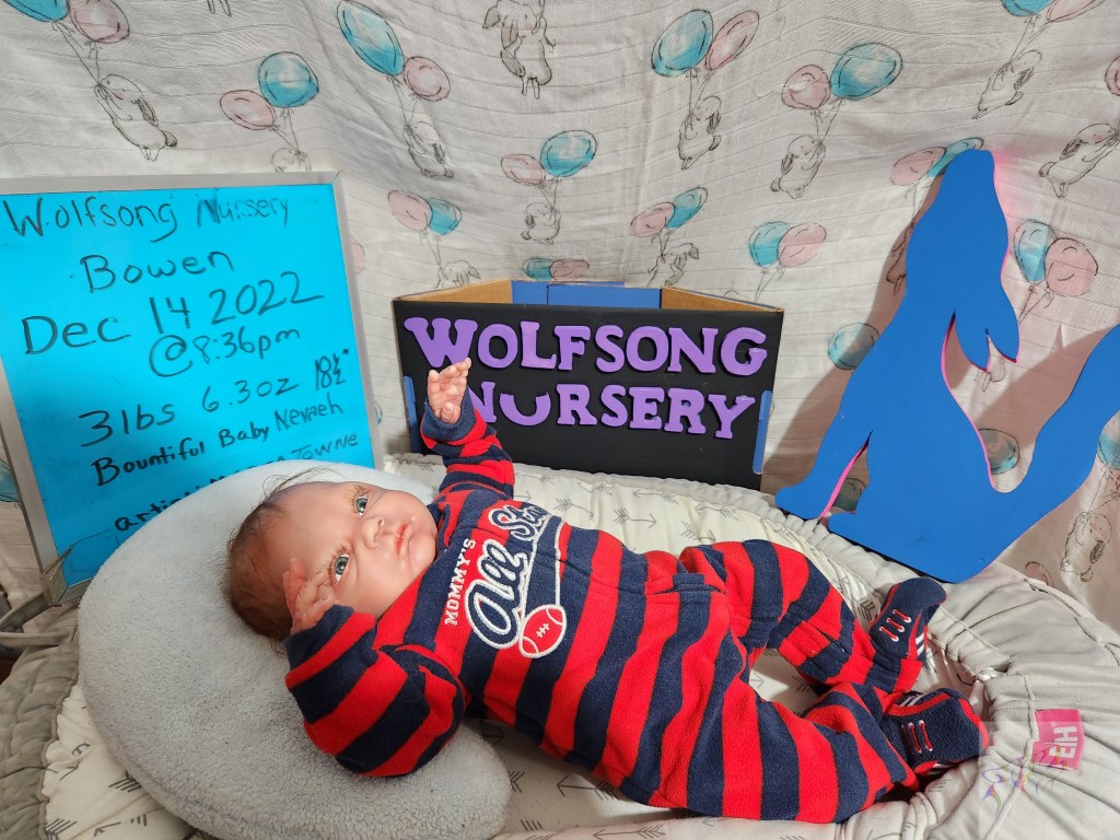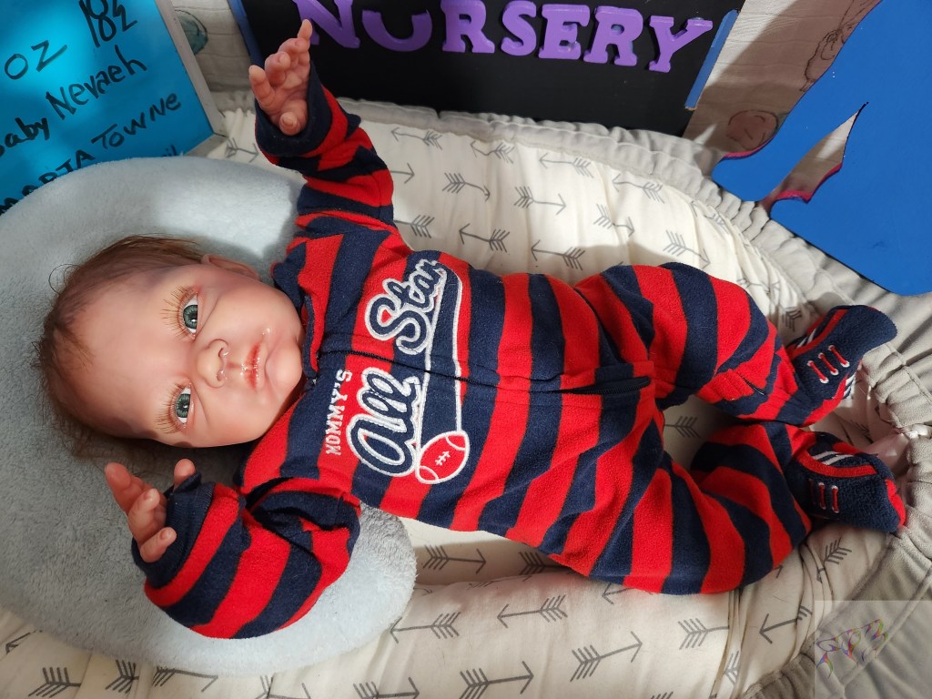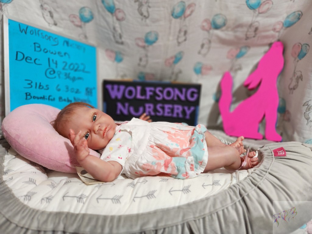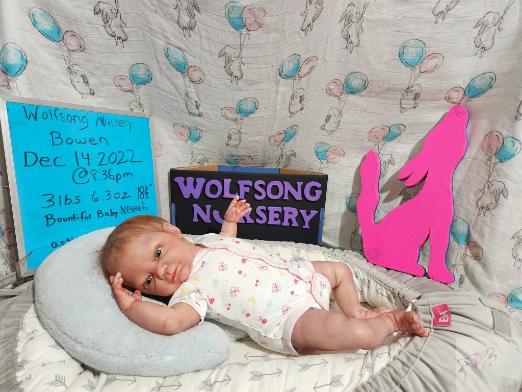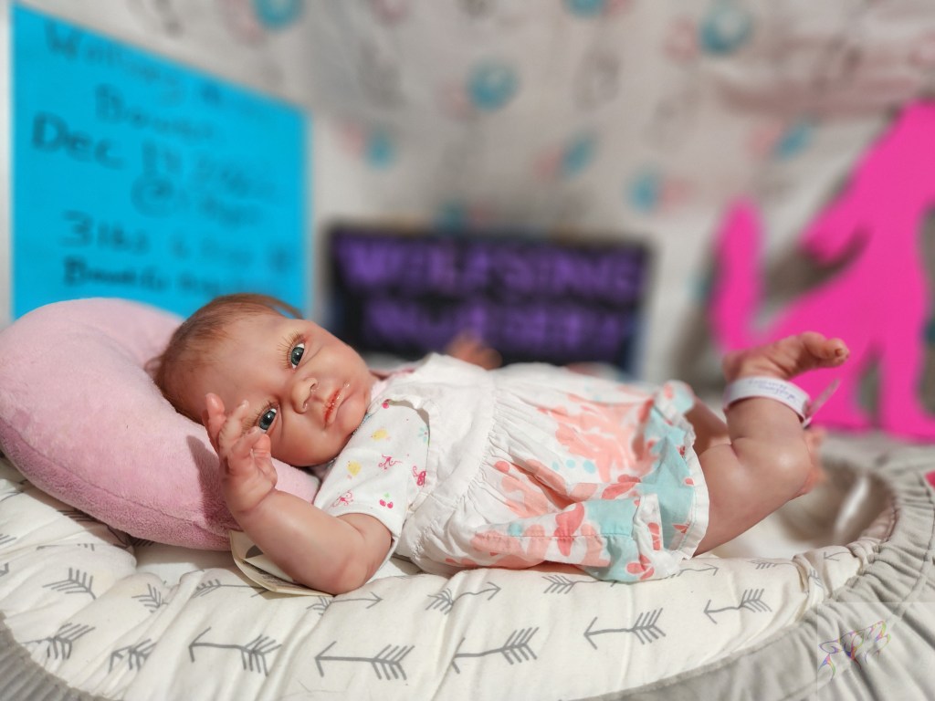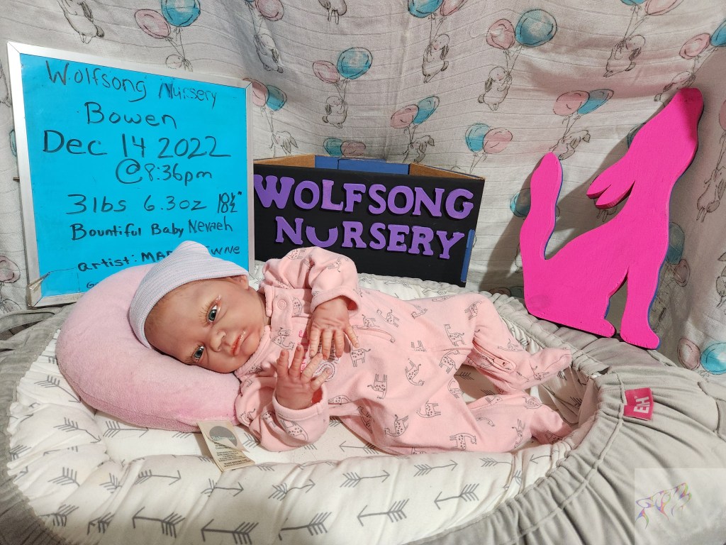 Weighted lightly (3lbs 6.3oz) with #3Glass Beads, and filled with polyfill to give the baby a wonderful, newborn “Floppy” feel, and a combi hair design (thanks to DEANNA BOWEN for her hair cutting ability), I honestly think Bowen is a great representation of Nancy’s Kids and Grandkids. Bowen is even going to his new mommy in the clothes and hat that APRIL JETT (Nancy’s granddaughter) was dressed in at her birth.