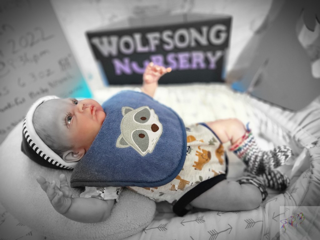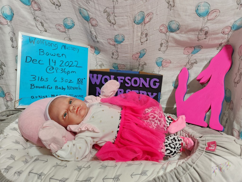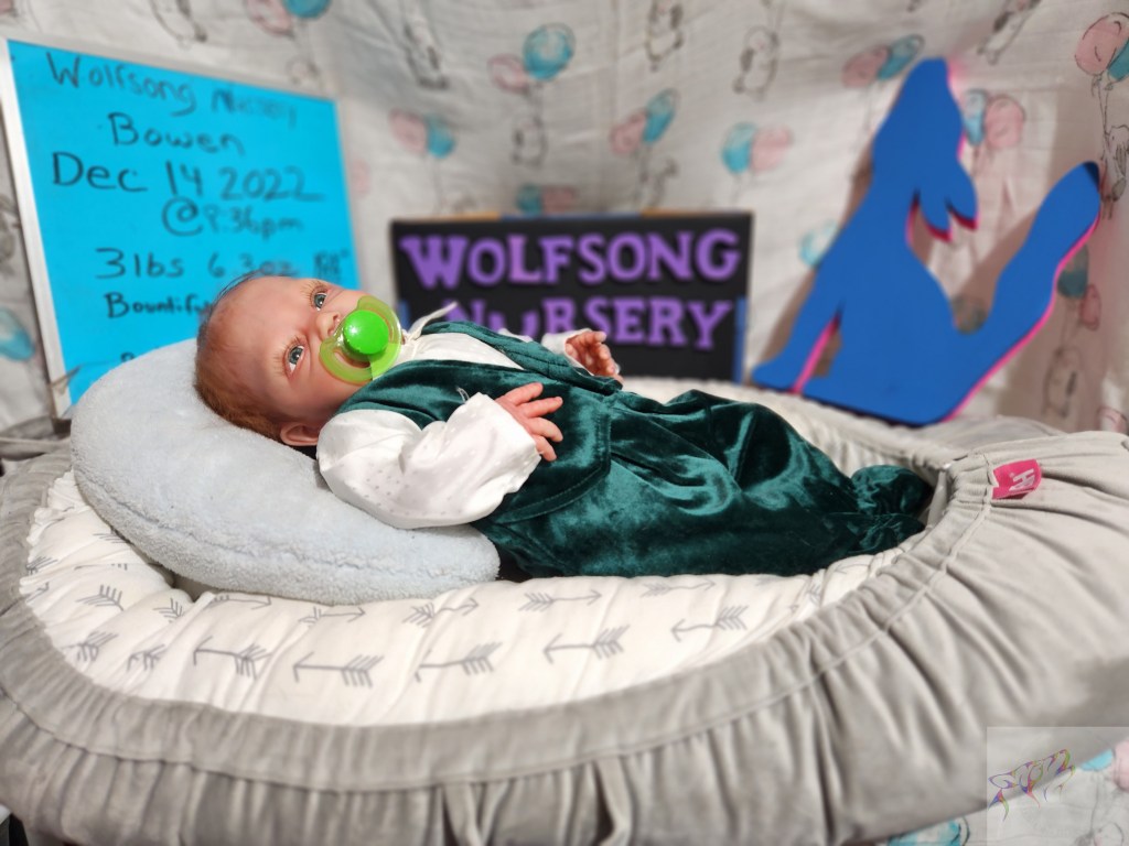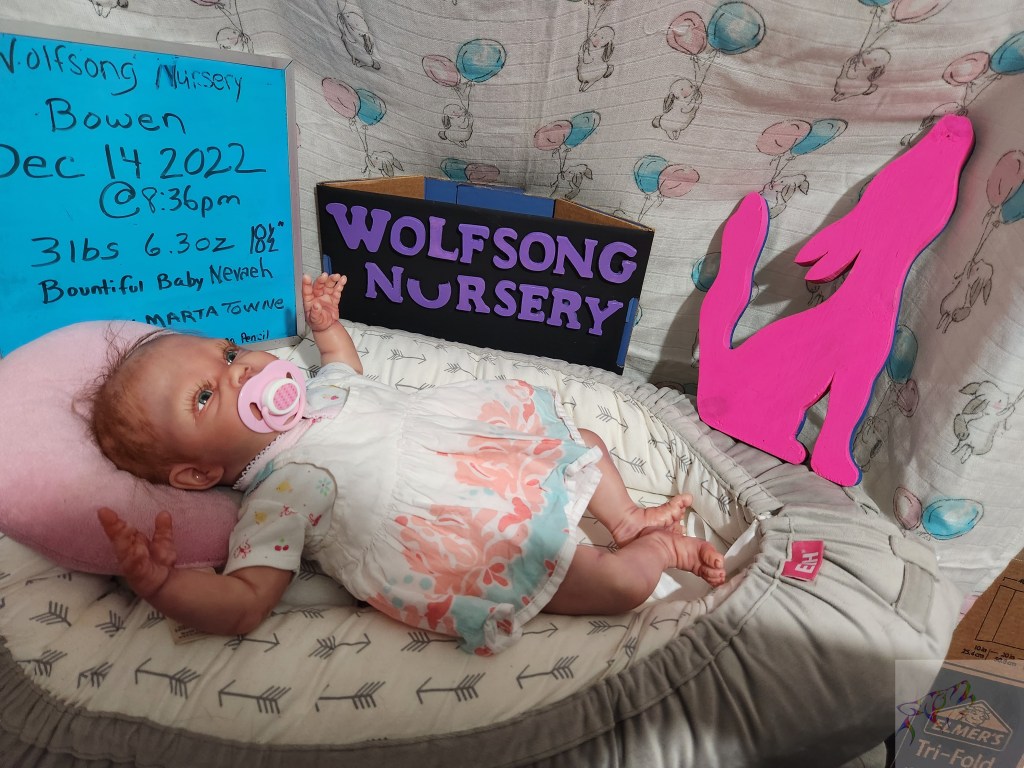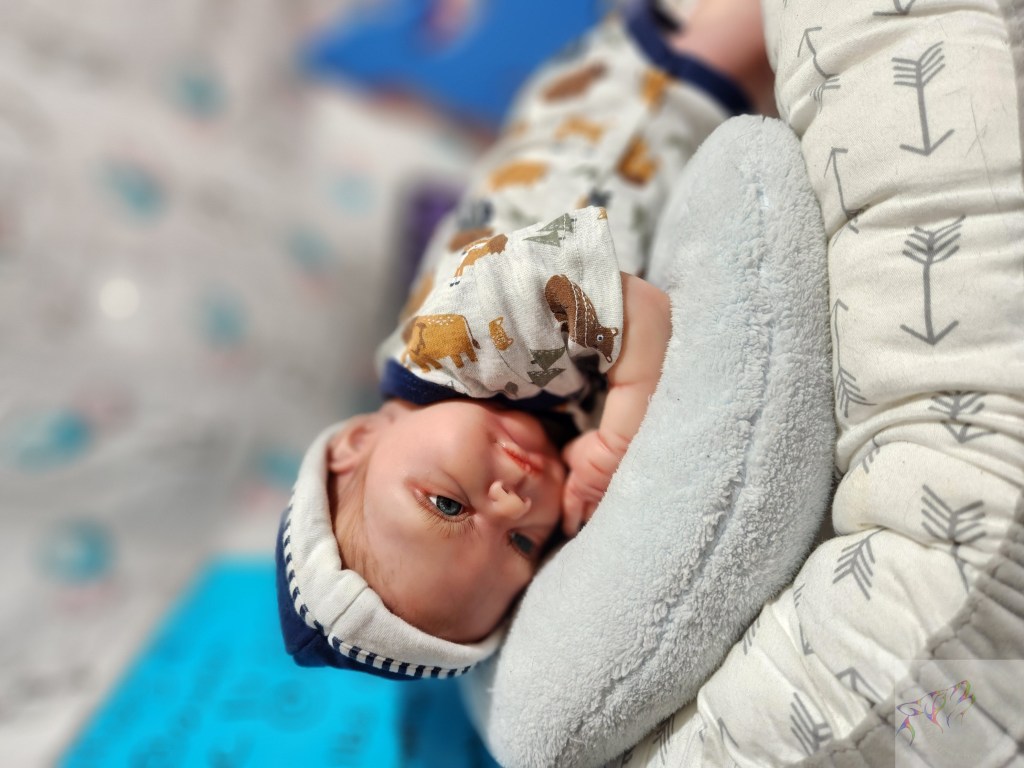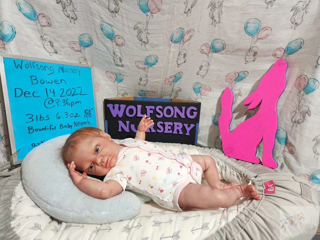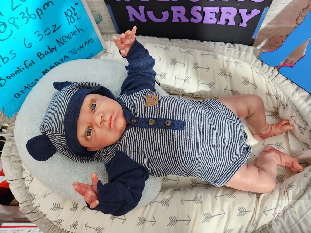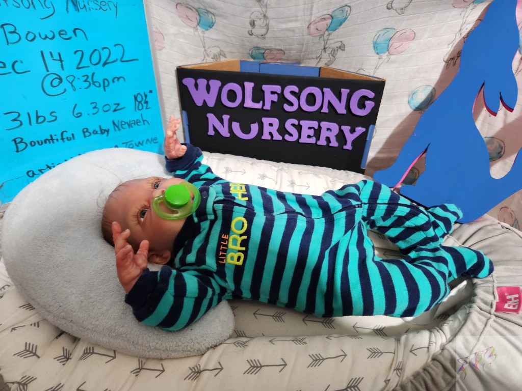 Weighted lightly (3lbs 6.3oz) with #3Glass Beads, and filled with polyfill to give the baby a wonderful, newborn “Floppy” feel, and a combi hair design (thanks to DEANNA BOWEN for her hair cutting ability), I honestly think Bowen is a great representation of Nancy’s Kids and Grandkids. Bowen is even going to his new mommy in the clothes and hat that APRIL JETT (Nancy’s granddaughter) was dressed in at her birth.