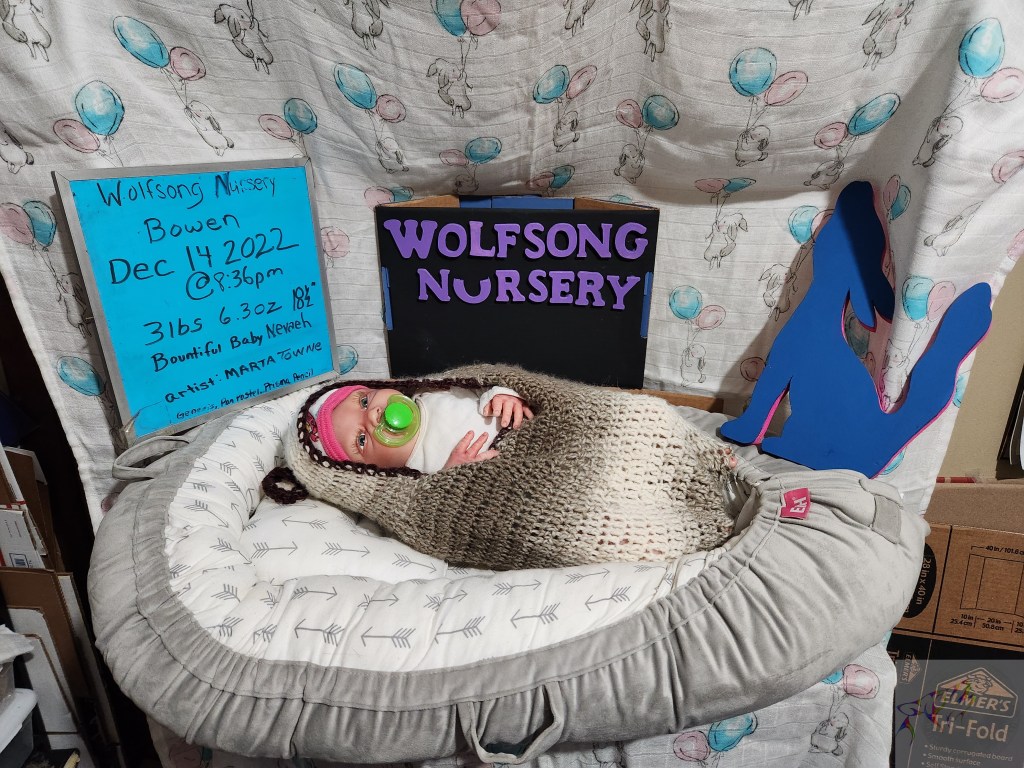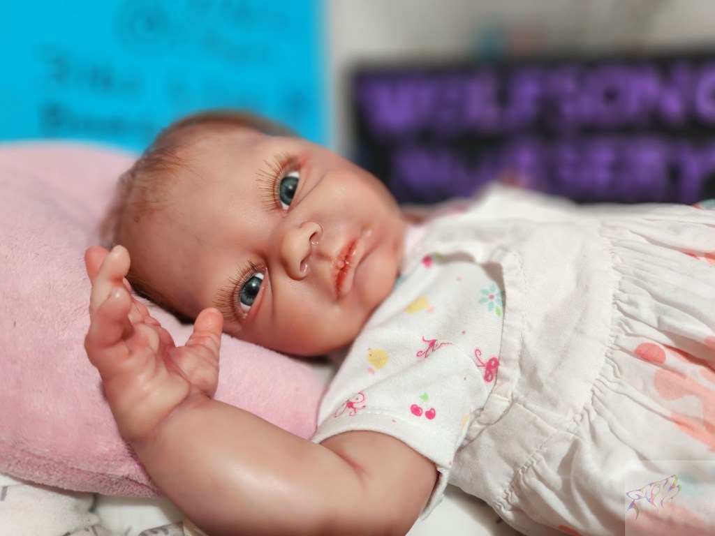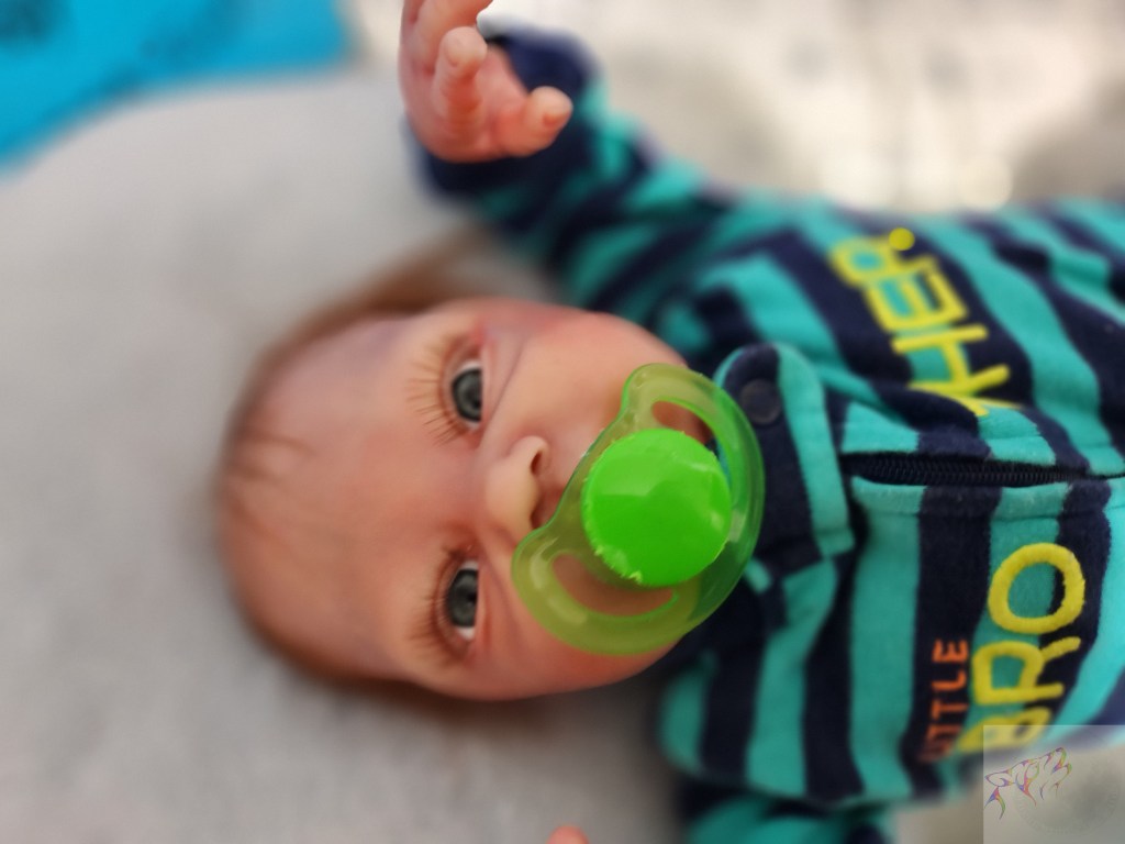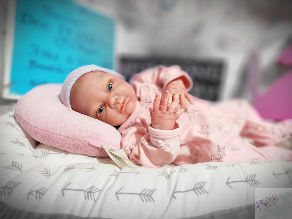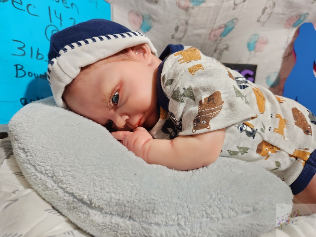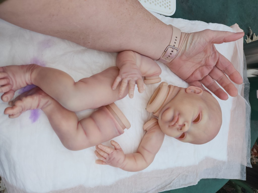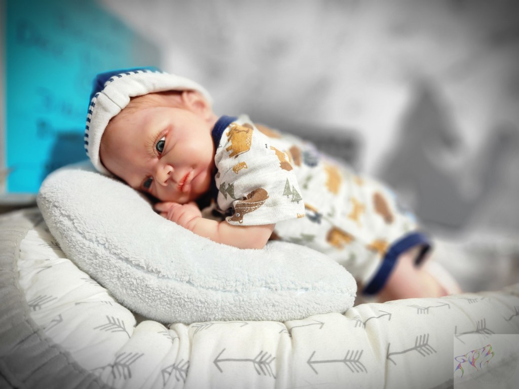 Weighted lightly (3lbs 6.3oz) with #3Glass Beads, and filled with polyfill to give the baby a wonderful, newborn “Floppy” feel, and a combi hair design (thanks to DEANNA BOWEN for her hair cutting ability), I honestly think Bowen is a great representation of Nancy’s Kids and Grandkids. Bowen is even going to his new mommy in the clothes and hat that APRIL JETT (Nancy’s granddaughter) was dressed in at her birth.