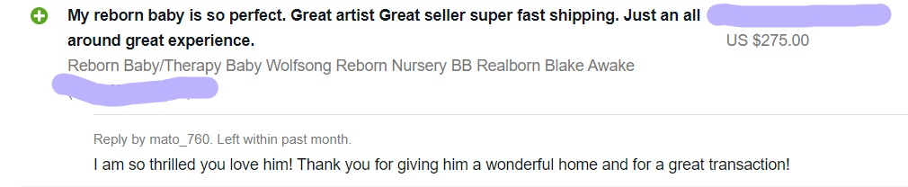 They pronounced him as perfect as Gracie ( liberty doll b y laura lee eagles) and as beautiful as my triplet s atticus.we are both worn out.so off to sleep we go. I will try to send pics next time. Thank you,so much! God bless you! Jenny and cass” (Ebay Messages 9/19/21)