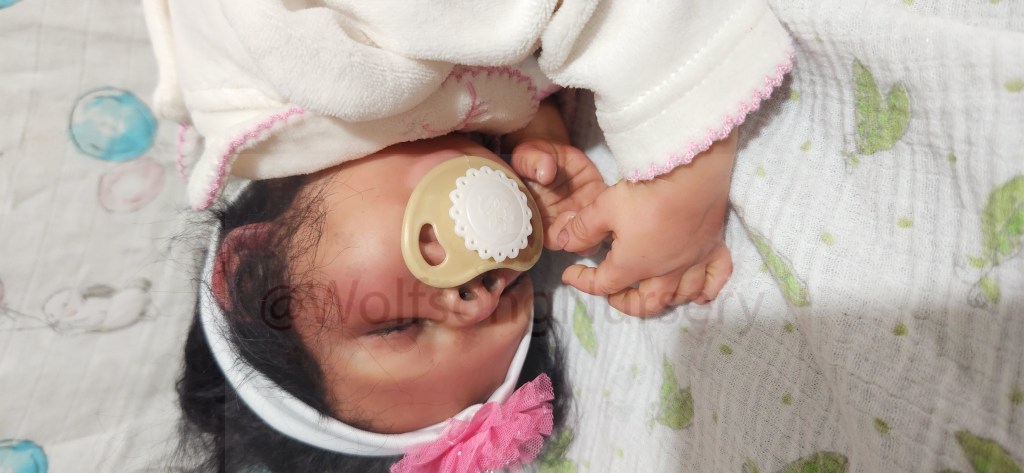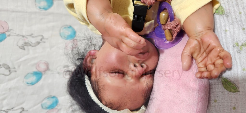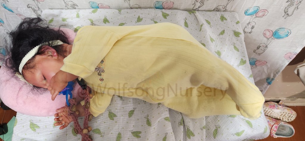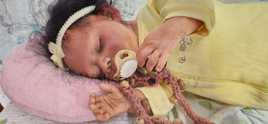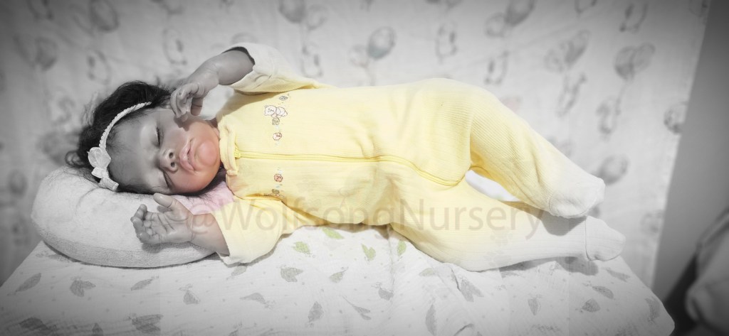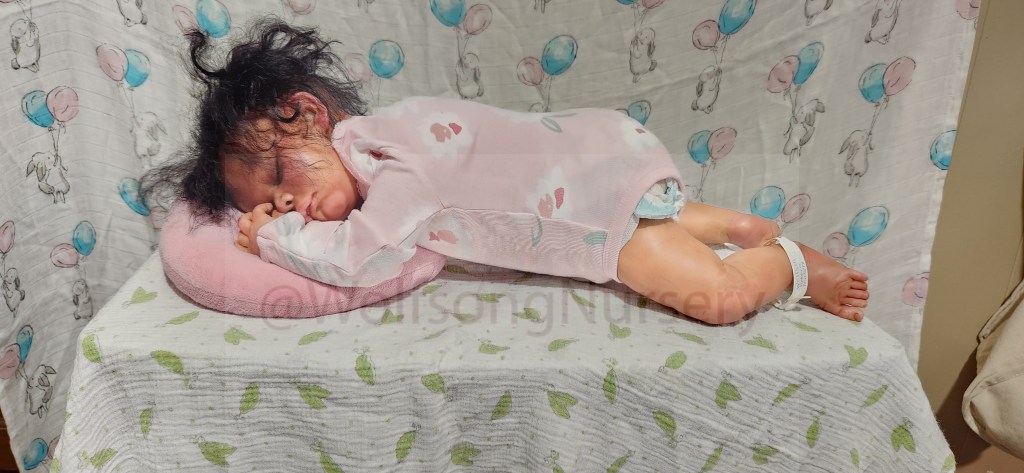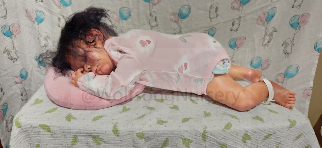 This is the GabbyGail Sleeping kit by Claire Taylor and painted by me in Genesis Heat set paints, pan pastel and Coastal Scents powders and Prisma pencils. She is fully rooted with black curly Tammy O’Meara high quality Mohair.