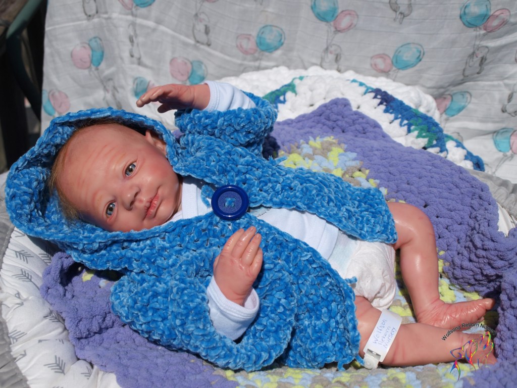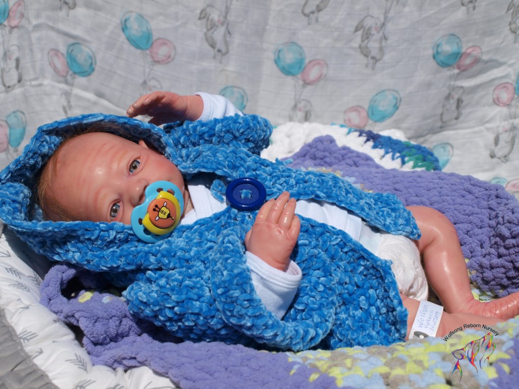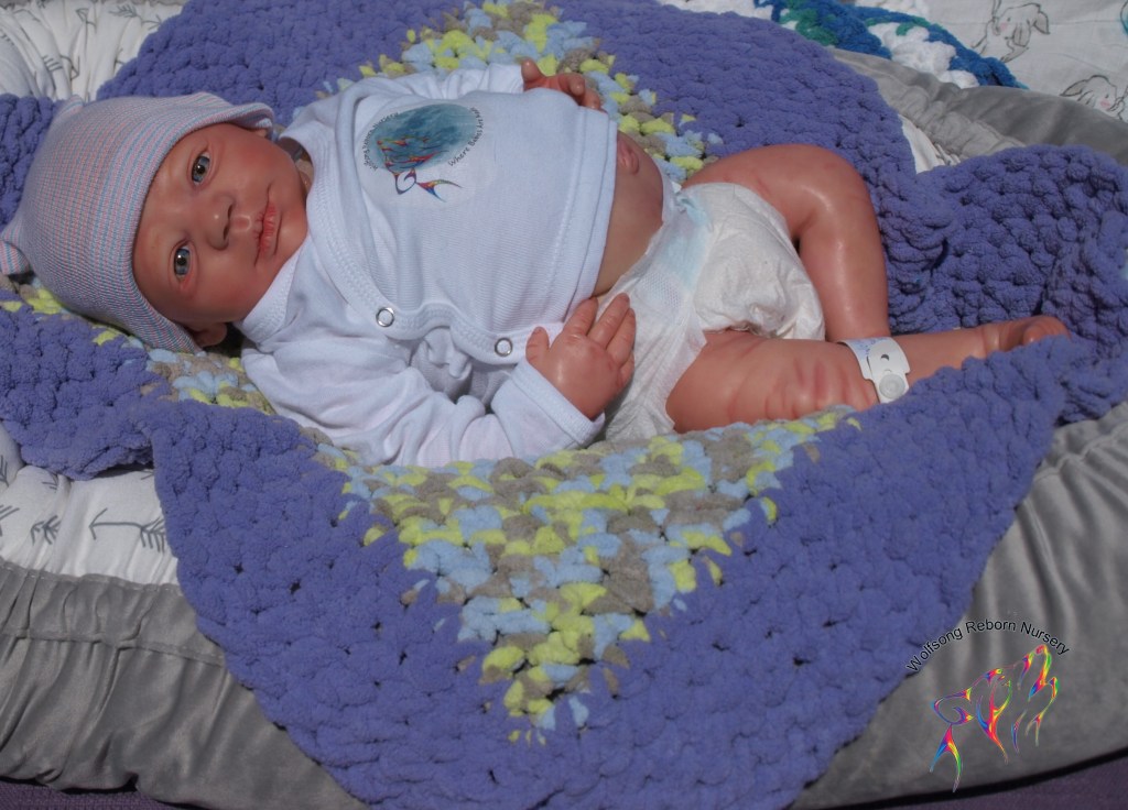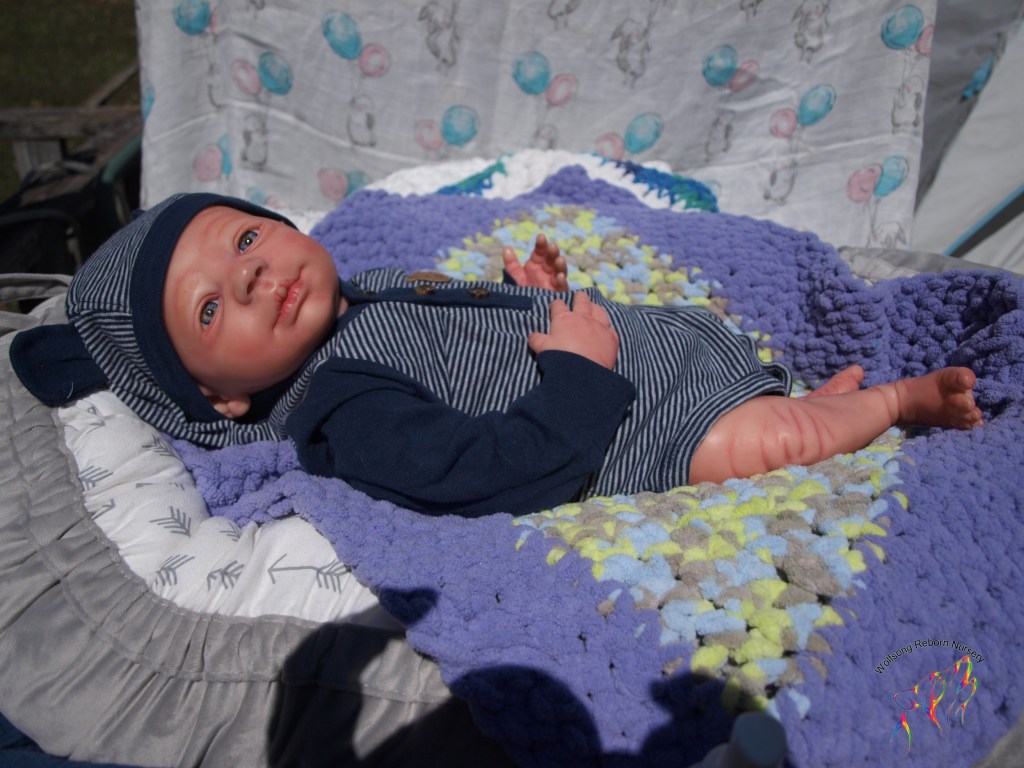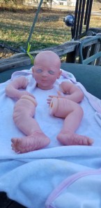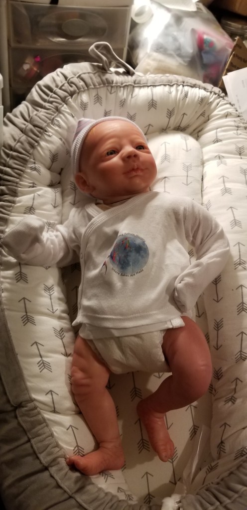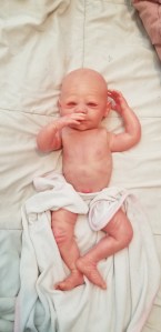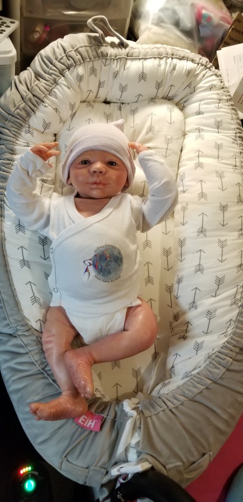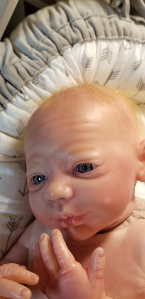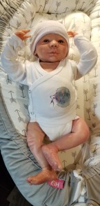 (S)He has a magnet behind his mouth and another inside the top of the head (for magnetic hari accessories) Each of the limbs and head have rings to aid in posing and (s)he comes with a belly plate that give the precious little tummy the most adorable pudge. INside his/her clothe body is a silicone pad in her tummy, and one in each of his butt cheeks, these really make her bottom and tummy feel real….and around them, holding them in place and filling them out is super soft polyfill. (S)He is weighted with high quality Glass beads encased in microfiber bags to prevent spillage (head and neck) and in the limbs packed in by polyfilly and sealed with a round felt pad. His/HER beautiful eyes seem to see into your soul; (s)he’s one of those “old souls’ that sometimes come as a baby and just seem to know how the world works.