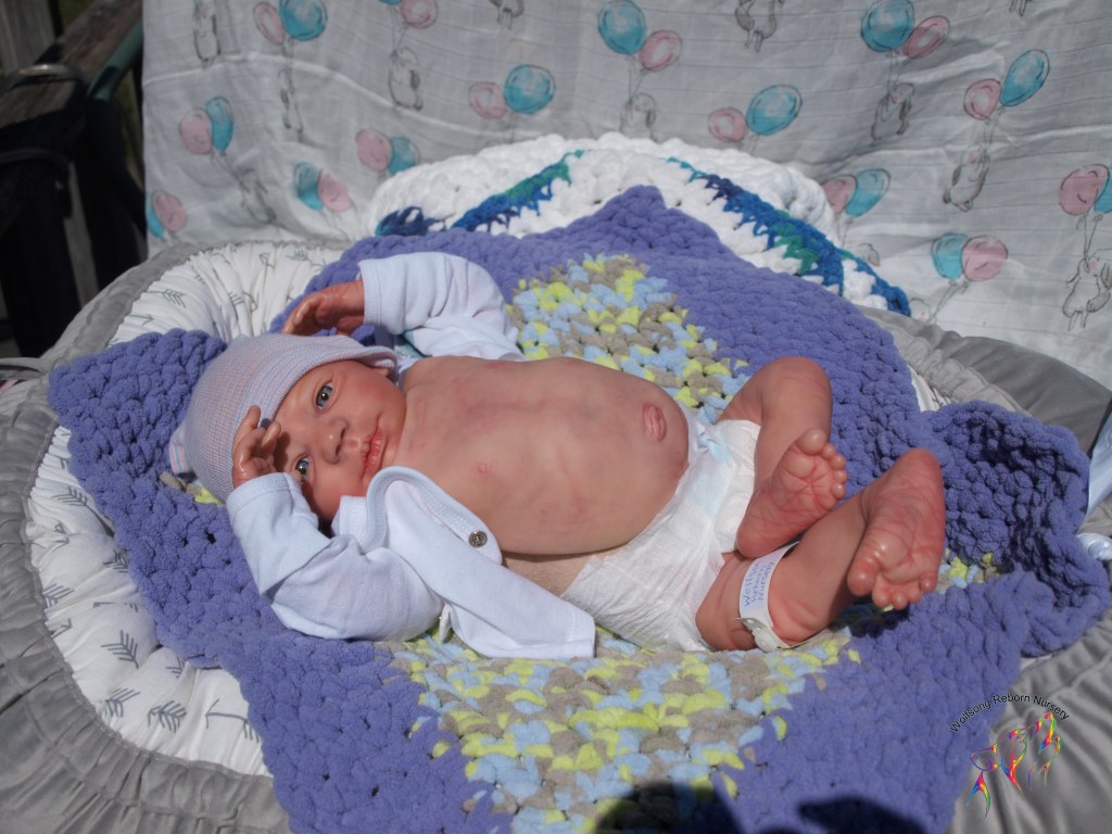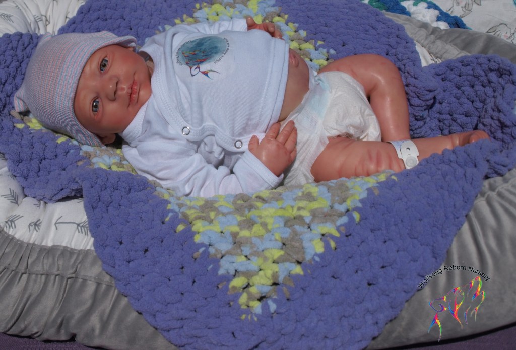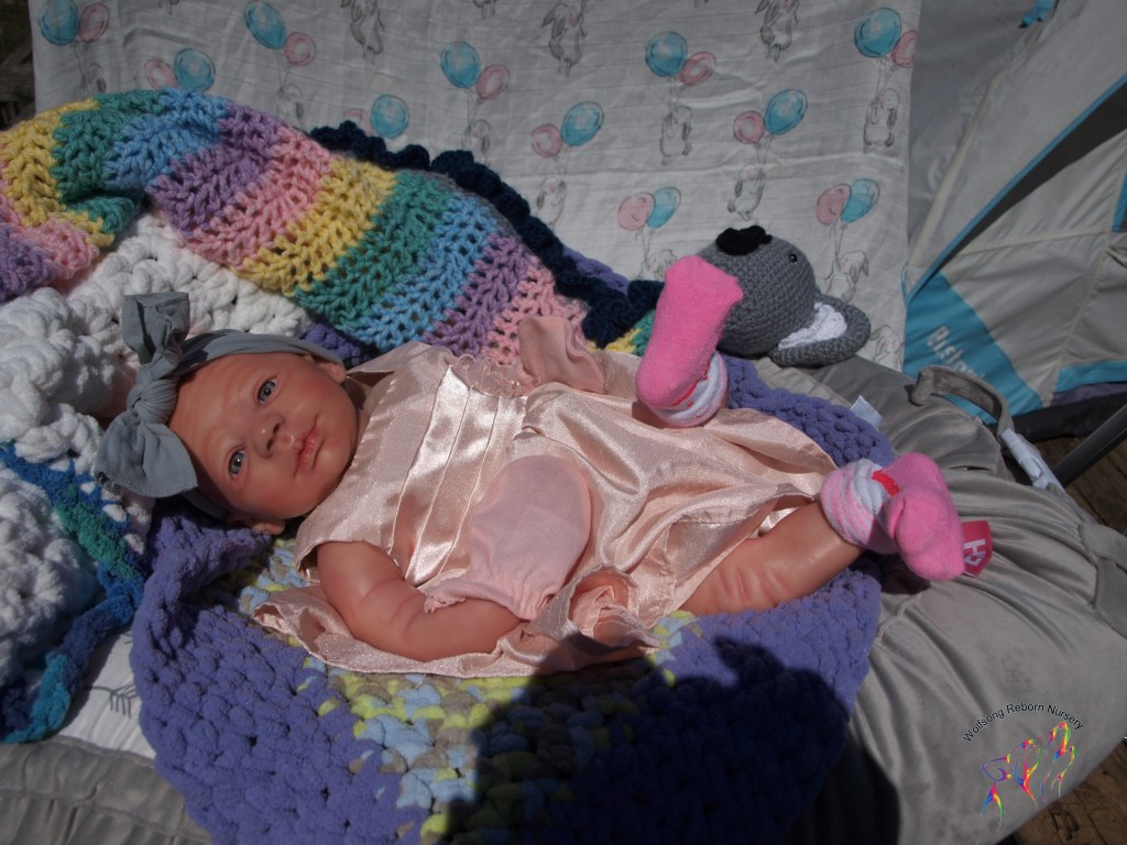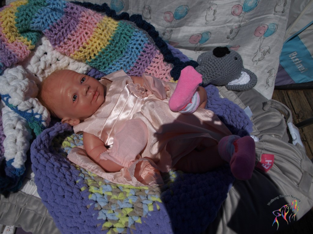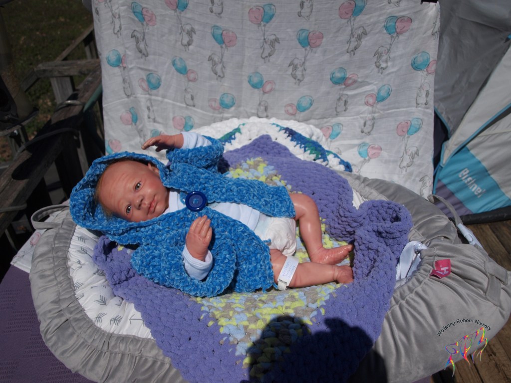 (S)He has a magnet behind his mouth and another inside the top of the head (for magnetic hari accessories) Each of the limbs and head have rings to aid in posing and (s)he comes with a belly plate that give the precious little tummy the most adorable pudge. INside his/her clothe body is a silicone pad in her tummy, and one in each of his butt cheeks, these really make her bottom and tummy feel real….and around them, holding them in place and filling them out is super soft polyfill. (S)He is weighted with high quality Glass beads encased in microfiber bags to prevent spillage (head and neck) and in the limbs packed in by polyfilly and sealed with a round felt pad. His/HER beautiful eyes seem to see into your soul; (s)he’s one of those “old souls’ that sometimes come as a baby and just seem to know how the world works.