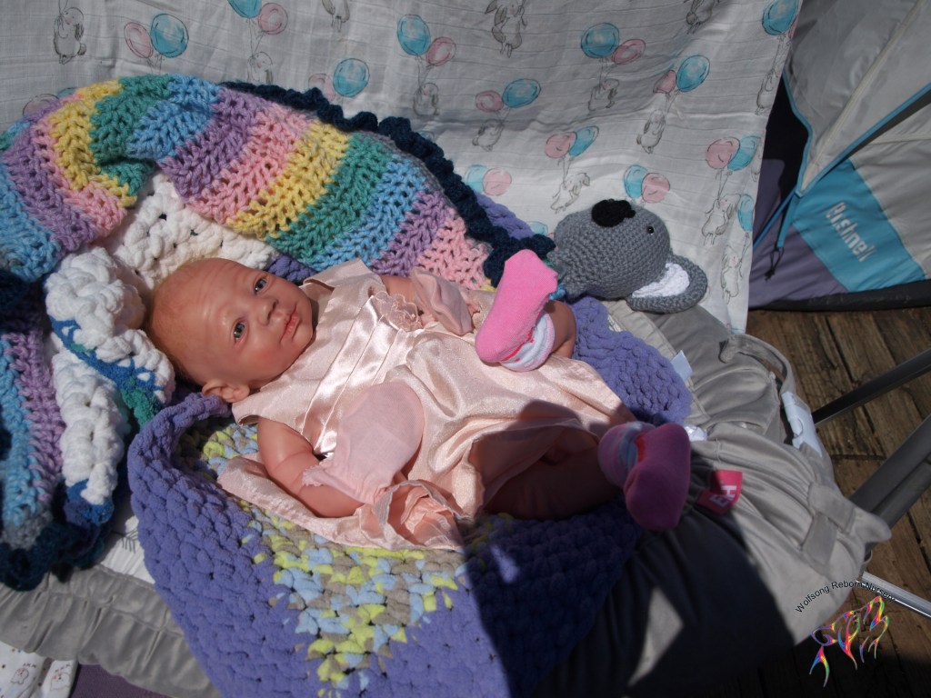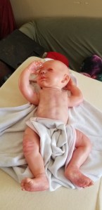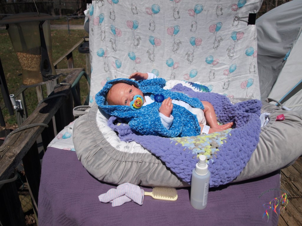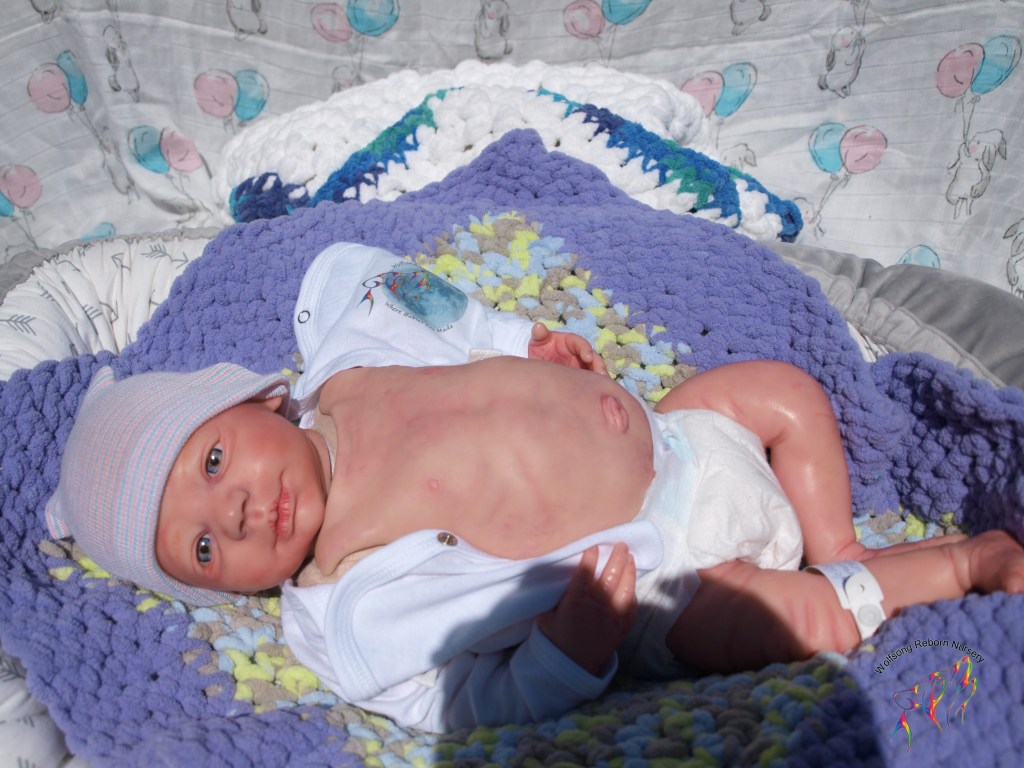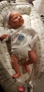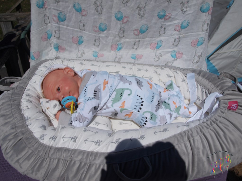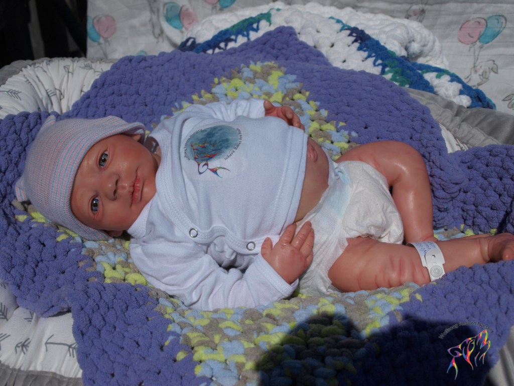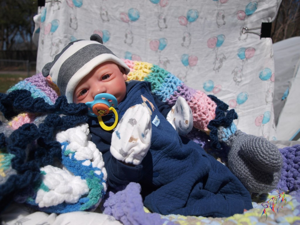 (S)He has a magnet behind his mouth and another inside the top of the head (for magnetic hari accessories) Each of the limbs and head have rings to aid in posing and (s)he comes with a belly plate that give the precious little tummy the most adorable pudge. INside his/her clothe body is a silicone pad in her tummy, and one in each of his butt cheeks, these really make her bottom and tummy feel real….and around them, holding them in place and filling them out is super soft polyfill. (S)He is weighted with high quality Glass beads encased in microfiber bags to prevent spillage (head and neck) and in the limbs packed in by polyfilly and sealed with a round felt pad. His/HER beautiful eyes seem to see into your soul; (s)he’s one of those “old souls’ that sometimes come as a baby and just seem to know how the world works.