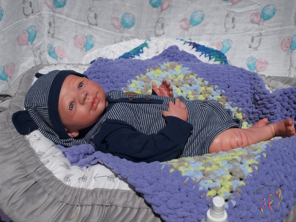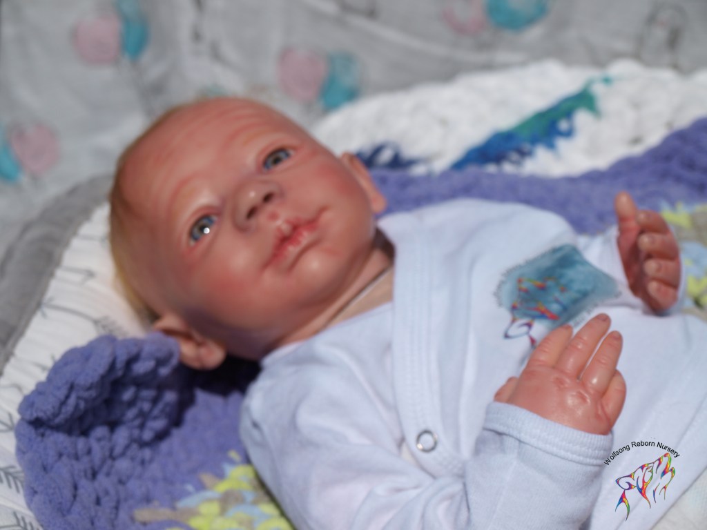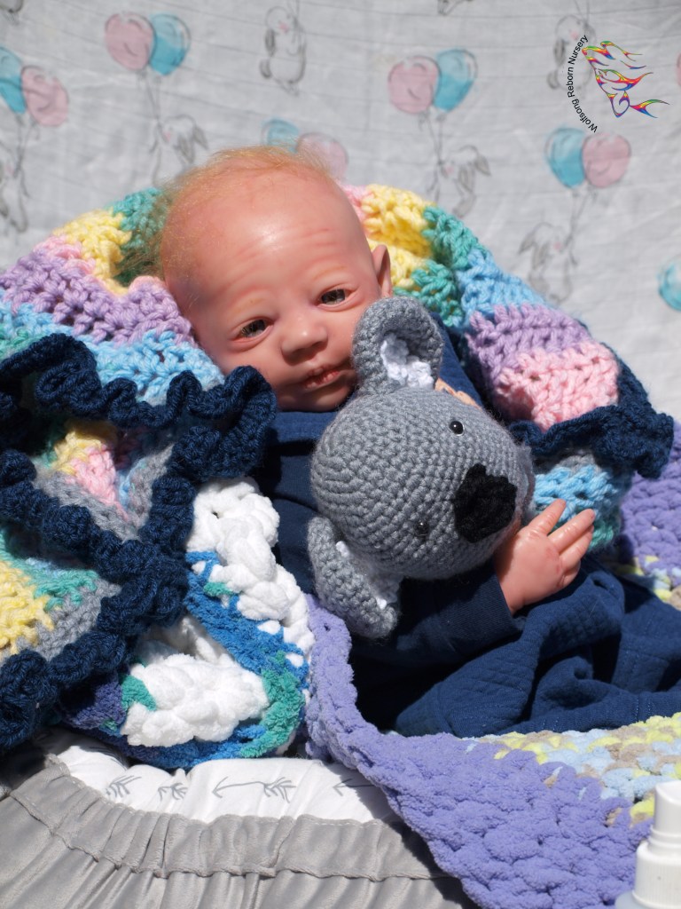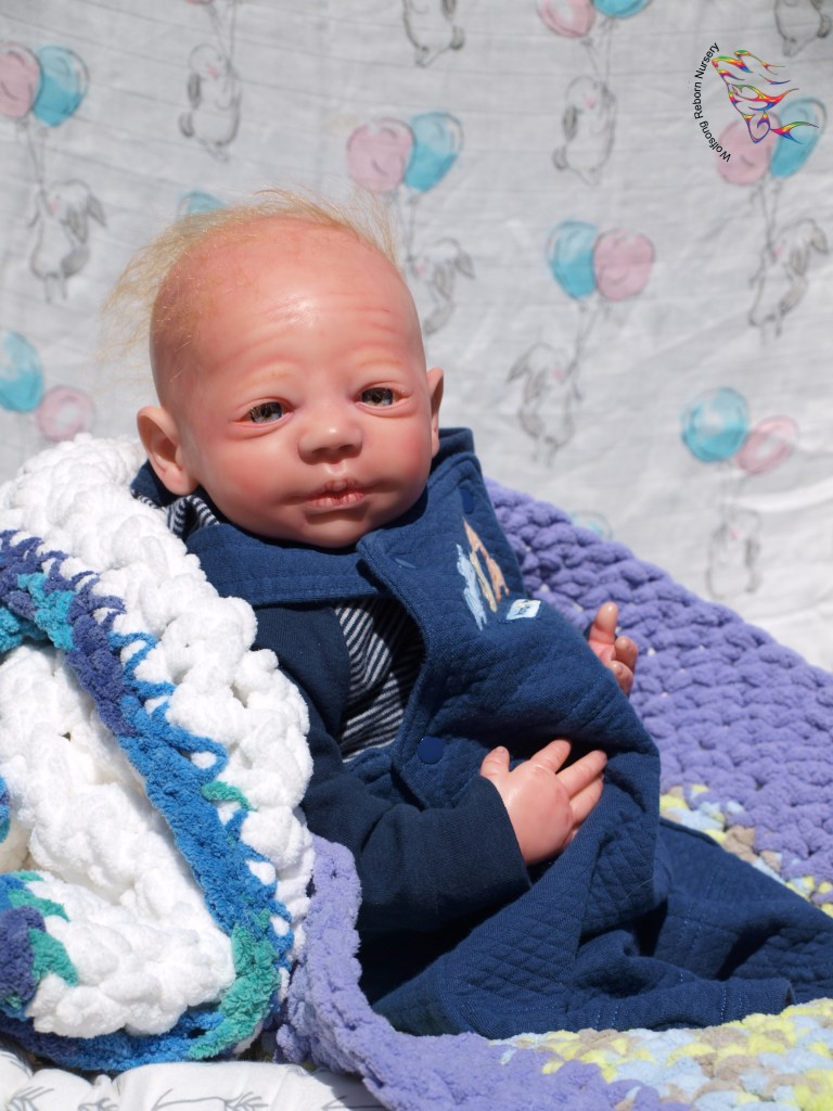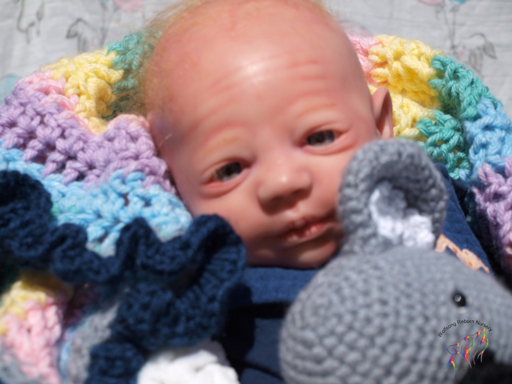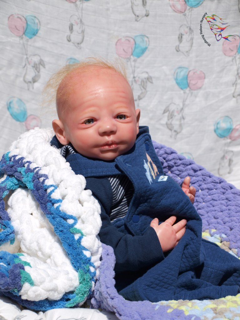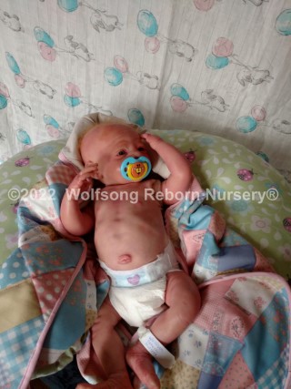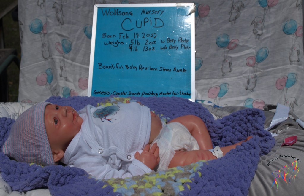 This is Cupid, (s)he was born on Feb 14, 2022 VALENTINES DAY at 5:22p.m. His/Her ginger hair is rooted as are teh very sparse ginger eyelashes, and (s)he’s painted with Genesis Heat Set Paints and Pan Pastel Powders, his prisma pencil eyebrows give the depth to his perfect little face. This is the Bountiful Baby Steven Awake kit reborned by myself, Marta of Wolfsong Nursery. (S)He is just teeming with high end extras that make his little body feel SO realistic.