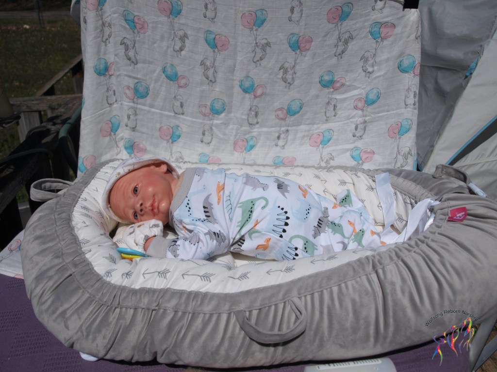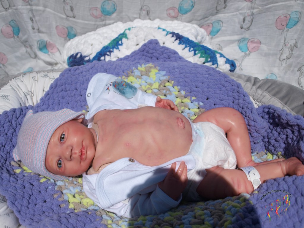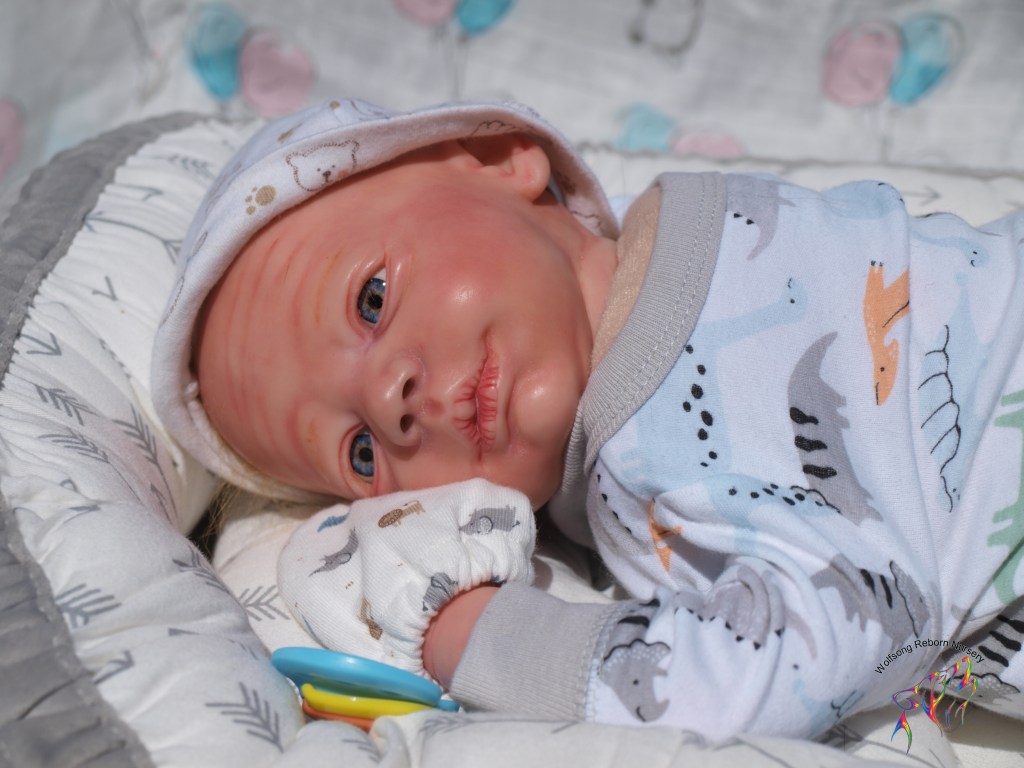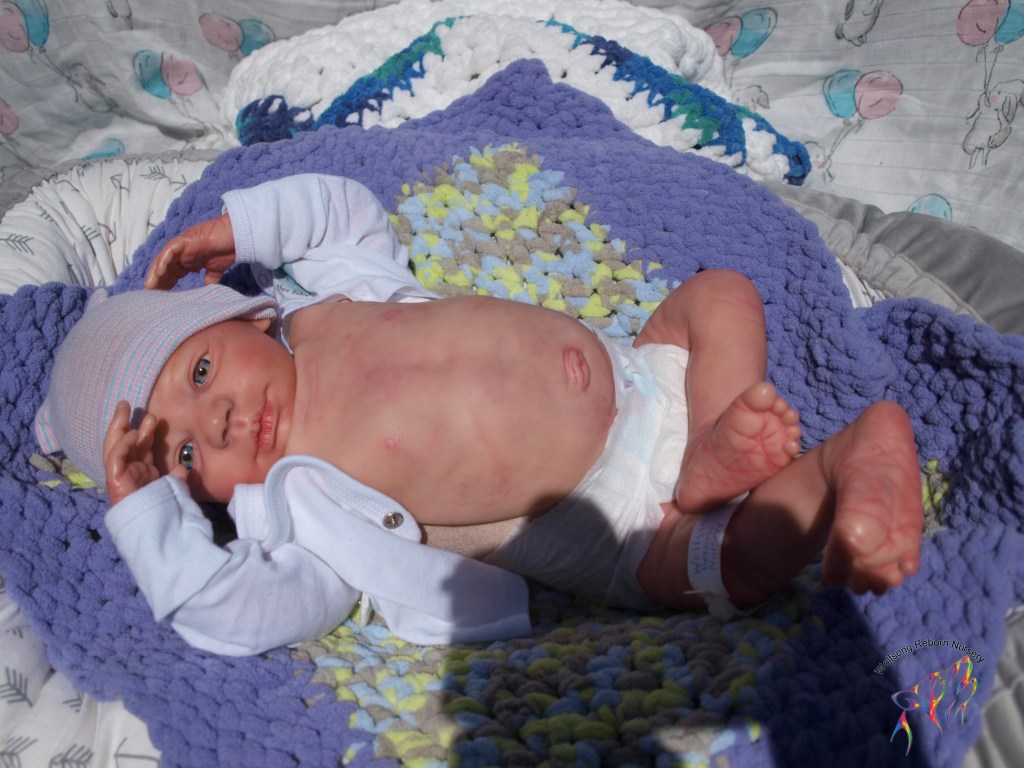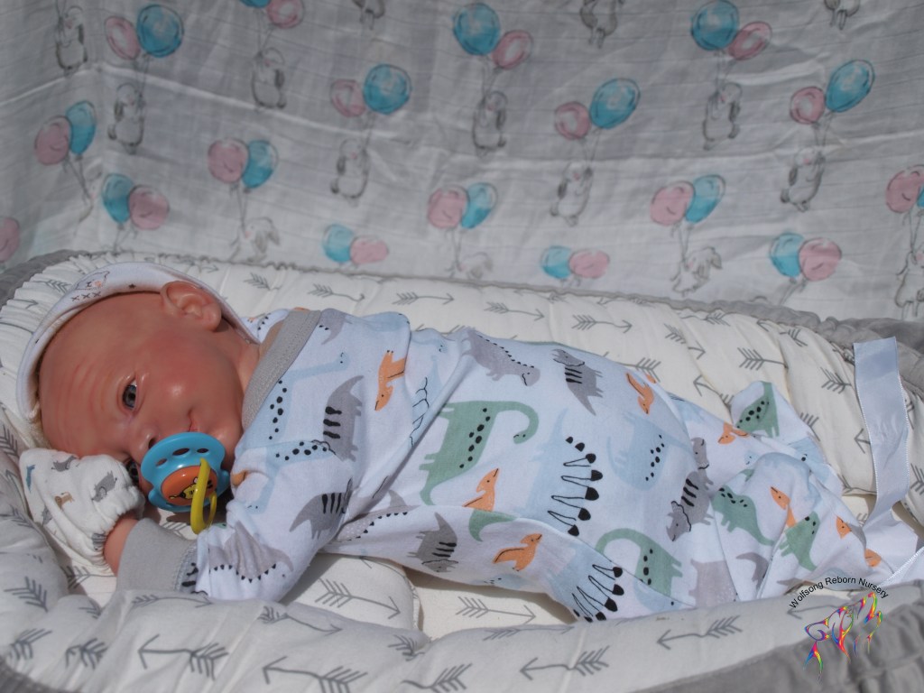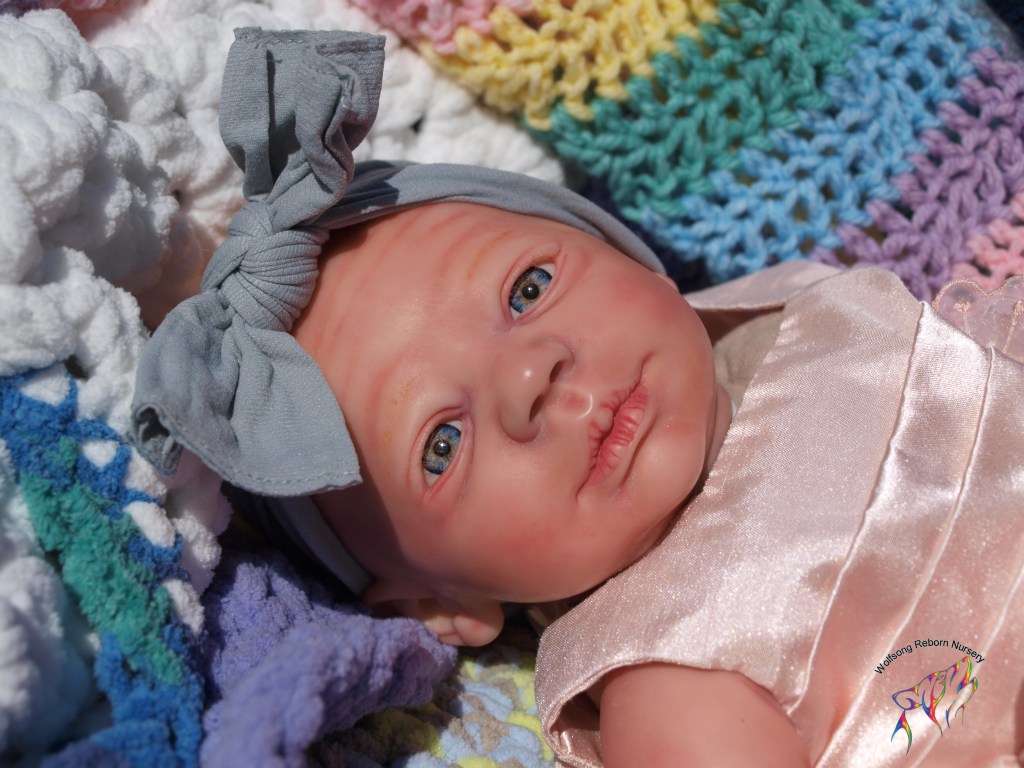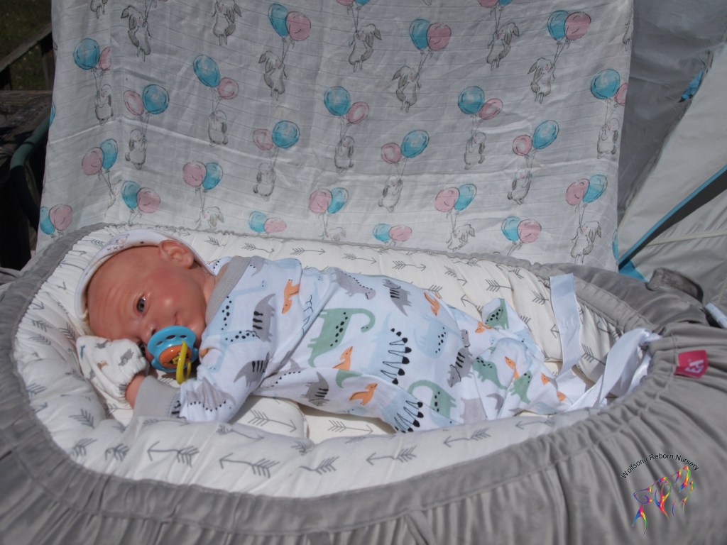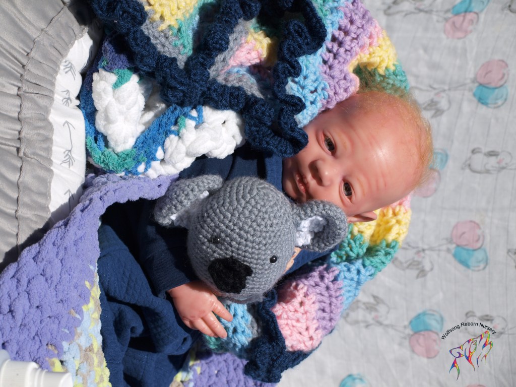 This is Cupid, (s)he was born on Feb 14, 2022 VALENTINES DAY at 5:22p.m. His/Her ginger hair is rooted as are teh very sparse ginger eyelashes, and (s)he’s painted with Genesis Heat Set Paints and Pan Pastel Powders, his prisma pencil eyebrows give the depth to his perfect little face. This is the Bountiful Baby Steven Awake kit reborned by myself, Marta of Wolfsong Nursery. (S)He is just teeming with high end extras that make his little body feel SO realistic.