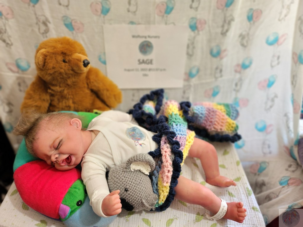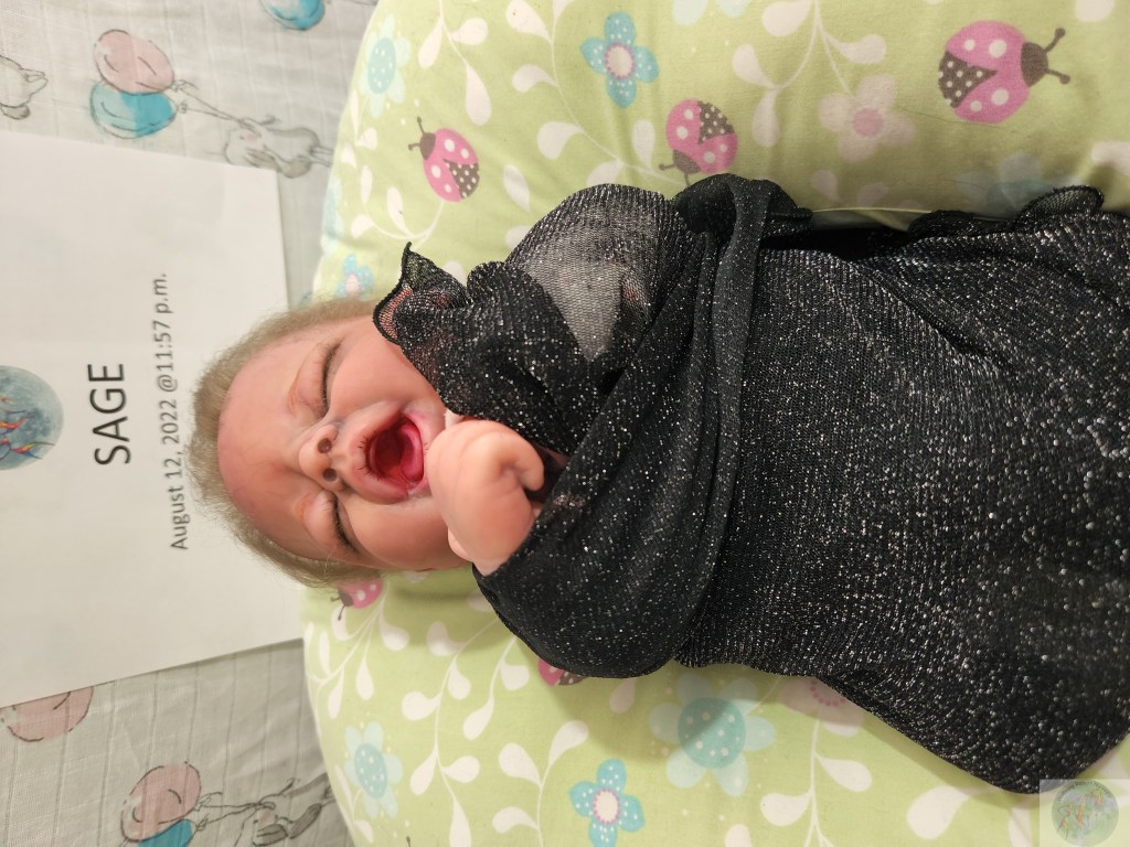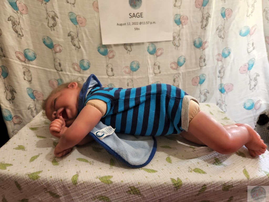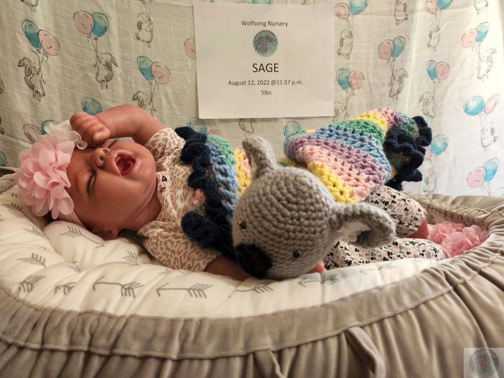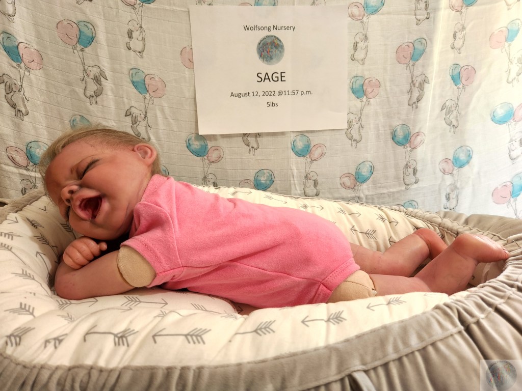 This is Pat Moulton’s SYDNEY kit from Bountiful Baby. Has been reborned by myself, Marta Towne of Wolfsong Nursery. “Born” August 12 11:57p.m. and weighs exactly 5lbs. Has 3/4 vinyl limbs, head and cloth body. Sage is painted with many translucent layers of GHSP. Rooted (not perfectly by any means) with high quality mohair, weighted with #3 Glass beads, two types of PolyFill, Silicone pads in the tummy and bottom. Sage takes a modified pacifier and HAS NO MAGNETS.