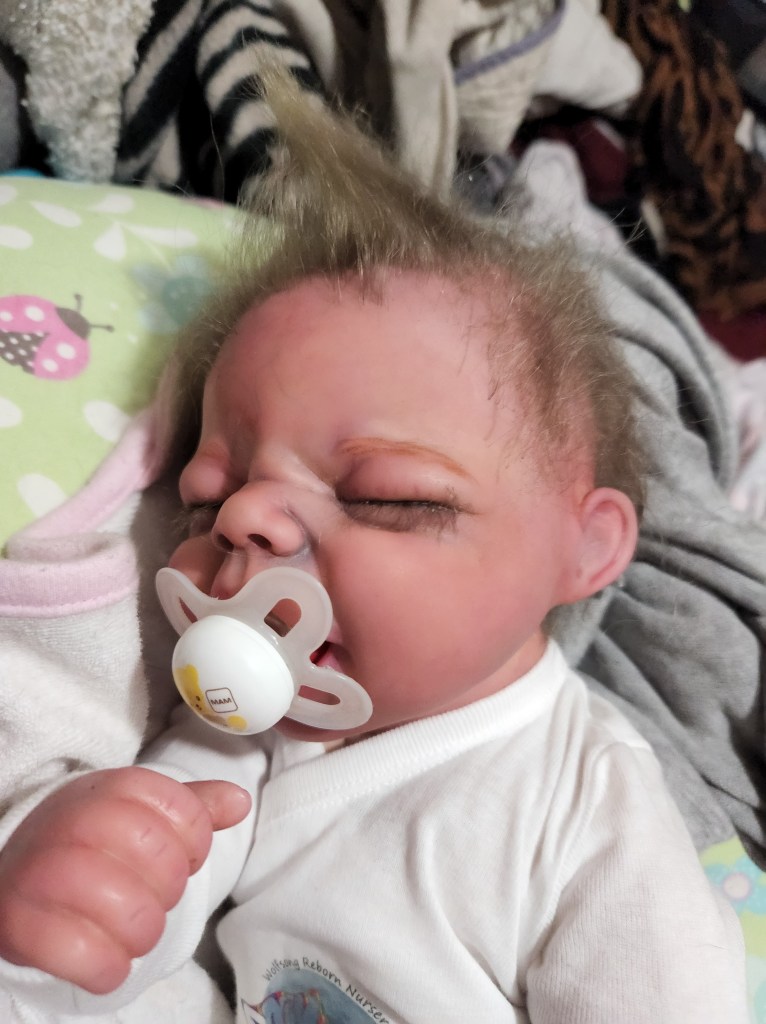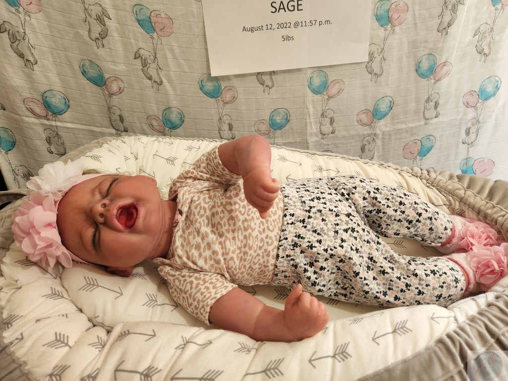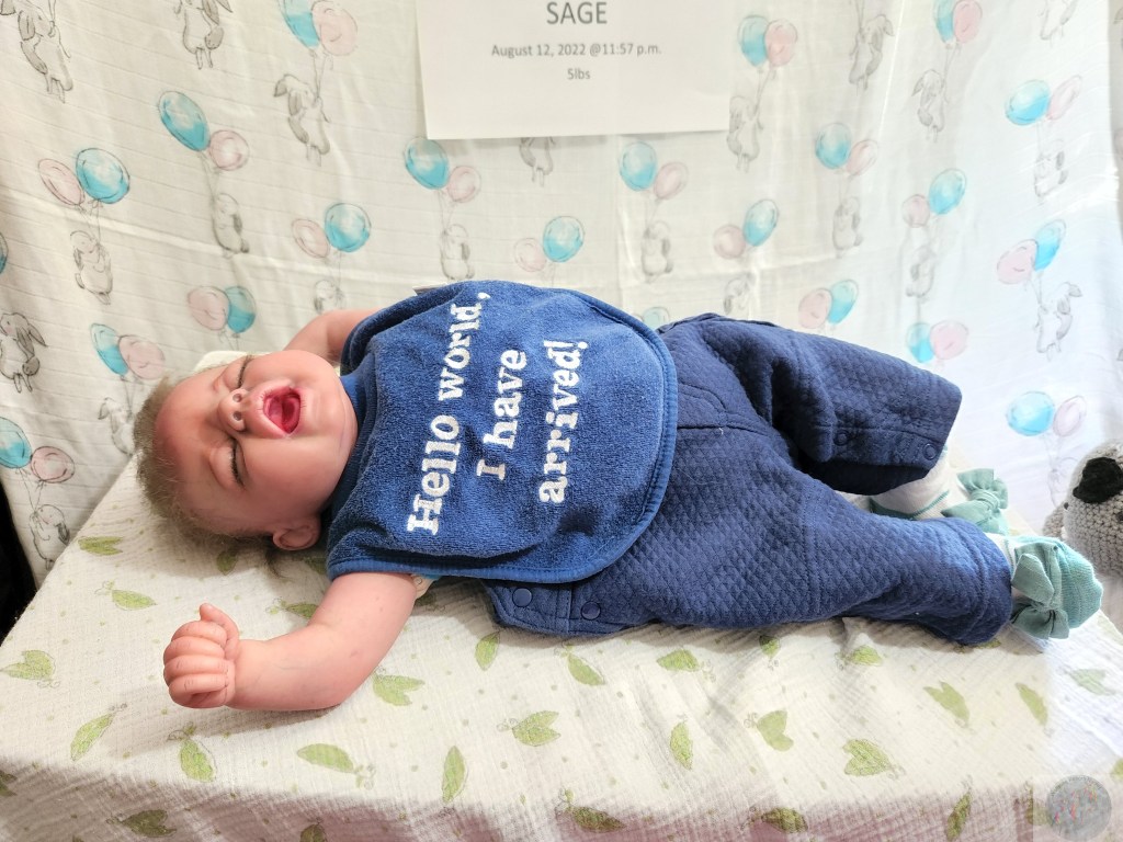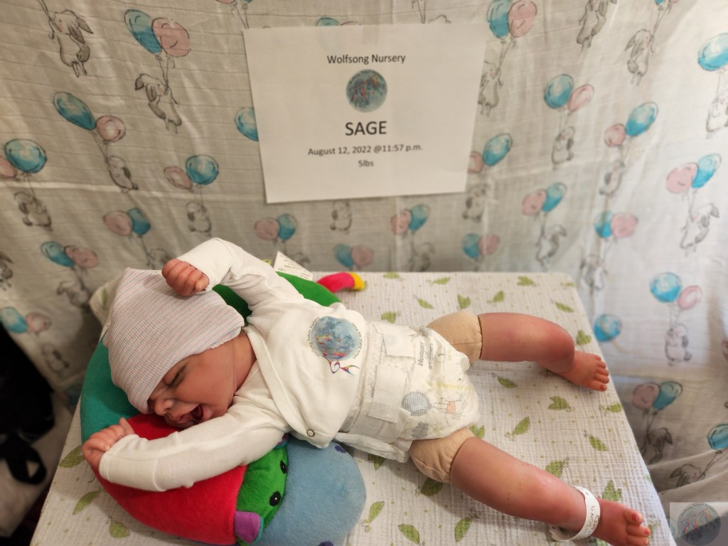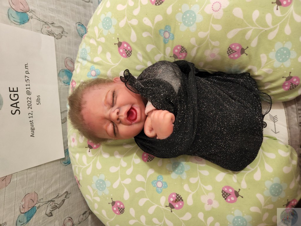 This is Pat Moulton’s SYDNEY kit from Bountiful Baby. Has been reborned by myself, Marta Towne of Wolfsong Nursery. “Born” August 12 11:57p.m. and weighs exactly 5lbs. Has 3/4 vinyl limbs, head and cloth body. Sage is painted with many translucent layers of GHSP. Rooted (not perfectly by any means) with high quality mohair, weighted with #3 Glass beads, two types of PolyFill, Silicone pads in the tummy and bottom. Sage takes a modified pacifier and HAS NO MAGNETS.
