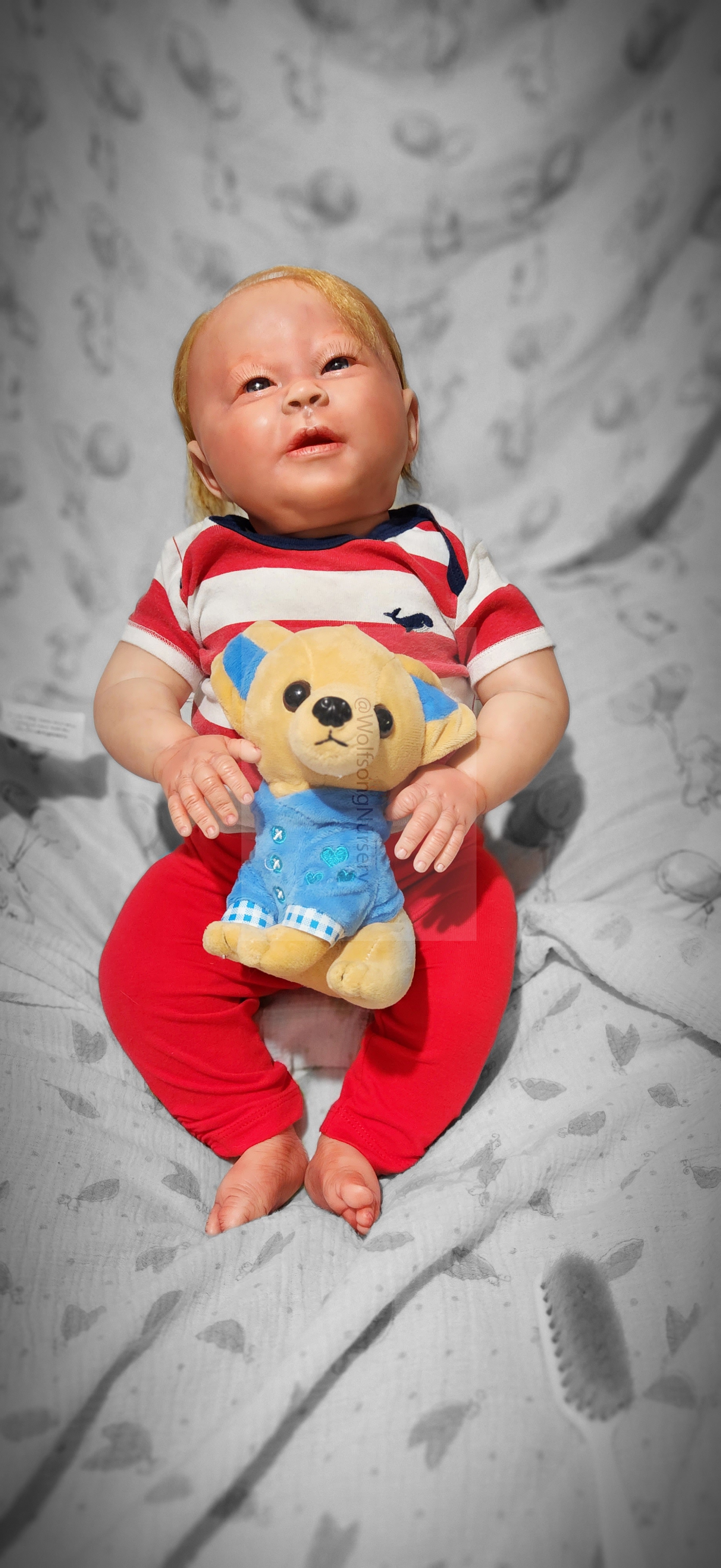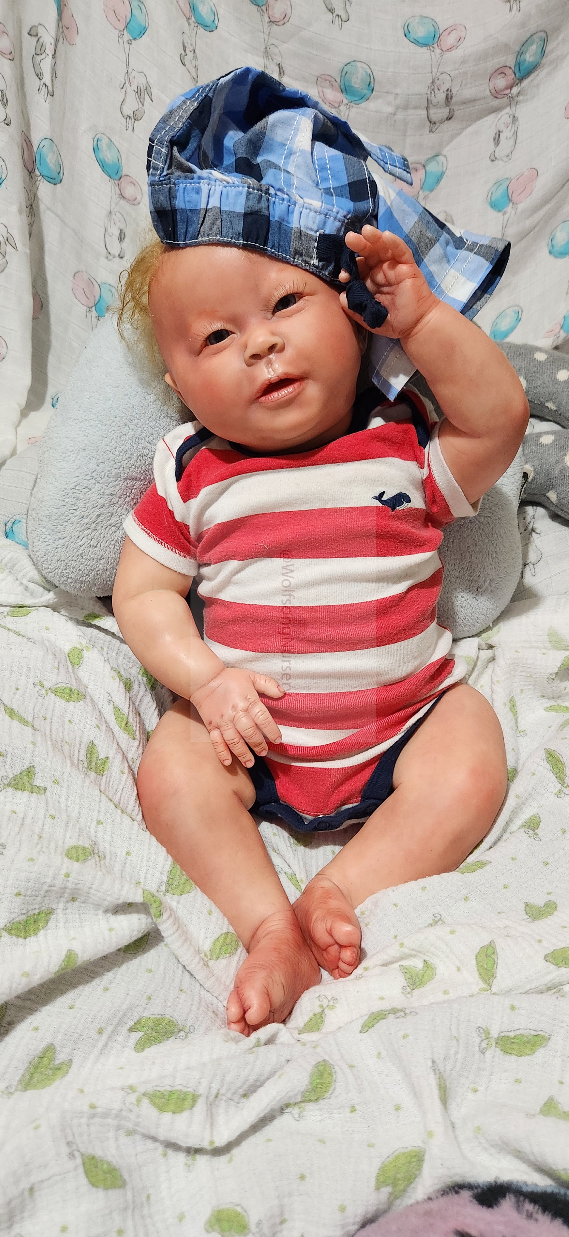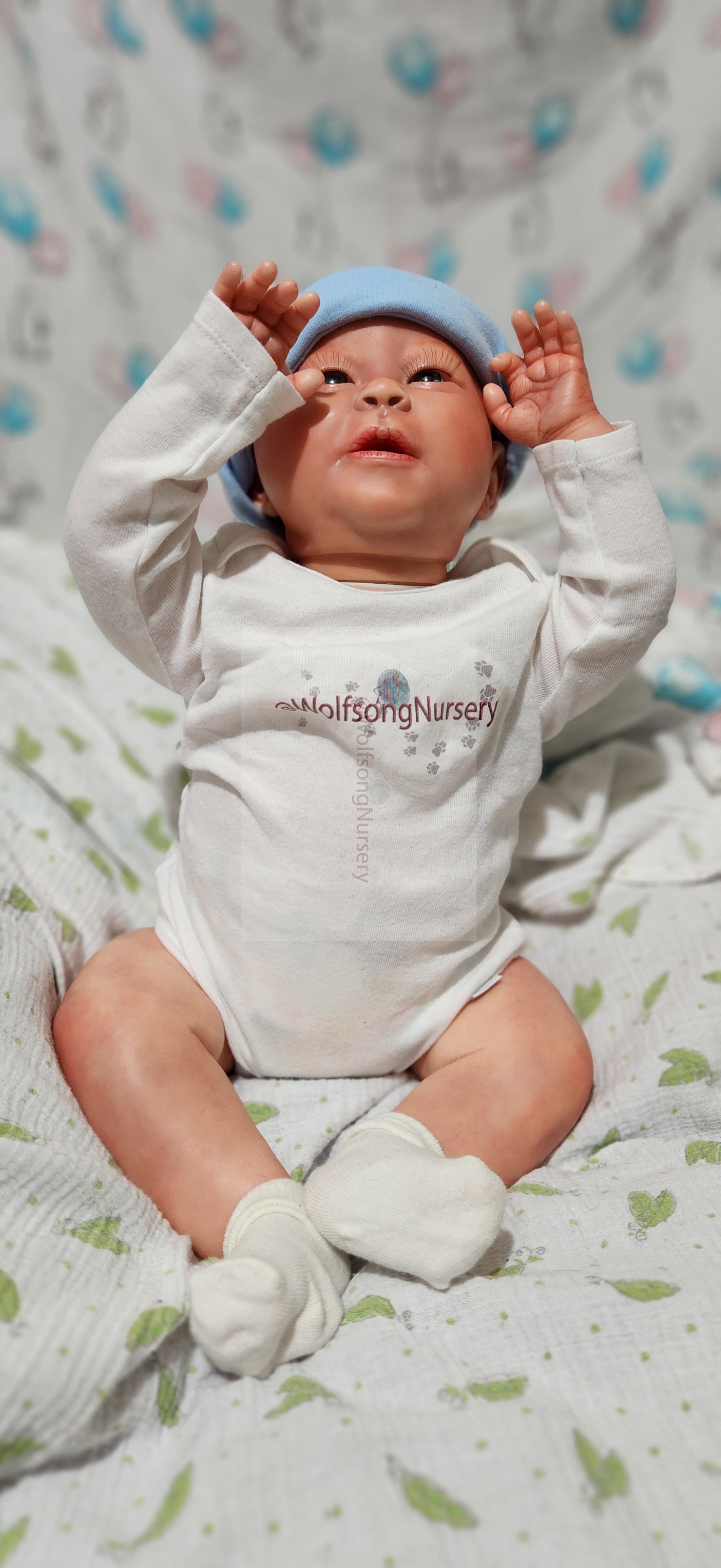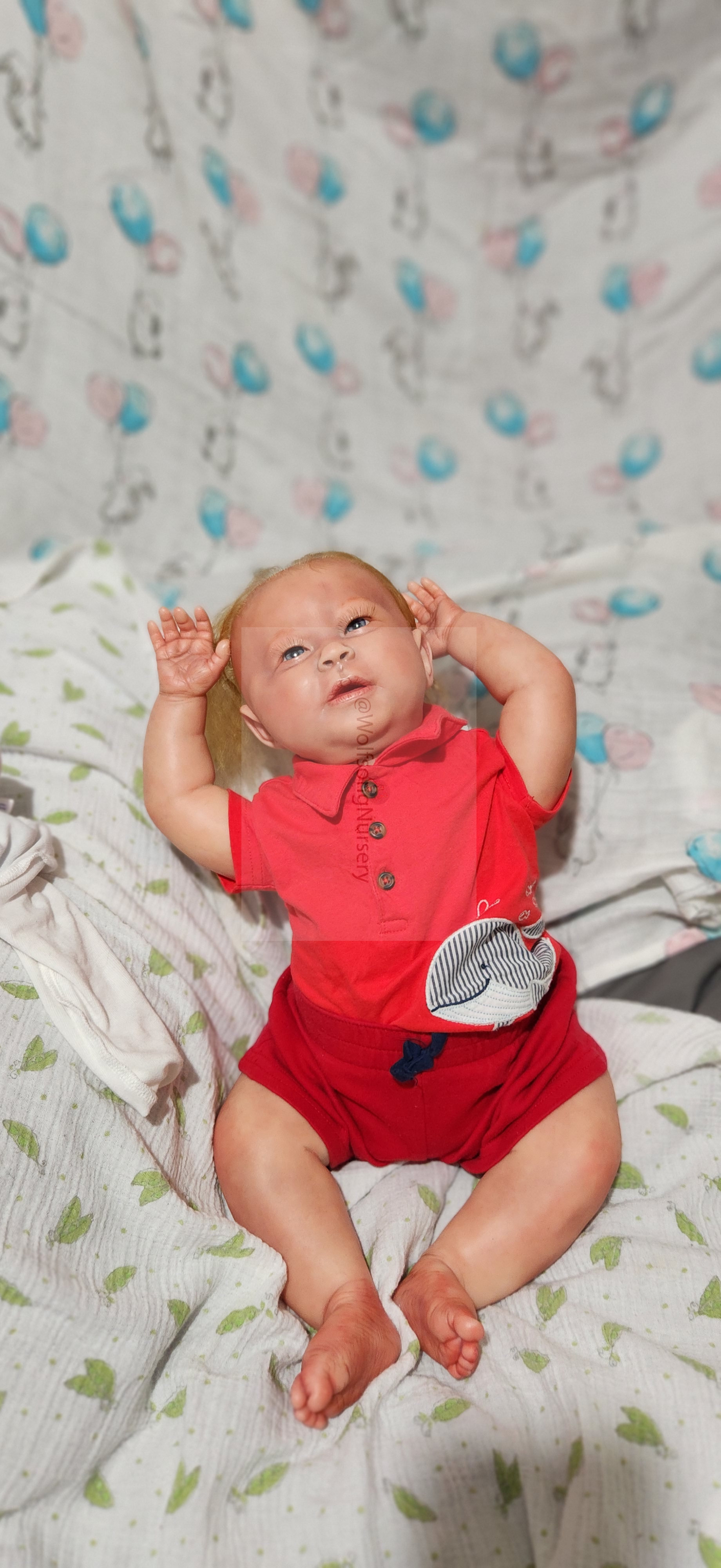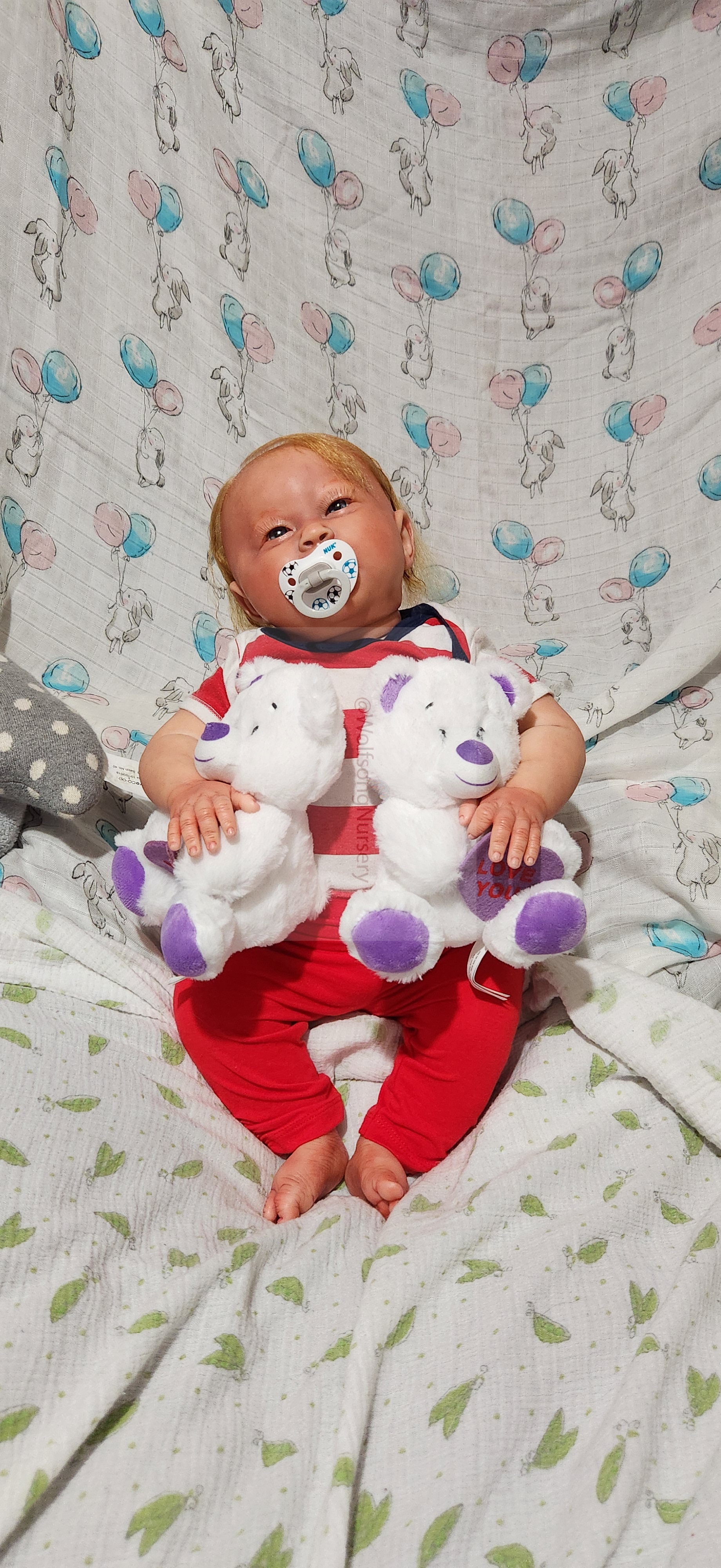 Samson Mark Miller was “born” March 25, 2023 at 4:20 Pm and he weighs 10 pounds 7 ounces at 23 inches long. He started with a Bountiful Baby Playfull Sage kit and was customized by Marta Towne of Wolfsong Nursery using Genesis Heat Set Paints, Pan Pastel and Coastal Scents Powders and using silicone pads in his tummy and bottom along with #3 glass beads, Poly pellets, 2 types of PolyFill (Super Soft and Regular) and he, like all my babies, takes one of my hearts with him to his Mommy, Denise Miller.