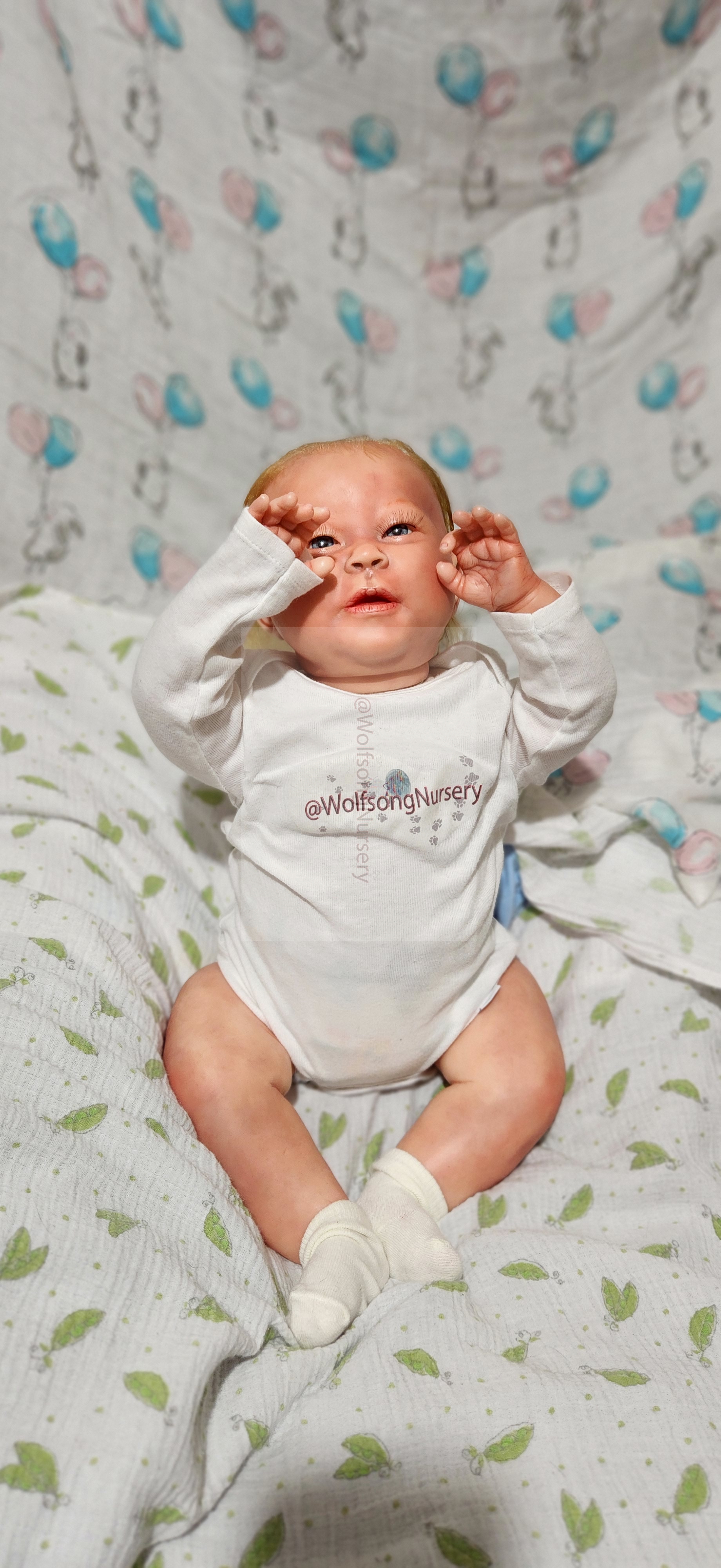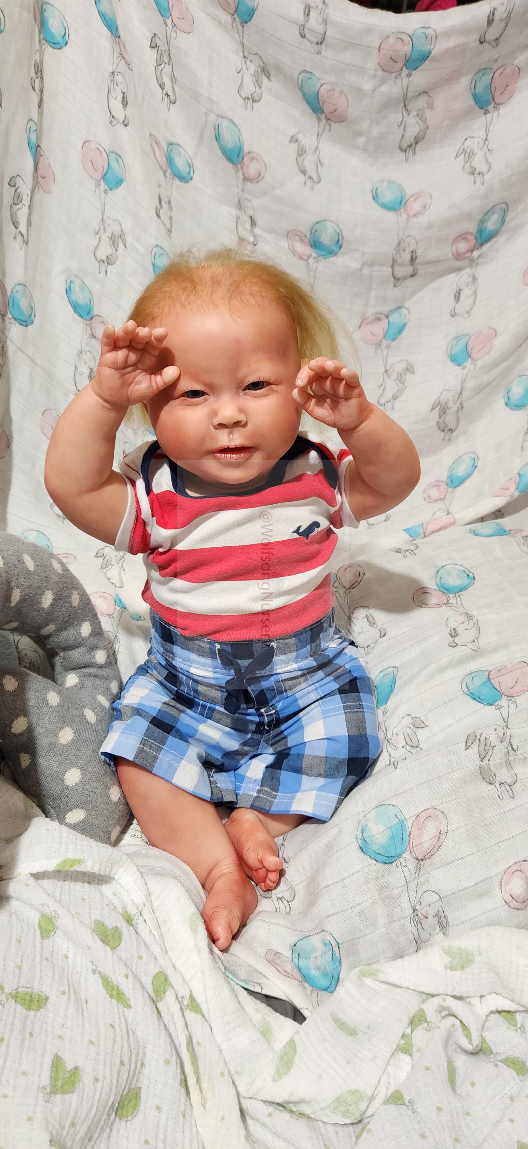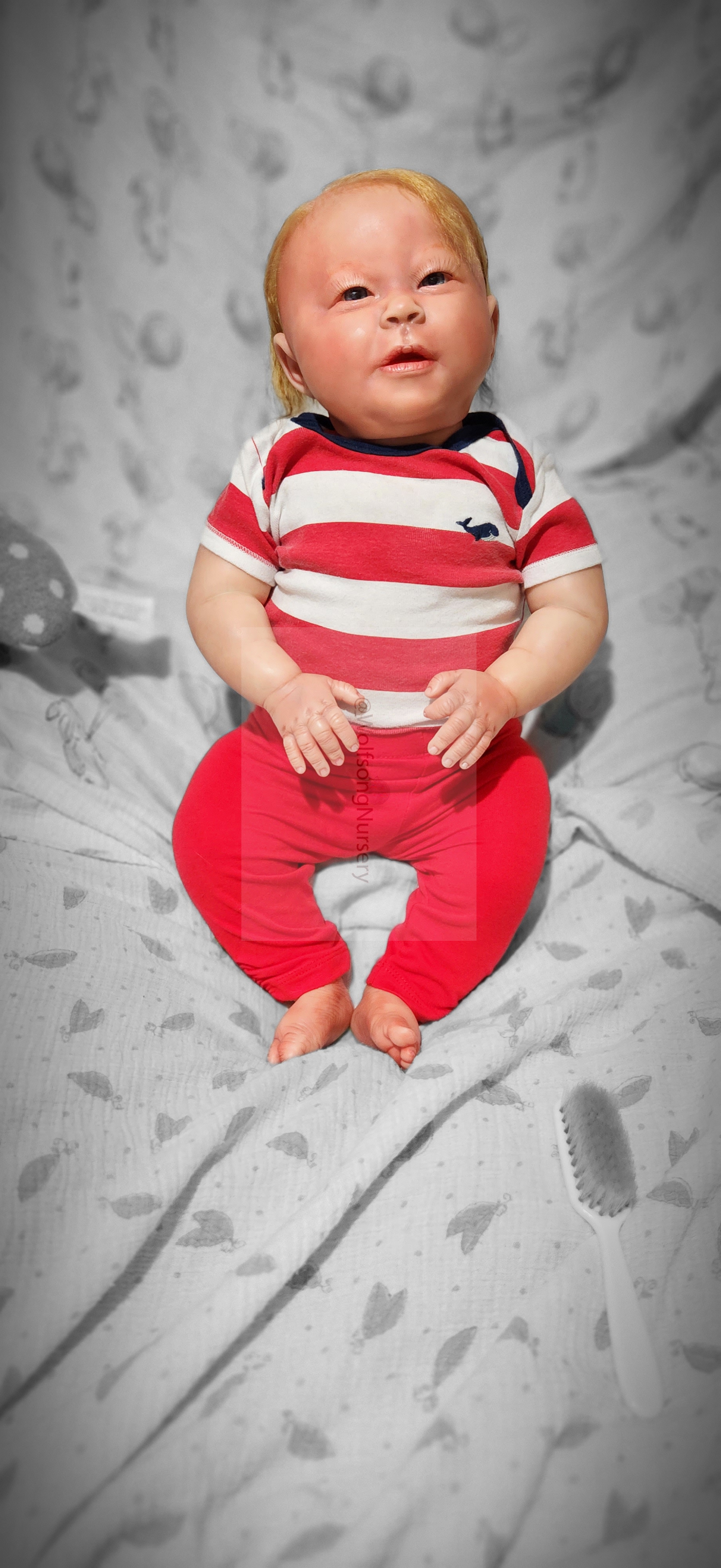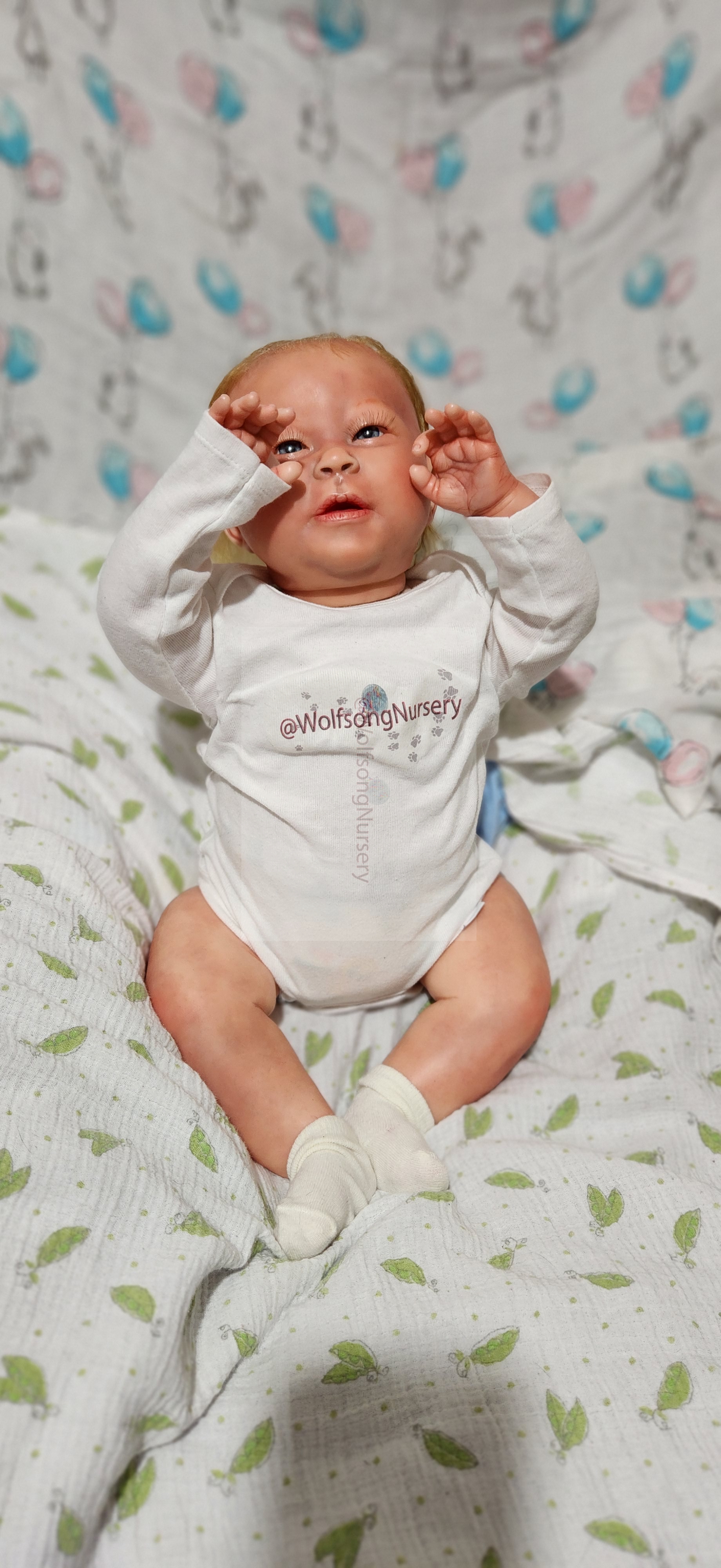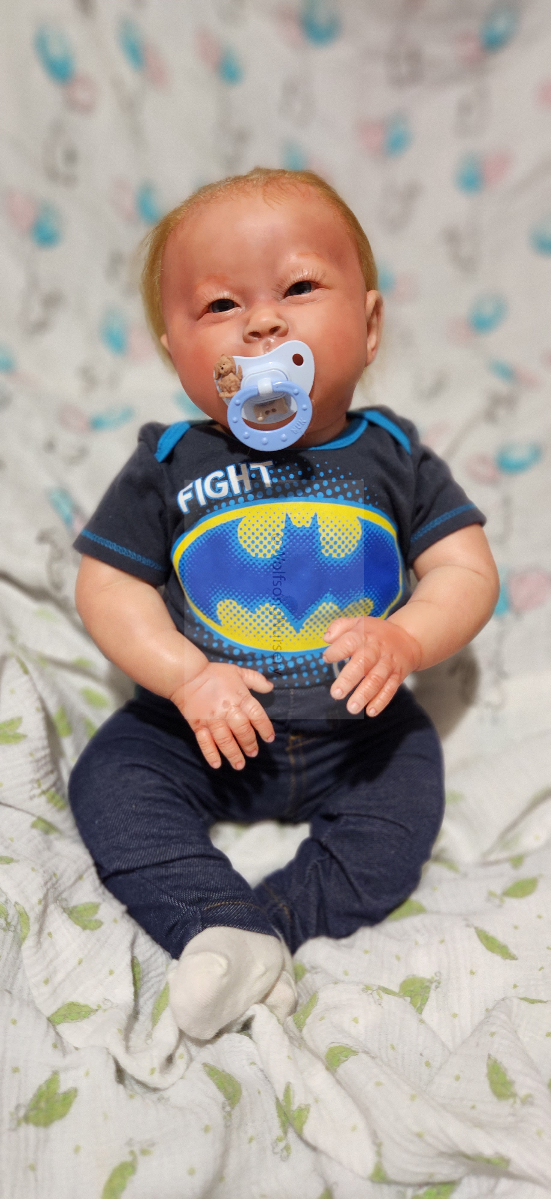 Samson Mark Miller was “born” March 25, 2023 at 4:20 Pm and he weighs 10 pounds 7 ounces at 23 inches long. He started with a Bountiful Baby Playfull Sage kit and was customized by Marta Towne of Wolfsong Nursery using Genesis Heat Set Paints, Pan Pastel and Coastal Scents Powders and using silicone pads in his tummy and bottom along with #3 glass beads, Poly pellets, 2 types of PolyFill (Super Soft and Regular) and he, like all my babies, takes one of my hearts with him to his Mommy, Denise Miller.