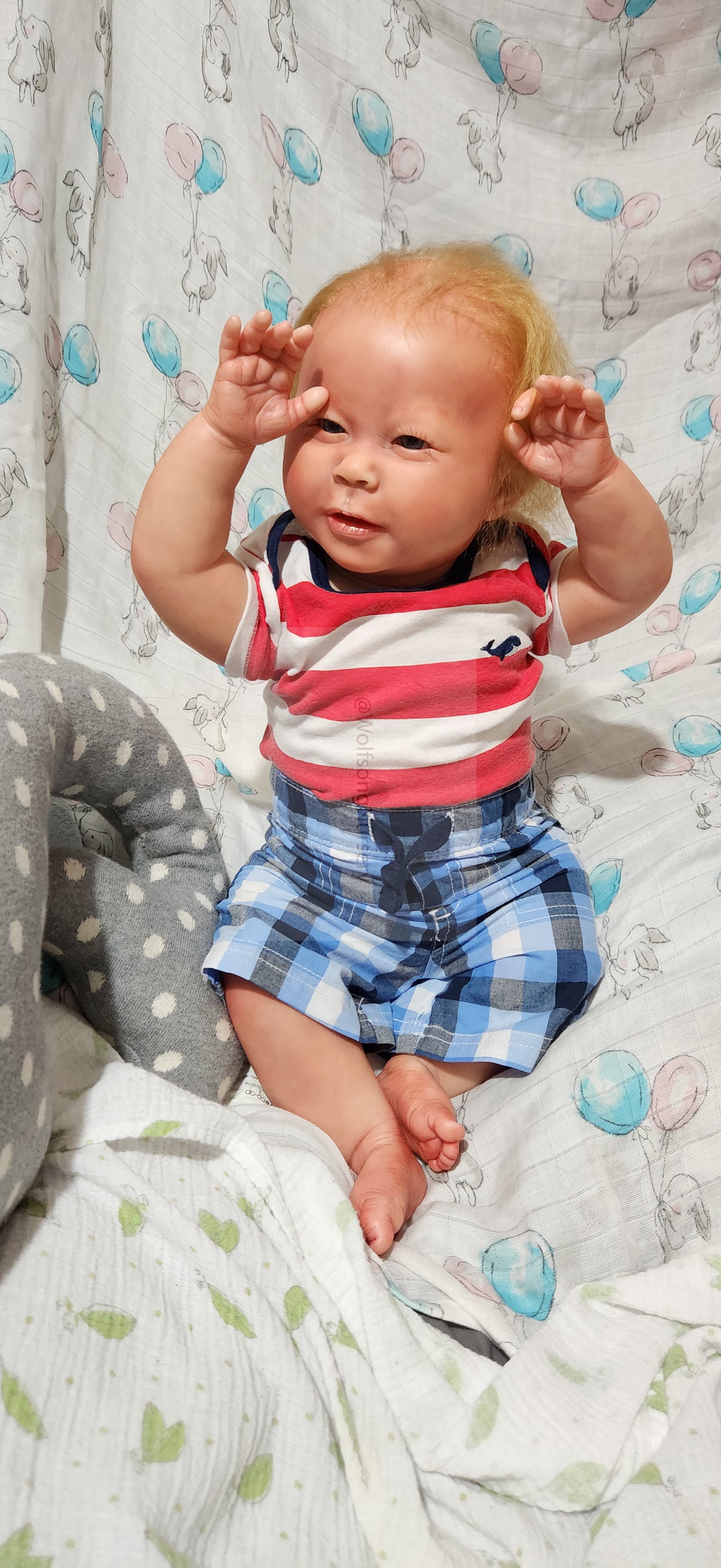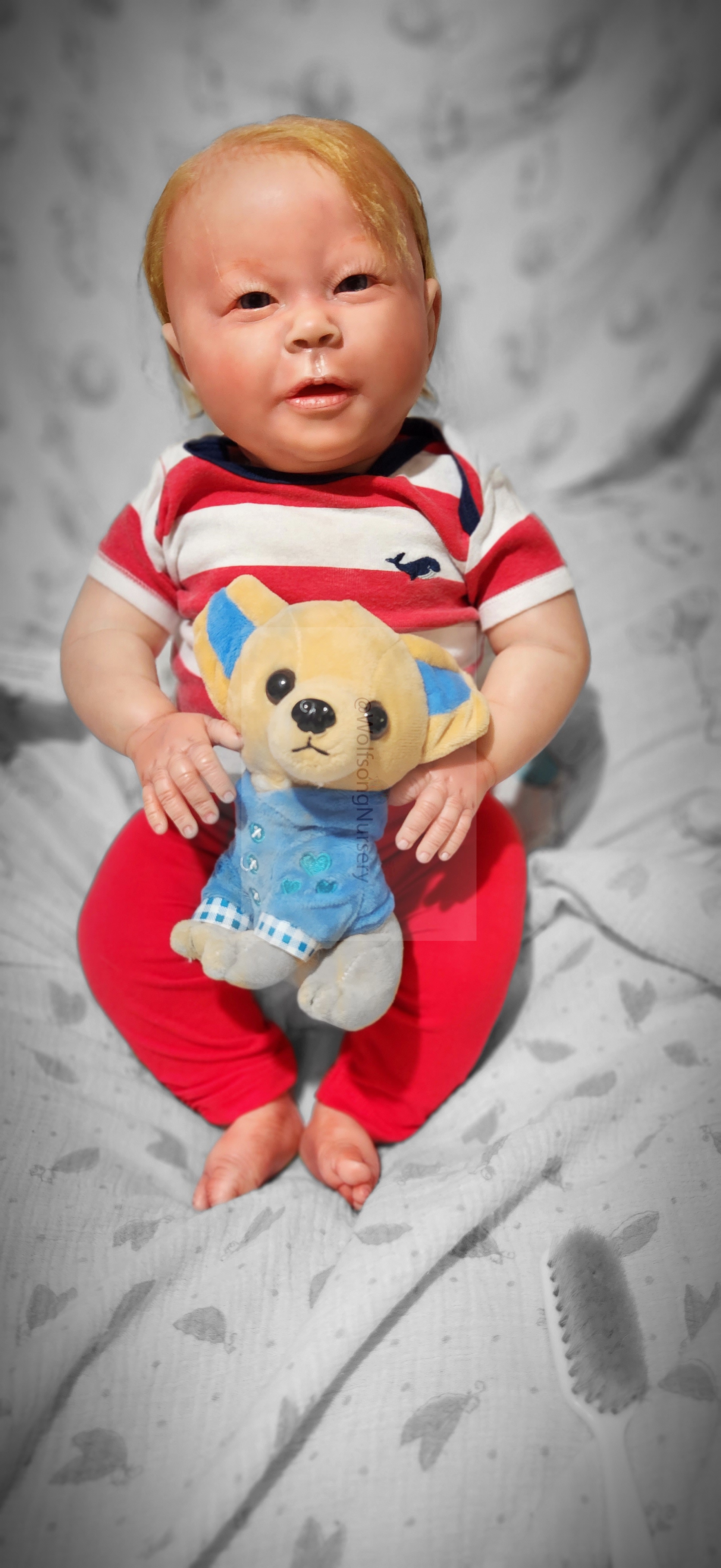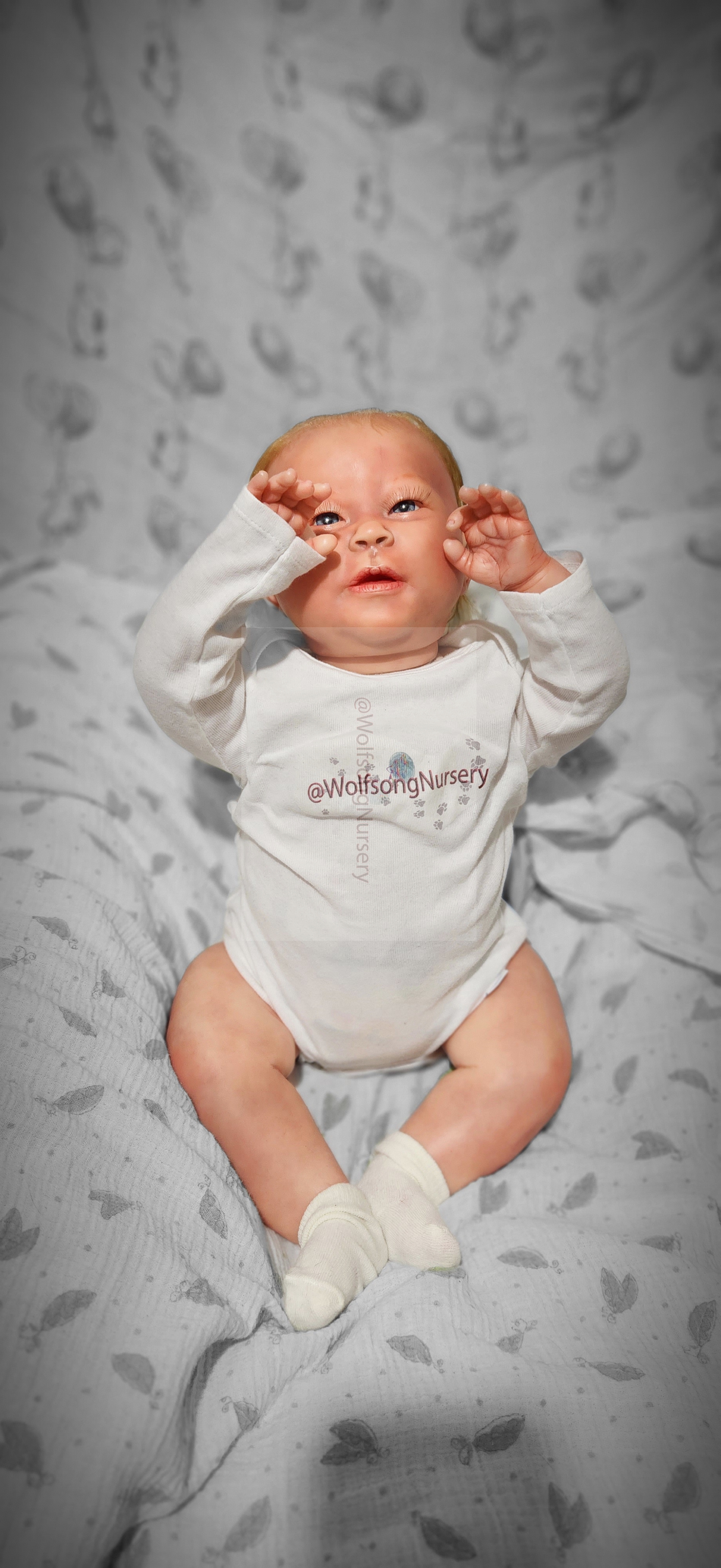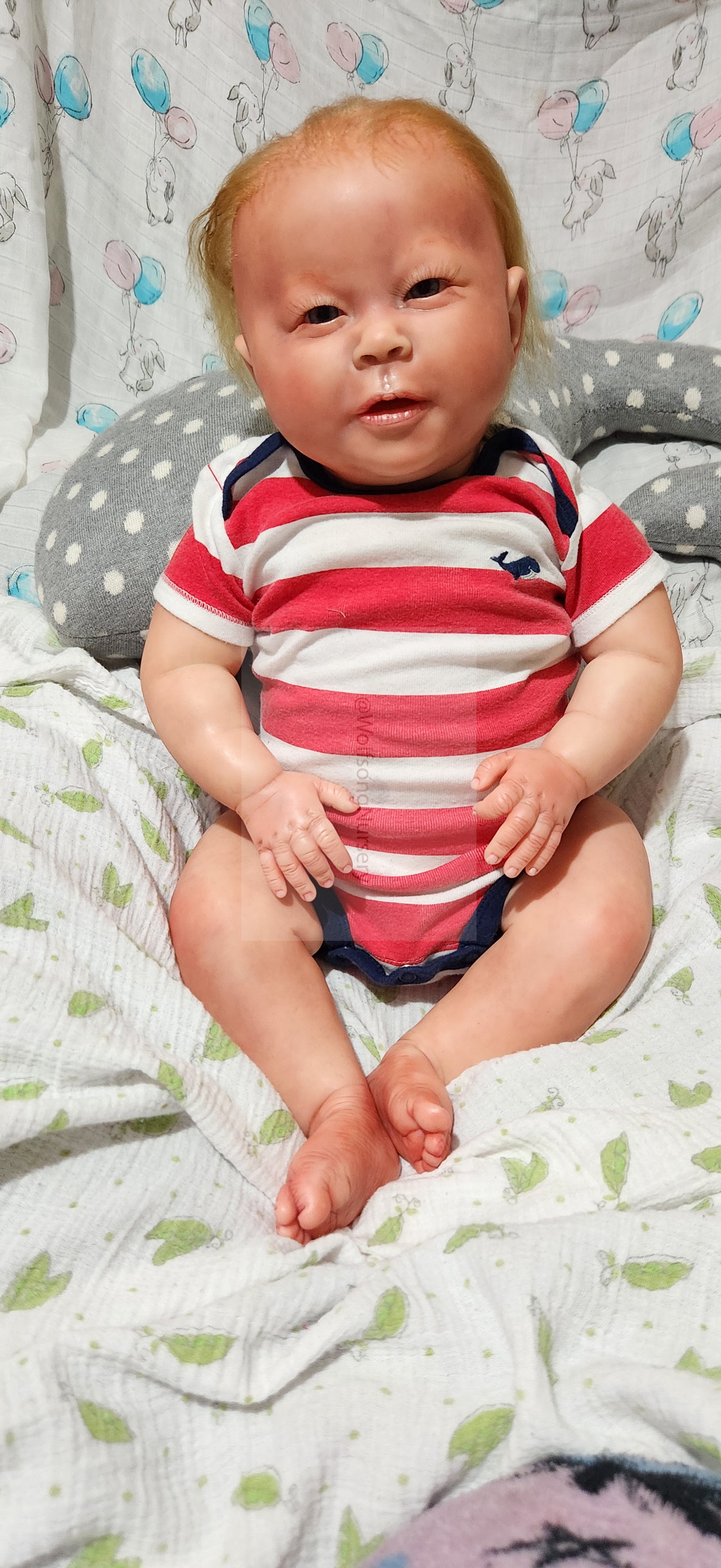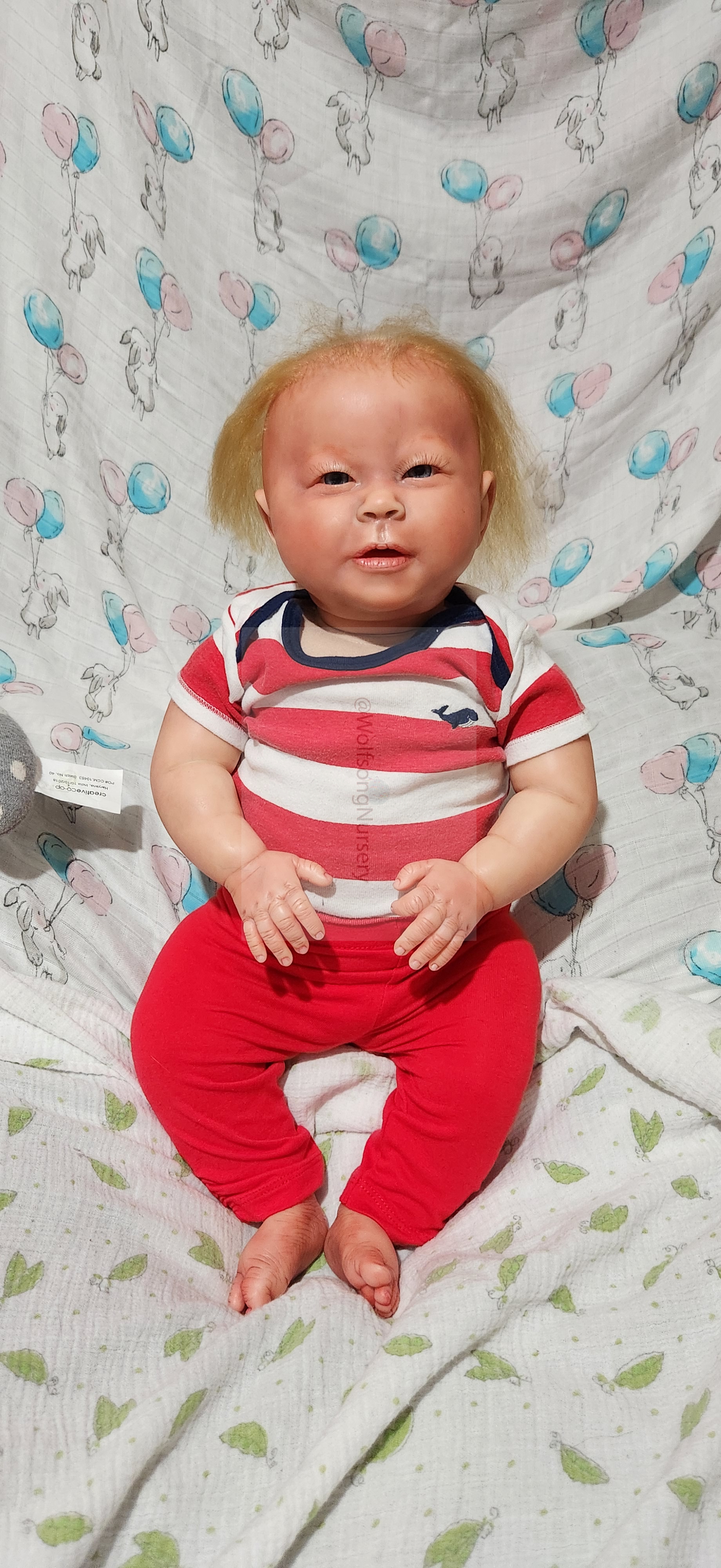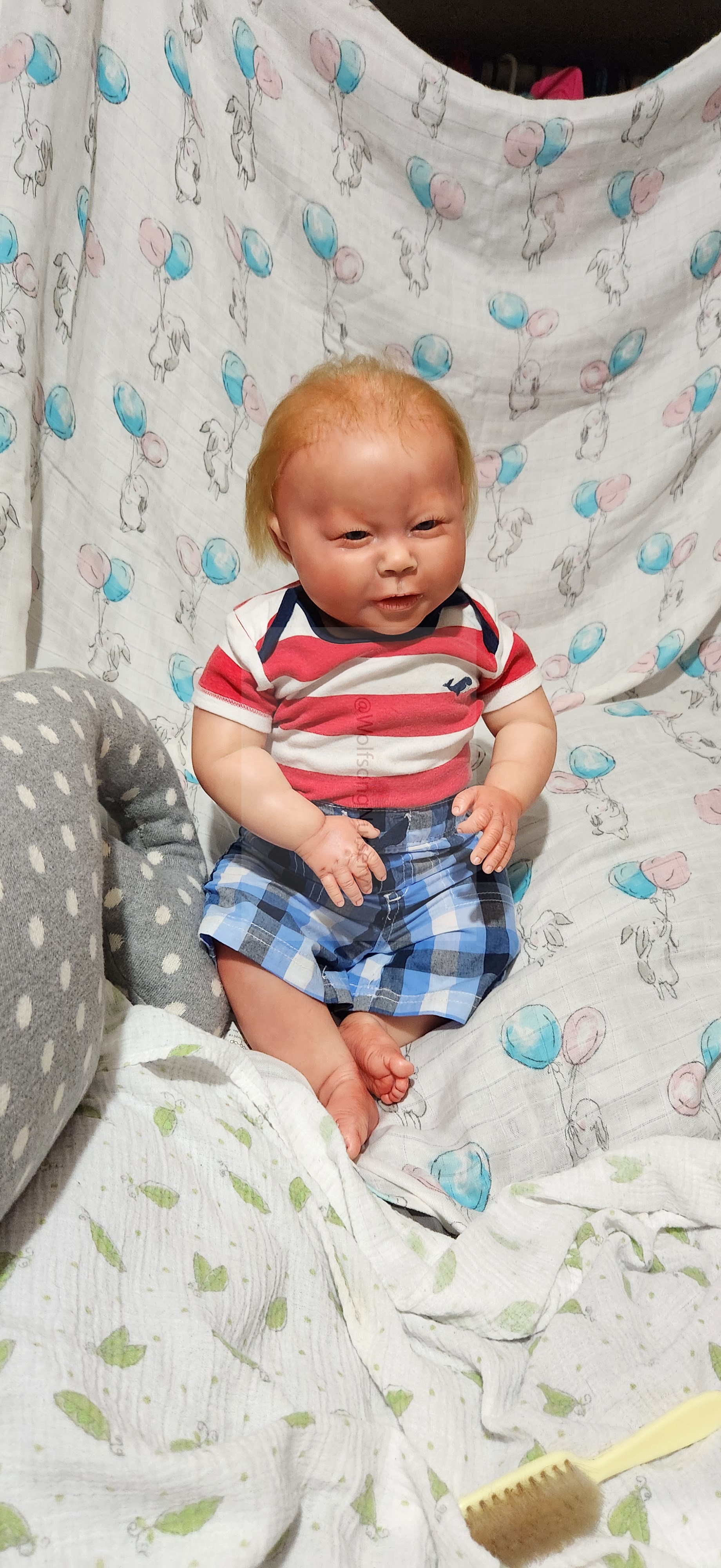 Samson Mark Miller was “born” March 25, 2023 at 4:20 Pm and he weighs 10 pounds 7 ounces at 23 inches long. He started with a Bountiful Baby Playfull Sage kit and was customized by Marta Towne of Wolfsong Nursery using Genesis Heat Set Paints, Pan Pastel and Coastal Scents Powders and using silicone pads in his tummy and bottom along with #3 glass beads, Poly pellets, 2 types of PolyFill (Super Soft and Regular) and he, like all my babies, takes one of my hearts with him to his Mommy, Denise Miller.