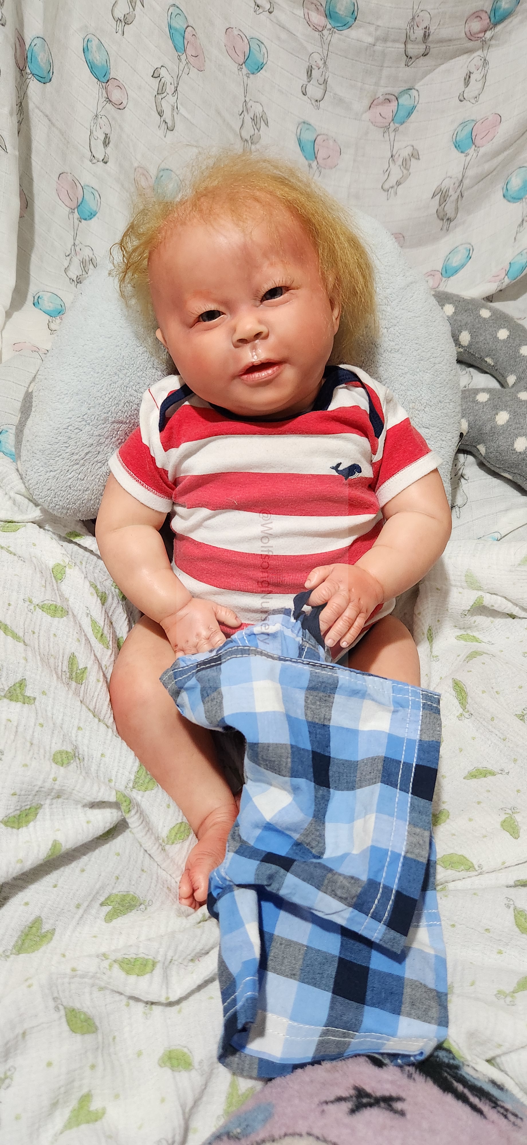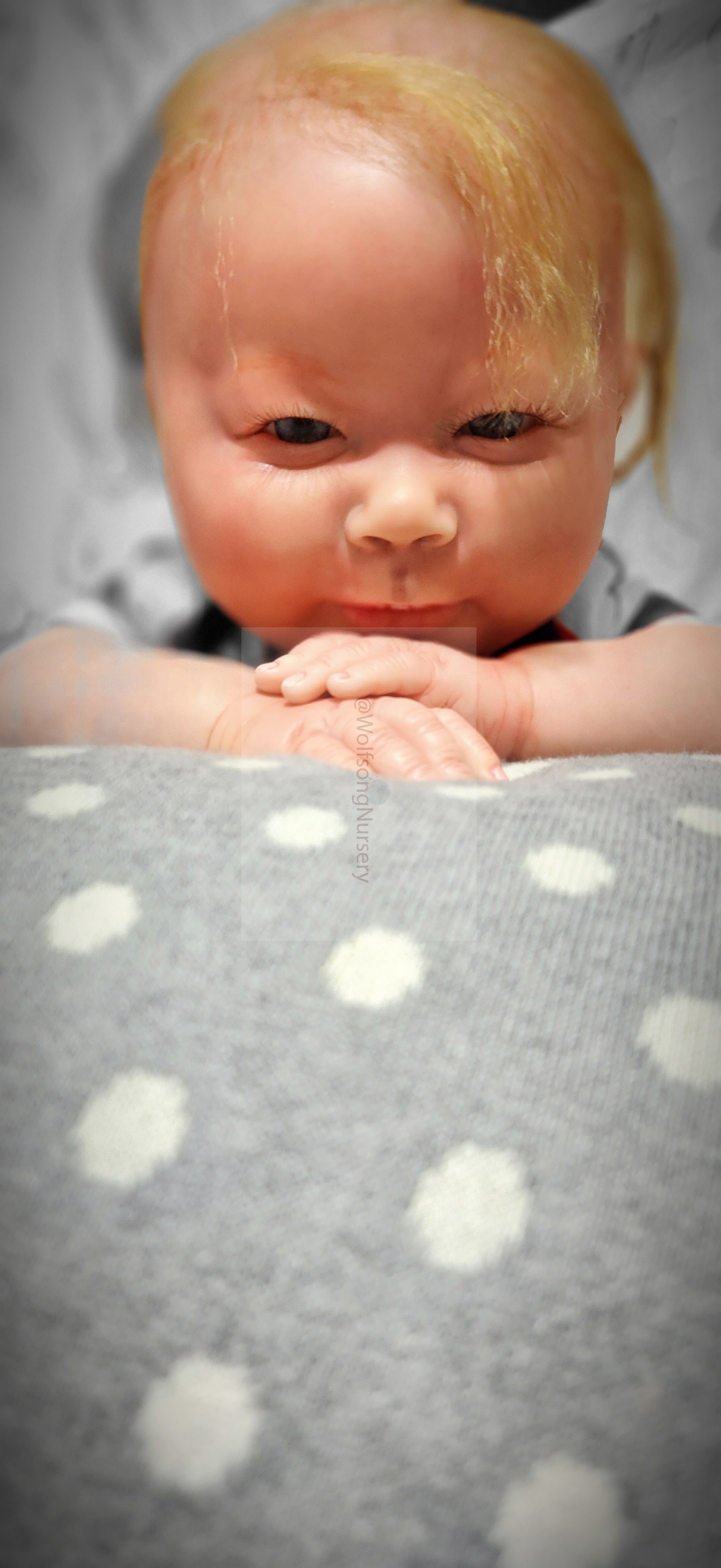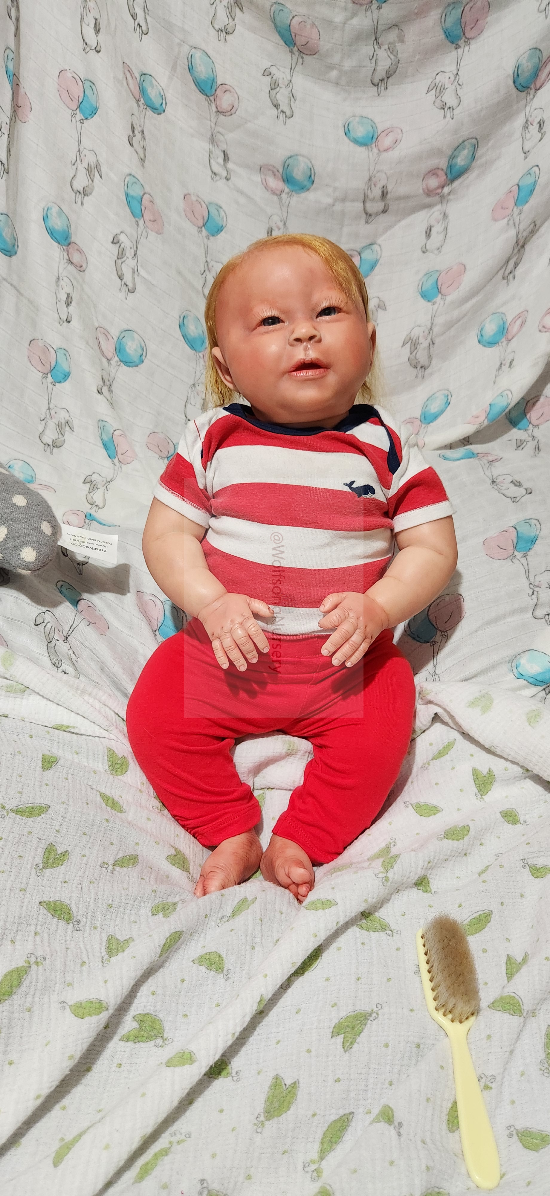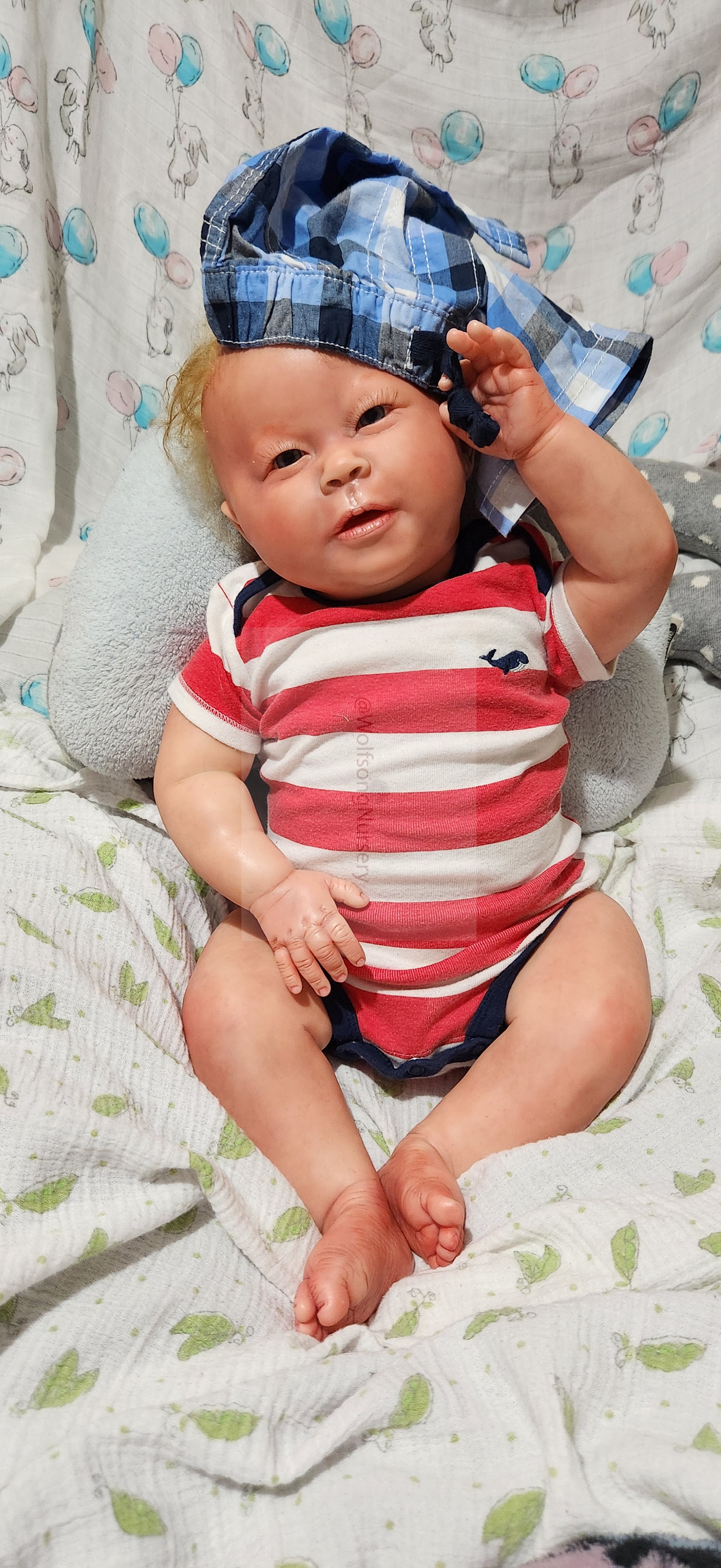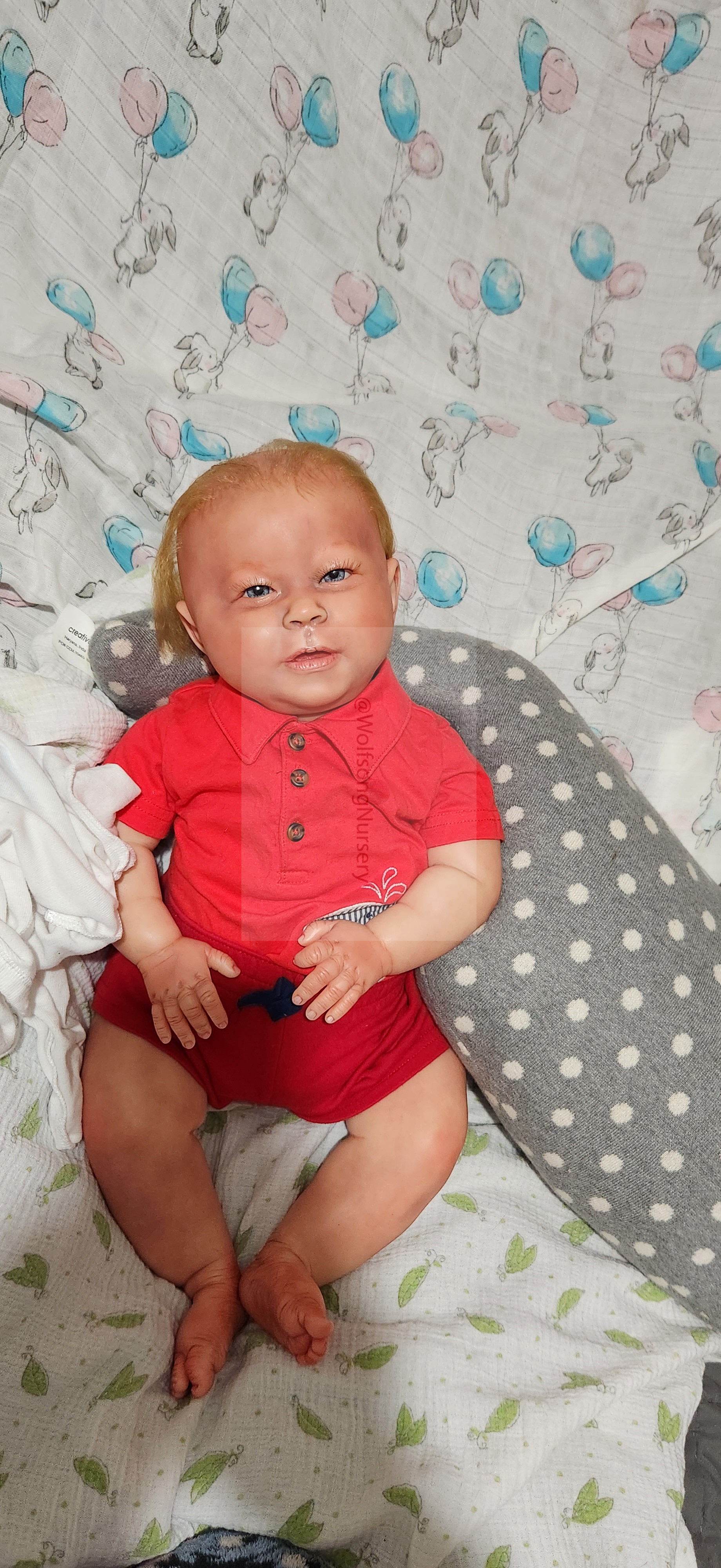 Samson Mark Miller was “born” March 25, 2023 at 4:20 Pm and he weighs 10 pounds 7 ounces at 23 inches long. He started with a Bountiful Baby Playfull Sage kit and was customized by Marta Towne of Wolfsong Nursery using Genesis Heat Set Paints, Pan Pastel and Coastal Scents Powders and using silicone pads in his tummy and bottom along with #3 glass beads, Poly pellets, 2 types of PolyFill (Super Soft and Regular) and he, like all my babies, takes one of my hearts with him to his Mommy, Denise Miller.
