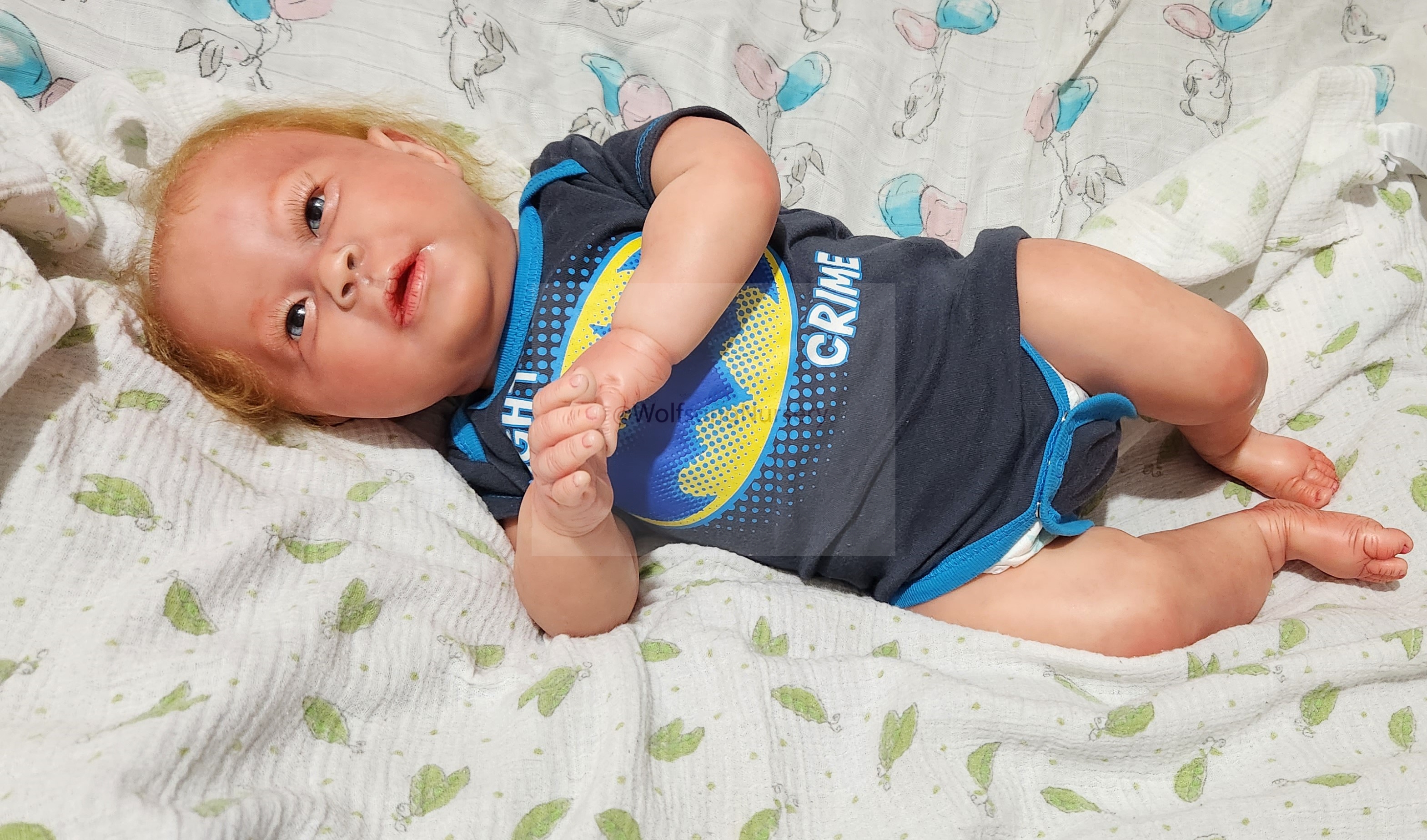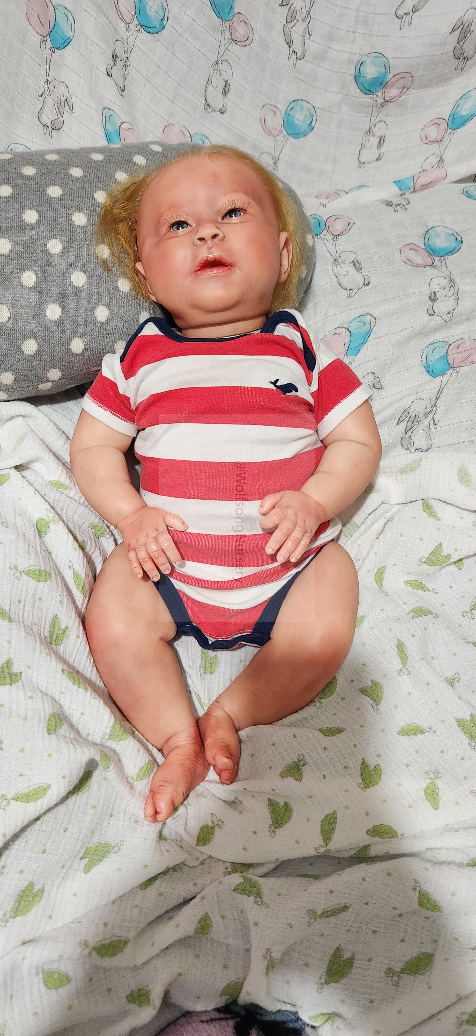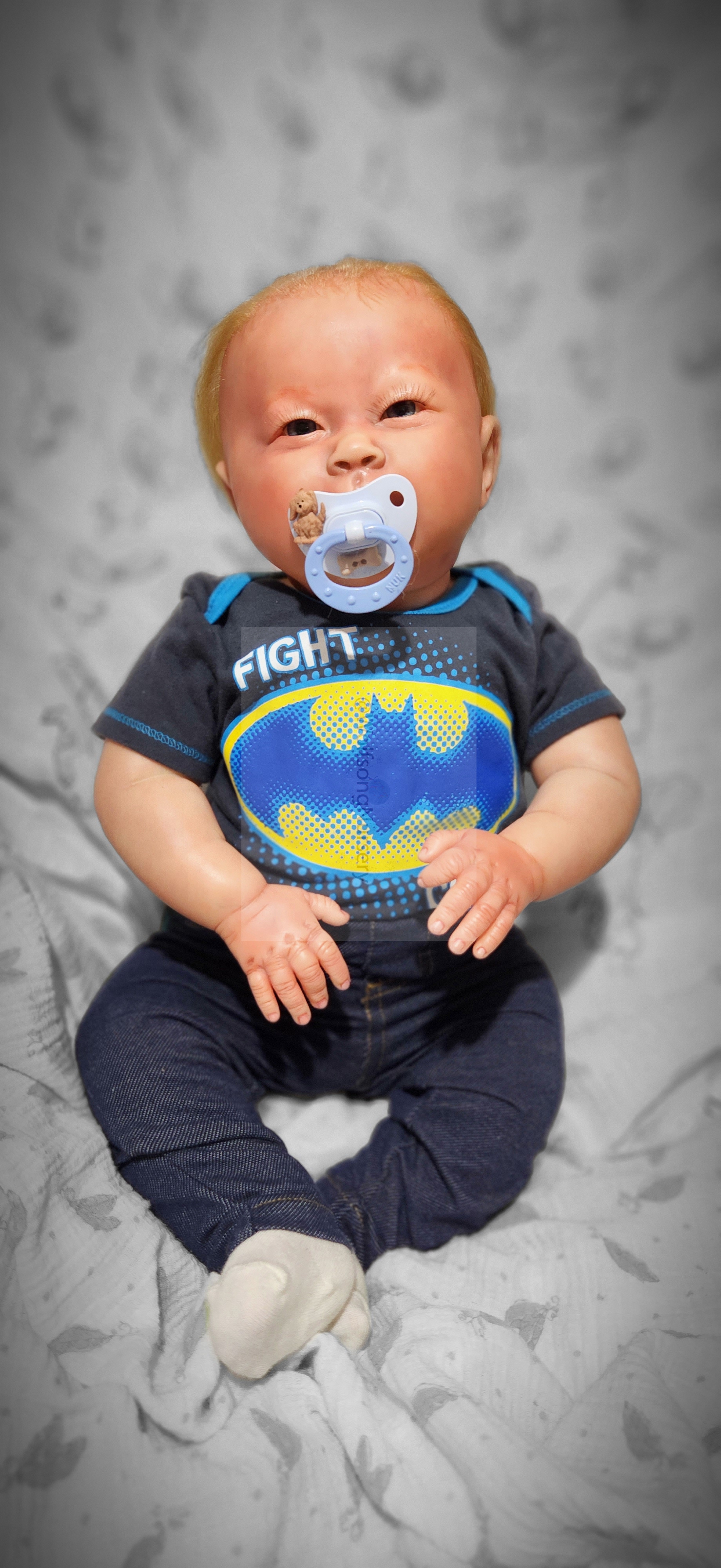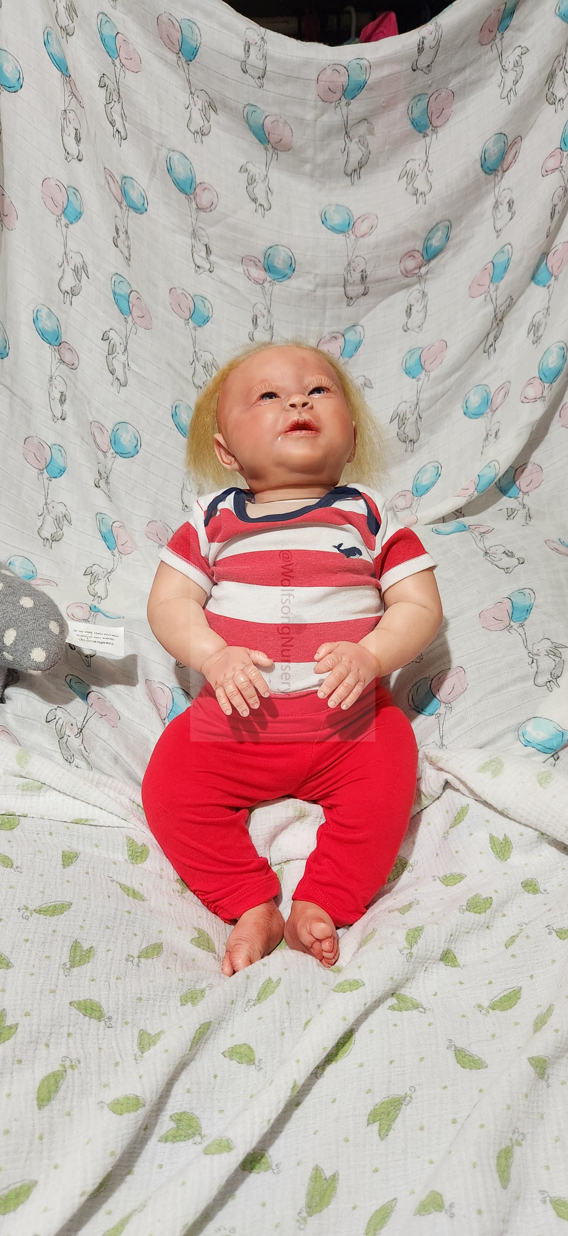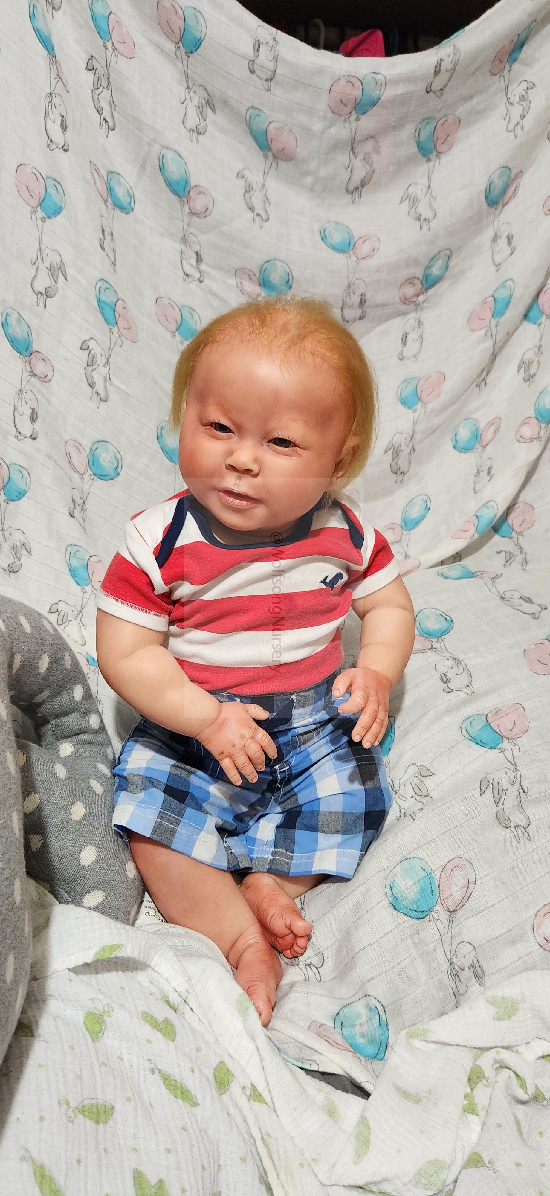 Samson Mark Miller was “born” March 25, 2023 at 4:20 Pm and he weighs 10 pounds 7 ounces at 23 inches long. He started with a Bountiful Baby Playfull Sage kit and was customized by Marta Towne of Wolfsong Nursery using Genesis Heat Set Paints, Pan Pastel and Coastal Scents Powders and using silicone pads in his tummy and bottom along with #3 glass beads, Poly pellets, 2 types of PolyFill (Super Soft and Regular) and he, like all my babies, takes one of my hearts with him to his Mommy, Denise Miller.