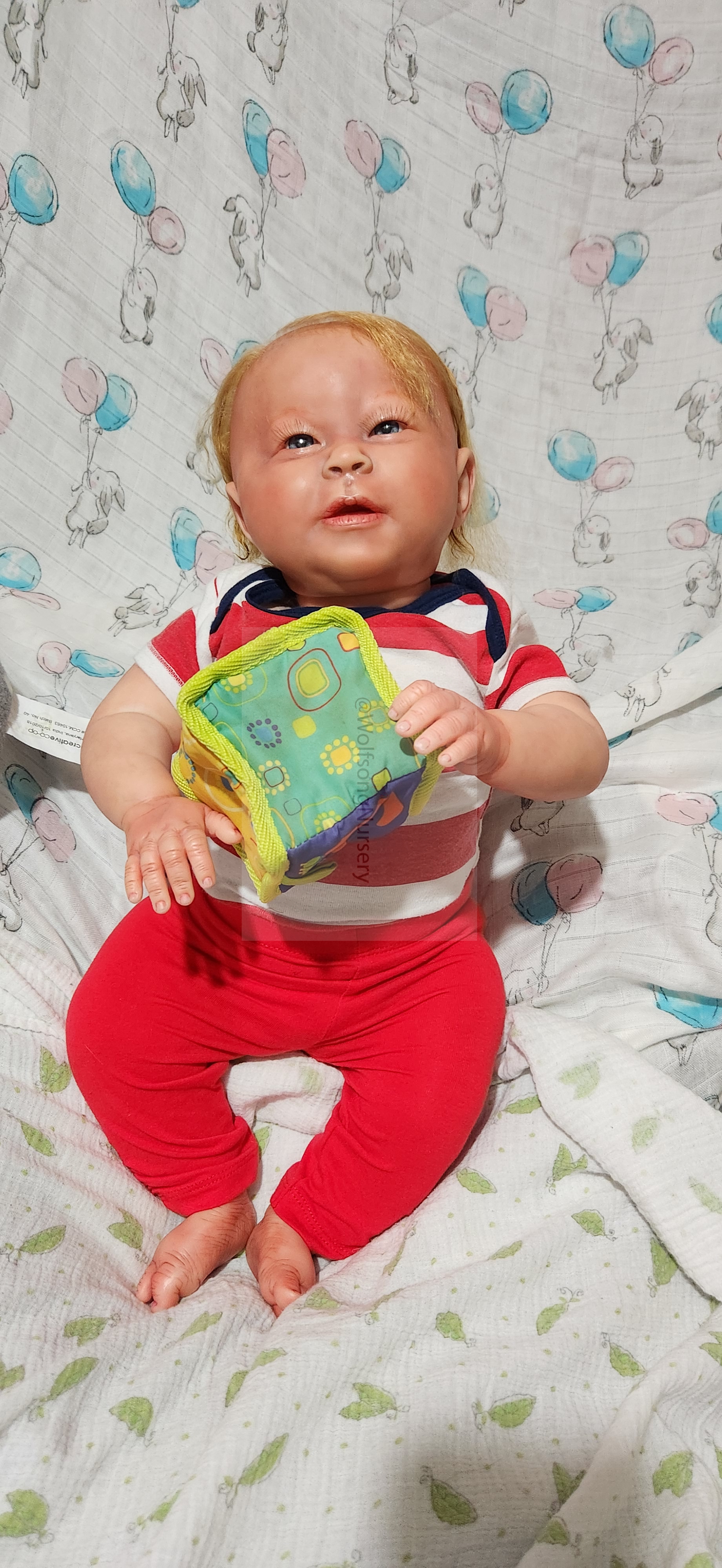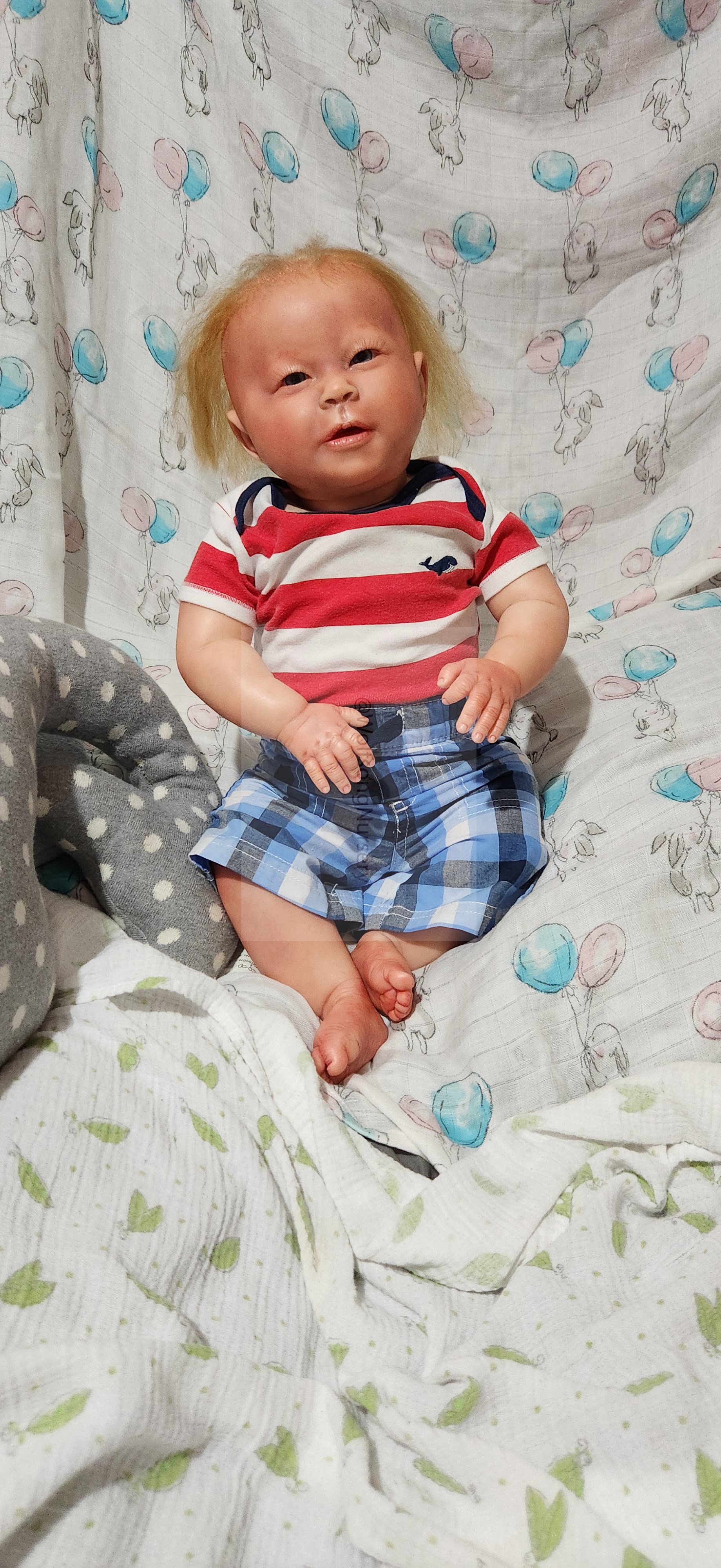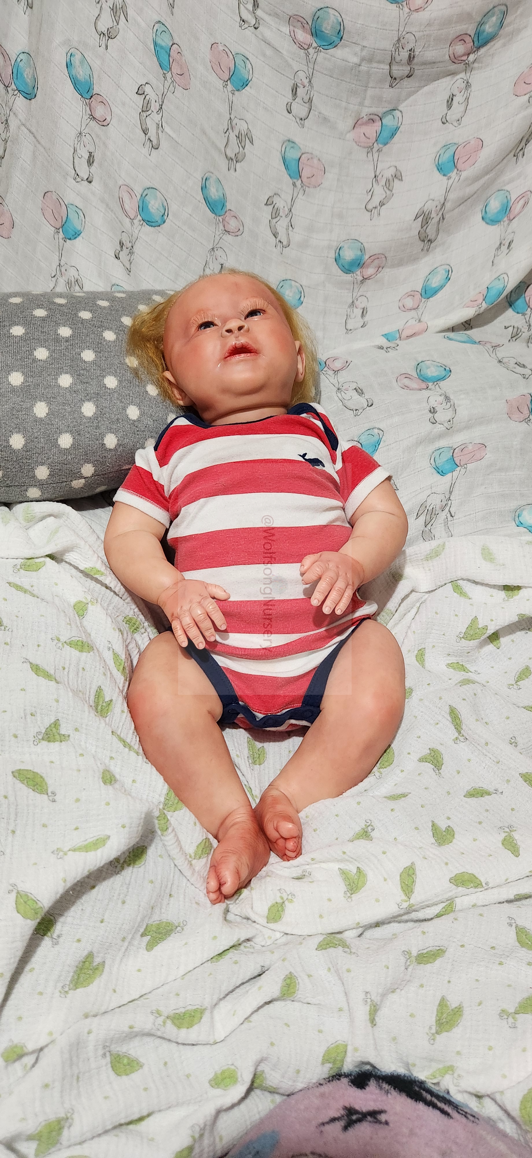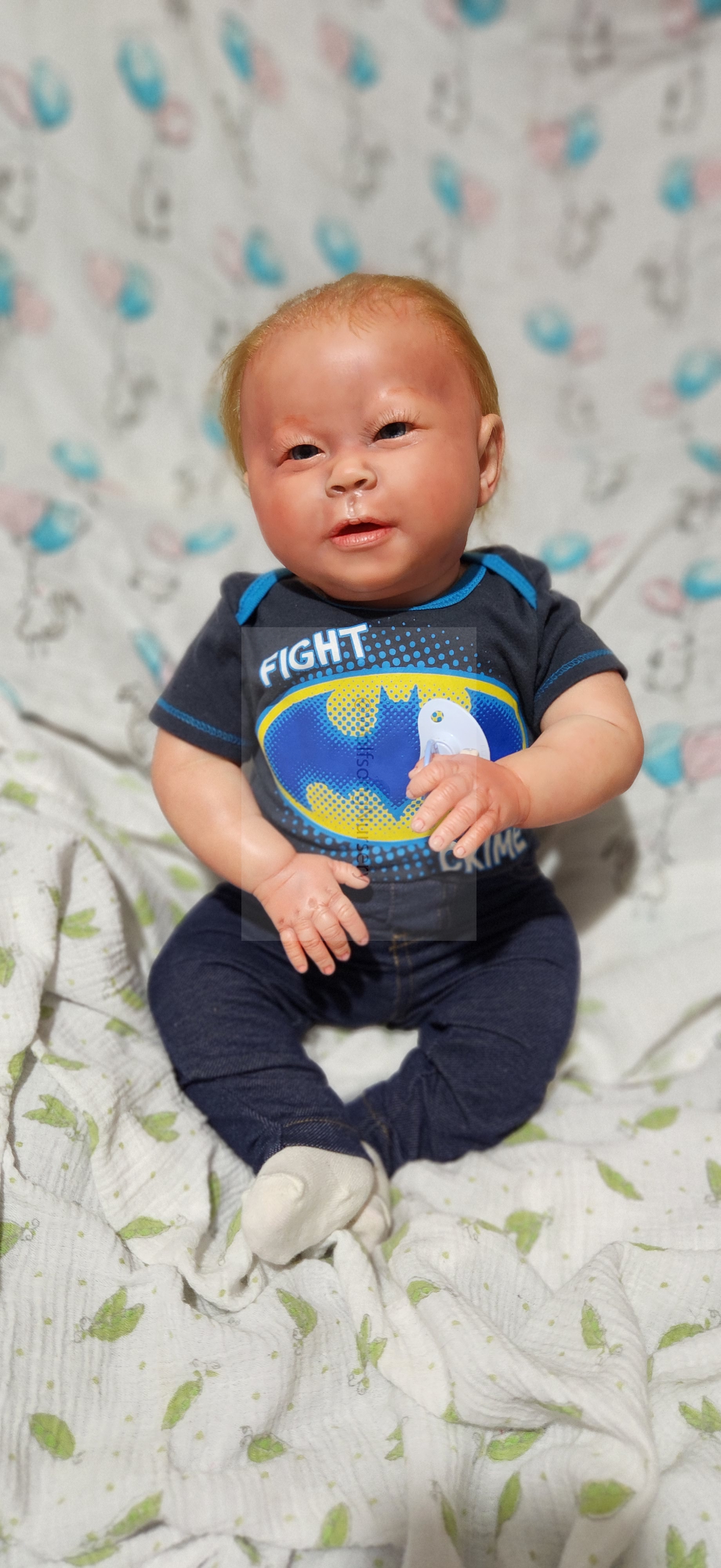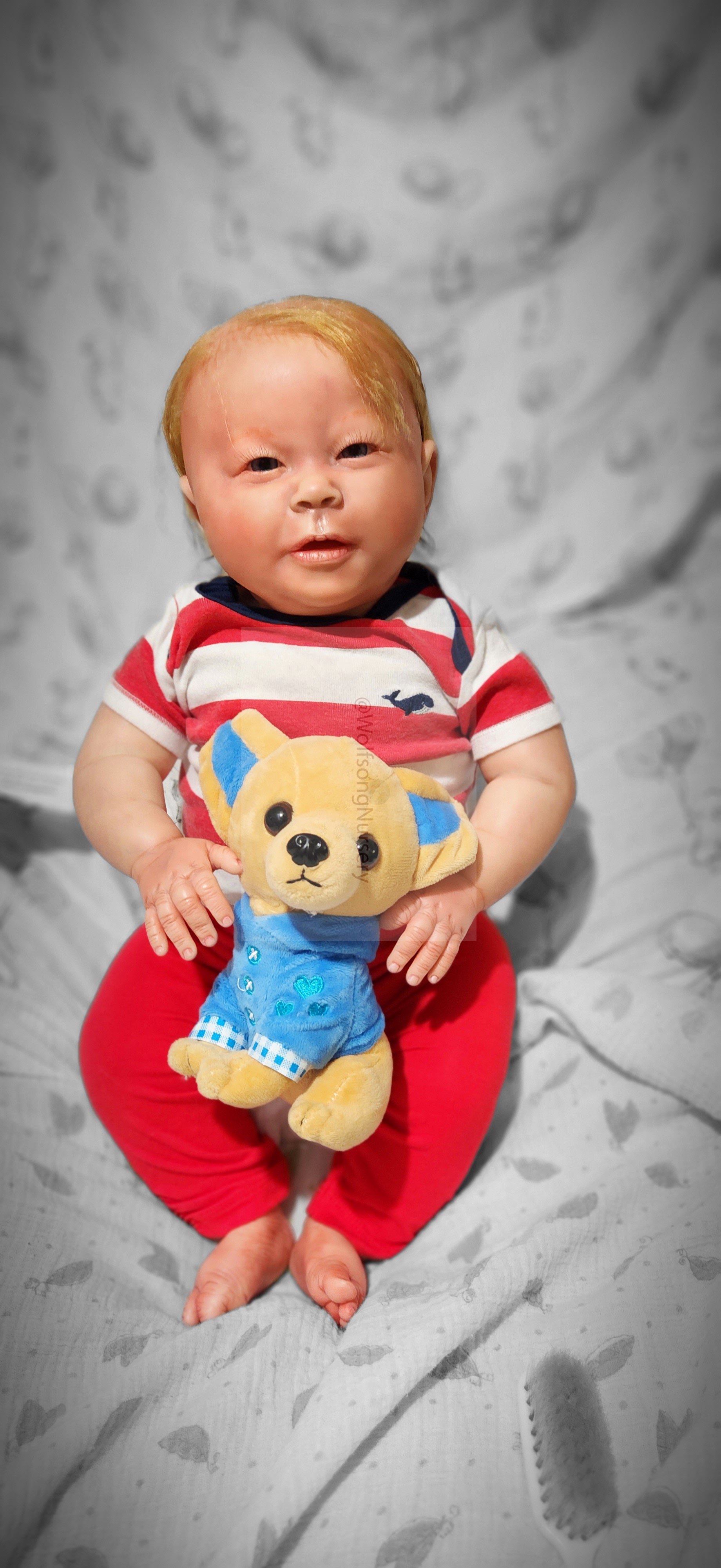 Samson Mark Miller was “born” March 25, 2023 at 4:20 Pm and he weighs 10 pounds 7 ounces at 23 inches long. He started with a Bountiful Baby Playfull Sage kit and was customized by Marta Towne of Wolfsong Nursery using Genesis Heat Set Paints, Pan Pastel and Coastal Scents Powders and using silicone pads in his tummy and bottom along with #3 glass beads, Poly pellets, 2 types of PolyFill (Super Soft and Regular) and he, like all my babies, takes one of my hearts with him to his Mommy, Denise Miller.