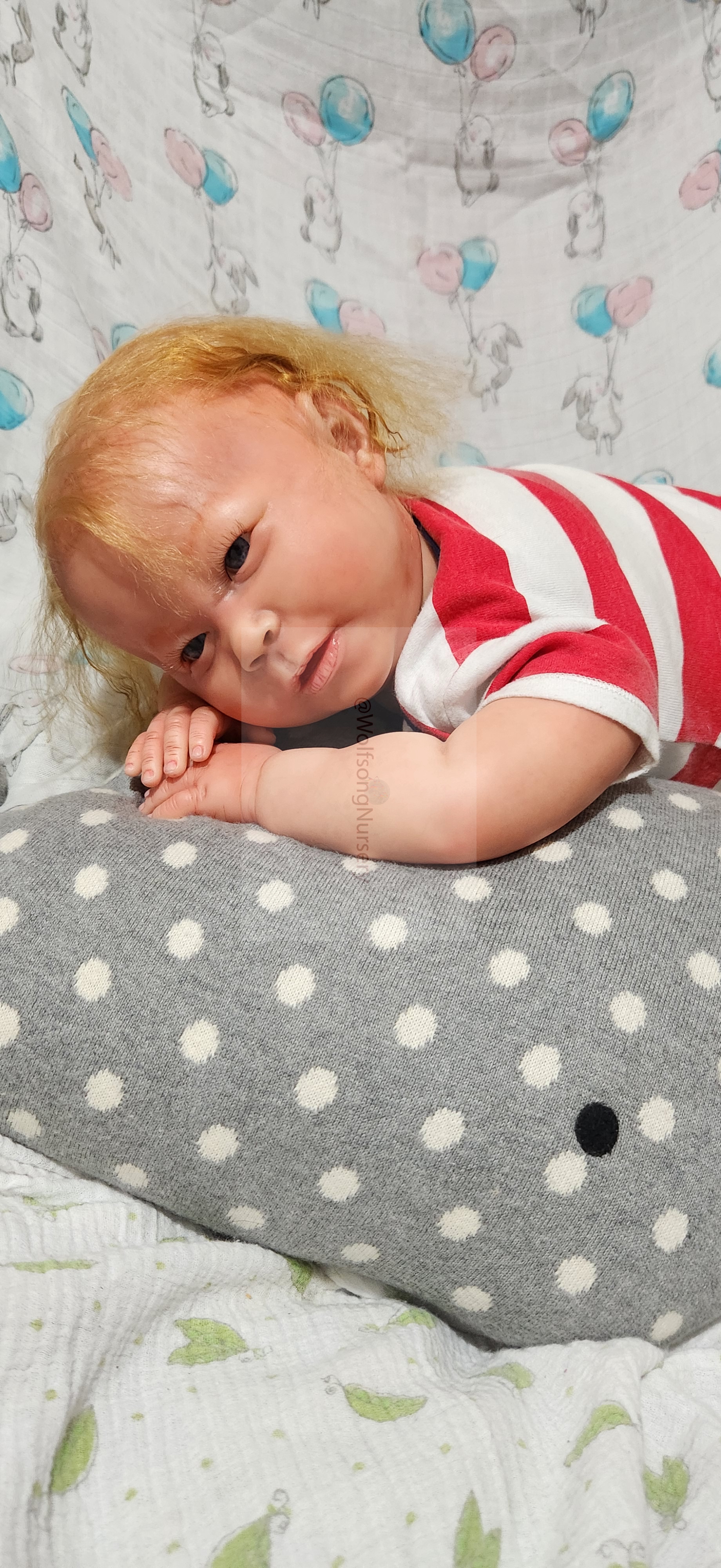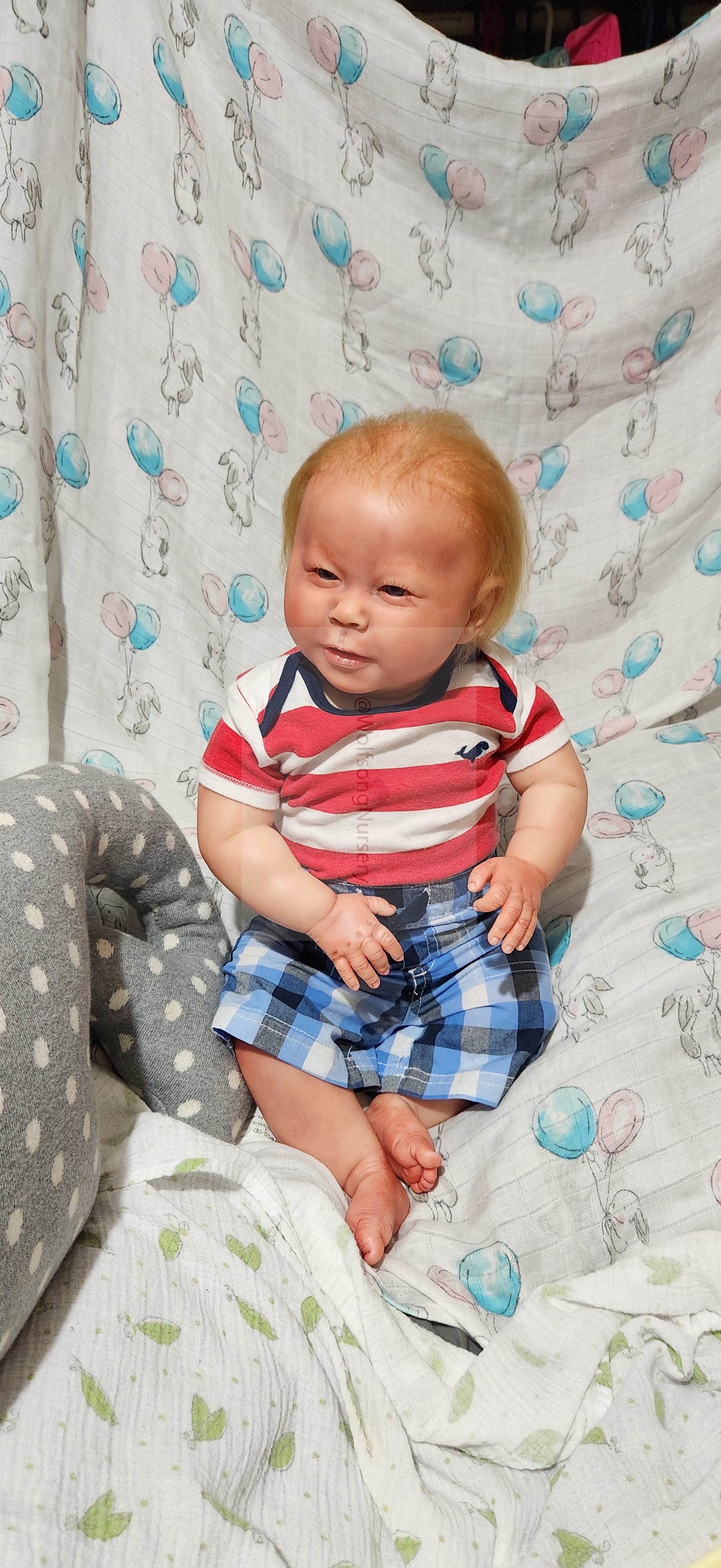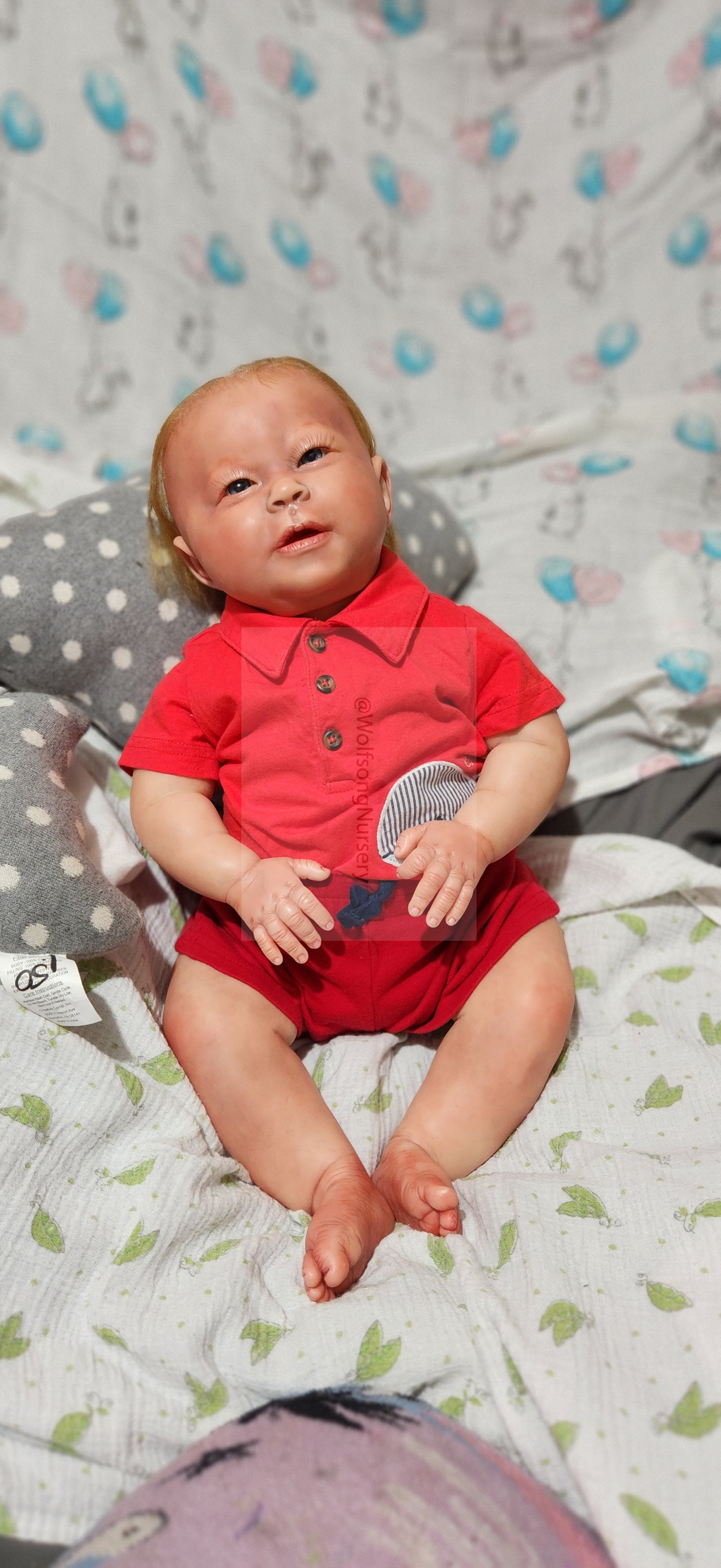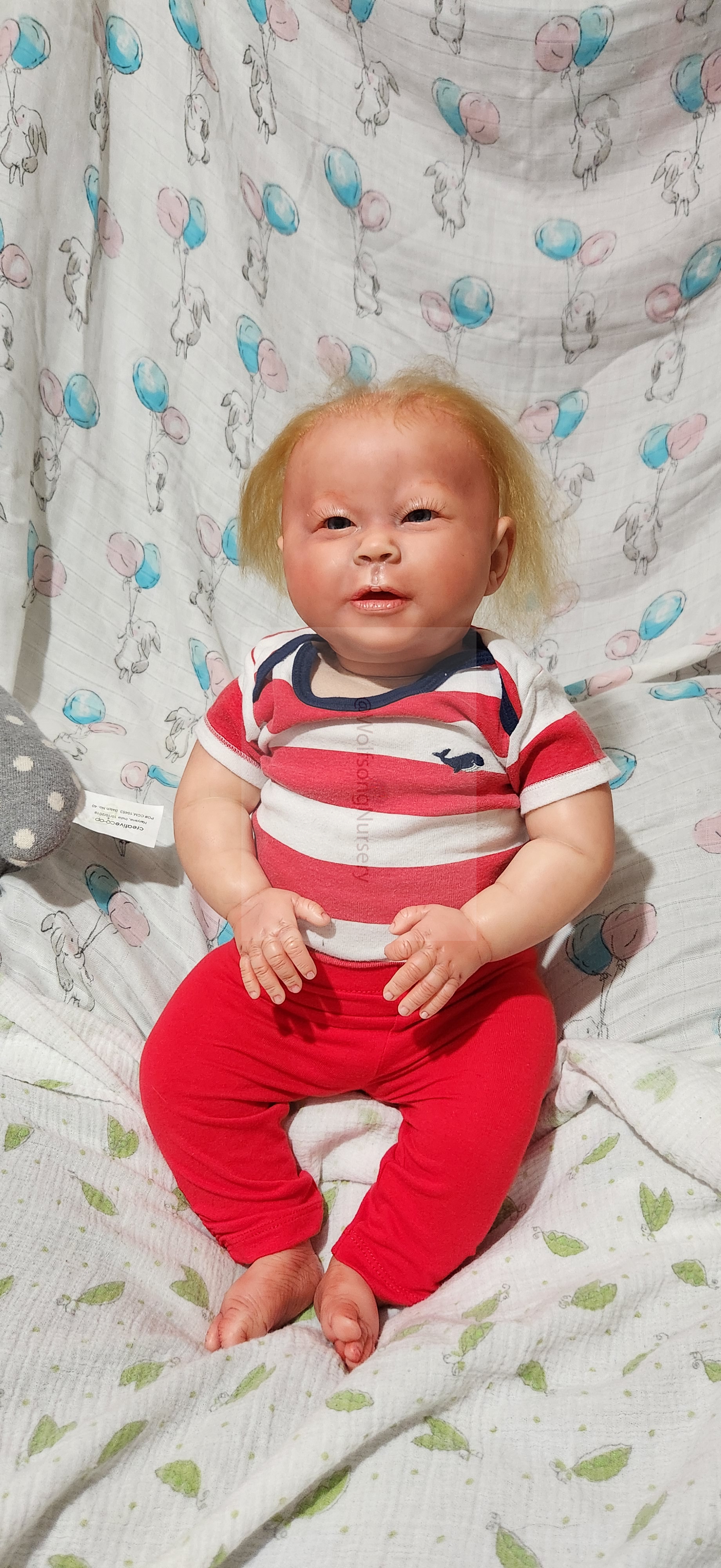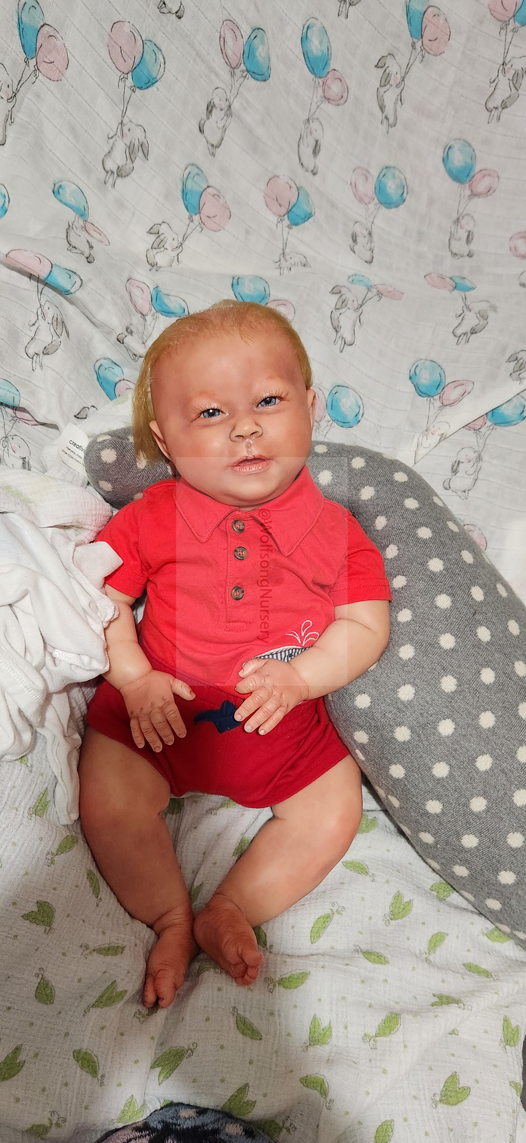Samson Mark Miller was “born” March 25, 2023 at 4:20 Pm and he weighs 10 pounds 7 ounces at 23 inches long. He started with a Bountiful Baby Playfull Sage kit and was customized by Marta Towne of Wolfsong Nursery using Genesis Heat Set Paints, Pan Pastel and Coastal Scents Powders and using silicone pads in his tummy and bottom along with #3 glass beads, Poly pellets, 2 types of PolyFill (Super Soft and Regular) and he, like all my babies, takes one of my hearts with him to his Mommy, Denise Miller.