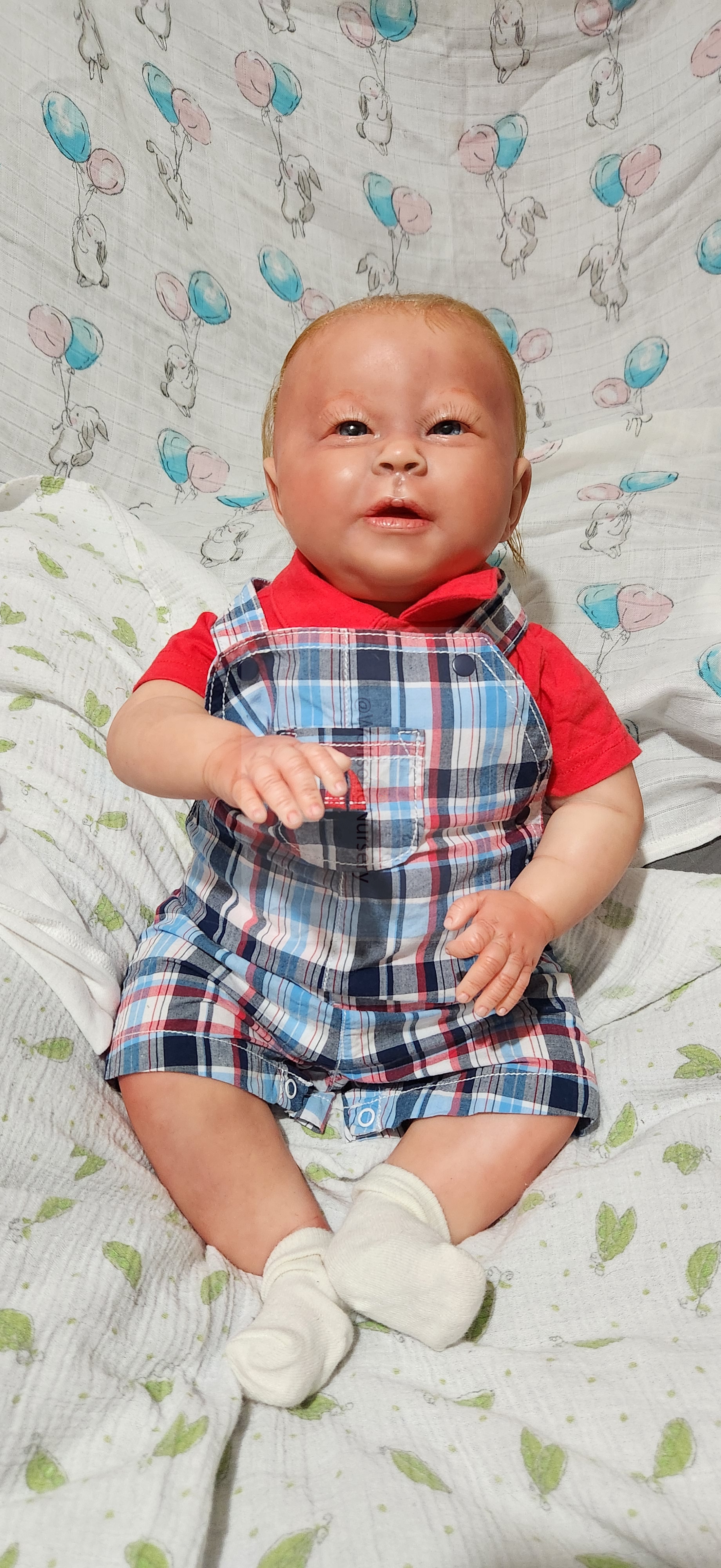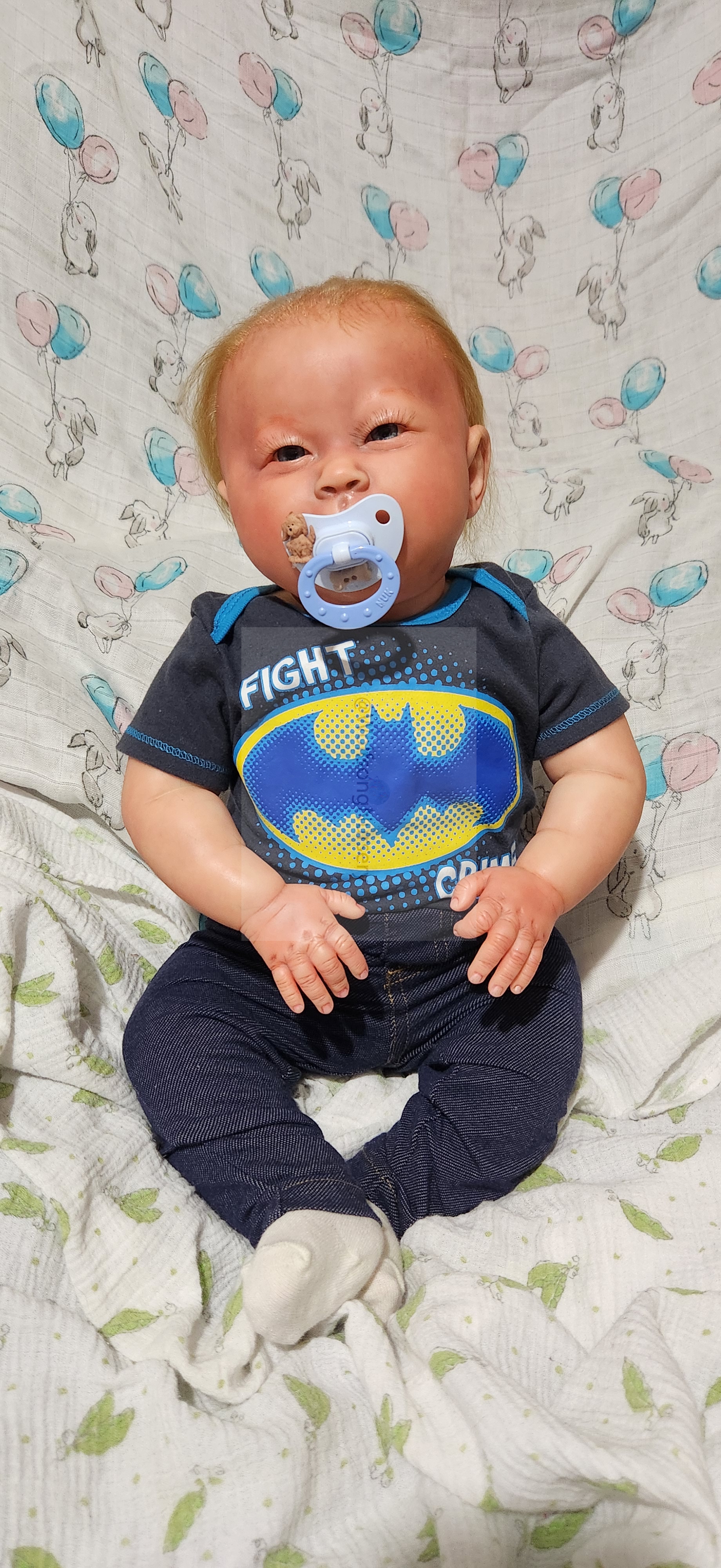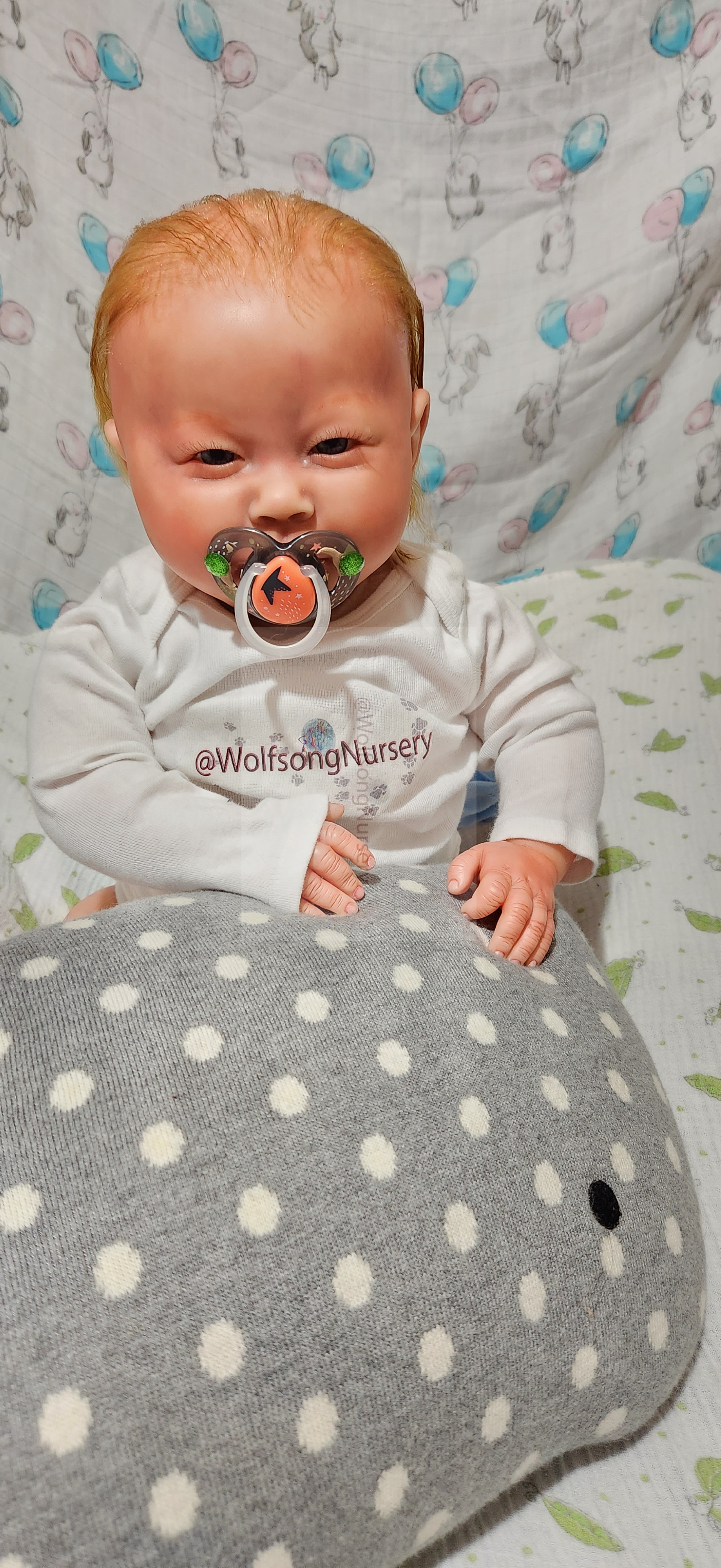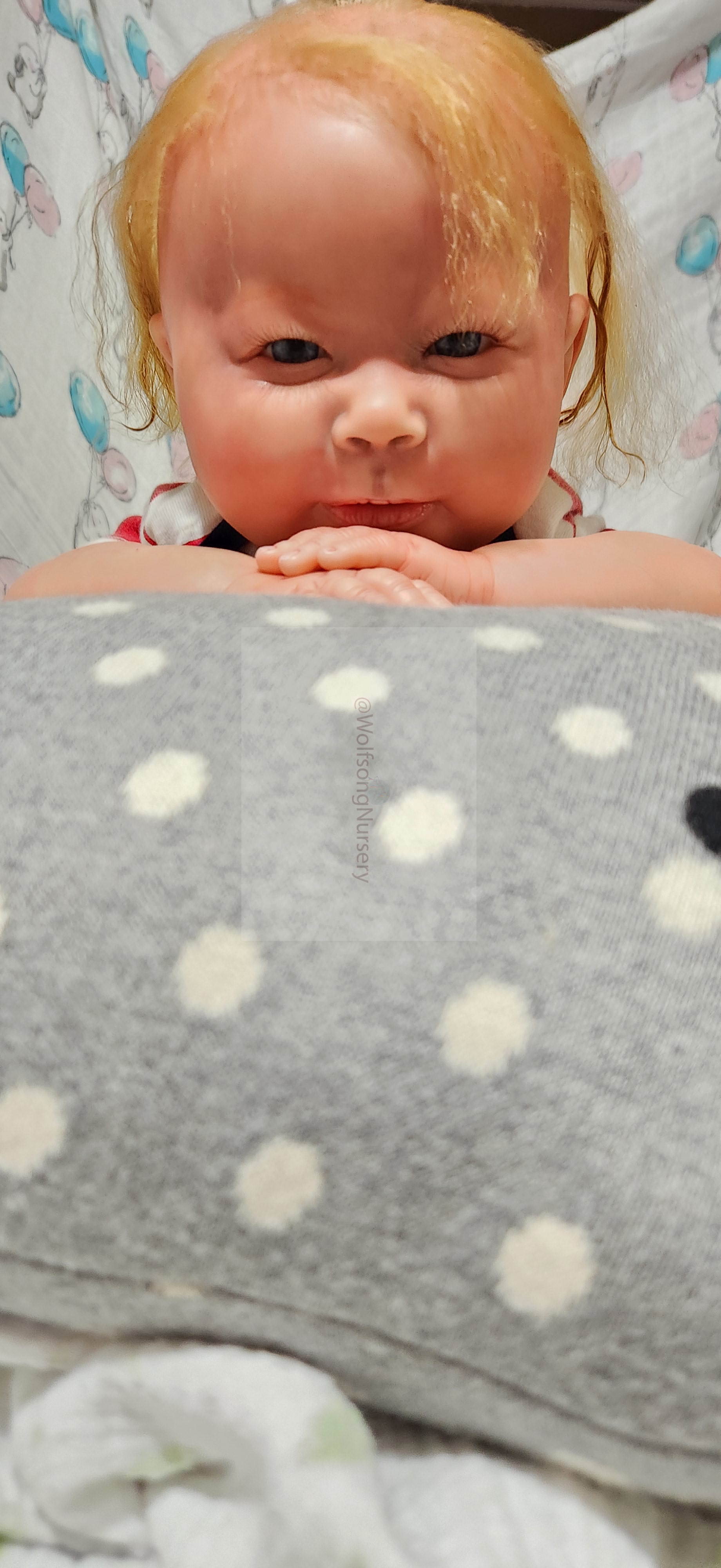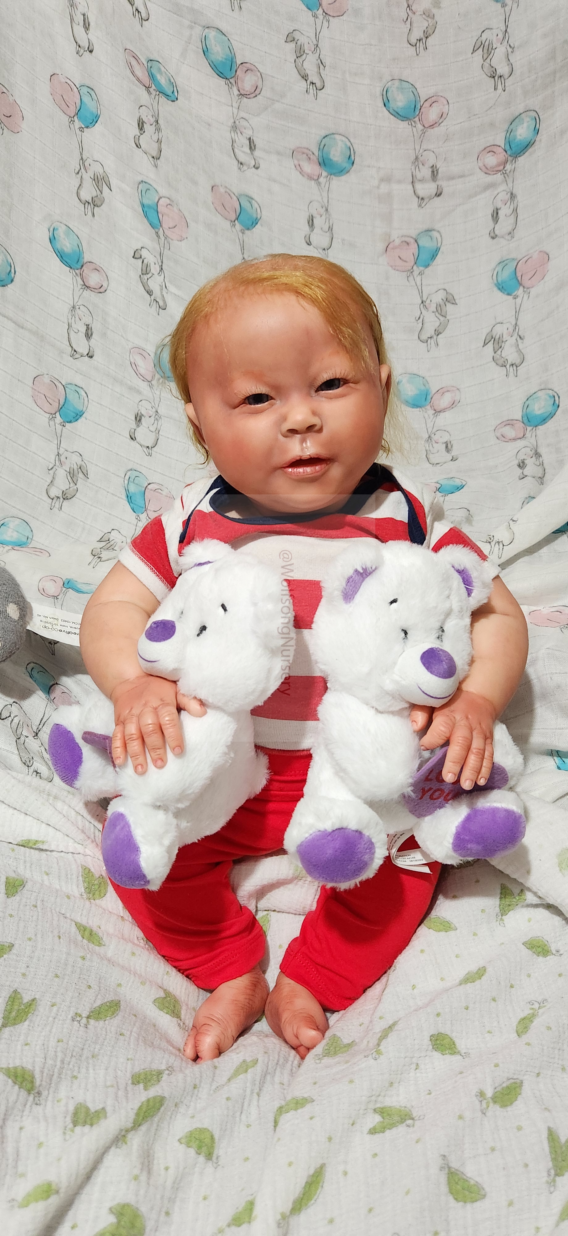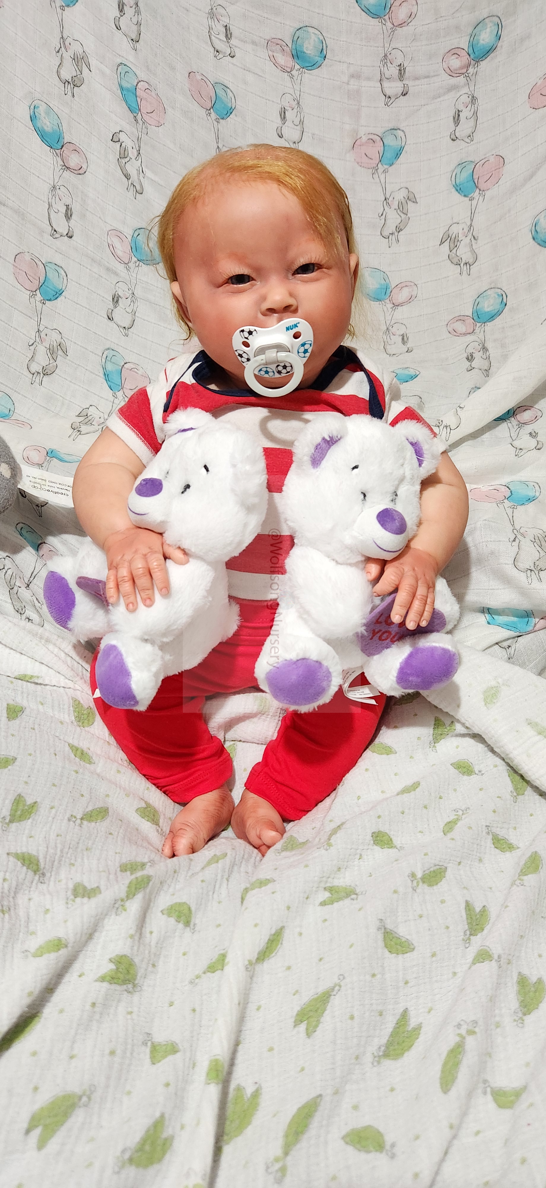 Samson Mark Miller was “born” March 25, 2023 at 4:20 Pm and he weighs 10 pounds 7 ounces at 23 inches long. He started with a Bountiful Baby Playfull Sage kit and was customized by Marta Towne of Wolfsong Nursery using Genesis Heat Set Paints, Pan Pastel and Coastal Scents Powders and using silicone pads in his tummy and bottom along with #3 glass beads, Poly pellets, 2 types of PolyFill (Super Soft and Regular) and he, like all my babies, takes one of my hearts with him to his Mommy, Denise Miller.