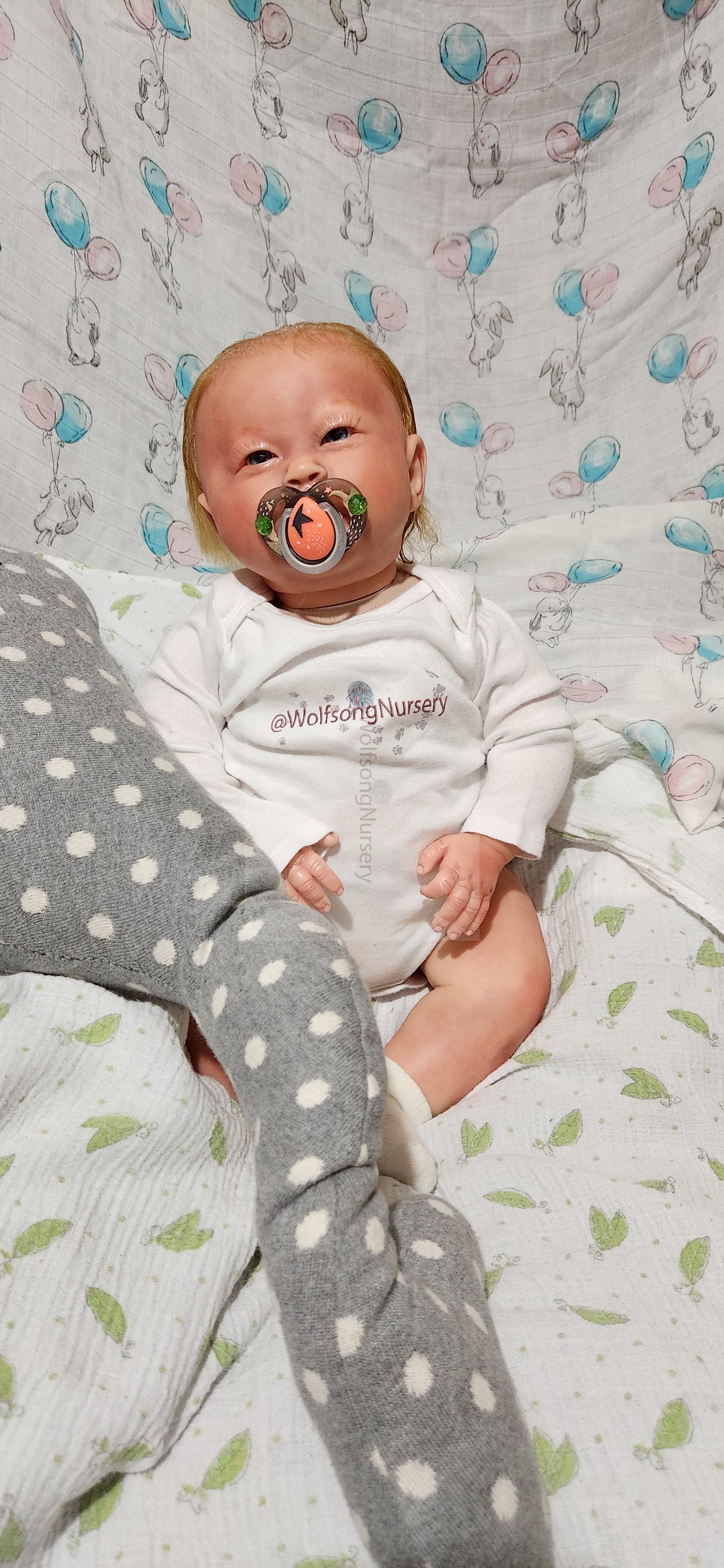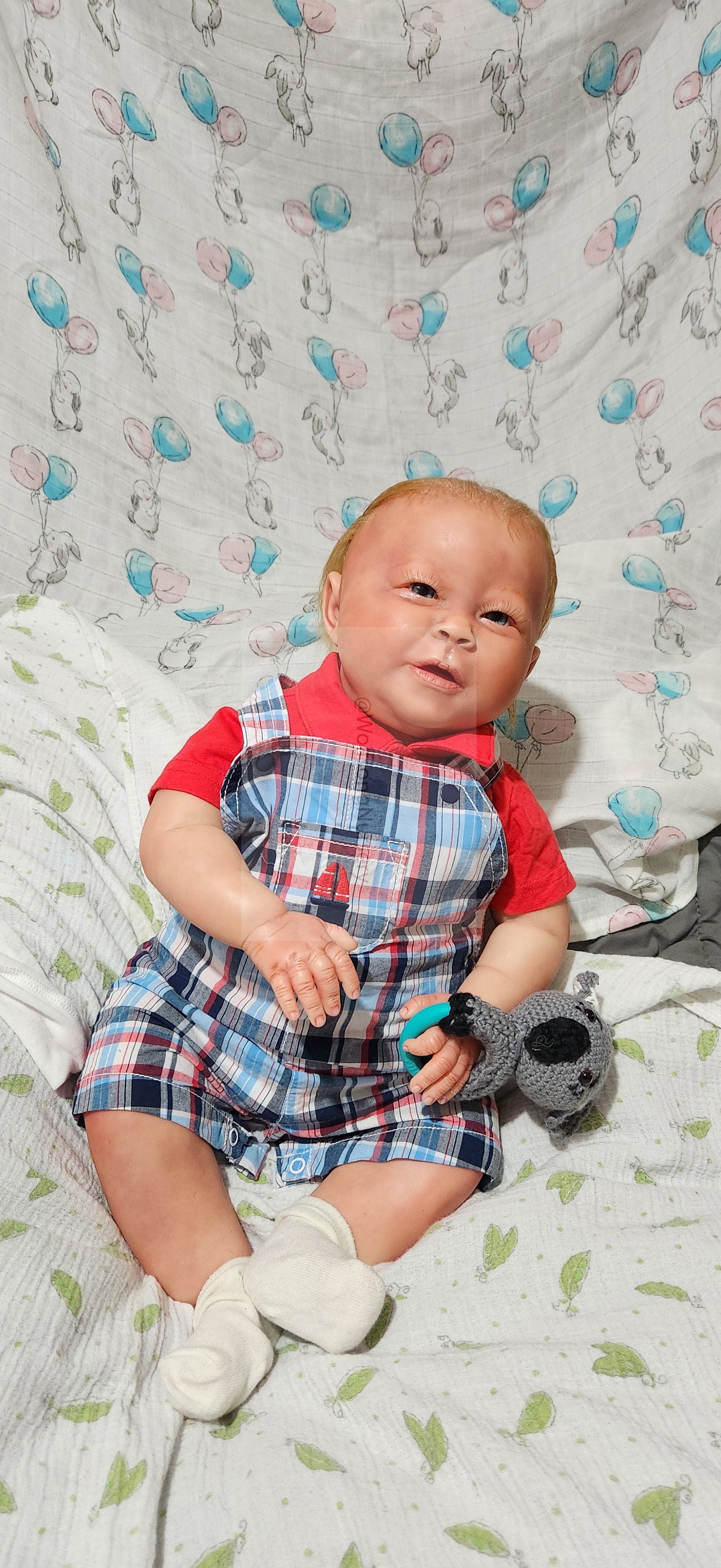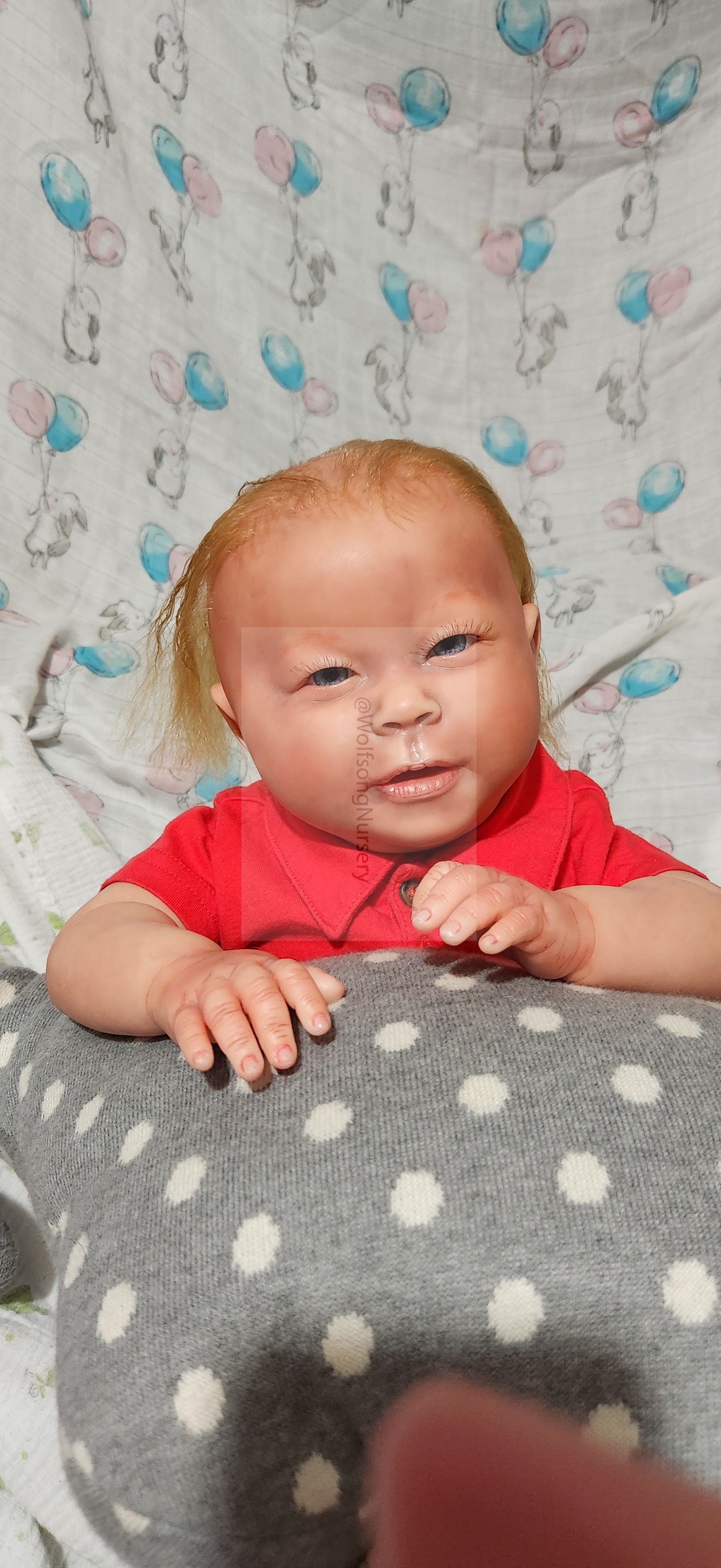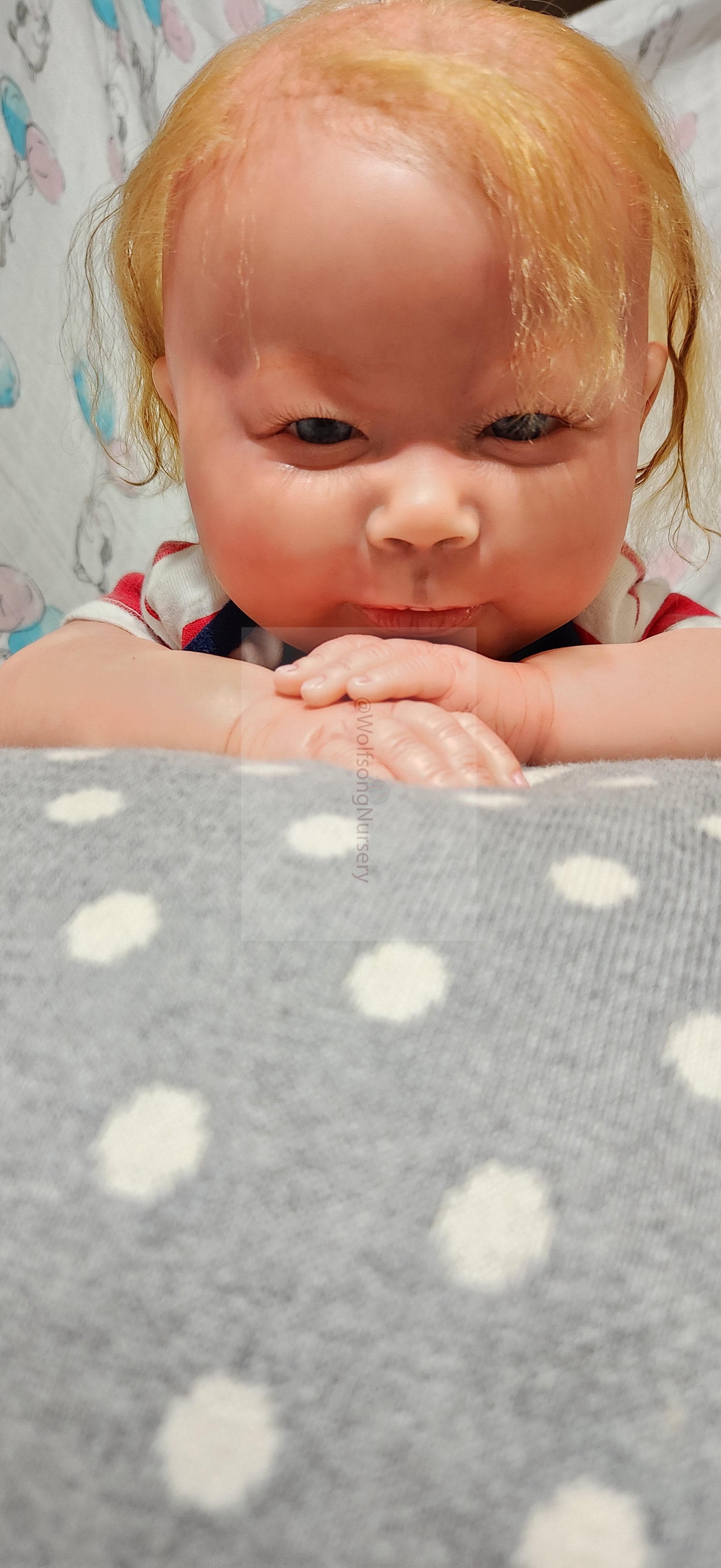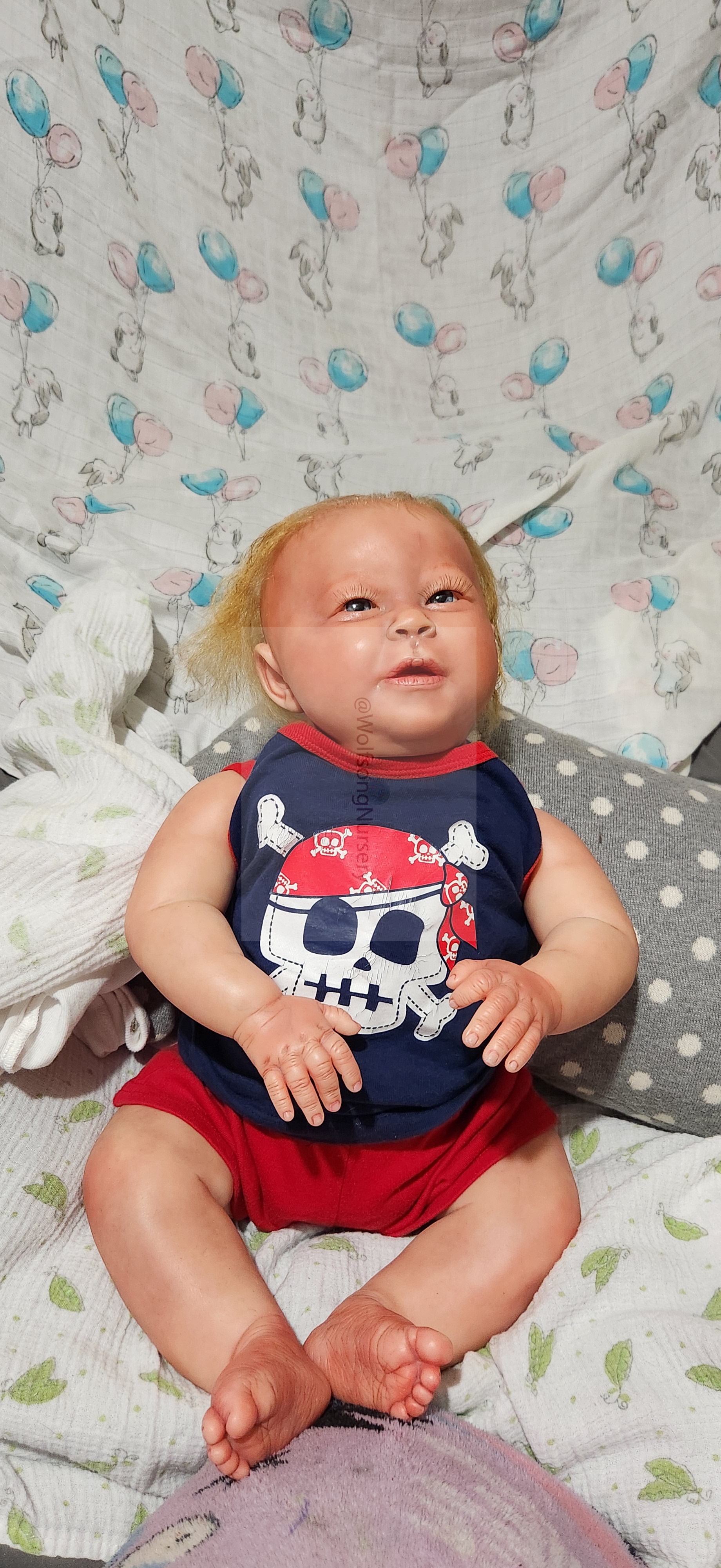 Samson Mark Miller was “born” March 25, 2023 at 4:20 Pm and he weighs 10 pounds 7 ounces at 23 inches long. He started with a Bountiful Baby Playfull Sage kit and was customized by Marta Towne of Wolfsong Nursery using Genesis Heat Set Paints, Pan Pastel and Coastal Scents Powders and using silicone pads in his tummy and bottom along with #3 glass beads, Poly pellets, 2 types of PolyFill (Super Soft and Regular) and he, like all my babies, takes one of my hearts with him to his Mommy, Denise Miller.