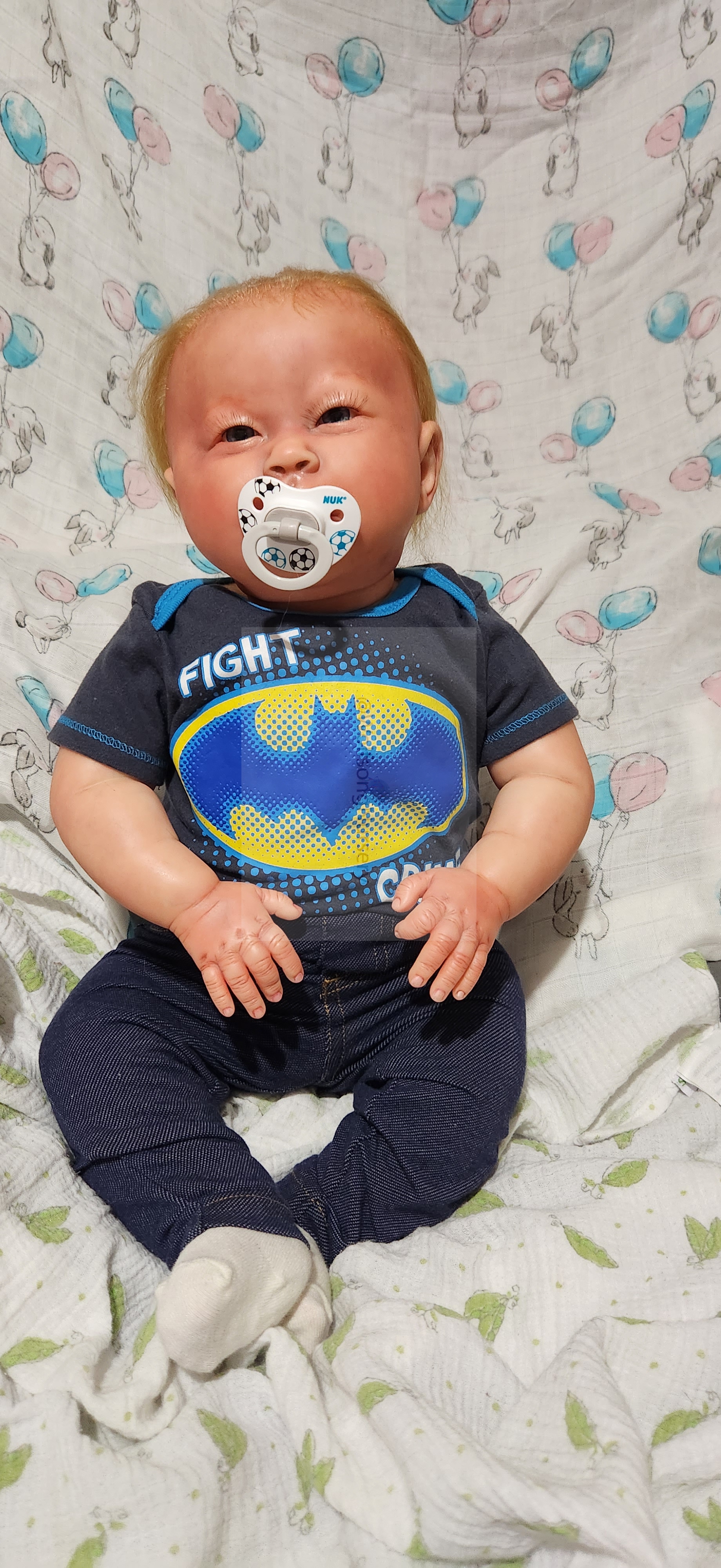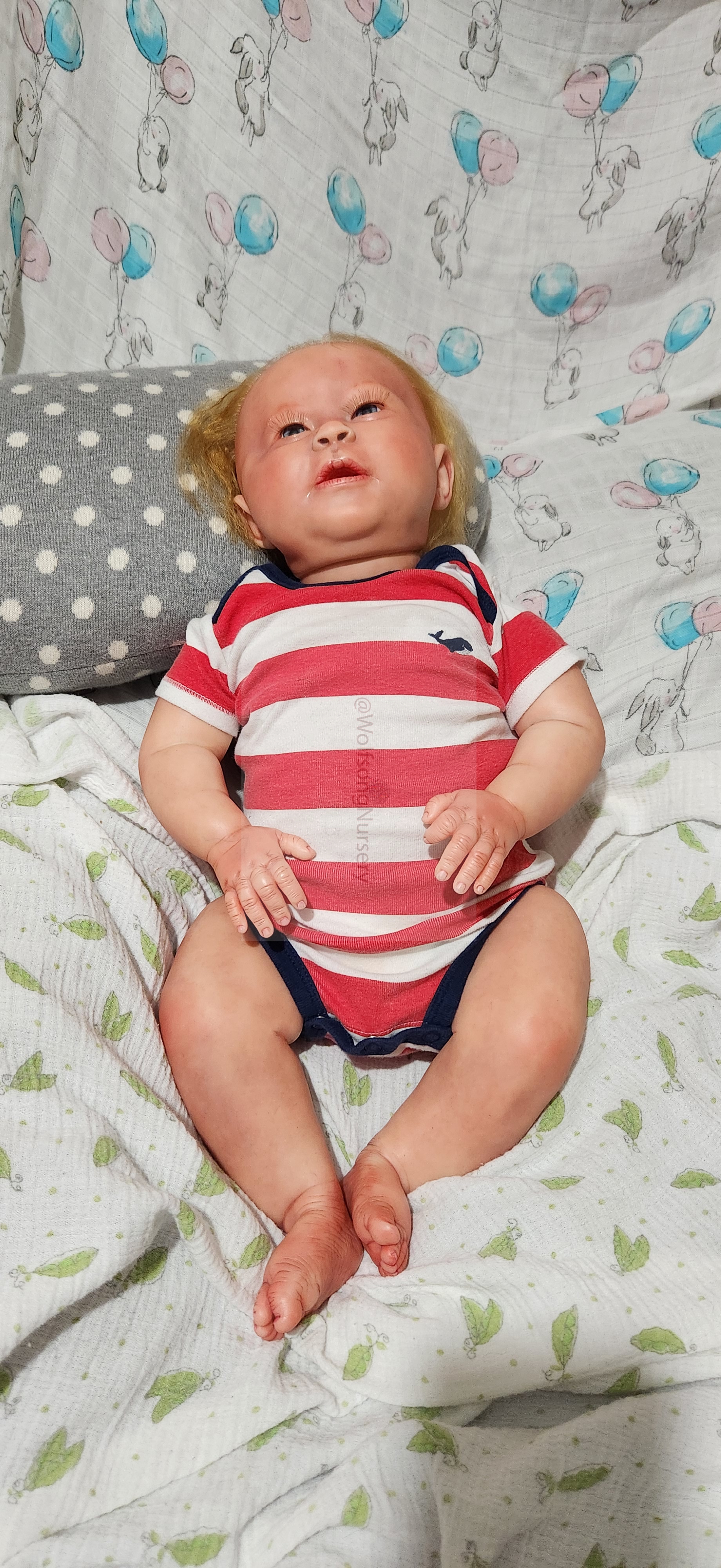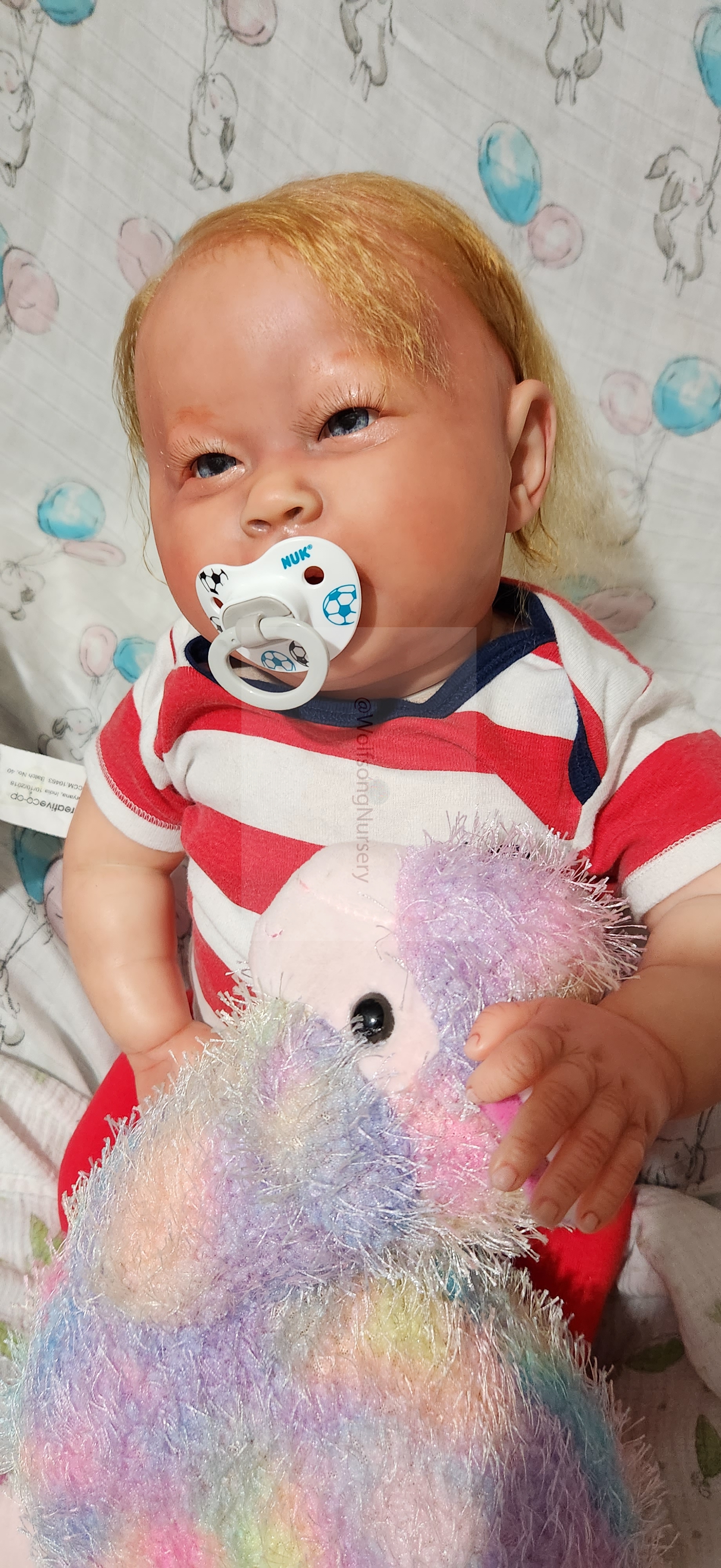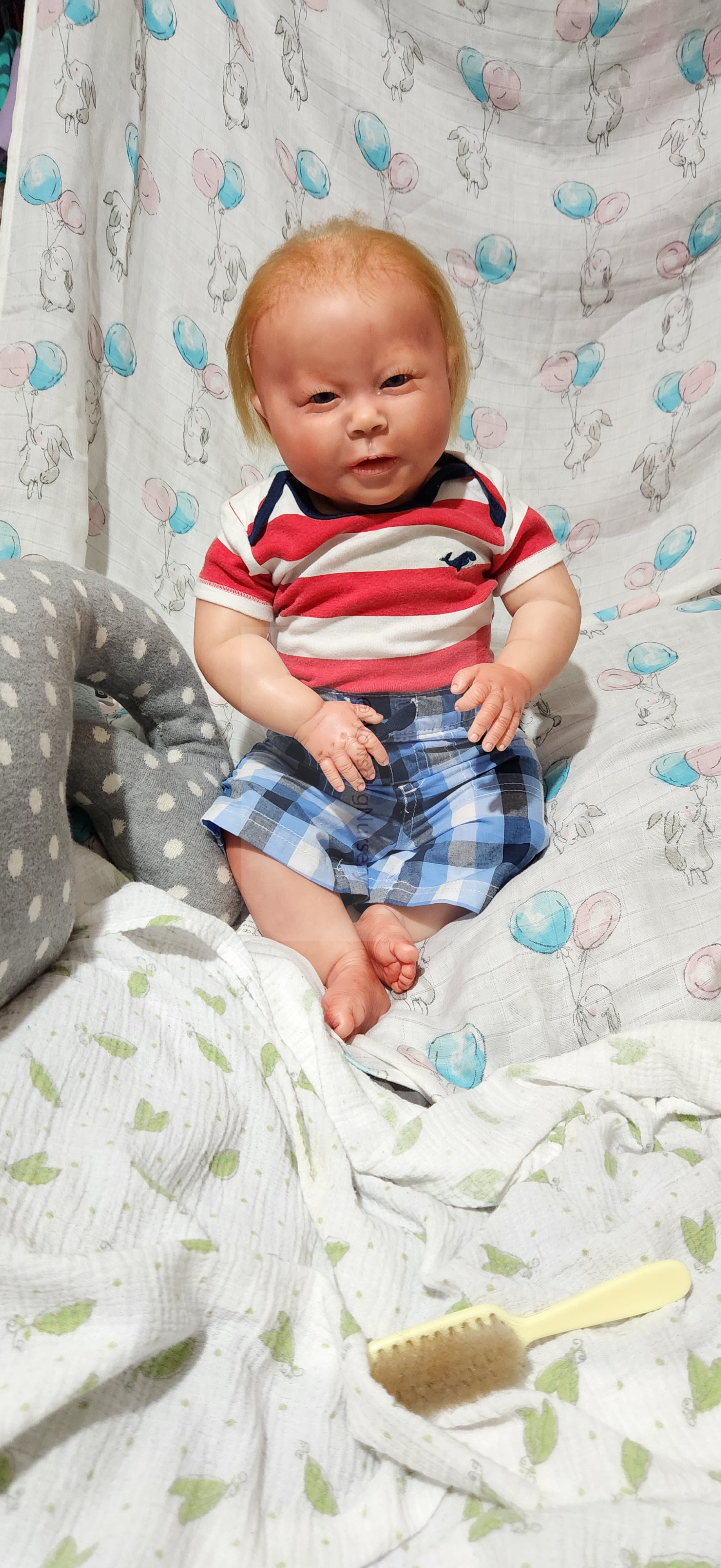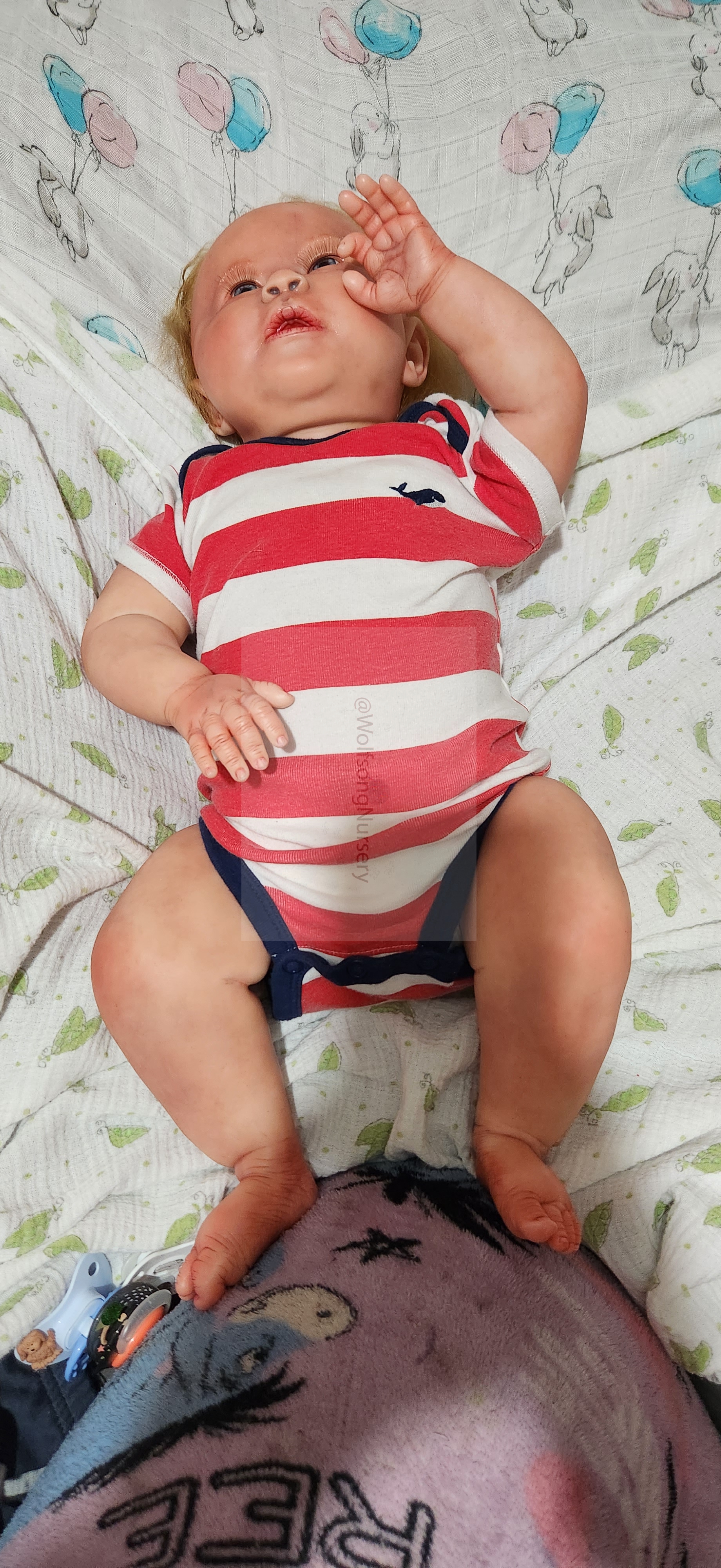 Samson Mark Miller was “born” March 25, 2023 at 4:20 Pm and he weighs 10 pounds 7 ounces at 23 inches long. He started with a Bountiful Baby Playfull Sage kit and was customized by Marta Towne of Wolfsong Nursery using Genesis Heat Set Paints, Pan Pastel and Coastal Scents Powders and using silicone pads in his tummy and bottom along with #3 glass beads, Poly pellets, 2 types of PolyFill (Super Soft and Regular) and he, like all my babies, takes one of my hearts with him to his Mommy, Denise Miller.