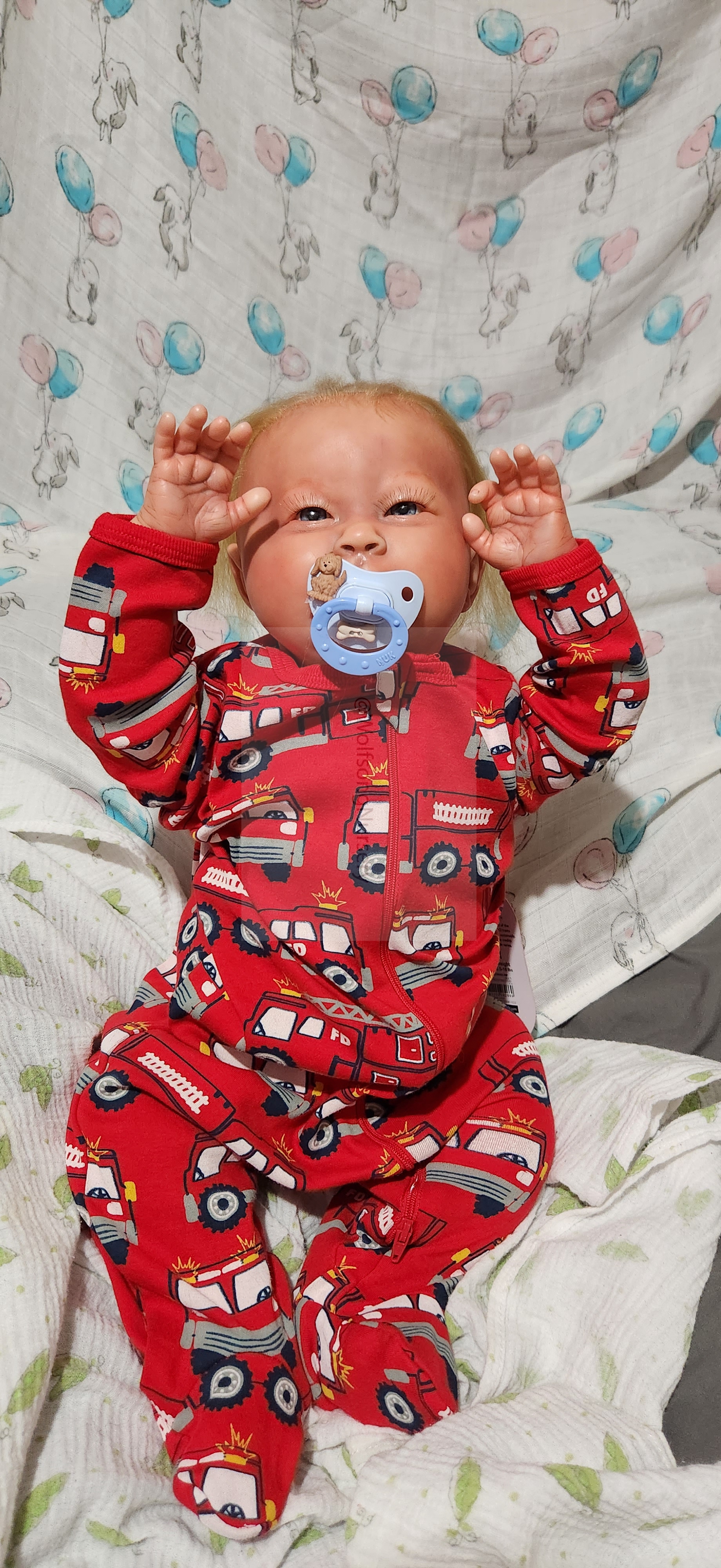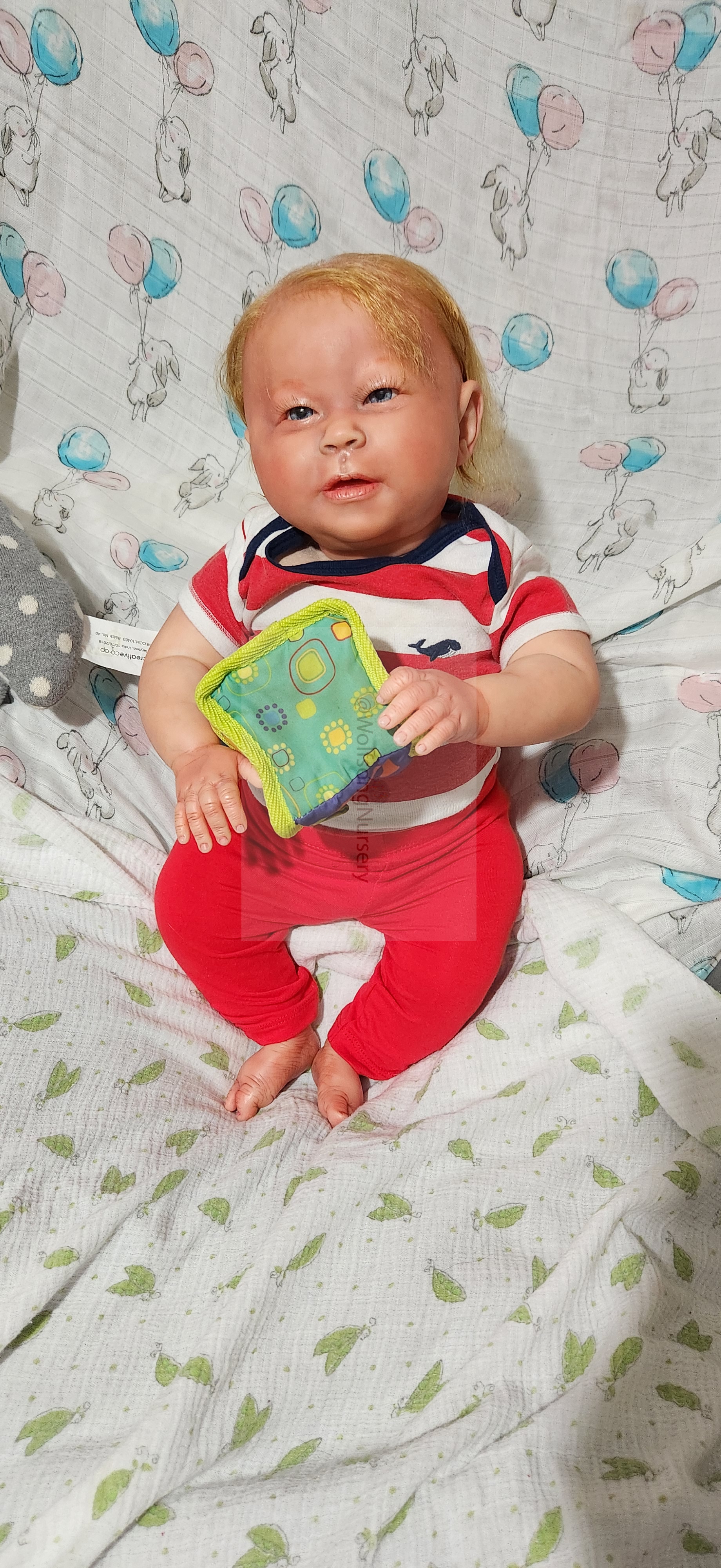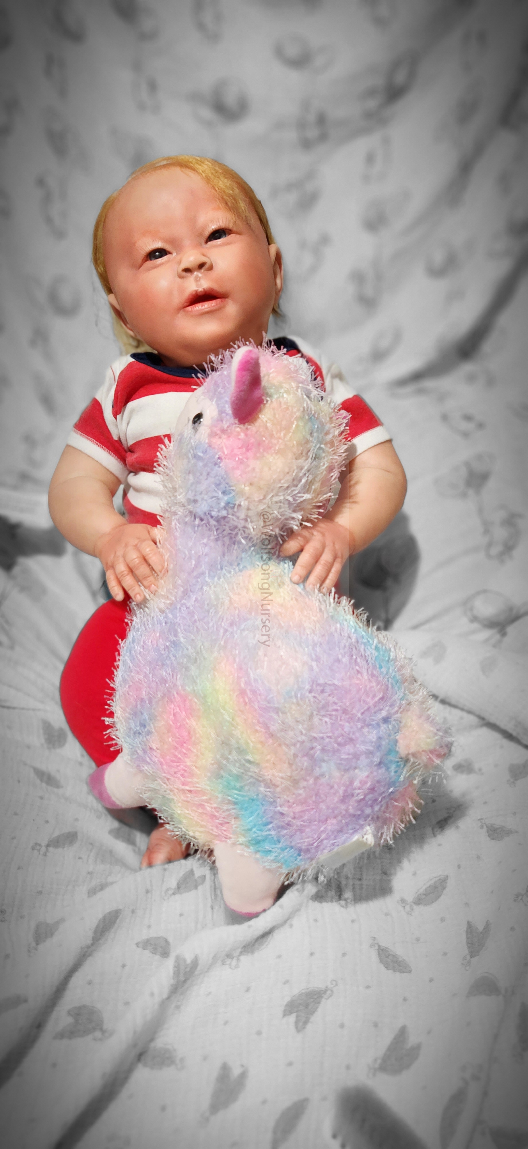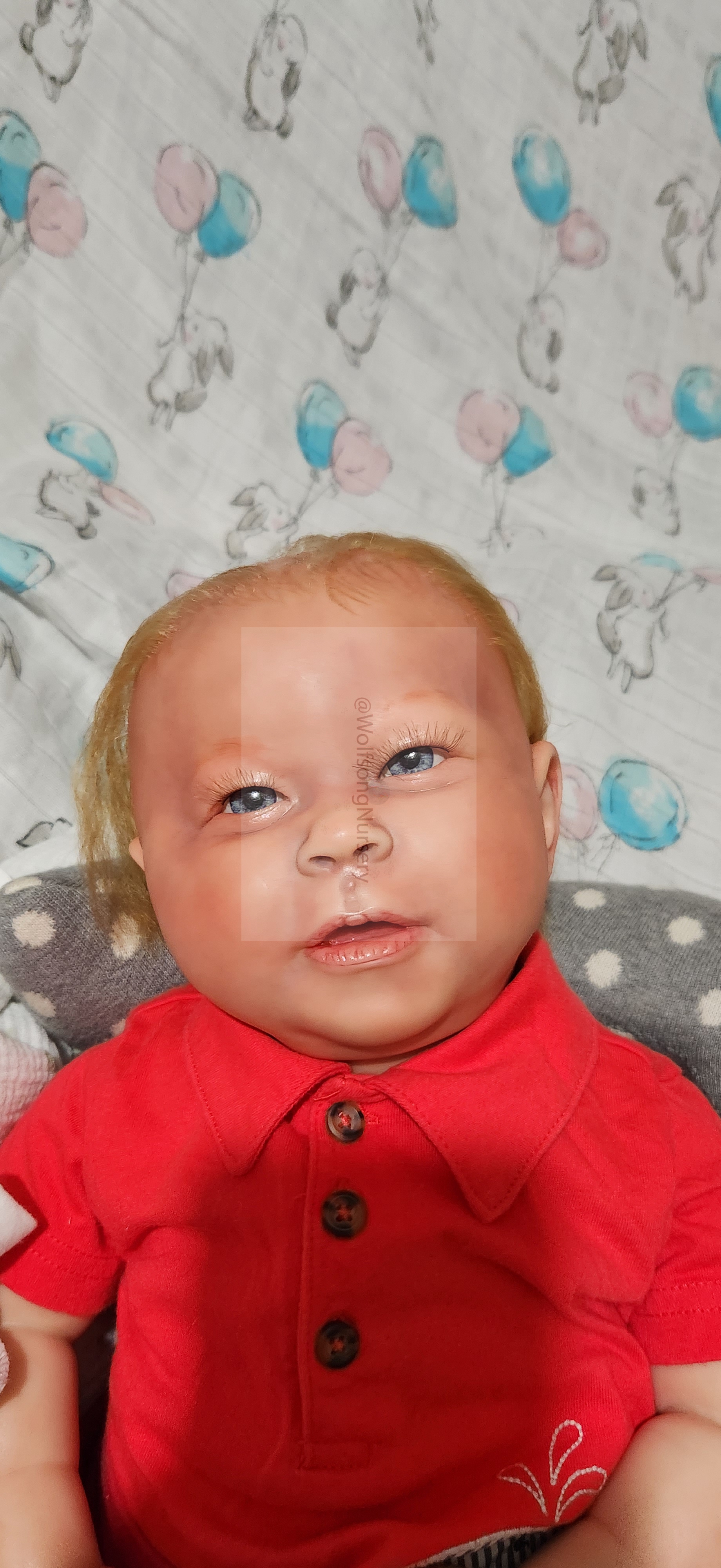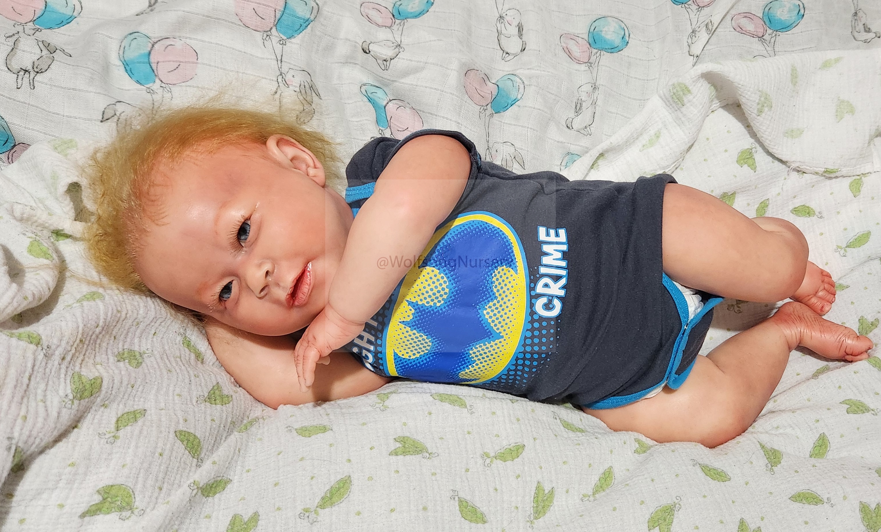Samson Mark Miller was “born” March 25, 2023 at 4:20 Pm and he weighs 10 pounds 7 ounces at 23 inches long. He started with a Bountiful Baby Playfull Sage kit and was customized by Marta Towne of Wolfsong Nursery using Genesis Heat Set Paints, Pan Pastel and Coastal Scents Powders and using silicone pads in his tummy and bottom along with #3 glass beads, Poly pellets, 2 types of PolyFill (Super Soft and Regular) and he, like all my babies, takes one of my hearts with him to his Mommy, Denise Miller.
