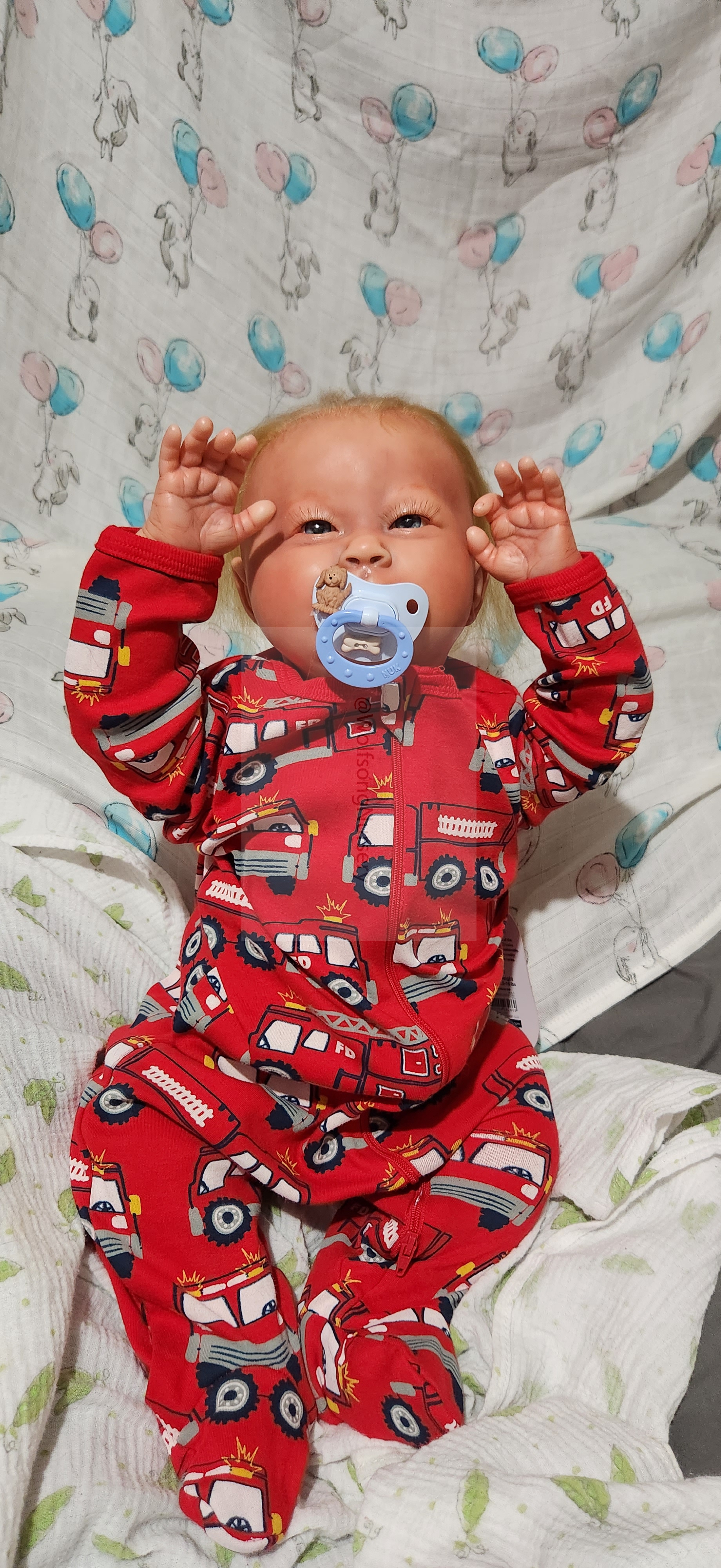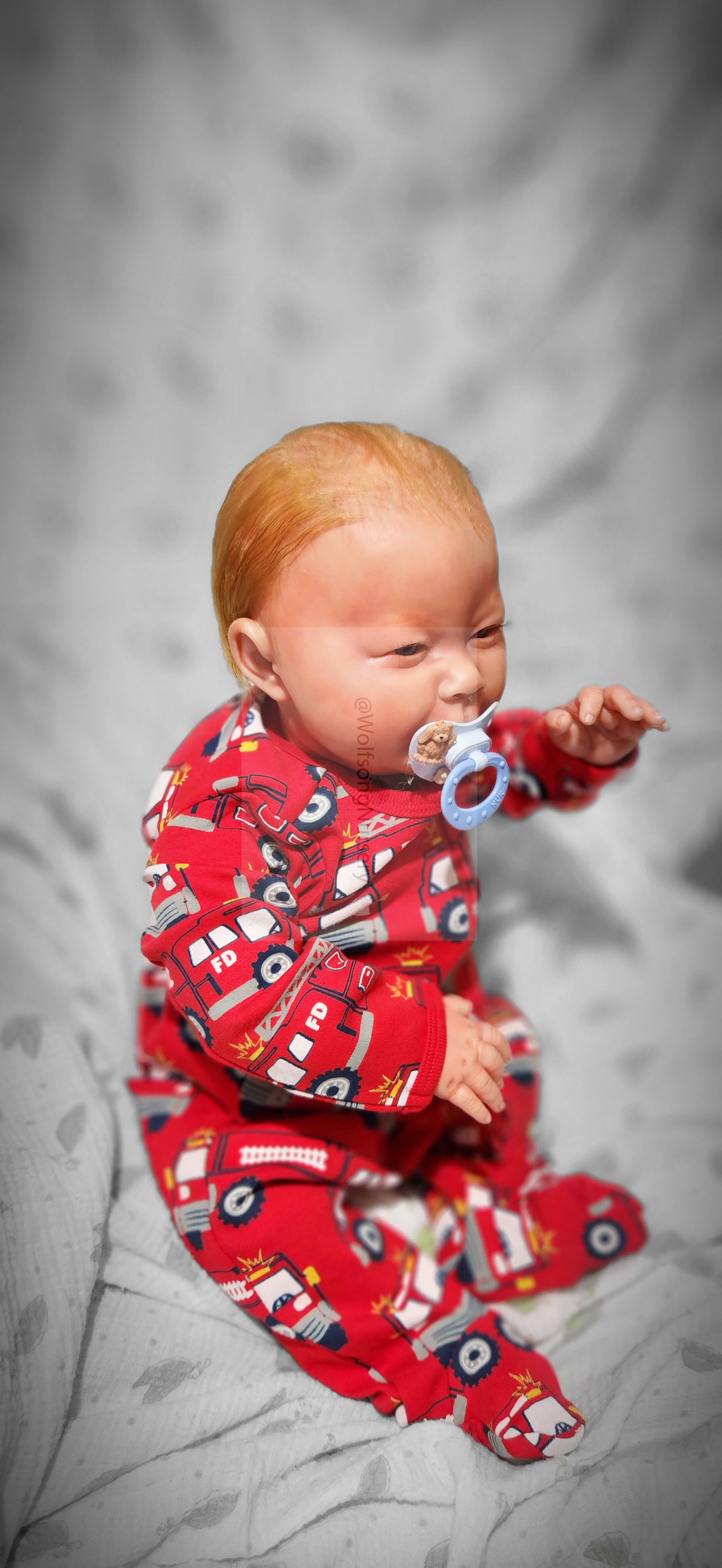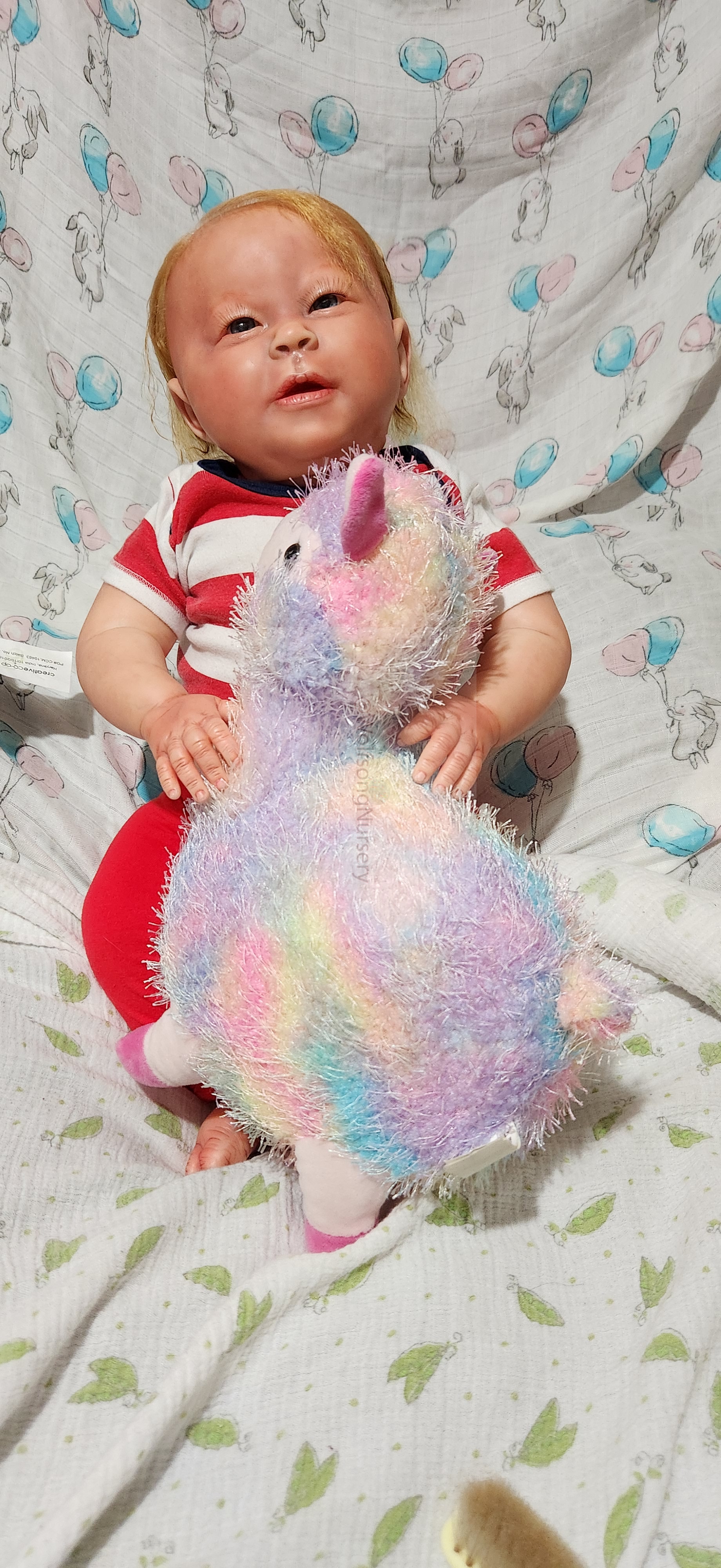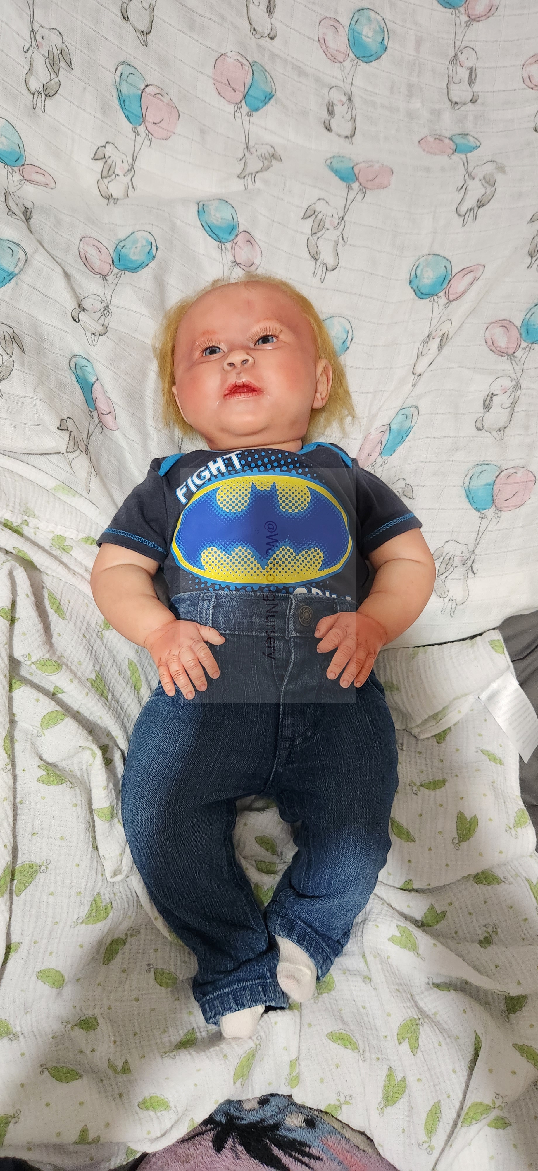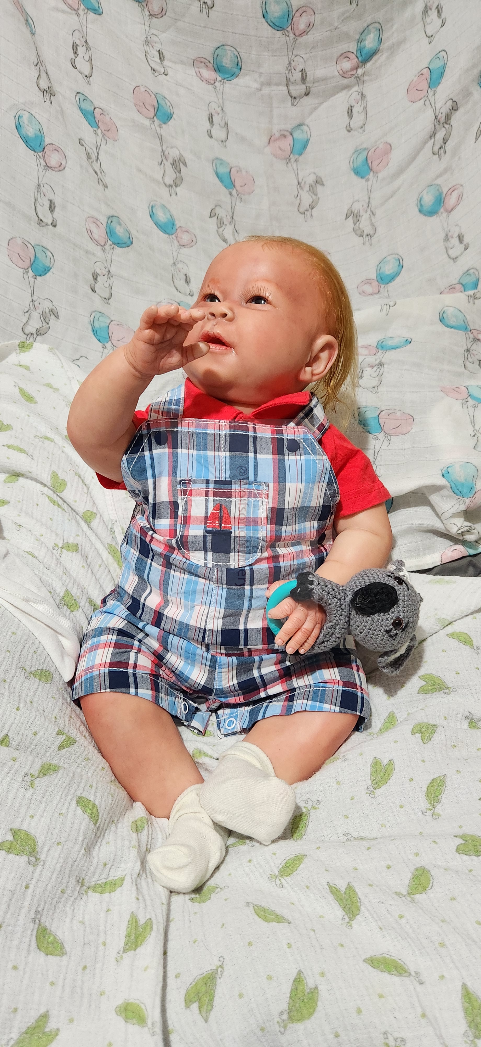 Samson Mark Miller was “born” March 25, 2023 at 4:20 Pm and he weighs 10 pounds 7 ounces at 23 inches long. He started with a Bountiful Baby Playfull Sage kit and was customized by Marta Towne of Wolfsong Nursery using Genesis Heat Set Paints, Pan Pastel and Coastal Scents Powders and using silicone pads in his tummy and bottom along with #3 glass beads, Poly pellets, 2 types of PolyFill (Super Soft and Regular) and he, like all my babies, takes one of my hearts with him to his Mommy, Denise Miller.