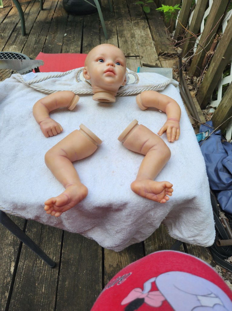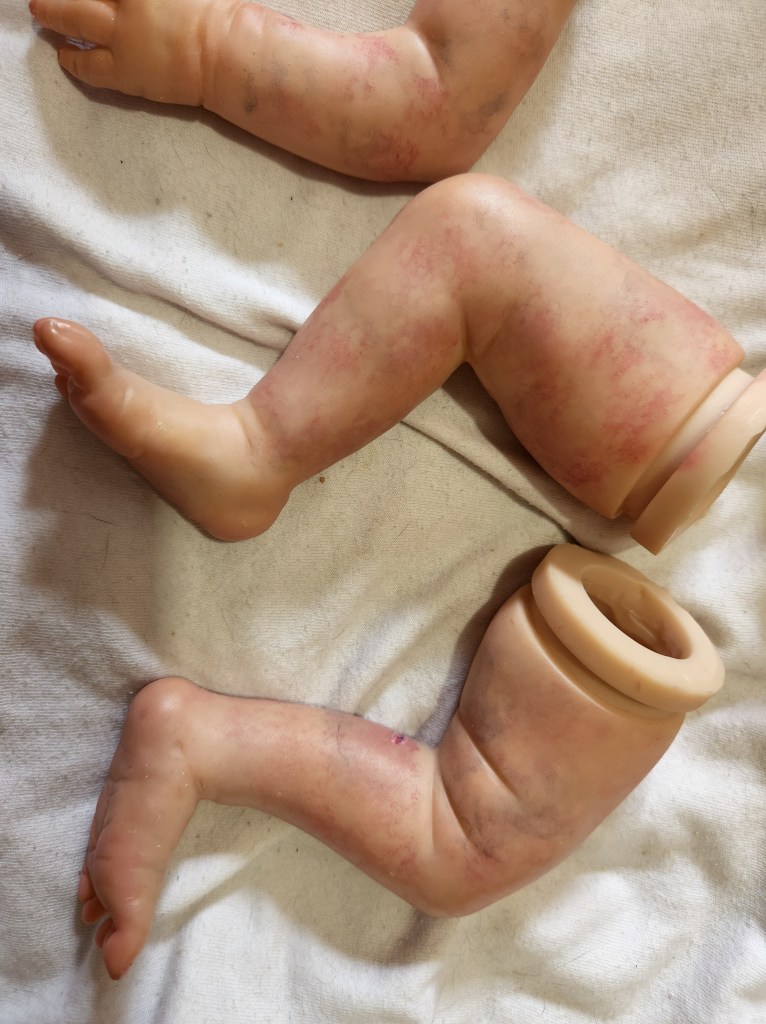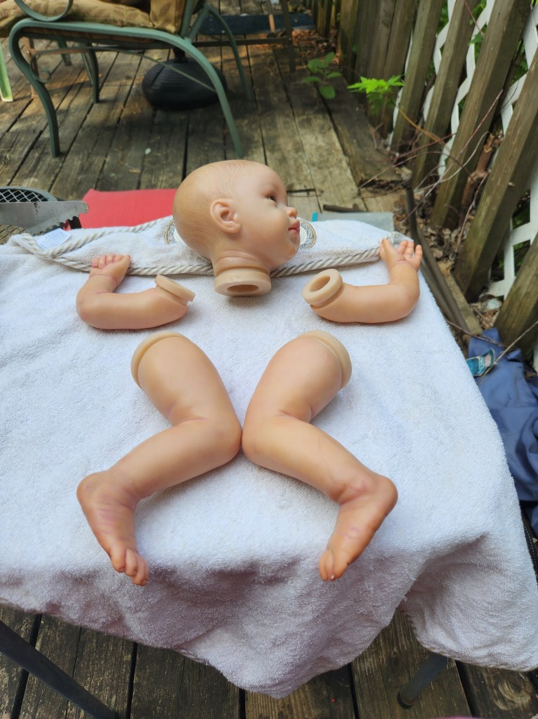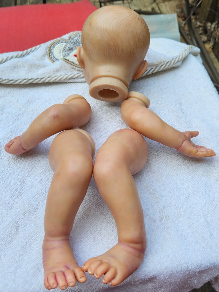 Then comes the fun part. I put her together, using silicone pads to make the bottom and tummy feel more real and used 2 different types of polyfill and high quality #3 glass beads .75-1mm in a microfiber bags; one in the body, one in the head for weight…make sure to support her little head, just like a real newborn. And once her heart was added, she was finished ! Now there are a couple of places I’ve found some flaws that I believe are in the vinyl. Due to those (ask for photos or go to her page) I’m selling her as a BooBoo baby.