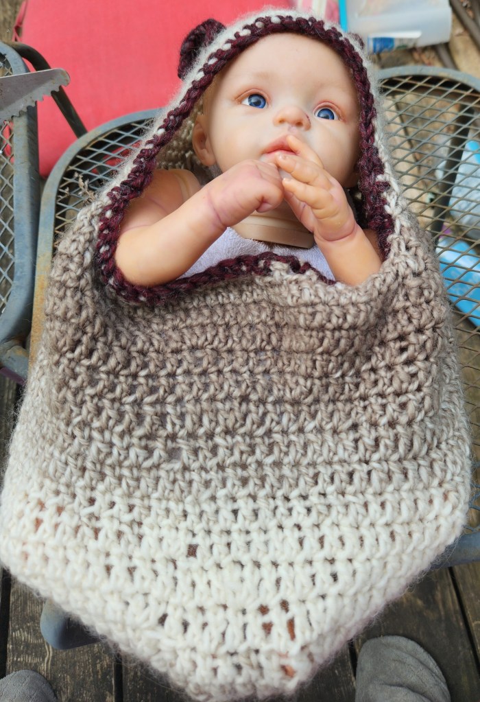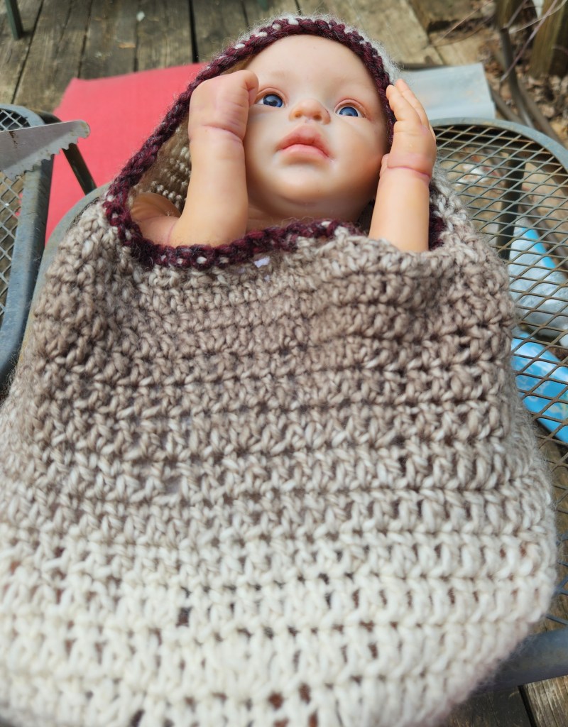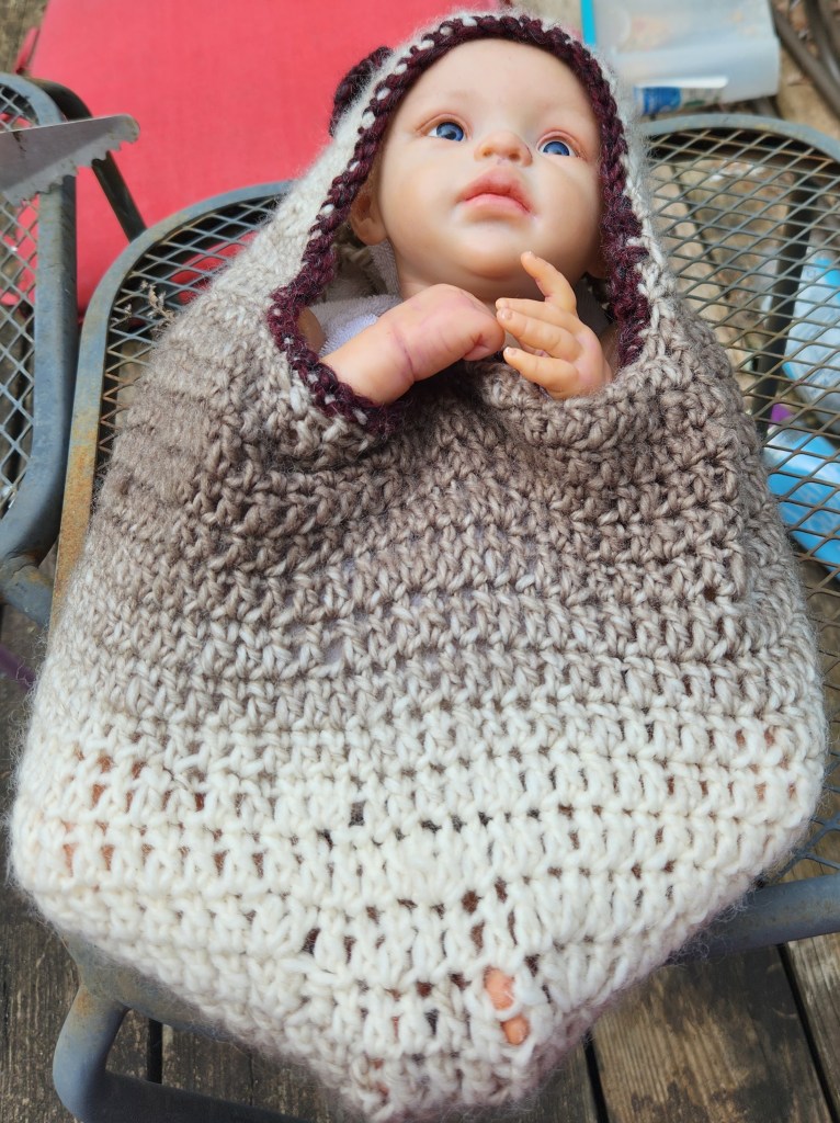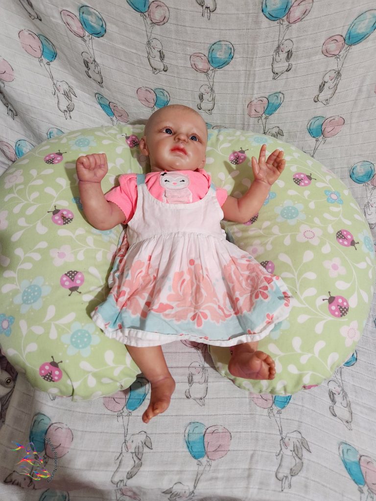 Then comes the fun part. I put her together, using silicone pads to make the bottom and tummy feel more real and used 2 different types of polyfill and high quality #3 glass beads .75-1mm in a microfiber bags; one in the body, one in the head for weight…make sure to support her little head, just like a real newborn. And once her heart was added, she was finished ! Now there are a couple of places I’ve found some flaws that I believe are in the vinyl. Due to those (ask for photos or go to her page) I’m selling her as a BooBoo baby.
