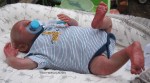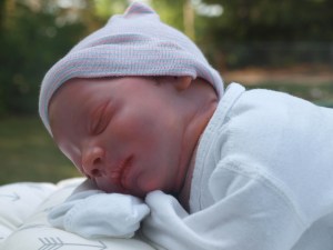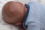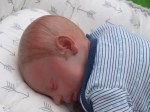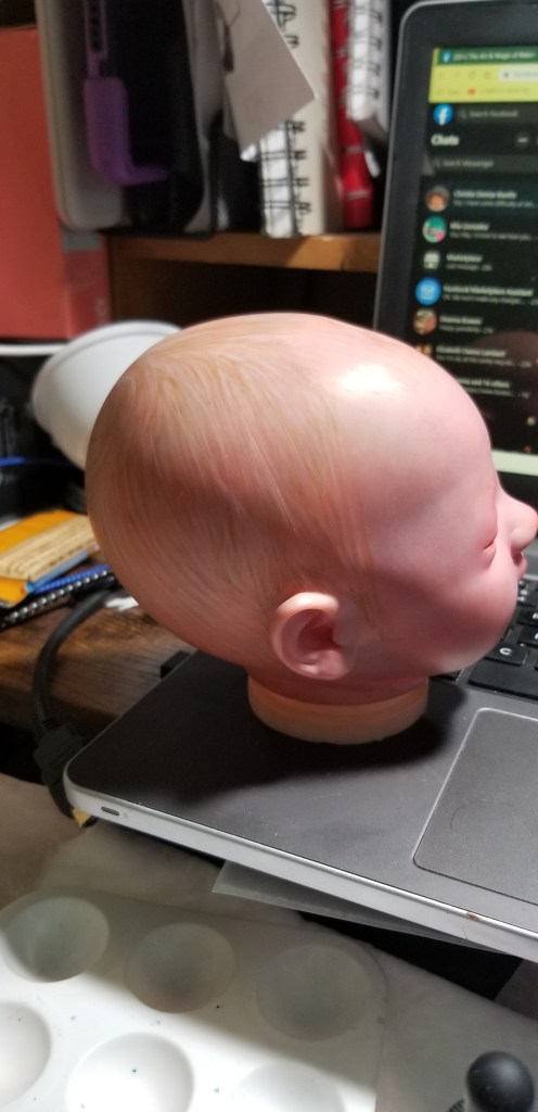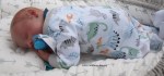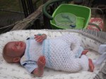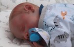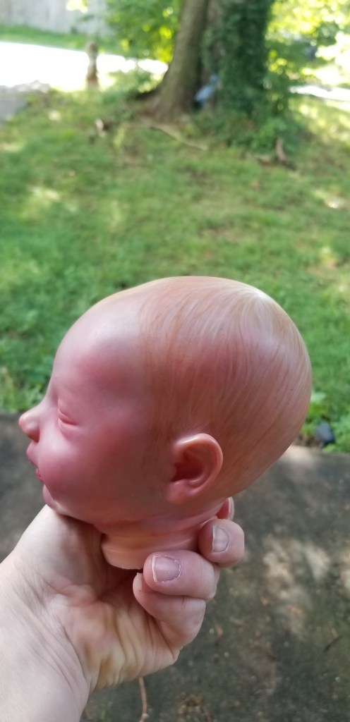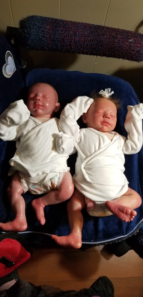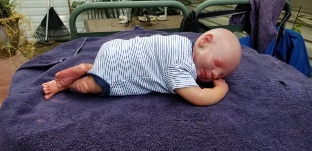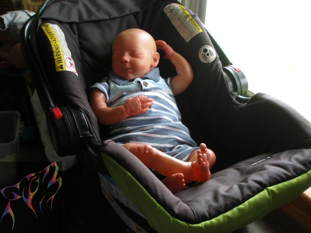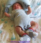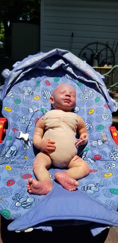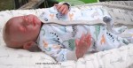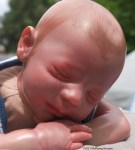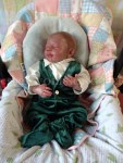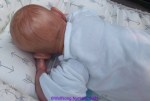 This is Bountiful Baby Realborn Steven Asleep reborned by Marta Towne of Wolfsong Nursery. Painted with multiple layers of Genesis heat set paints and hand rooted with two types of quality Mohair (straight and curly) Rhys is a joy to see and even more of a joy to hold. Rhys has a soft clothe body filled with two different types of poly-fill and weighted with glass beads for that real baby flop. Rhys’ body is slightly less floppy than twin Reese, just as the larger of a set of twins is in reality; Rhys still flops and nestles in your arms like a real baby and supporting the head is necessary. Rhys’ head, arms and legs are vinyl. Rhys has a magnet behind the lips so a magnetic pacifier can be used.