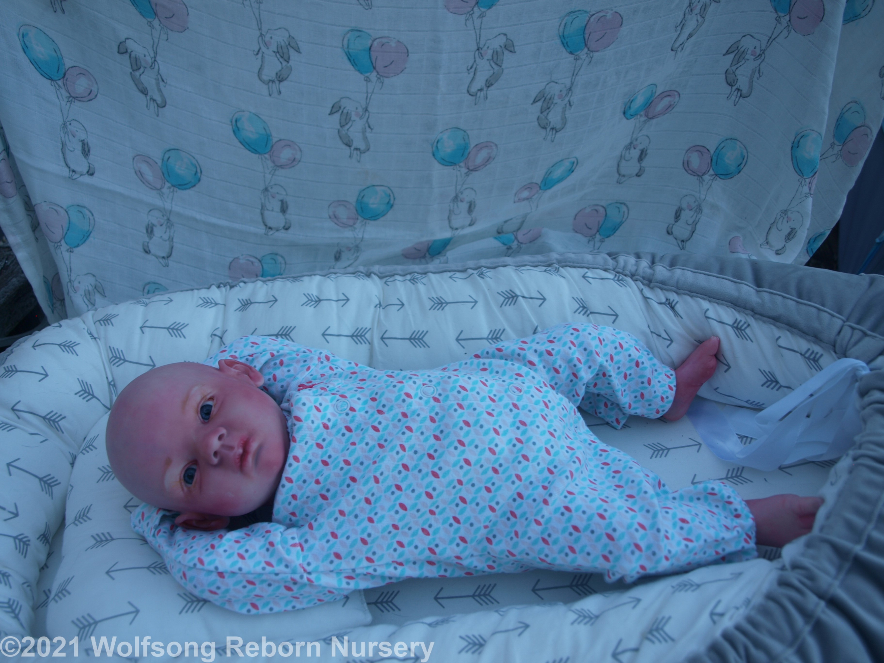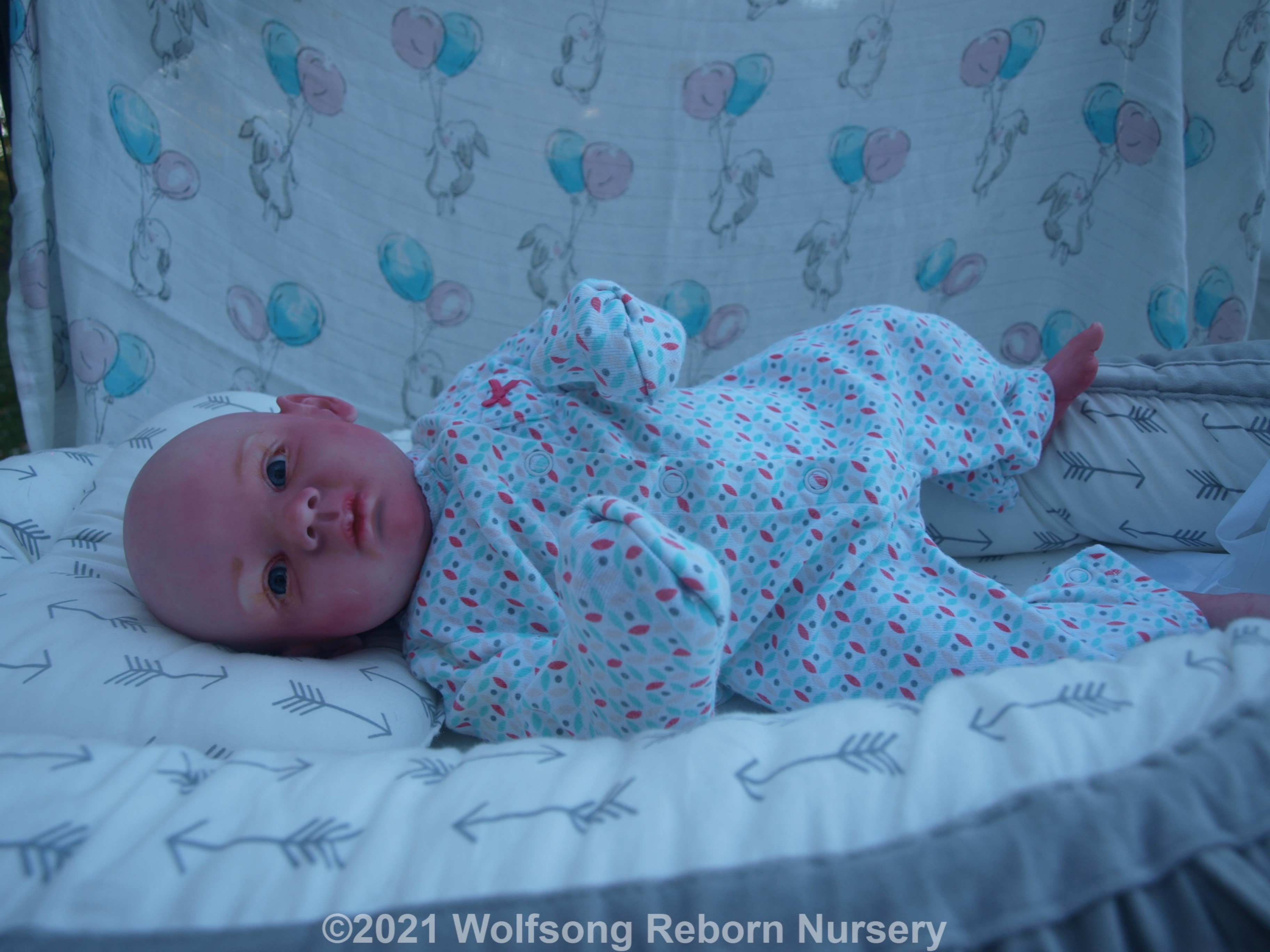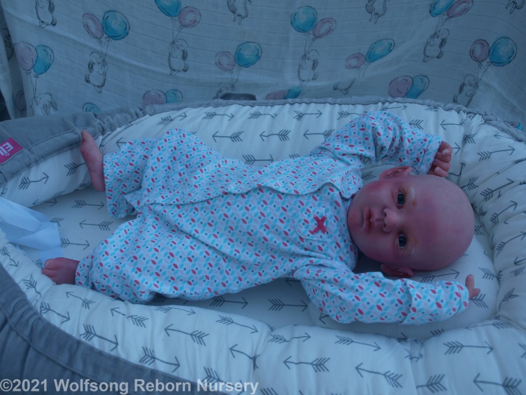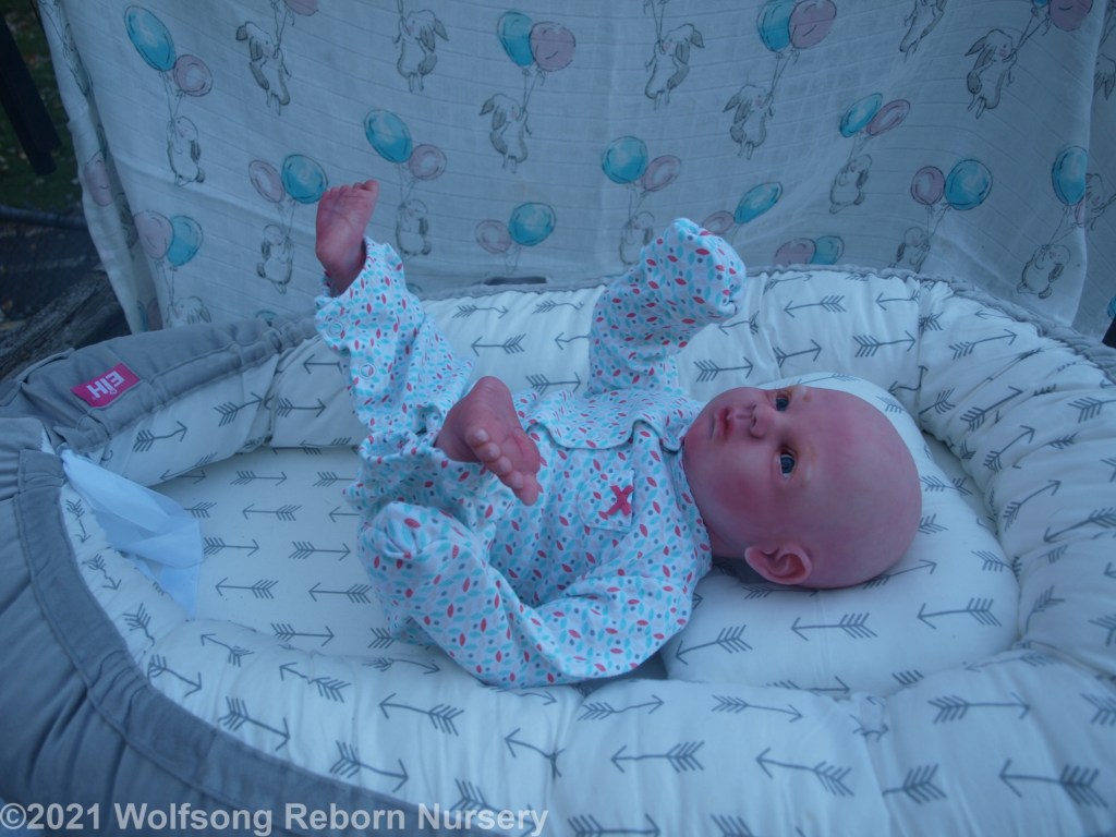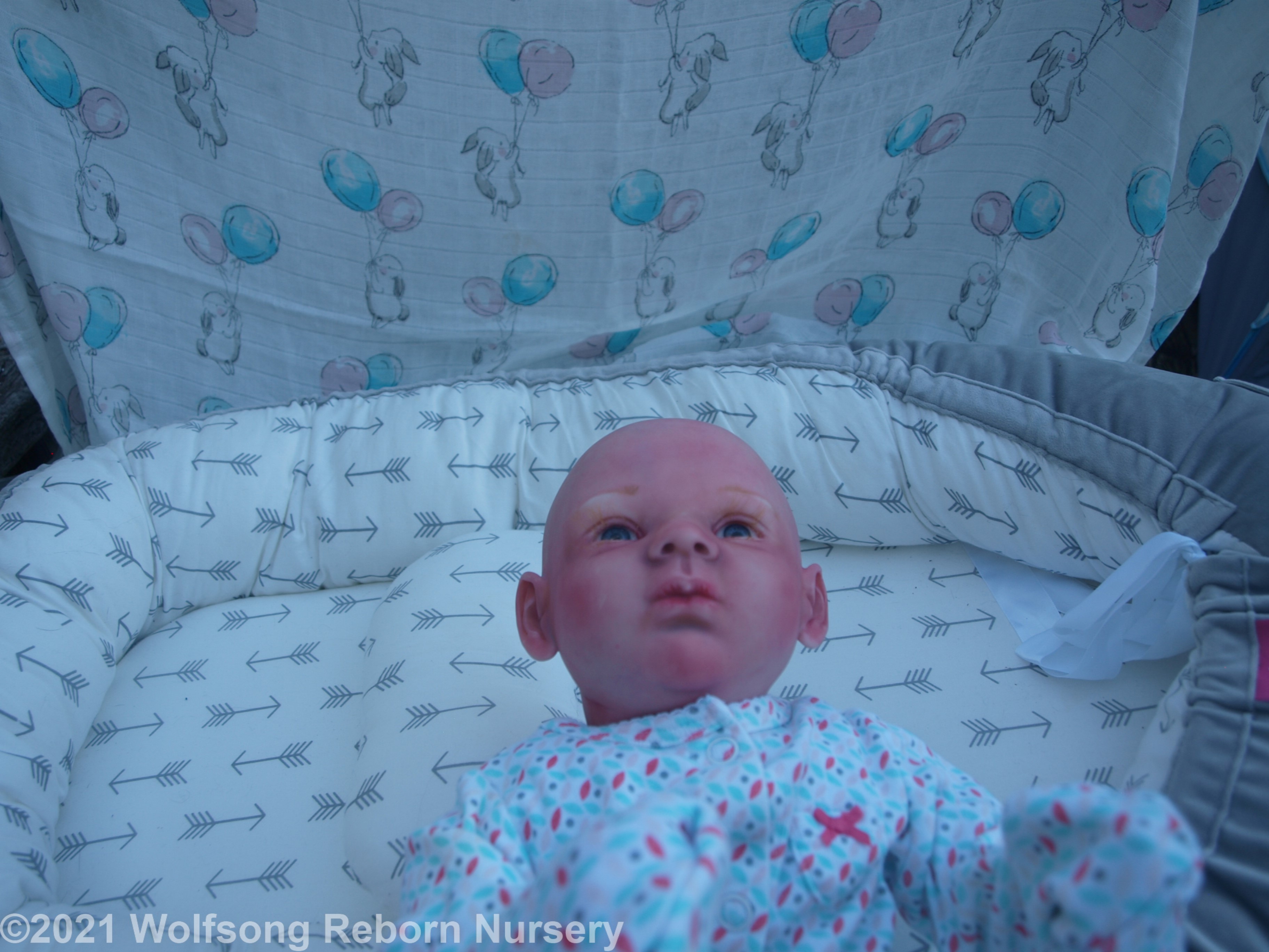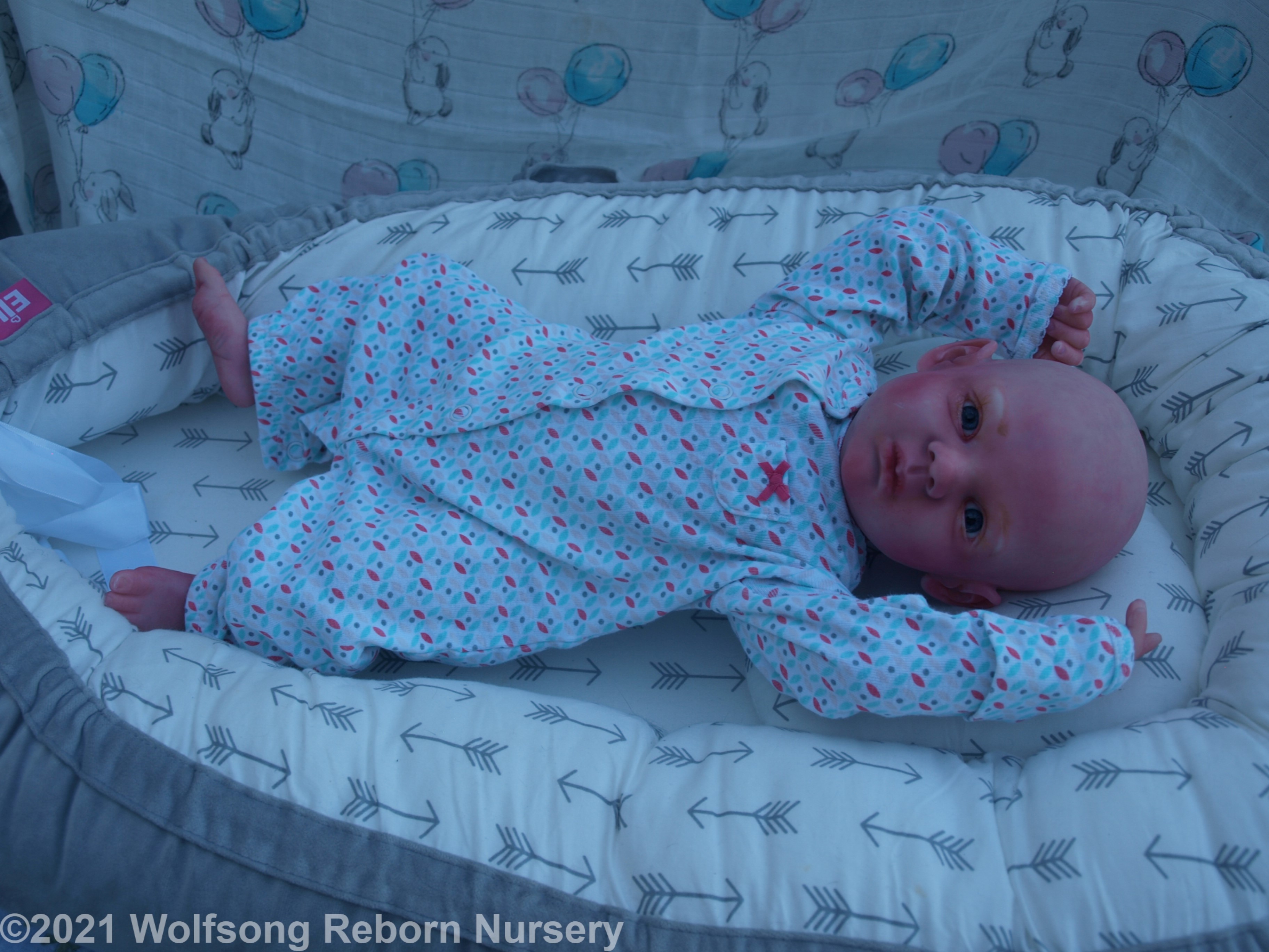 This is the Bountiful Baby Limited Edition 2021 ROSE Kit of the year Sandy reborned by Marta Towne of Wolfsong Reborn Nursery. Sandy is created on a second’s kit ad is being sold as a Boo Boo baby. I have been reborning since March and this is my ninth baby, so I have a lot to learn, but she is a precious baby made with a lot of love and attention to detail. Sandy has been reborned using Miracle Blend Air Dry Paint and Coastal Secents powders and is weighted with glass beads and filled with two types of polyfill. The head and all four limbs are attached using rings to allow a wide variety of poses.. Sandy has acrylic blue eyes from Bountiful Baby and lovely, hand rooted long lashes. Sandy has a magnet behind the lips for a magnetic pacifier as well as one on the inside of the head for a magnetic hair decoration (enclosed if selected as a girl) . Sandy’s head must be supported, just like a real baby. Sandy has a scratch on one little arm and elbow from too sharp baby nails, but has had a manicure now.