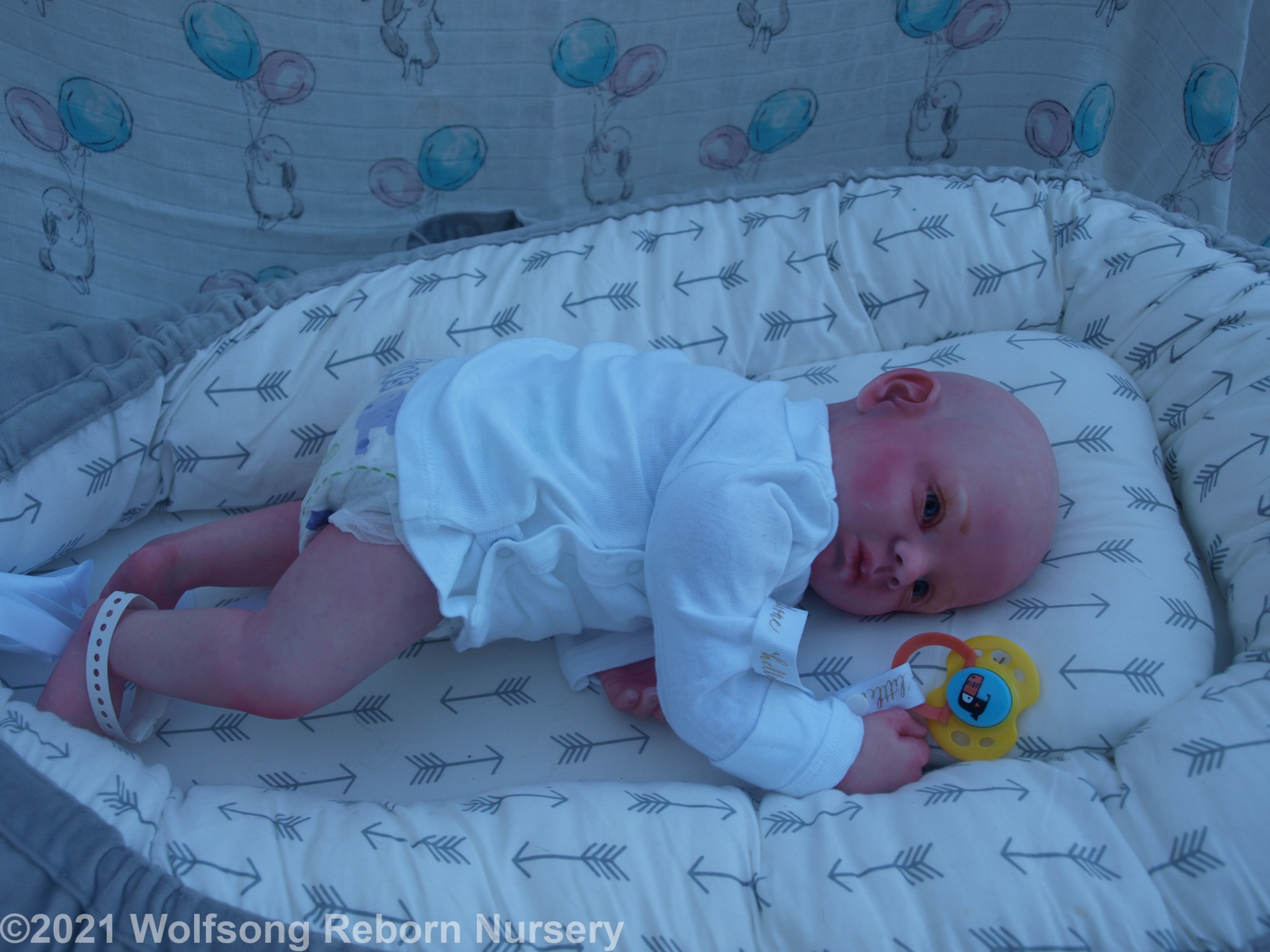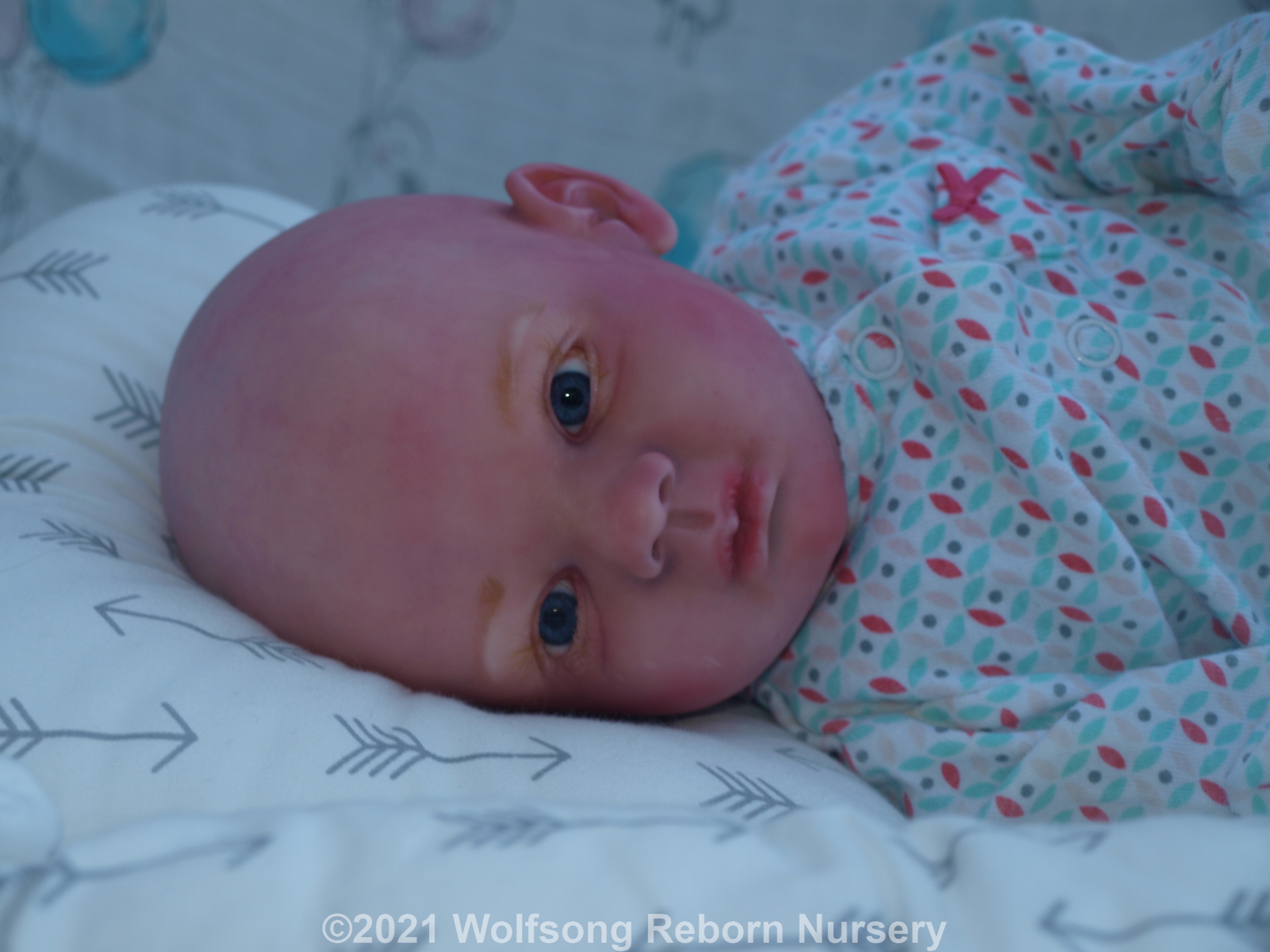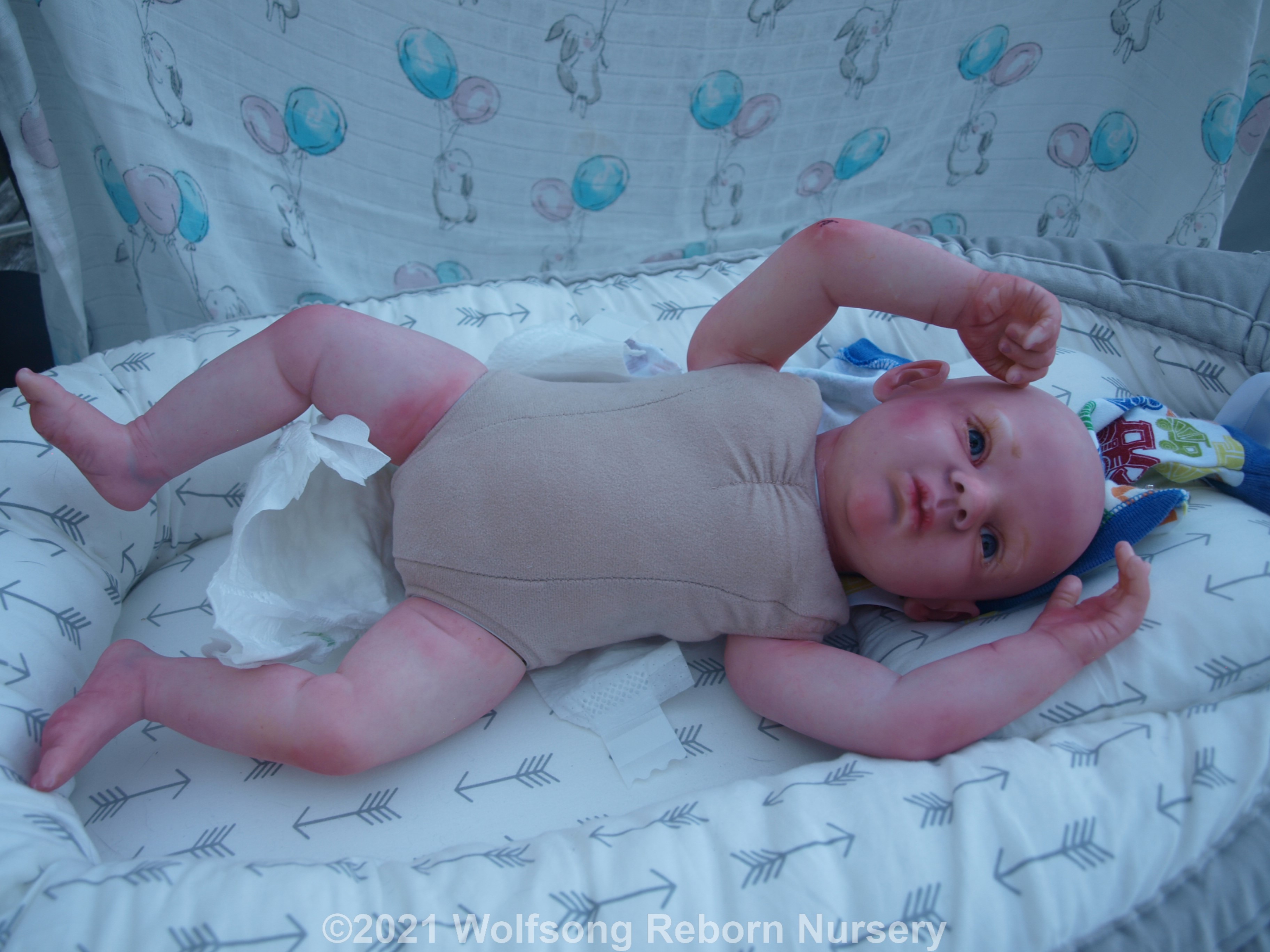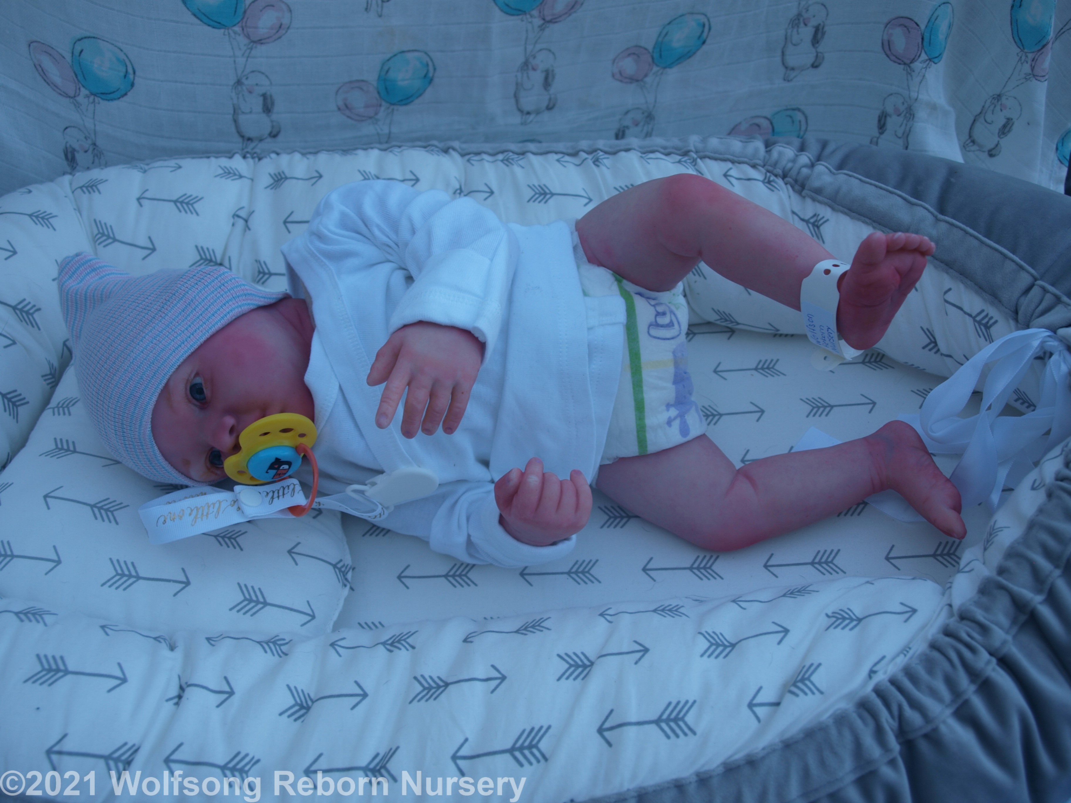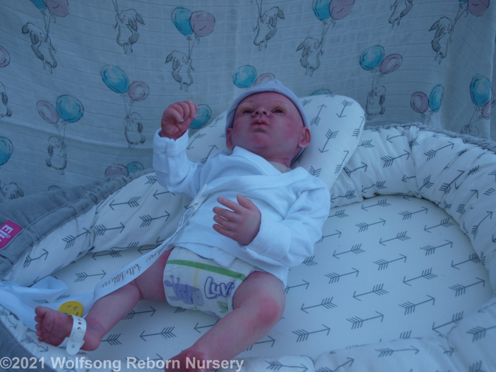 This is the Bountiful Baby Limited Edition 2021 ROSE Kit of the year Sandy reborned by Marta Towne of Wolfsong Reborn Nursery. Sandy is created on a second’s kit ad is being sold as a Boo Boo baby. I have been reborning since March and this is my ninth baby, so I have a lot to learn, but she is a precious baby made with a lot of love and attention to detail. Sandy has been reborned using Miracle Blend Air Dry Paint and Coastal Secents powders and is weighted with glass beads and filled with two types of polyfill. The head and all four limbs are attached using rings to allow a wide variety of poses.. Sandy has acrylic blue eyes from Bountiful Baby and lovely, hand rooted long lashes. Sandy has a magnet behind the lips for a magnetic pacifier as well as one on the inside of the head for a magnetic hair decoration (enclosed if selected as a girl) . Sandy’s head must be supported, just like a real baby. Sandy has a scratch on one little arm and elbow from too sharp baby nails, but has had a manicure now.