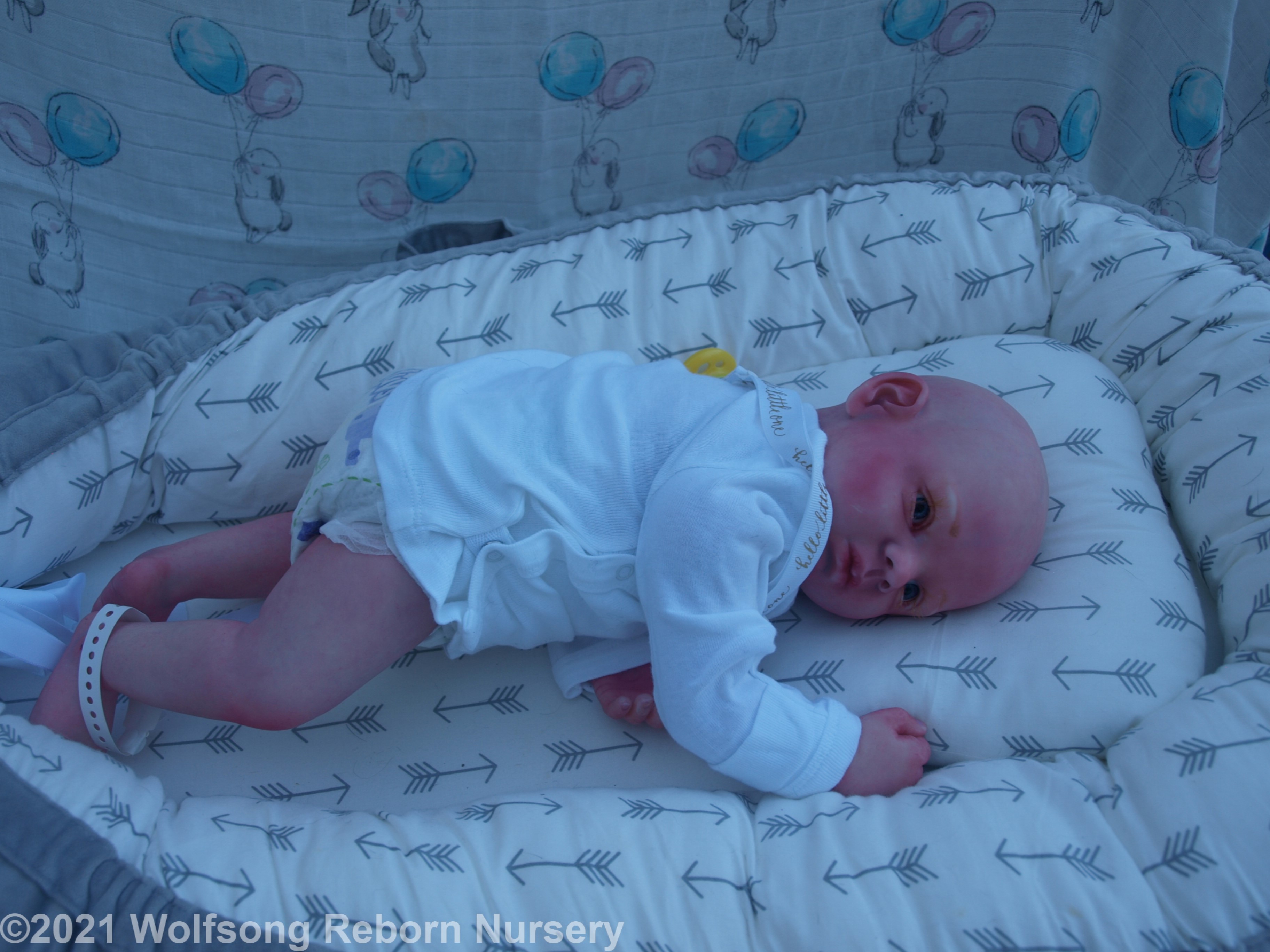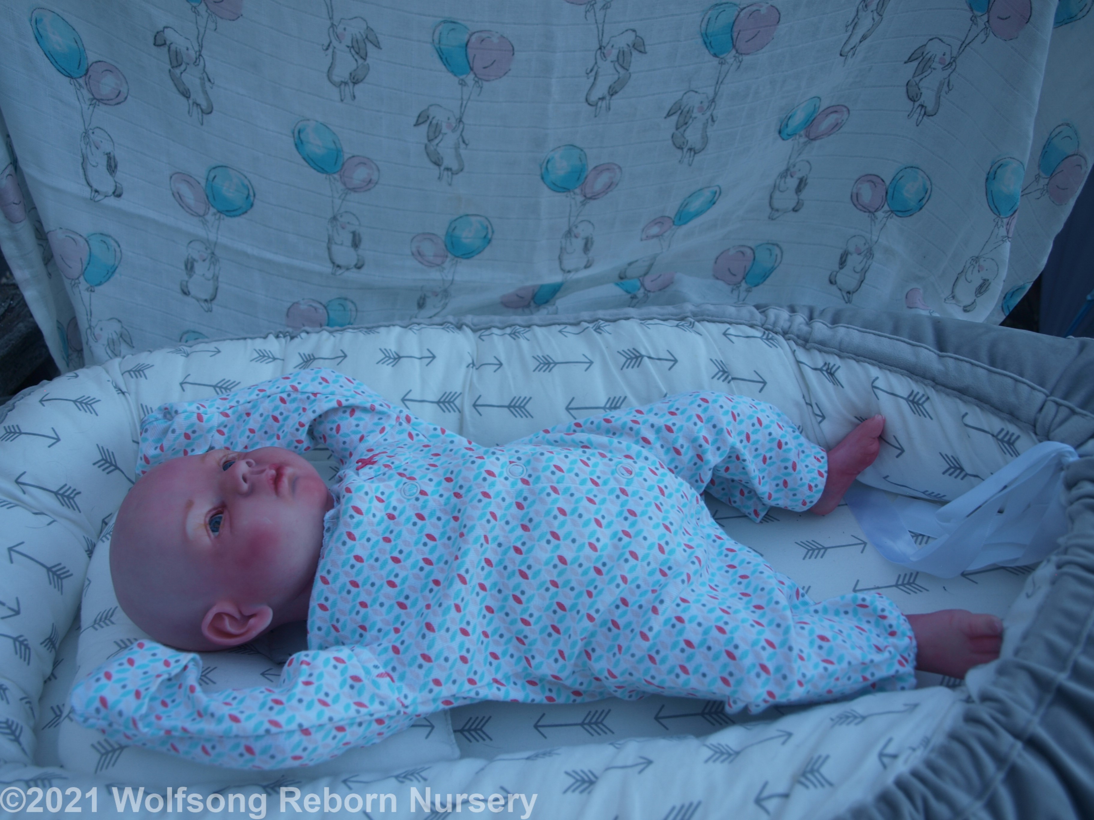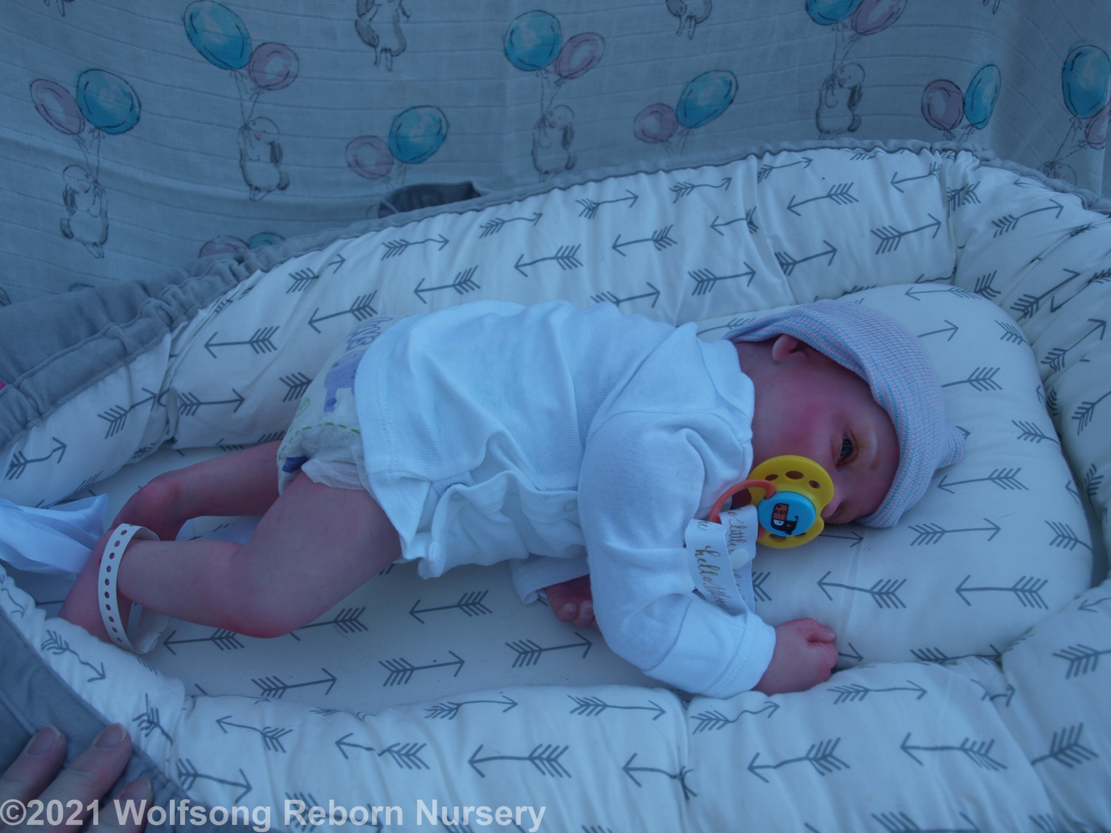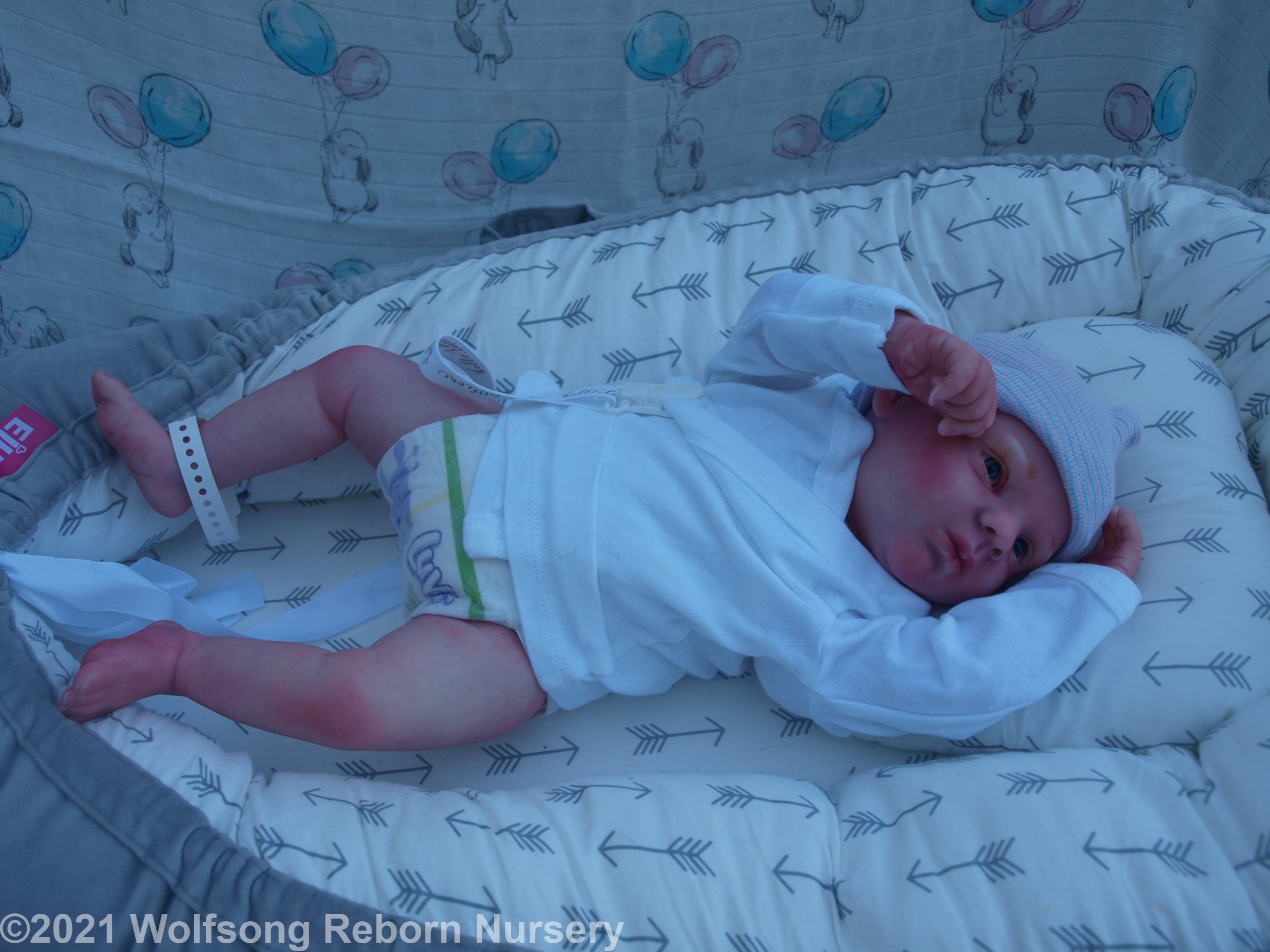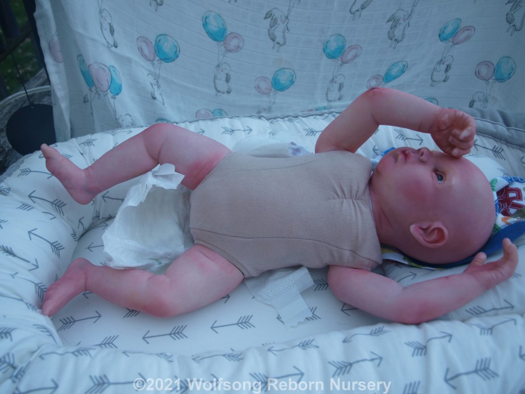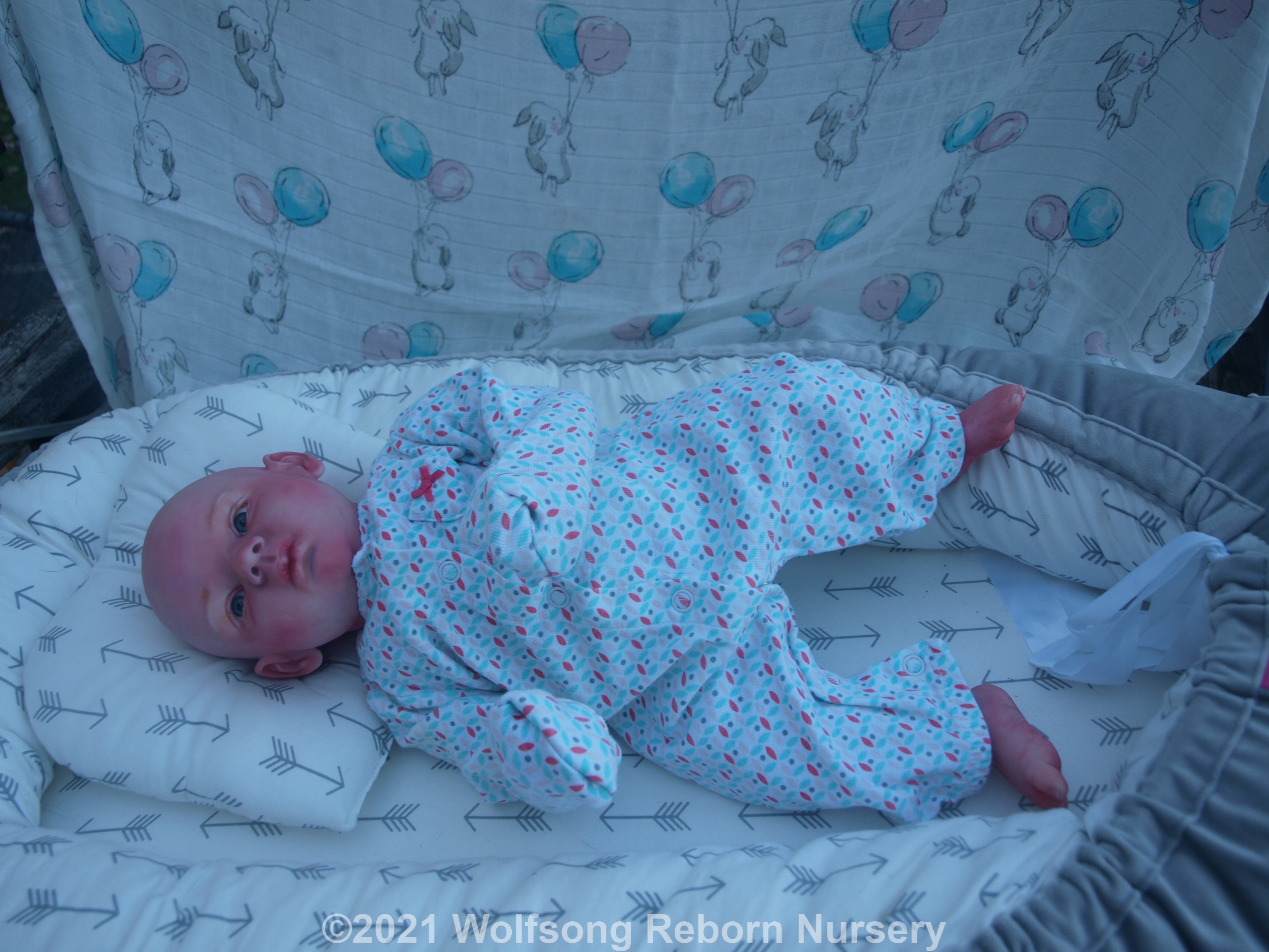 This is the Bountiful Baby Limited Edition 2021 ROSE Kit of the year Sandy reborned by Marta Towne of Wolfsong Reborn Nursery. Sandy is created on a second’s kit ad is being sold as a Boo Boo baby. I have been reborning since March and this is my ninth baby, so I have a lot to learn, but she is a precious baby made with a lot of love and attention to detail. Sandy has been reborned using Miracle Blend Air Dry Paint and Coastal Secents powders and is weighted with glass beads and filled with two types of polyfill. The head and all four limbs are attached using rings to allow a wide variety of poses.. Sandy has acrylic blue eyes from Bountiful Baby and lovely, hand rooted long lashes. Sandy has a magnet behind the lips for a magnetic pacifier as well as one on the inside of the head for a magnetic hair decoration (enclosed if selected as a girl) . Sandy’s head must be supported, just like a real baby. Sandy has a scratch on one little arm and elbow from too sharp baby nails, but has had a manicure now.