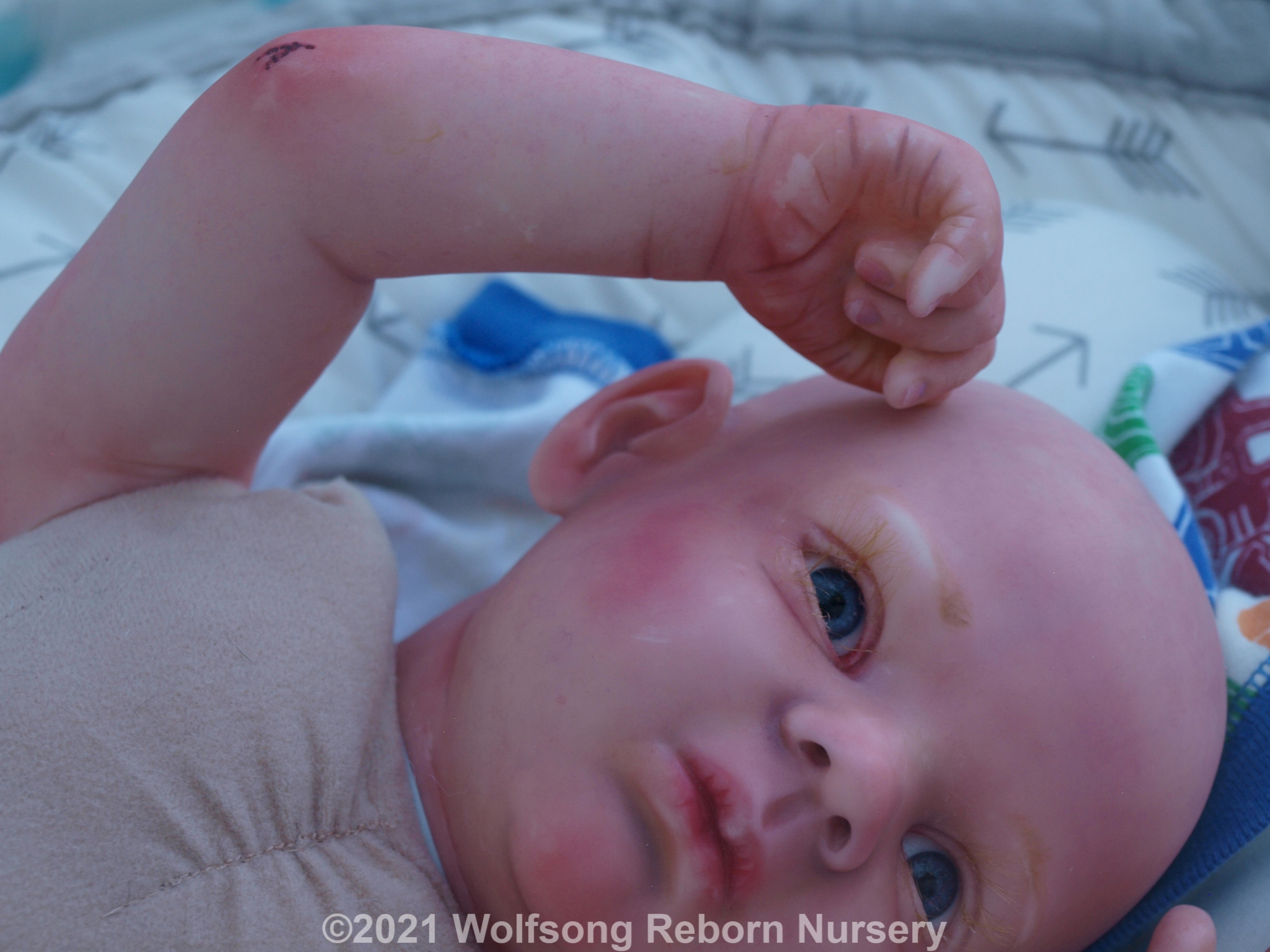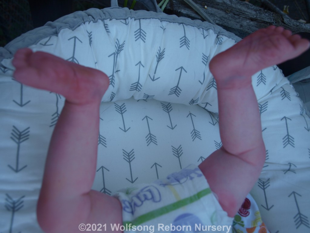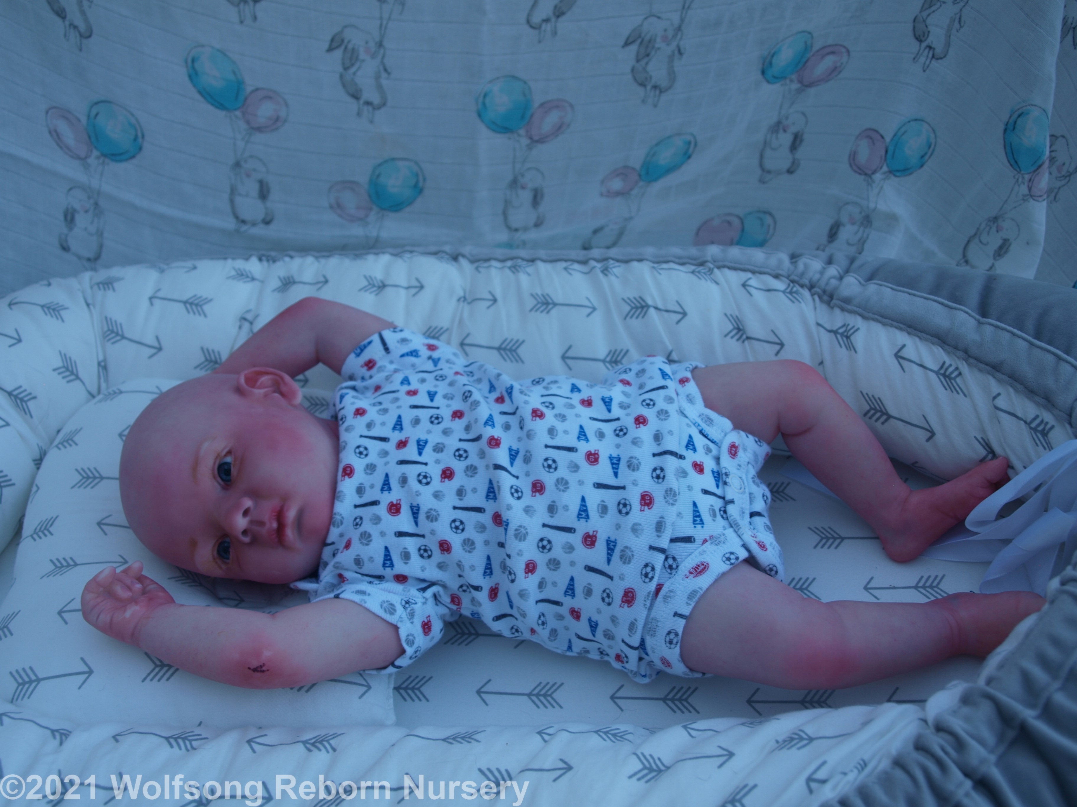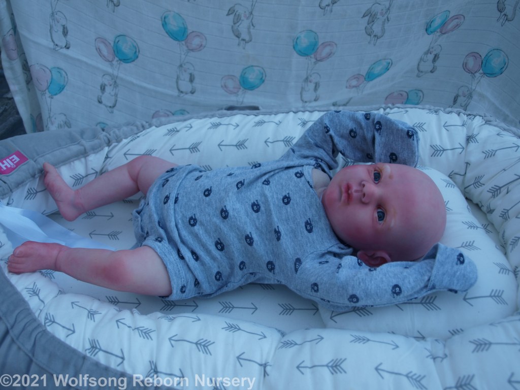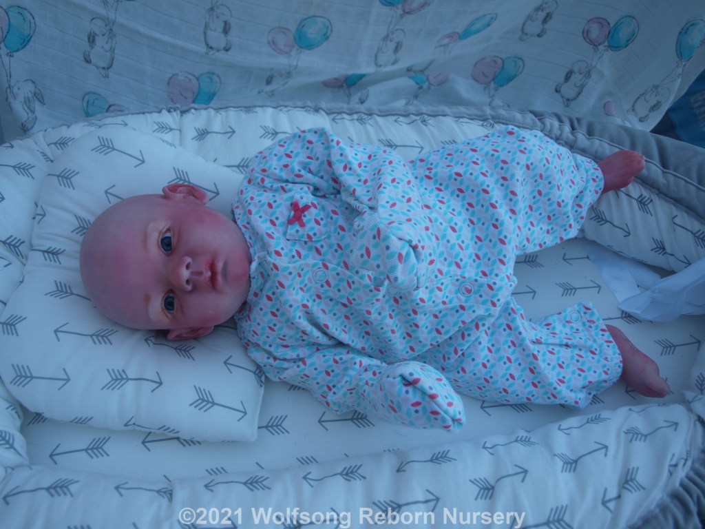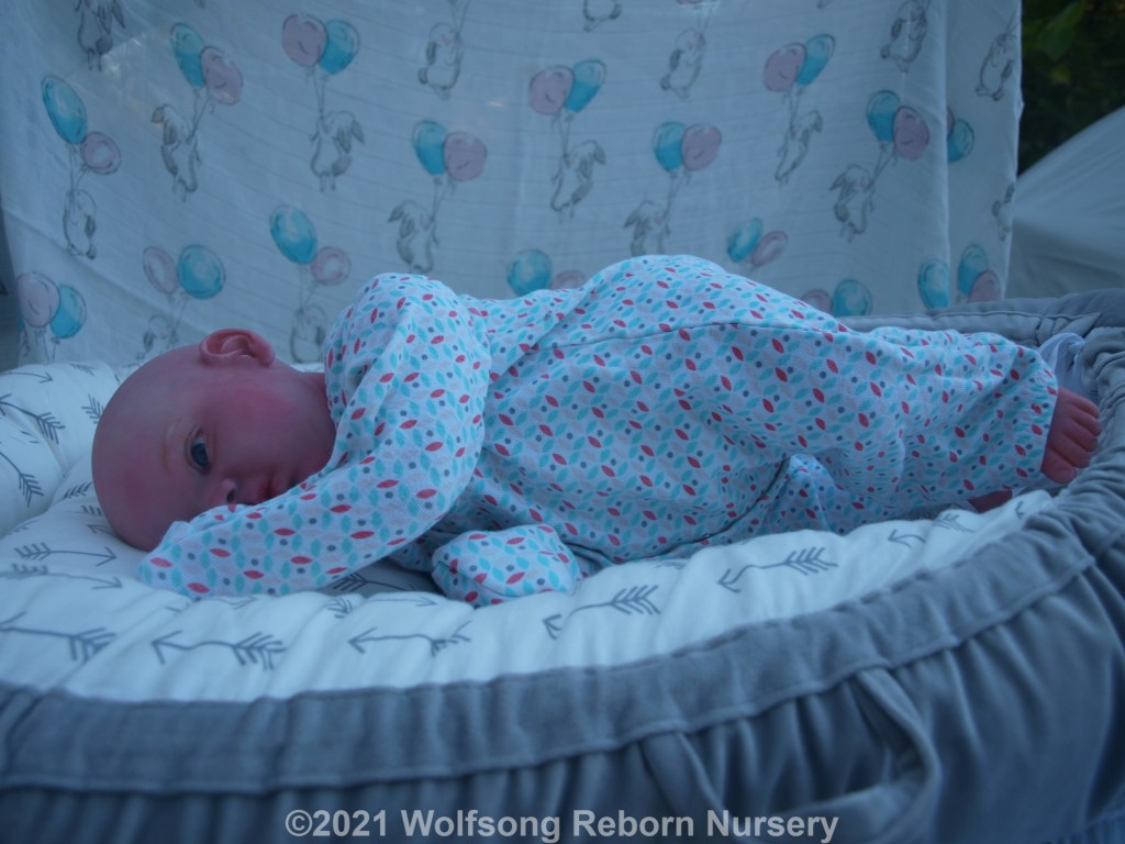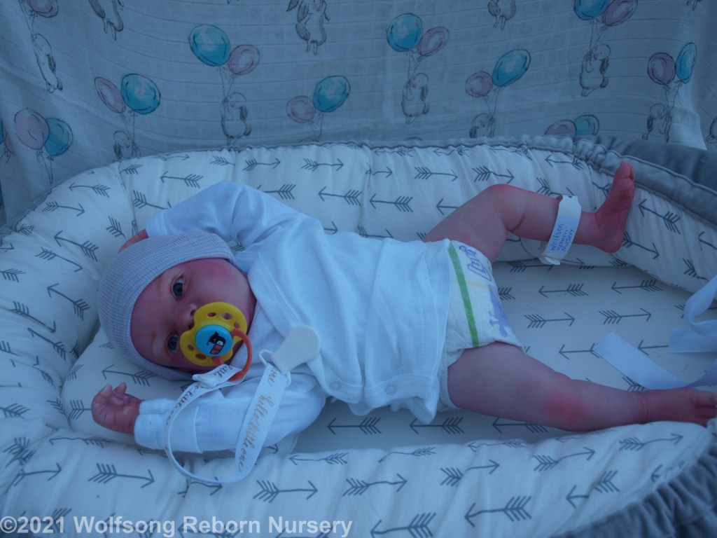 This is the Bountiful Baby Limited Edition 2021 ROSE Kit of the year Sandy reborned by Marta Towne of Wolfsong Reborn Nursery. Sandy is created on a second’s kit ad is being sold as a Boo Boo baby. I have been reborning since March and this is my ninth baby, so I have a lot to learn, but she is a precious baby made with a lot of love and attention to detail. Sandy has been reborned using Miracle Blend Air Dry Paint and Coastal Secents powders and is weighted with glass beads and filled with two types of polyfill. The head and all four limbs are attached using rings to allow a wide variety of poses.. Sandy has acrylic blue eyes from Bountiful Baby and lovely, hand rooted long lashes. Sandy has a magnet behind the lips for a magnetic pacifier as well as one on the inside of the head for a magnetic hair decoration (enclosed if selected as a girl) . Sandy’s head must be supported, just like a real baby. Sandy has a scratch on one little arm and elbow from too sharp baby nails, but has had a manicure now.