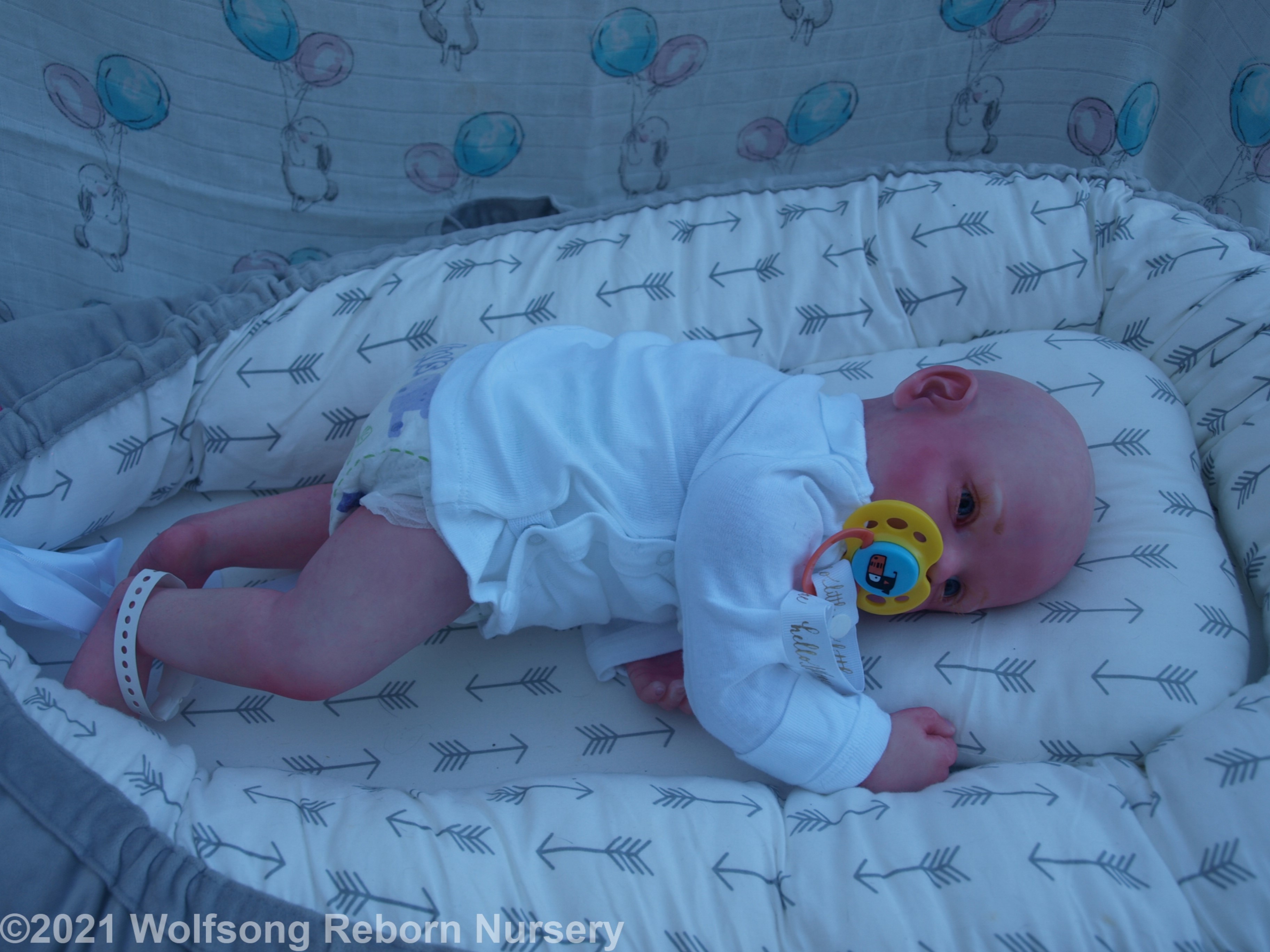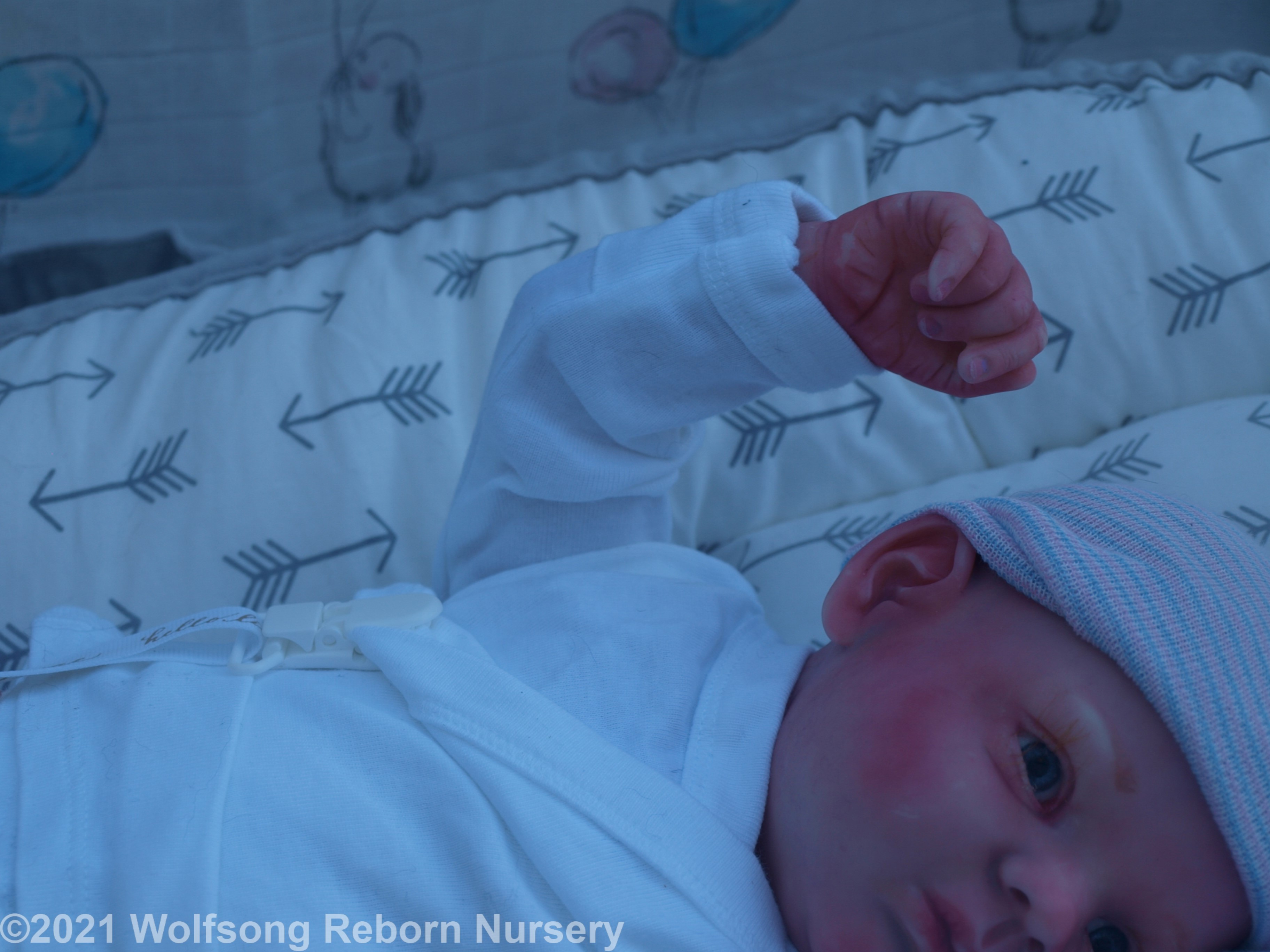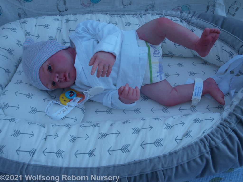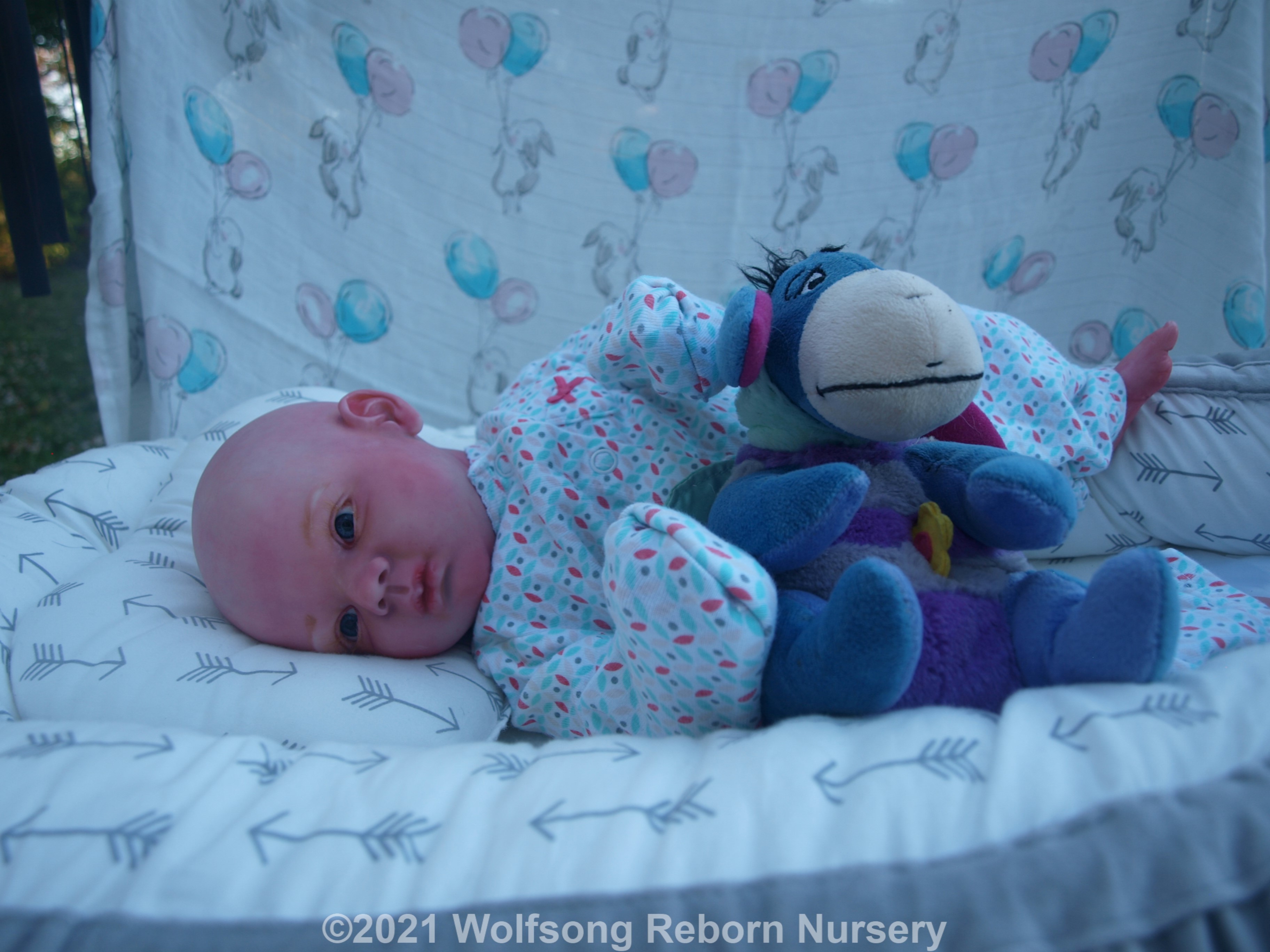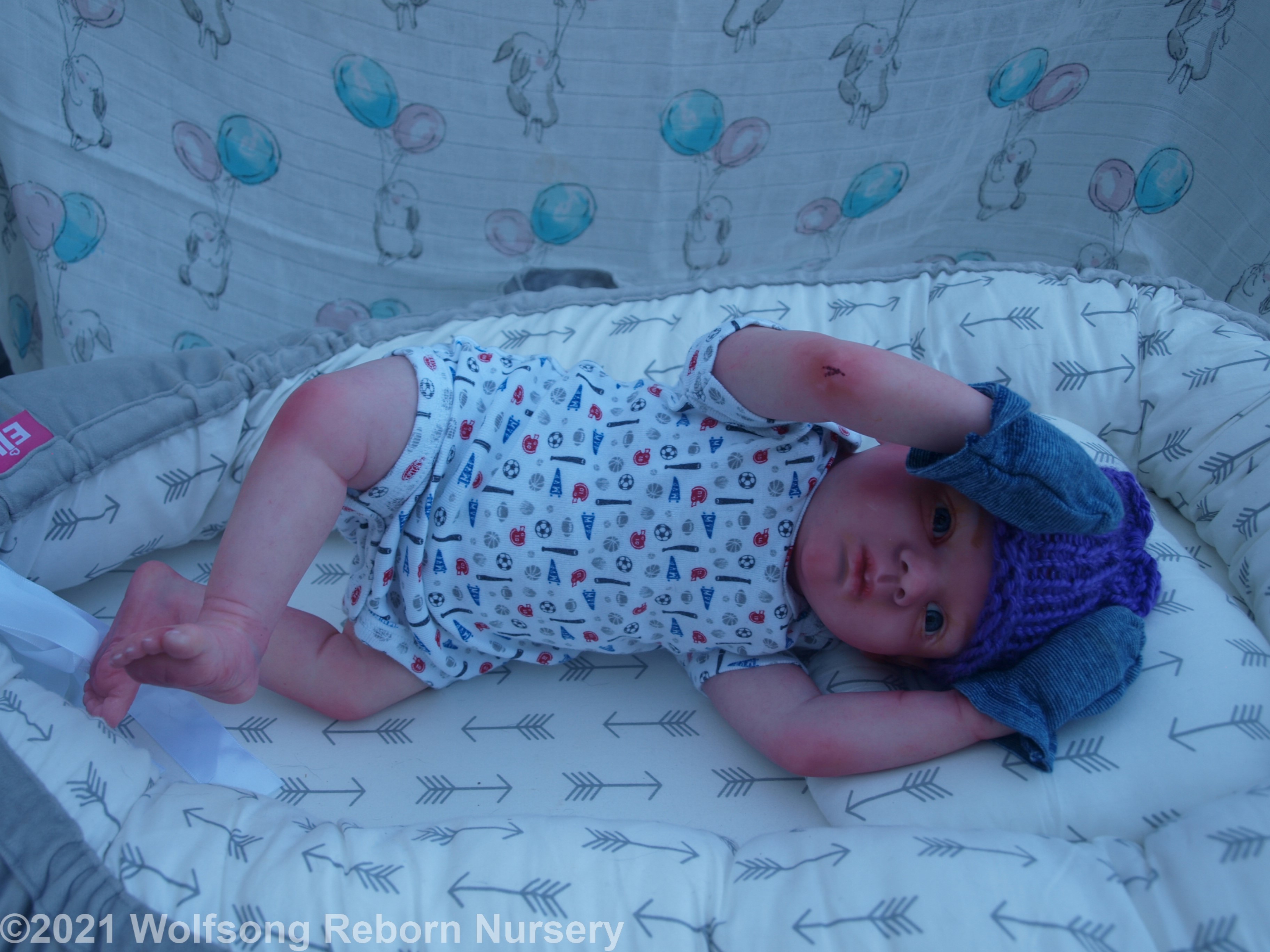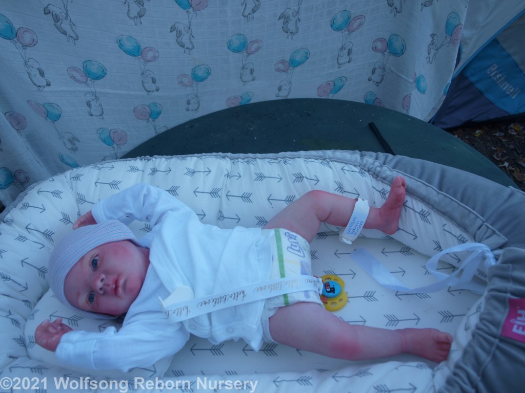 This is the Bountiful Baby Limited Edition 2021 ROSE Kit of the year Sandy reborned by Marta Towne of Wolfsong Reborn Nursery. Sandy is created on a second’s kit ad is being sold as a Boo Boo baby. I have been reborning since March and this is my ninth baby, so I have a lot to learn, but she is a precious baby made with a lot of love and attention to detail. Sandy has been reborned using Miracle Blend Air Dry Paint and Coastal Secents powders and is weighted with glass beads and filled with two types of polyfill. The head and all four limbs are attached using rings to allow a wide variety of poses.. Sandy has acrylic blue eyes from Bountiful Baby and lovely, hand rooted long lashes. Sandy has a magnet behind the lips for a magnetic pacifier as well as one on the inside of the head for a magnetic hair decoration (enclosed if selected as a girl) . Sandy’s head must be supported, just like a real baby. Sandy has a scratch on one little arm and elbow from too sharp baby nails, but has had a manicure now.