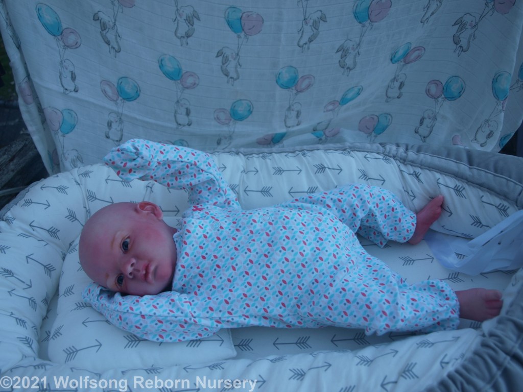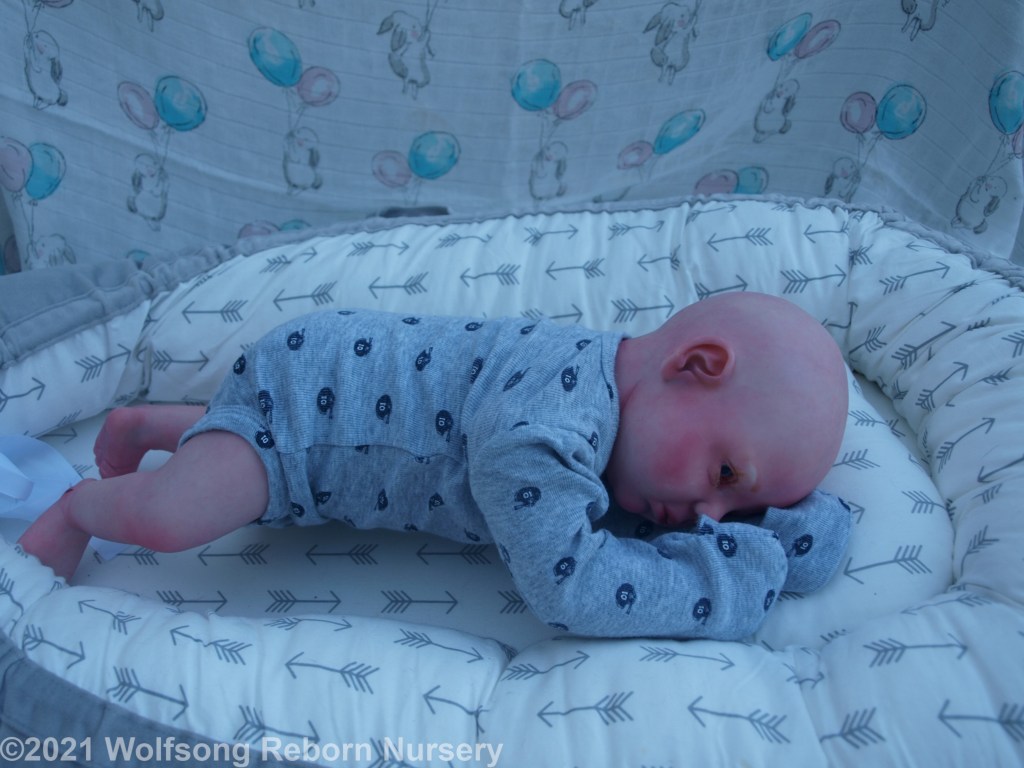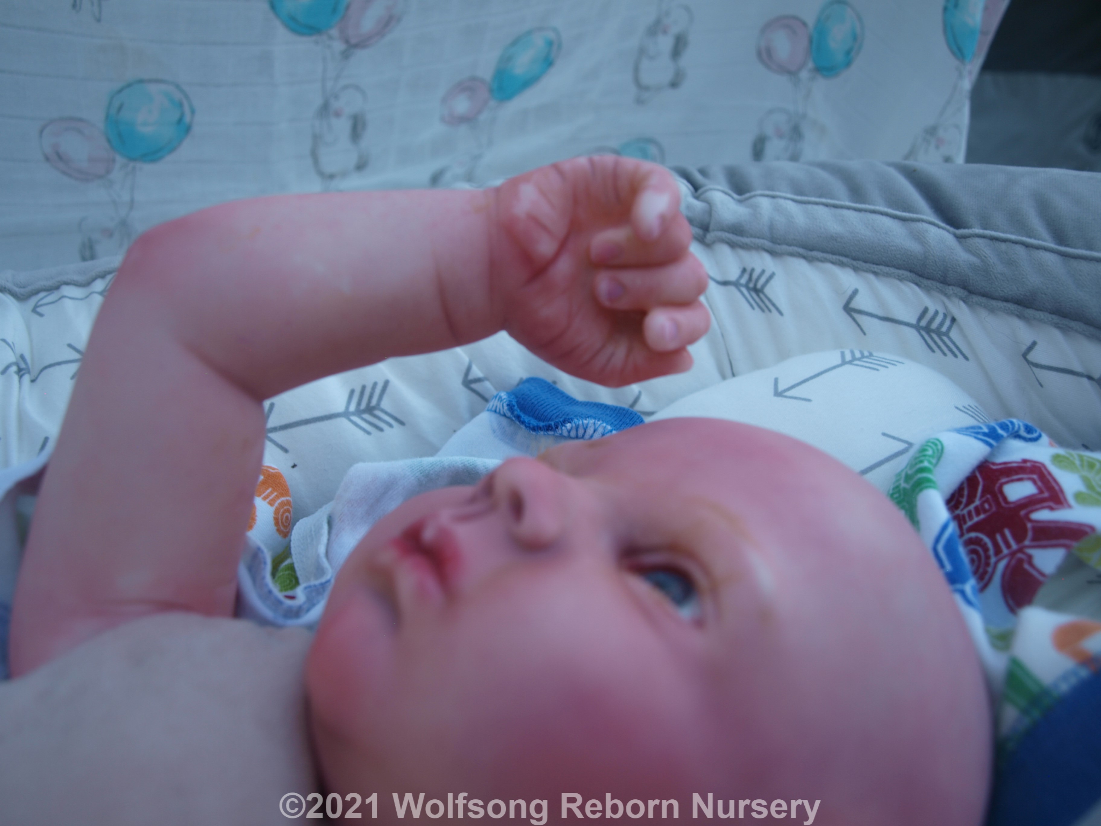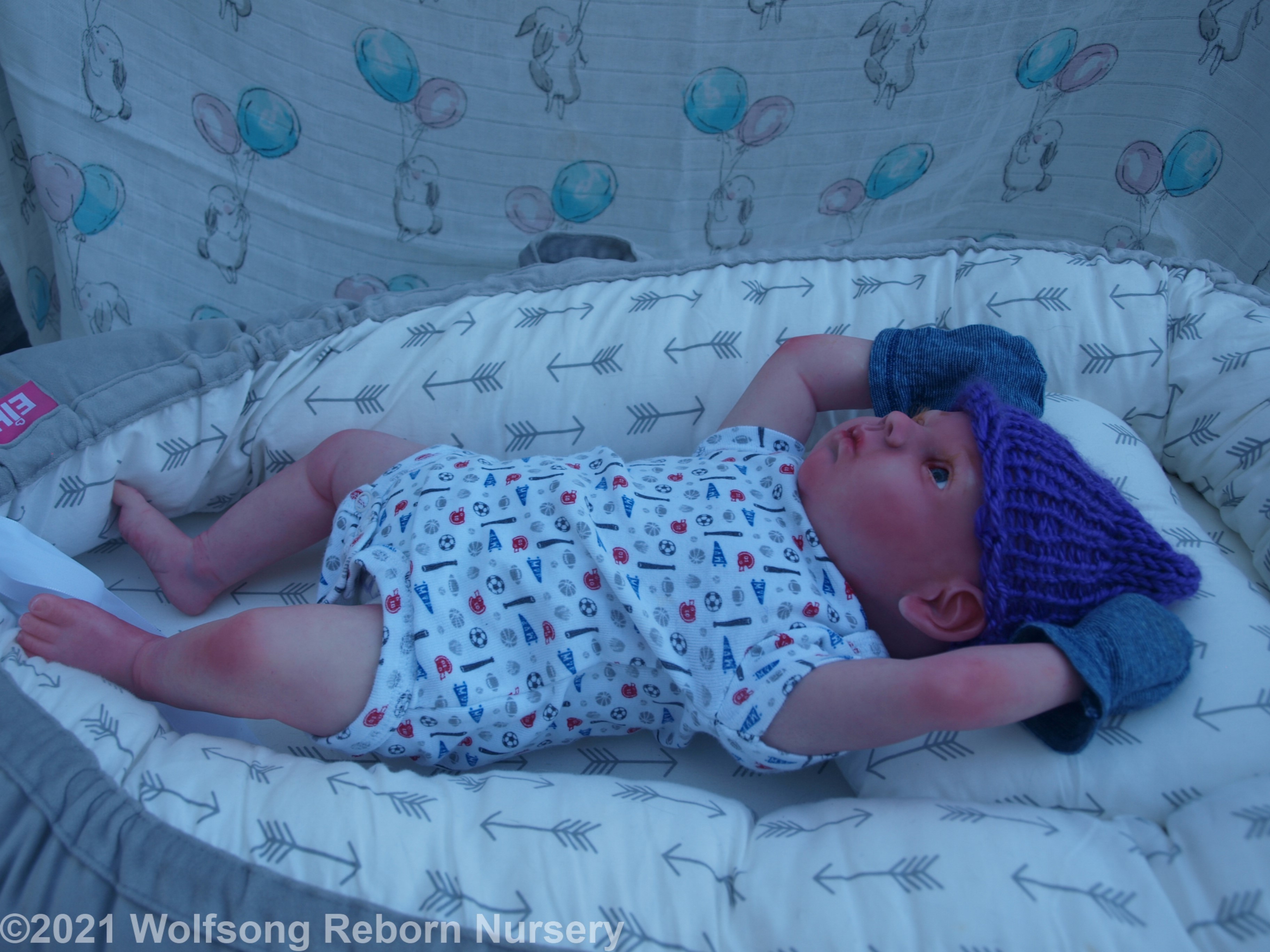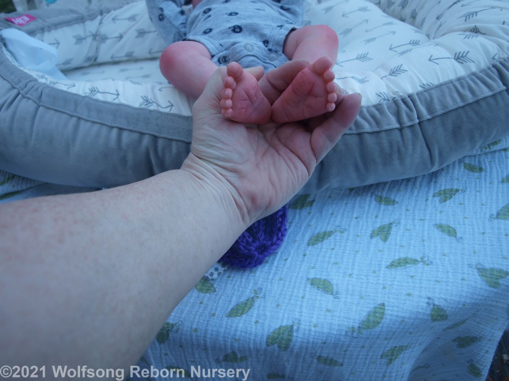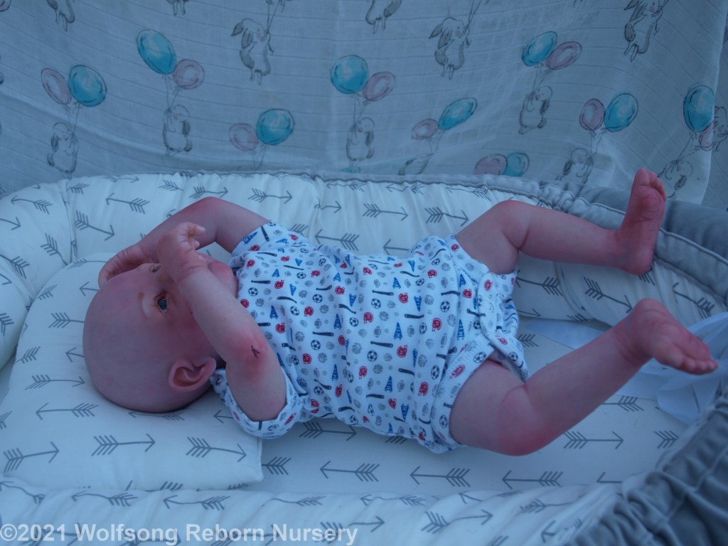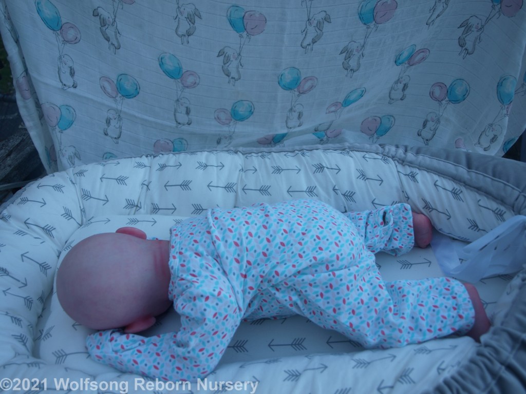 This is the Bountiful Baby Limited Edition 2021 ROSE Kit of the year Sandy reborned by Marta Towne of Wolfsong Reborn Nursery. Sandy is created on a second’s kit ad is being sold as a Boo Boo baby. I have been reborning since March and this is my ninth baby, so I have a lot to learn, but she is a precious baby made with a lot of love and attention to detail. Sandy has been reborned using Miracle Blend Air Dry Paint and Coastal Secents powders and is weighted with glass beads and filled with two types of polyfill. The head and all four limbs are attached using rings to allow a wide variety of poses.. Sandy has acrylic blue eyes from Bountiful Baby and lovely, hand rooted long lashes. Sandy has a magnet behind the lips for a magnetic pacifier as well as one on the inside of the head for a magnetic hair decoration (enclosed if selected as a girl) . Sandy’s head must be supported, just like a real baby. Sandy has a scratch on one little arm and elbow from too sharp baby nails, but has had a manicure now.