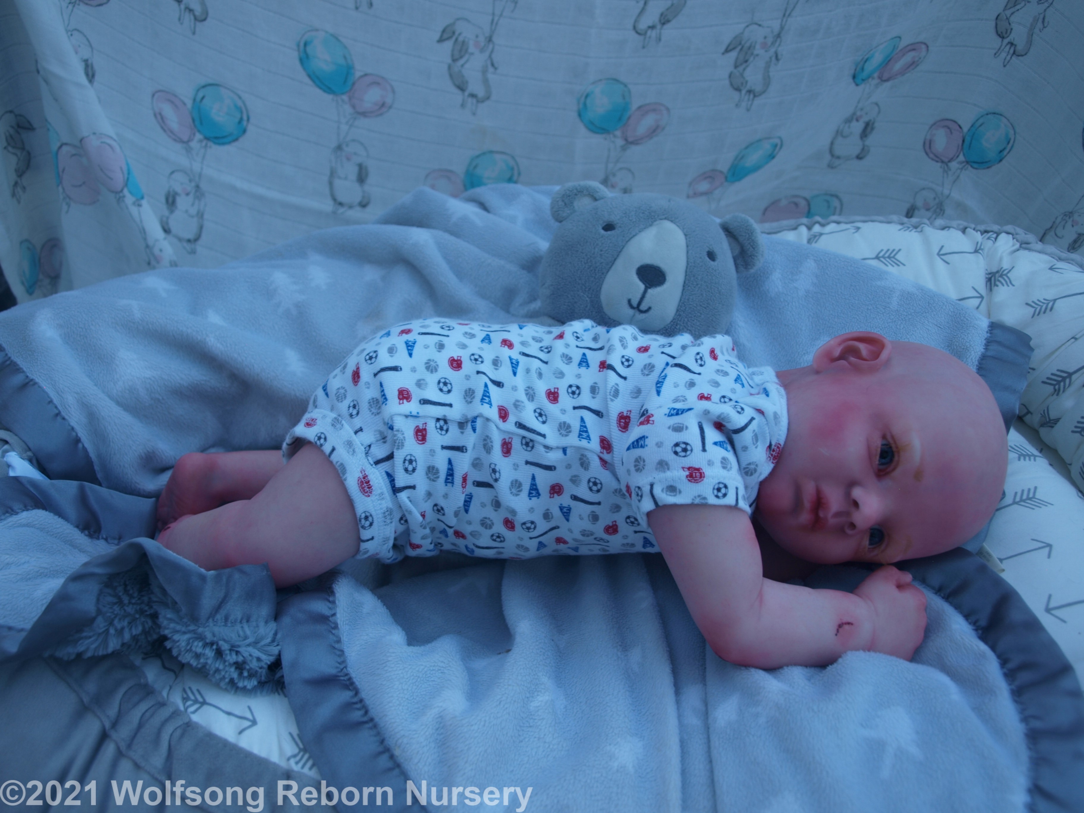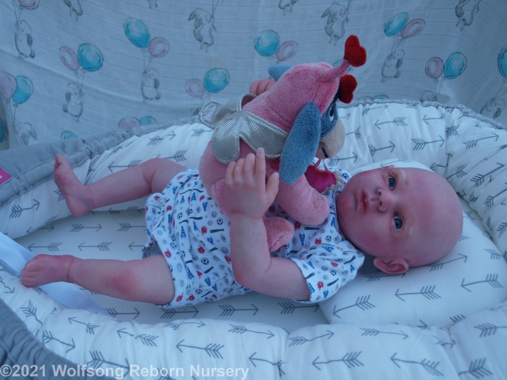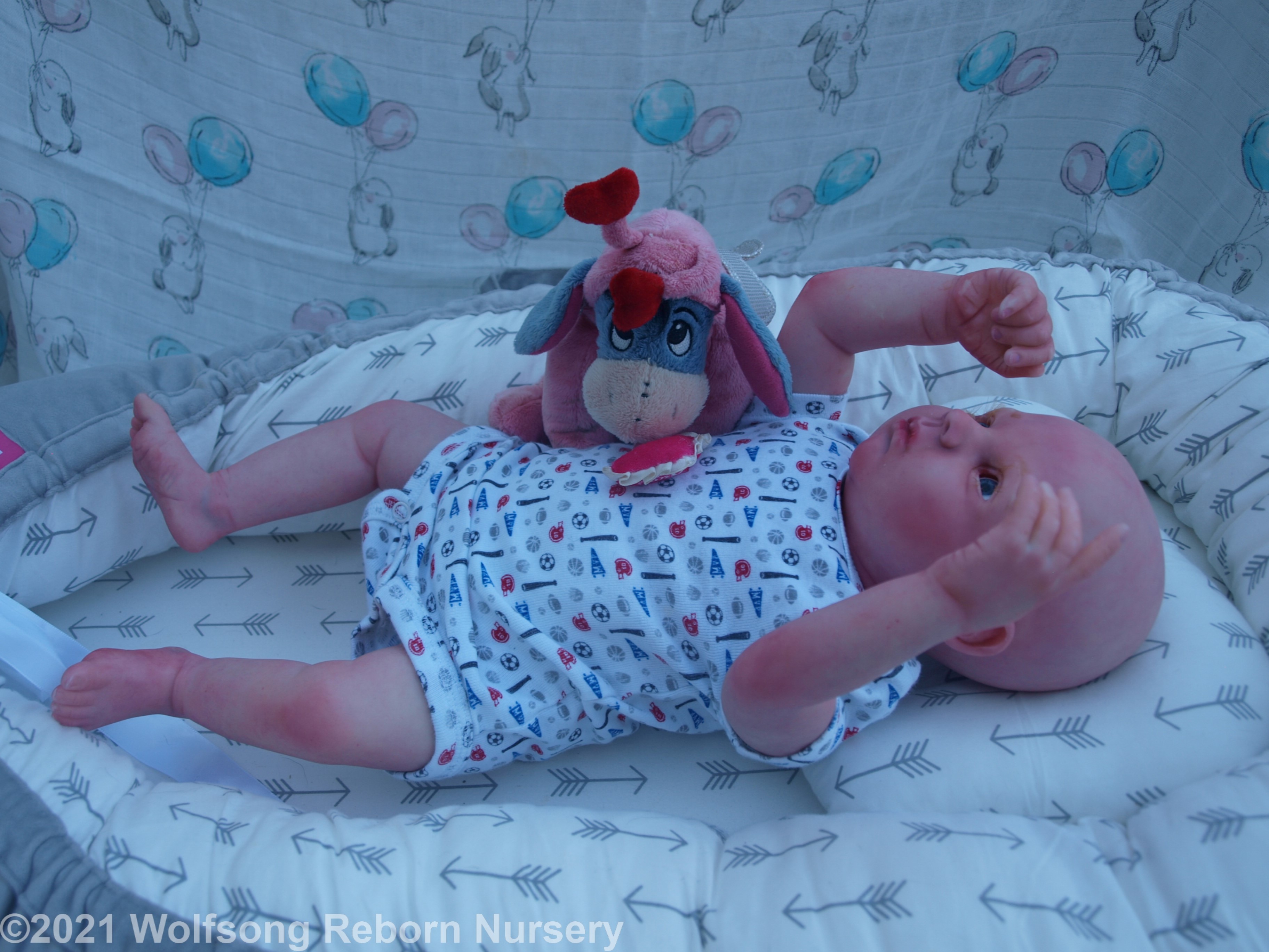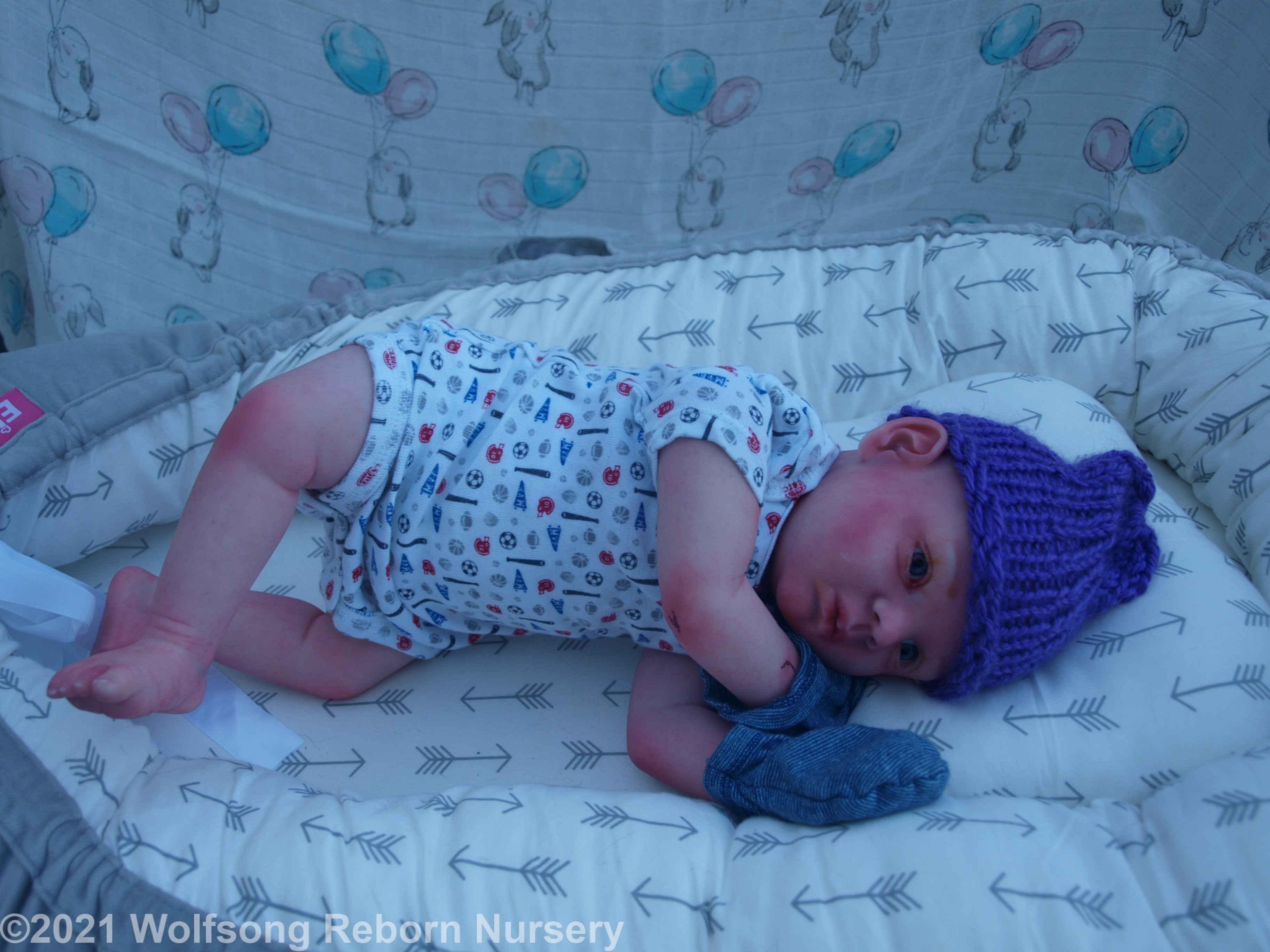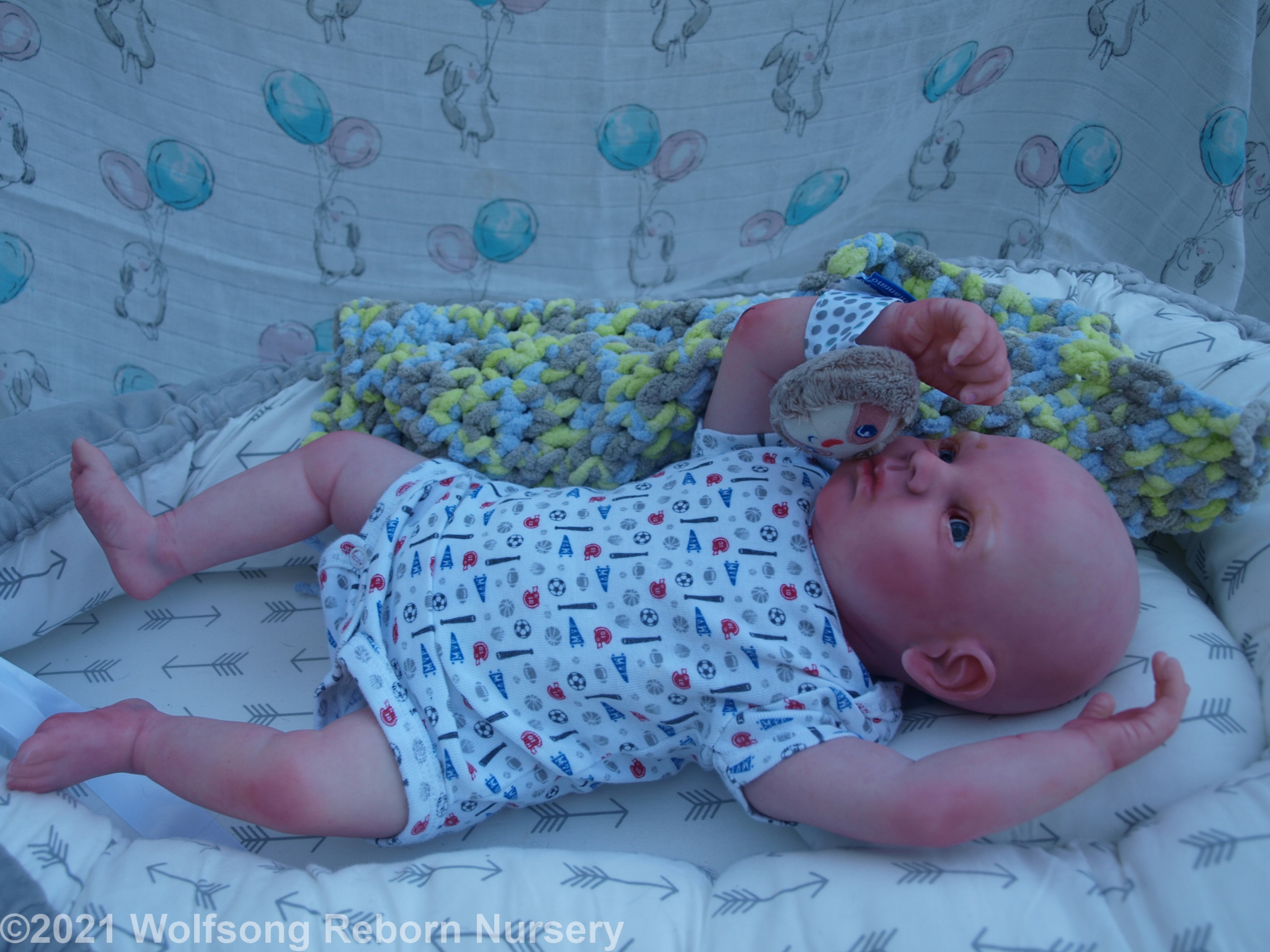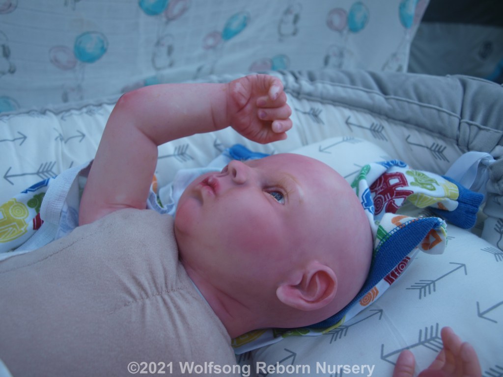 This is the Bountiful Baby Limited Edition 2021 ROSE Kit of the year Sandy reborned by Marta Towne of Wolfsong Reborn Nursery. Sandy is created on a second’s kit ad is being sold as a Boo Boo baby. I have been reborning since March and this is my ninth baby, so I have a lot to learn, but she is a precious baby made with a lot of love and attention to detail. Sandy has been reborned using Miracle Blend Air Dry Paint and Coastal Secents powders and is weighted with glass beads and filled with two types of polyfill. The head and all four limbs are attached using rings to allow a wide variety of poses.. Sandy has acrylic blue eyes from Bountiful Baby and lovely, hand rooted long lashes. Sandy has a magnet behind the lips for a magnetic pacifier as well as one on the inside of the head for a magnetic hair decoration (enclosed if selected as a girl) . Sandy’s head must be supported, just like a real baby. Sandy has a scratch on one little arm and elbow from too sharp baby nails, but has had a manicure now.